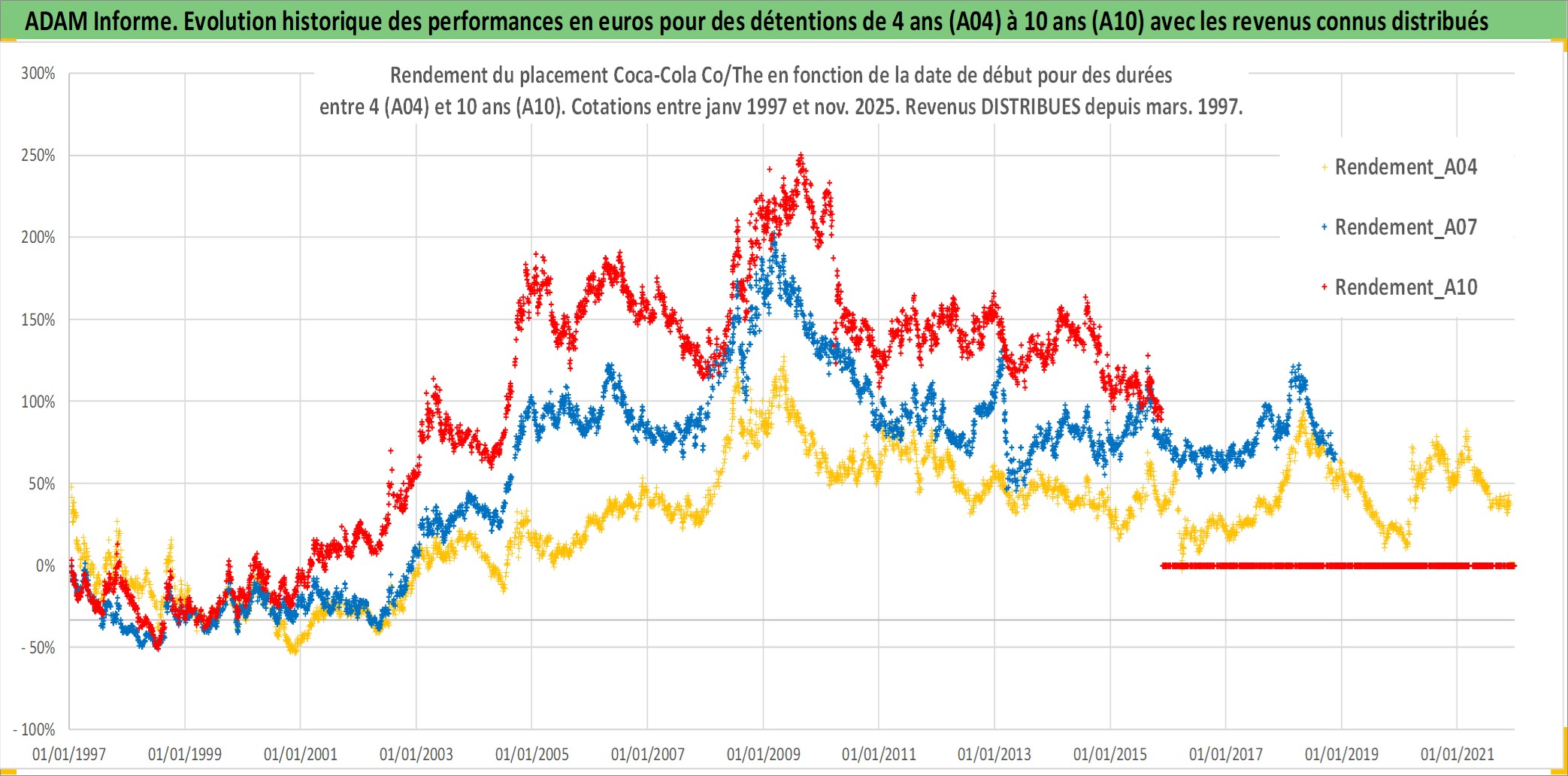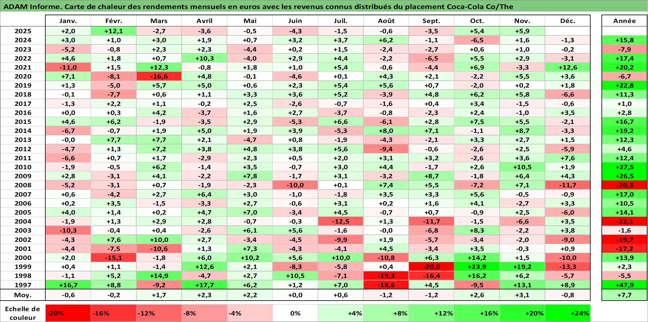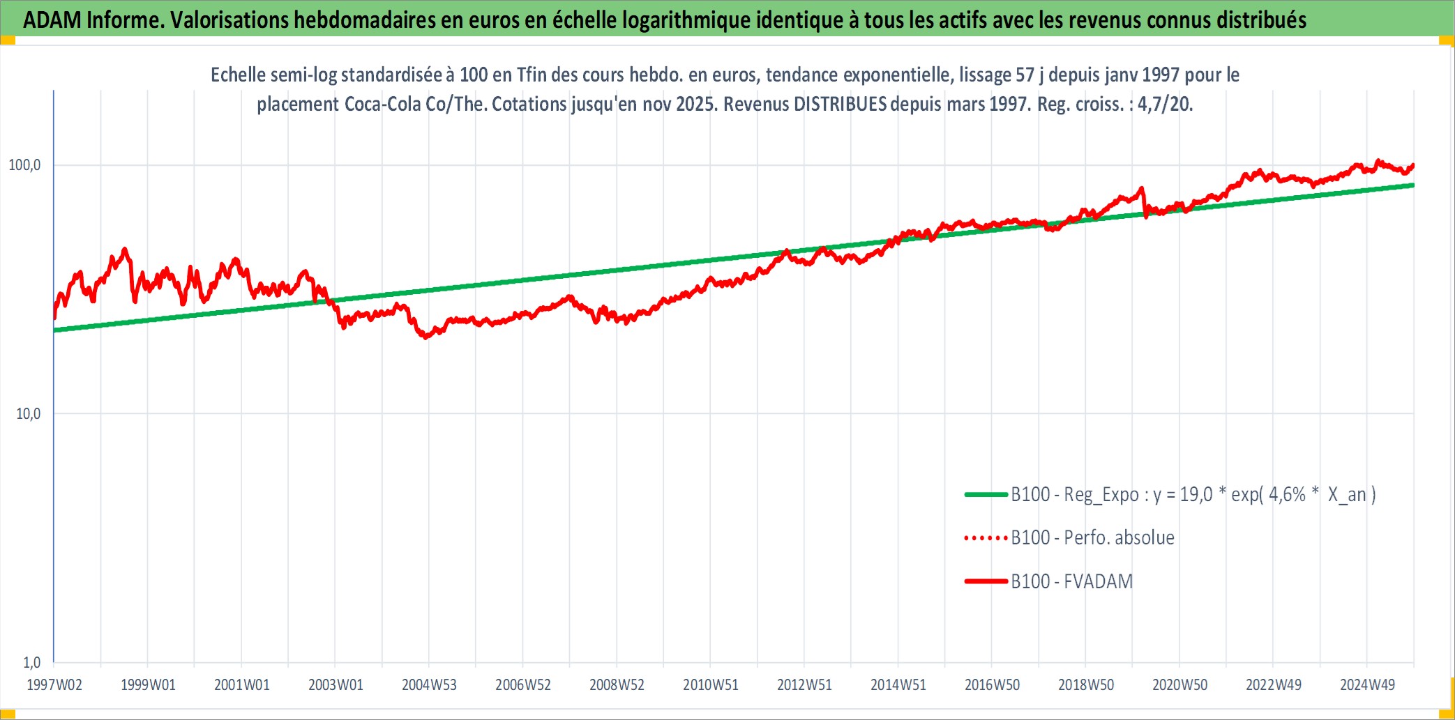Site dédié aux investisseursPage dédiée sur site financeAnalyse des valorisations hebdomadaires de l'action Coca-Cola Co/The. Cet actif est cote en USD. Les valorisations sont en contrevaleur EURO et couvrent les semaines 1997W01 a 2025W48. Les revenus de cet actif financier sont pris en compte depuis la semaine 1997W11. La note globale ESG de cet actif est estimee a 9.0 (apres rebasage entre 0 et 20).