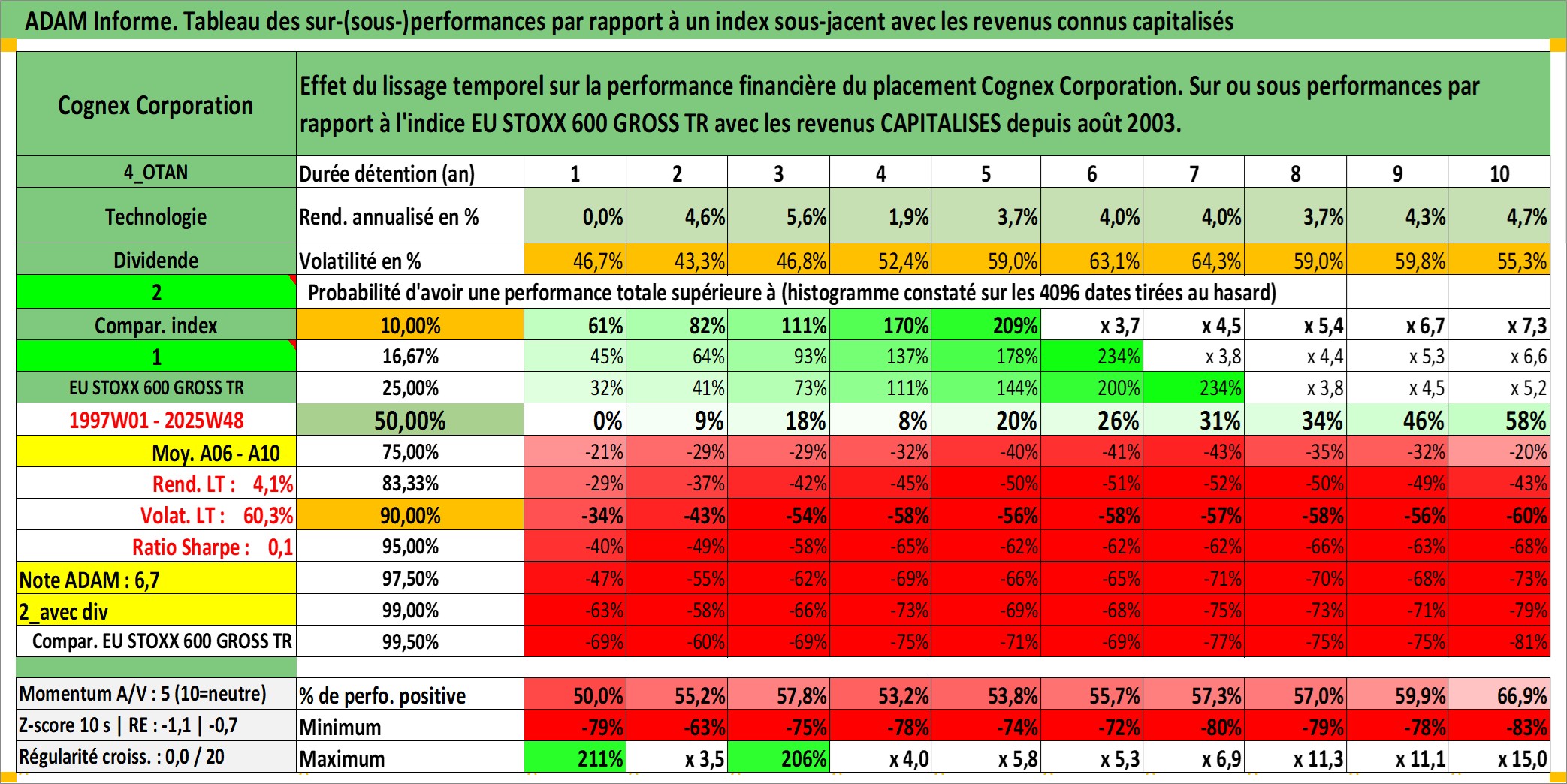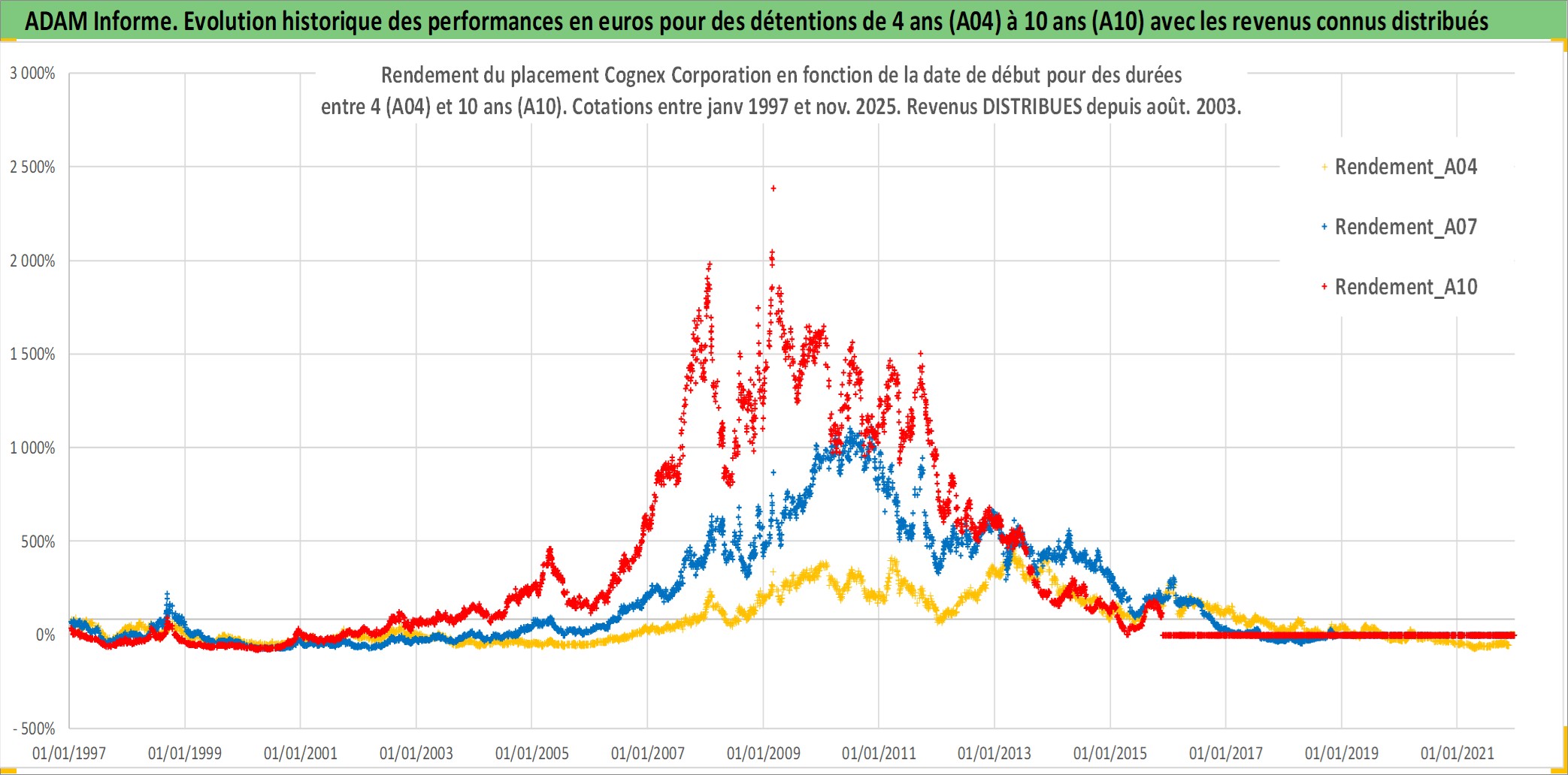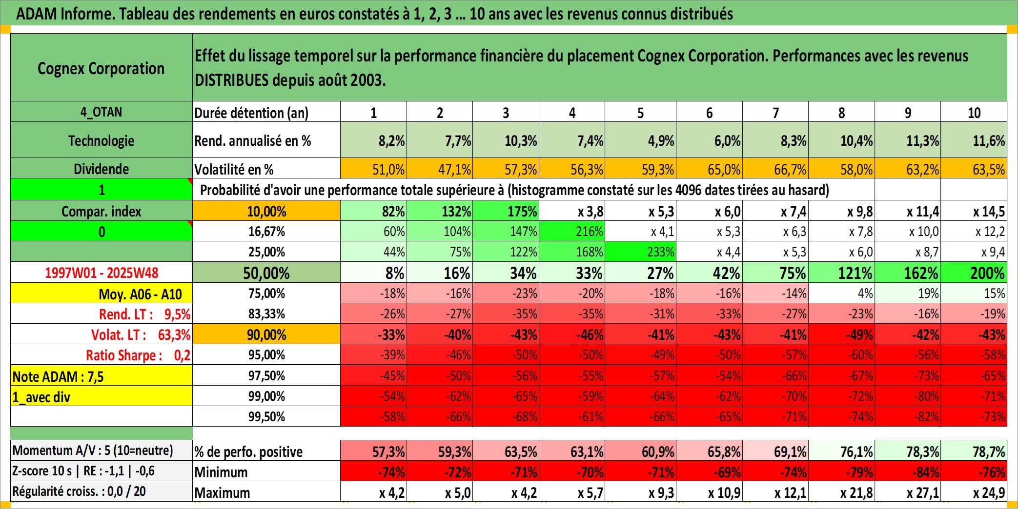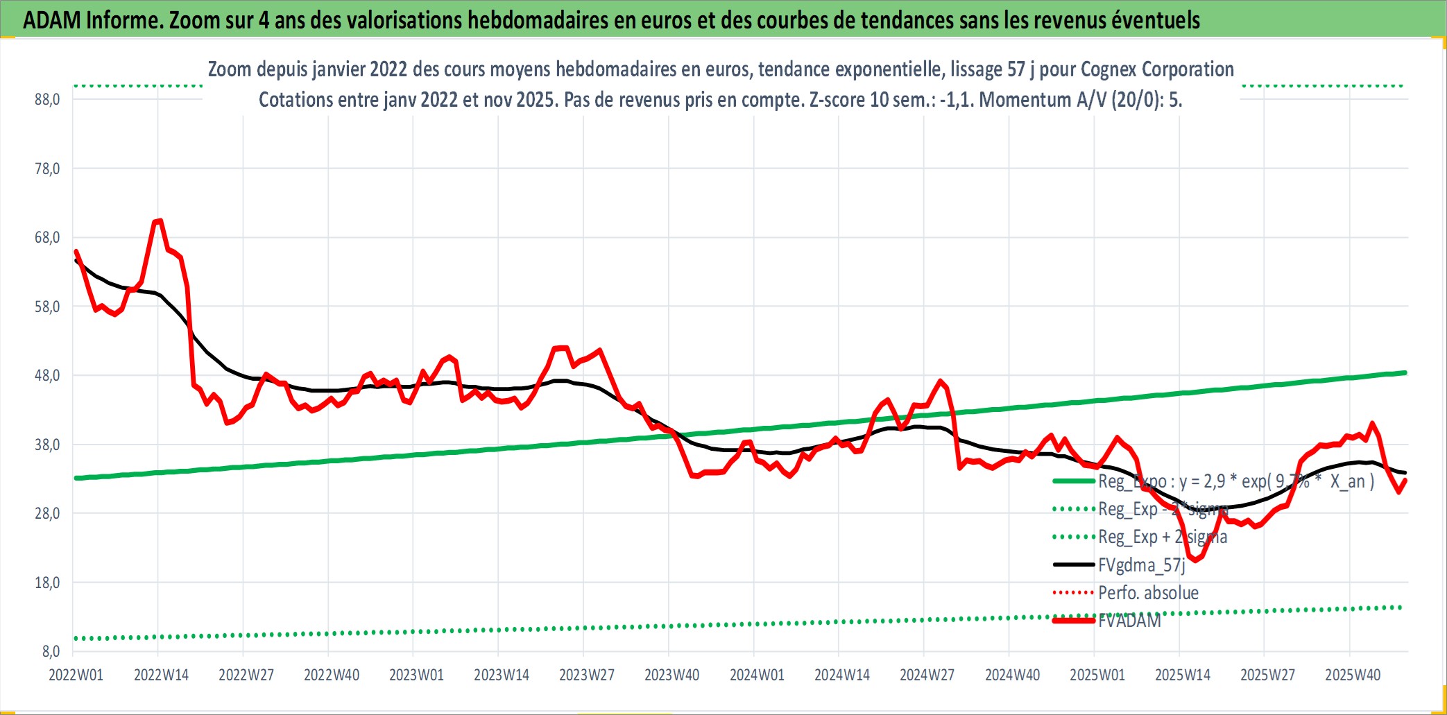 Site dédié aux investisseursPage dédiée sur site financeAnalyse des valorisations hebdomadaires de l'action Cognex Corporation. Cet actif est cote en USD. Les valorisations sont en contrevaleur EURO et couvrent les semaines 1997W01 a 2025W48. Les revenus de cet actif financier sont pris en compte depuis la semaine 2003W35. La note ESG de cet actif n'est pas connue.