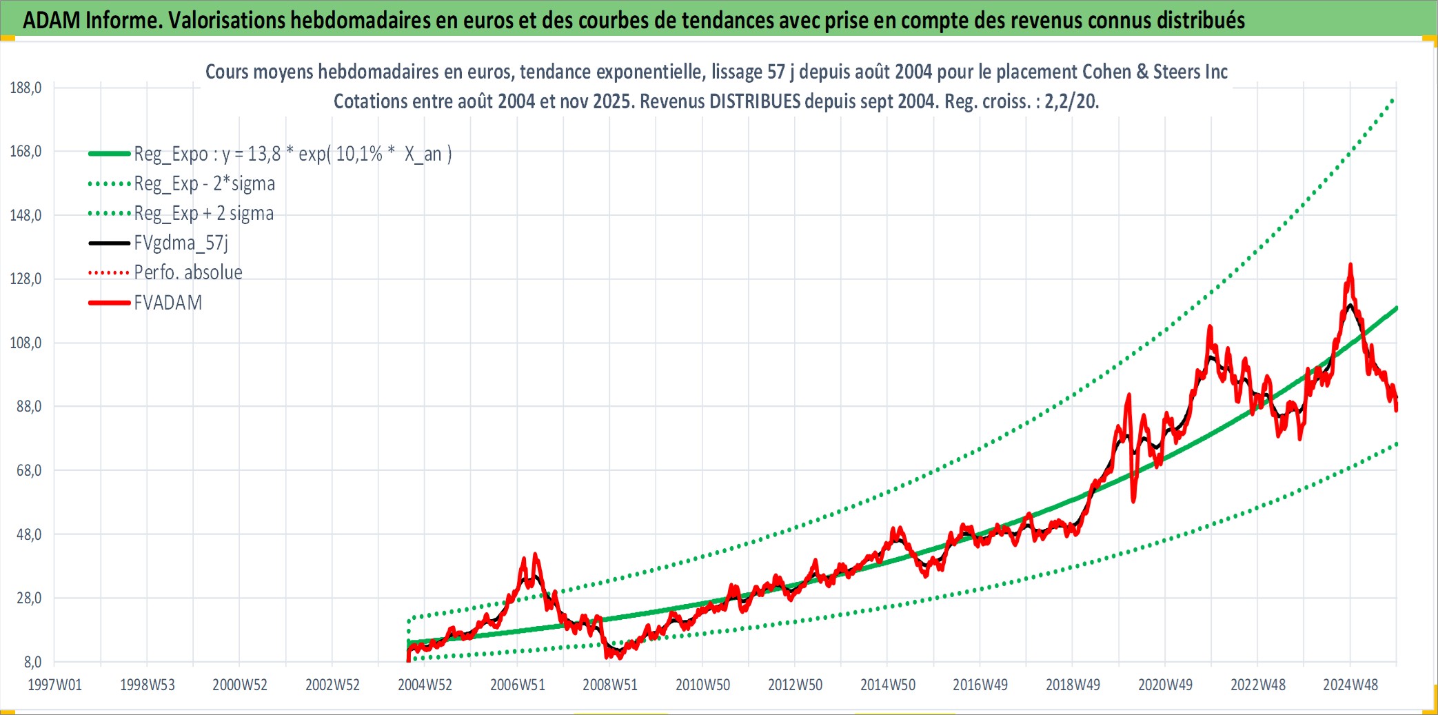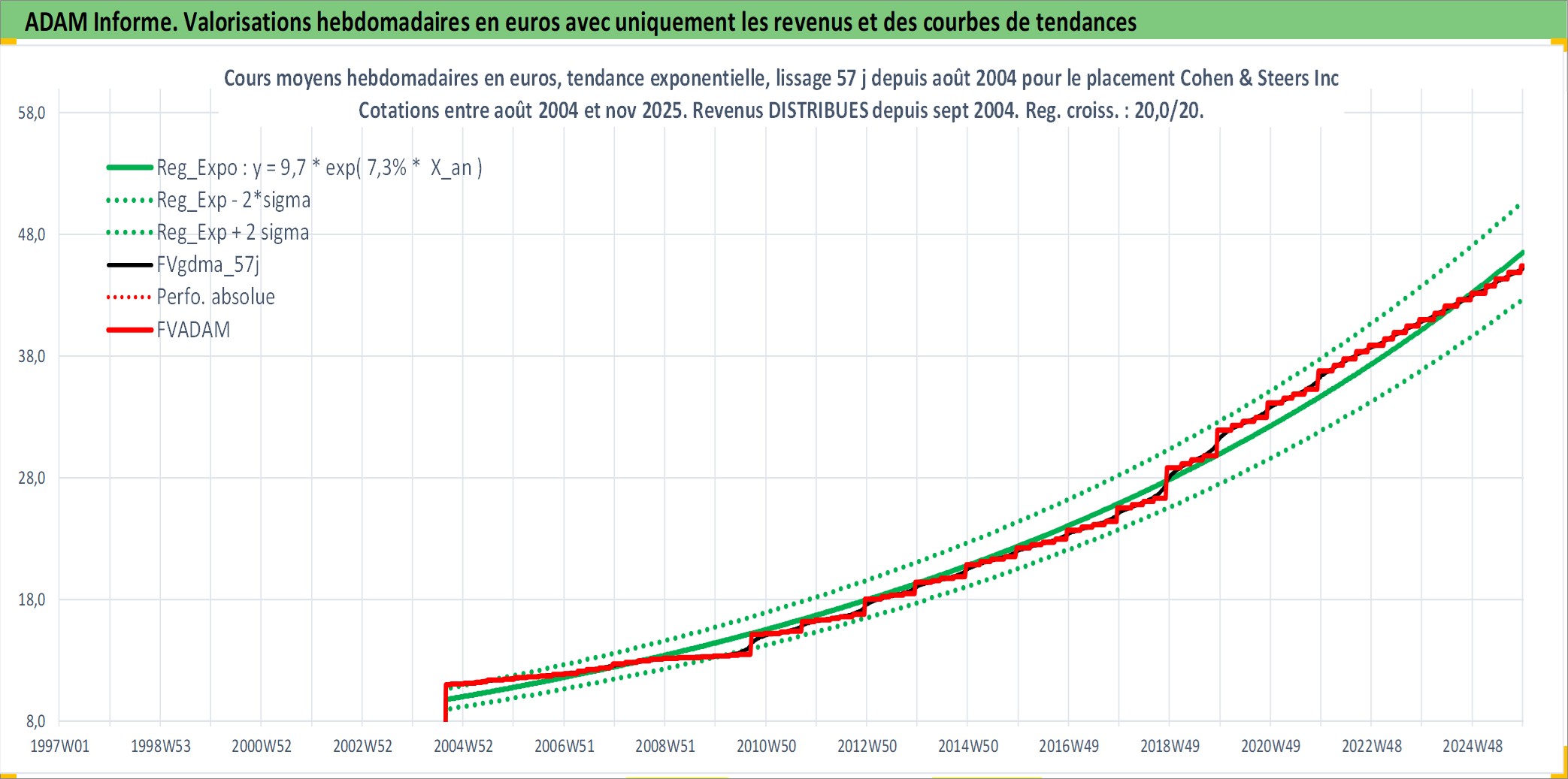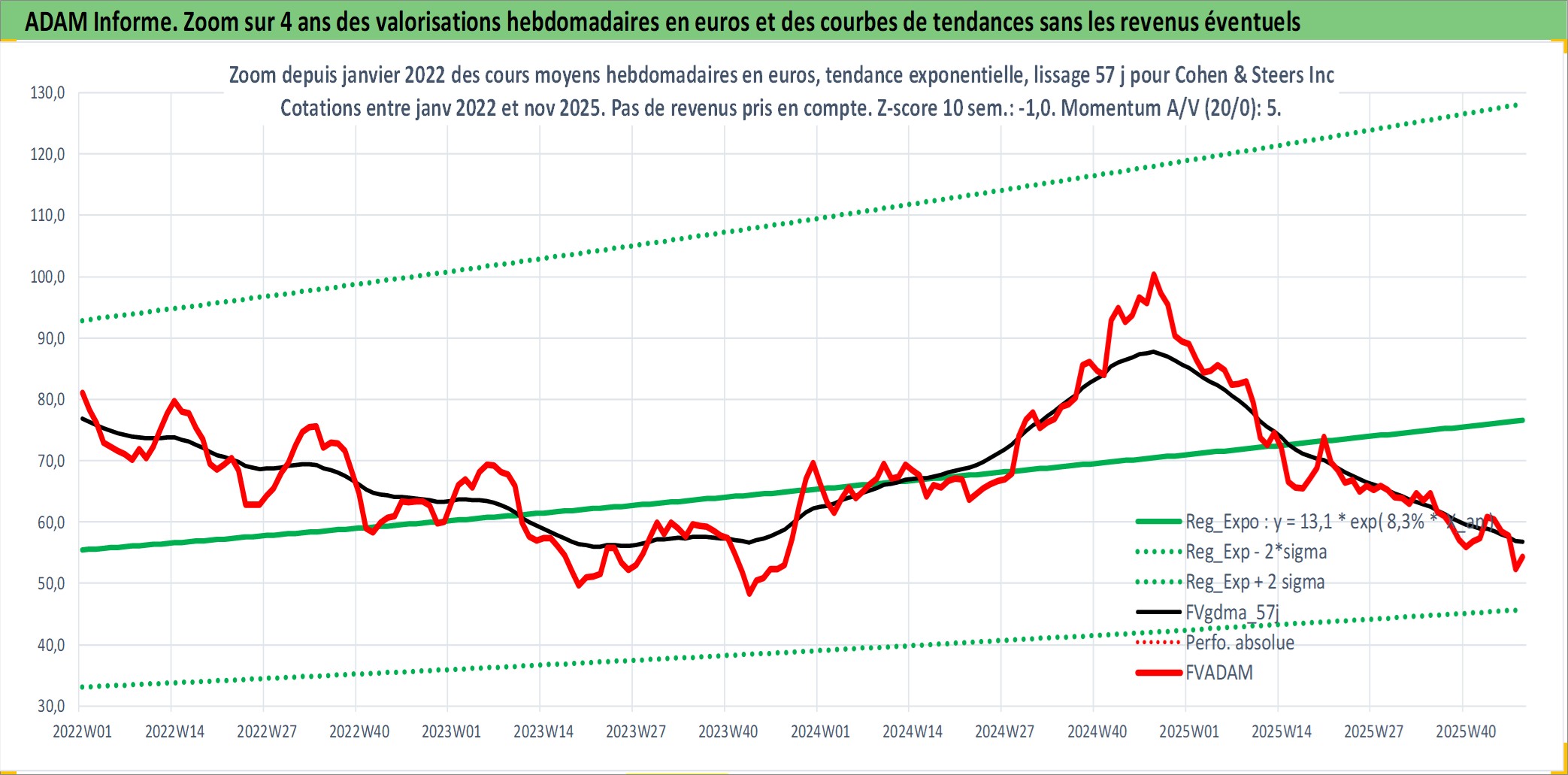 Site dédié aux investisseursPage dédiée sur site financeAnalyse des valorisations hebdomadaires de l'action Cohen & Steers Inc. Cet actif est cote en USD. Les valorisations sont en contrevaleur EURO et couvrent les semaines 2004W34 a 2025W48. Les revenus de cet actif financier sont pris en compte depuis la semaine 2004W39. La note ESG de cet actif n'est pas connue.