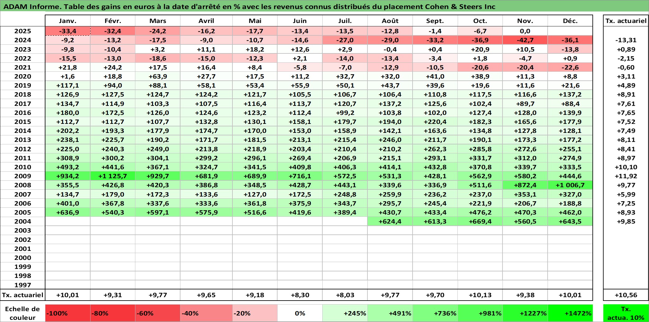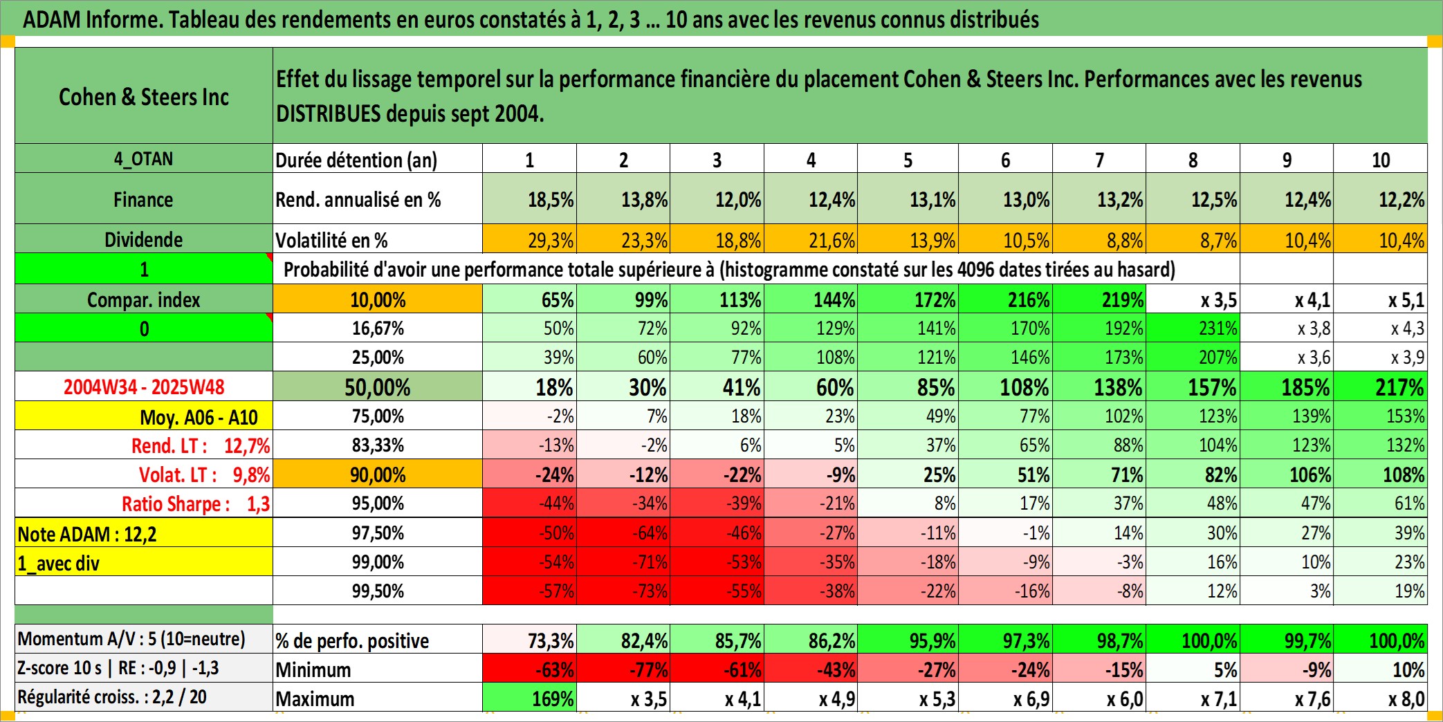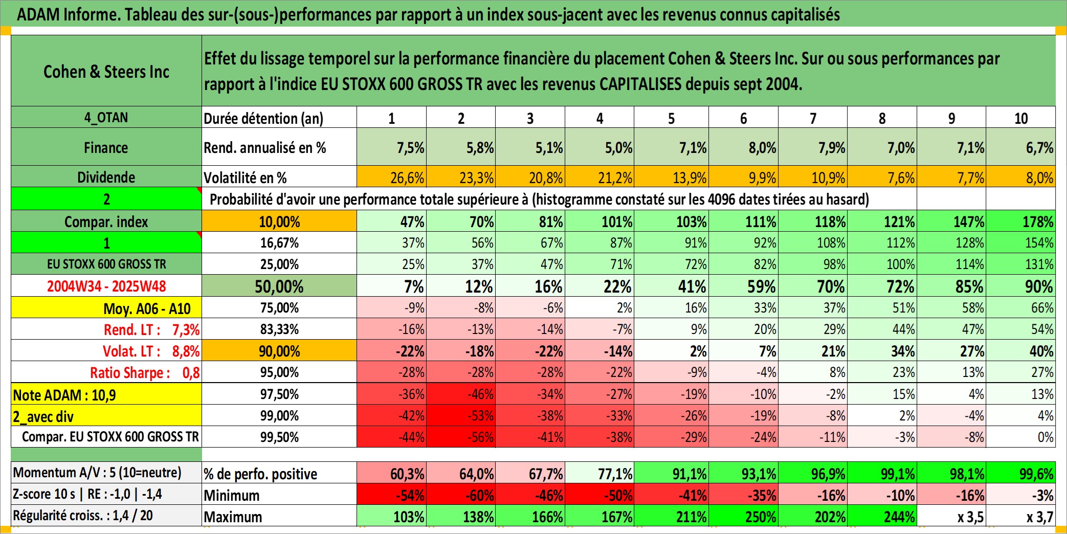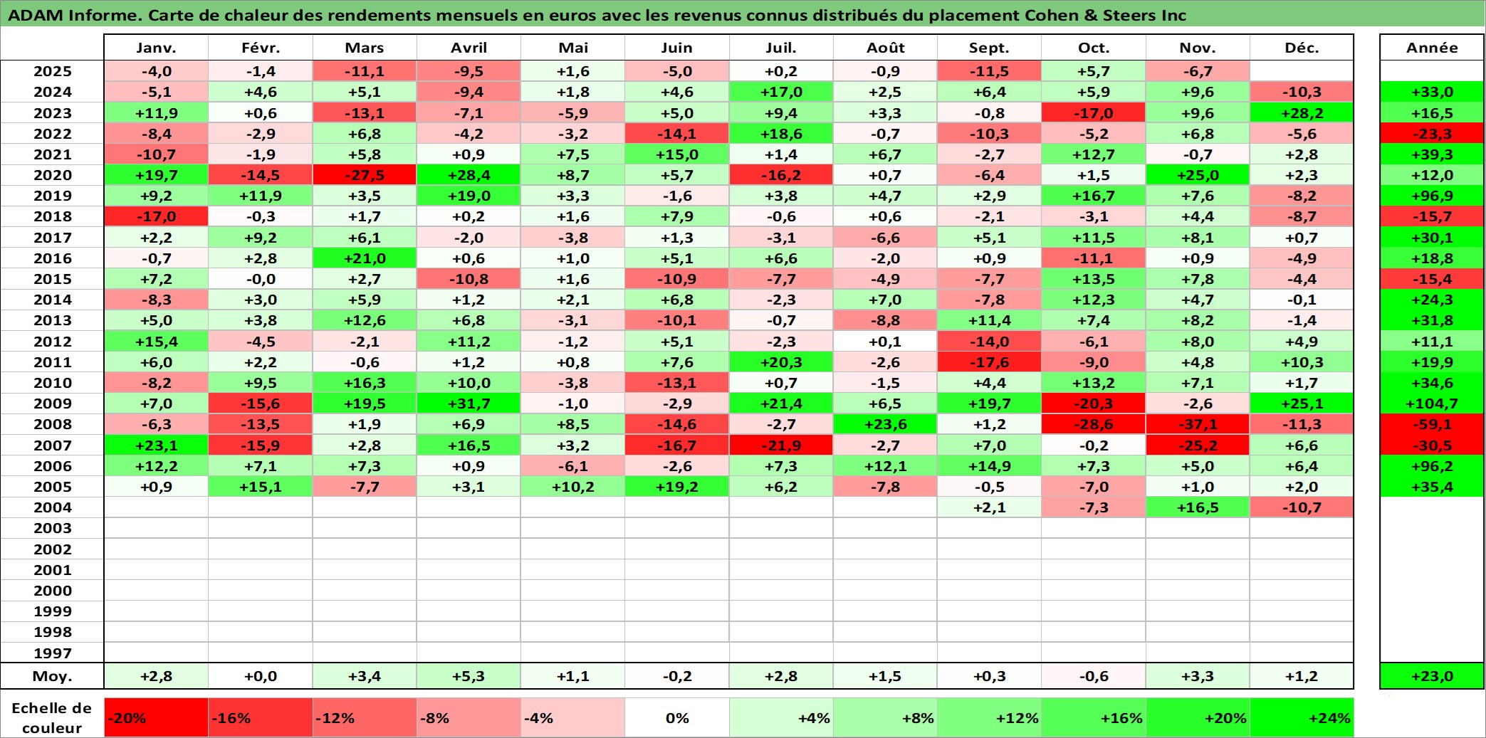 Site dédié aux investisseursPage dédiée sur site financeAnalyse des valorisations hebdomadaires de l'action Cohen & Steers Inc. Cet actif est cote en USD. Les valorisations sont en contrevaleur EURO et couvrent les semaines 2004W34 a 2025W48. Les revenus de cet actif financier sont pris en compte depuis la semaine 2004W39. La note ESG de cet actif n'est pas connue.