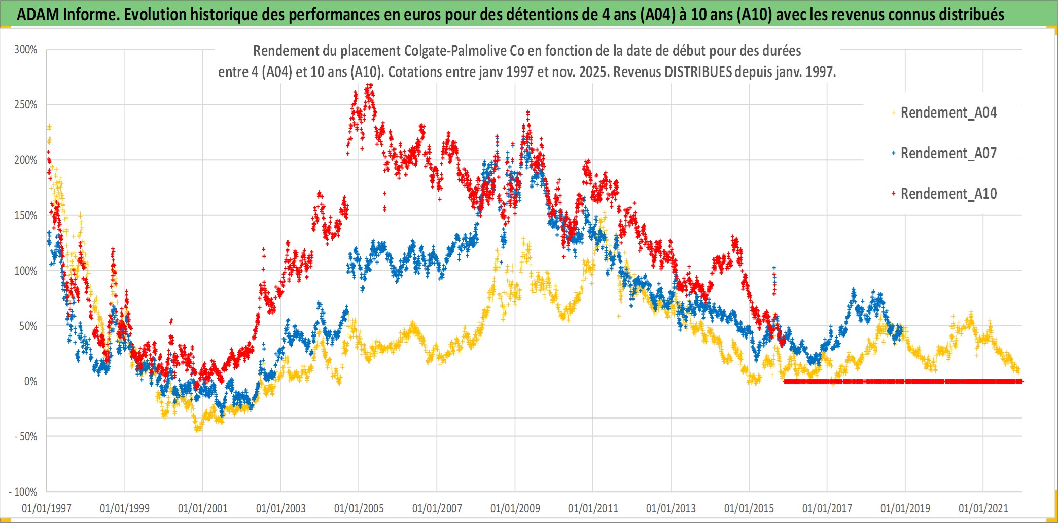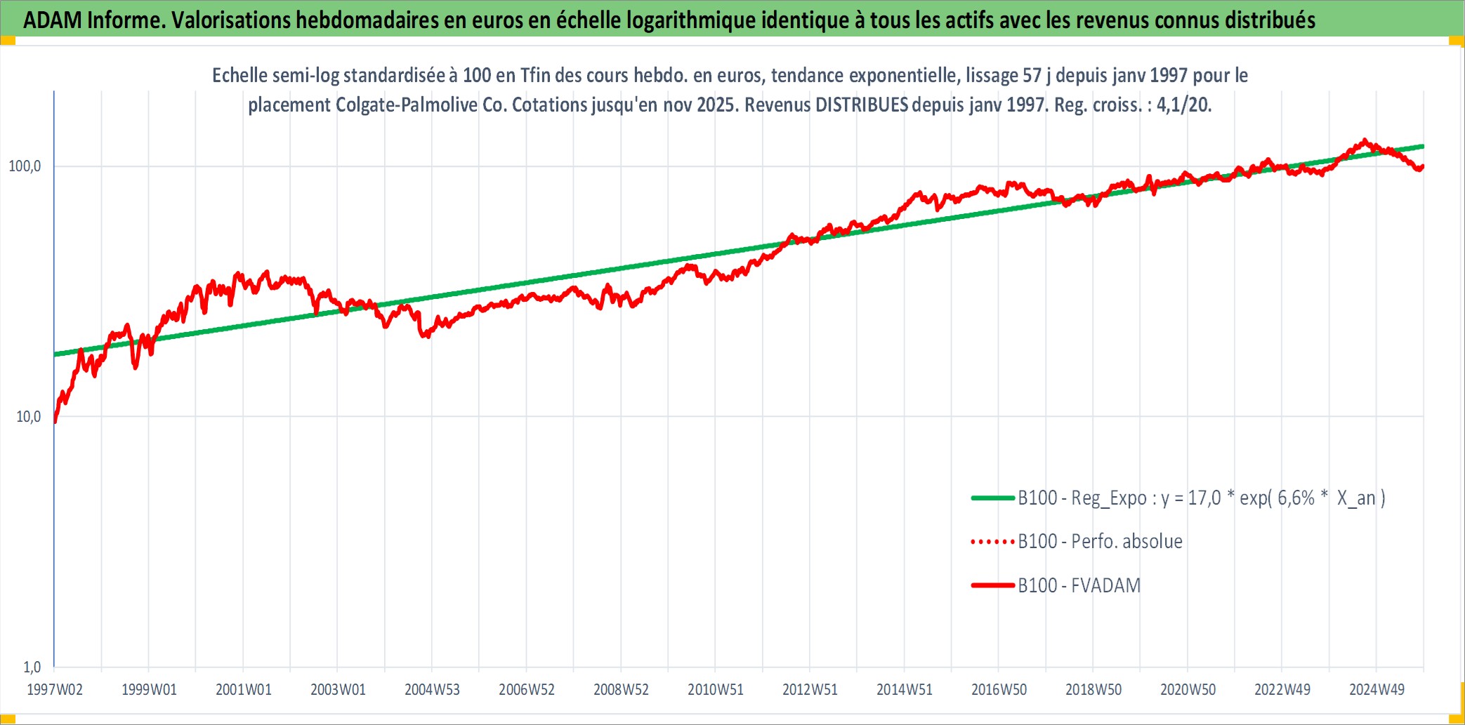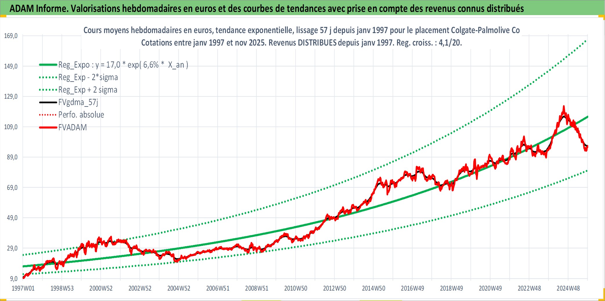 Site dédié aux investisseursPage dédiée sur site financeAnalyse des valorisations hebdomadaires de l'action Colgate-Palmolive Co. Cet actif est cote en USD. Les valorisations sont en contrevaleur EURO et couvrent les semaines 1997W01 a 2025W48. Les revenus de cet actif financier sont pris en compte depuis la semaine 1997W04. La note globale ESG de cet actif est estimee a 9.0 (apres rebasage entre 0 et 20).