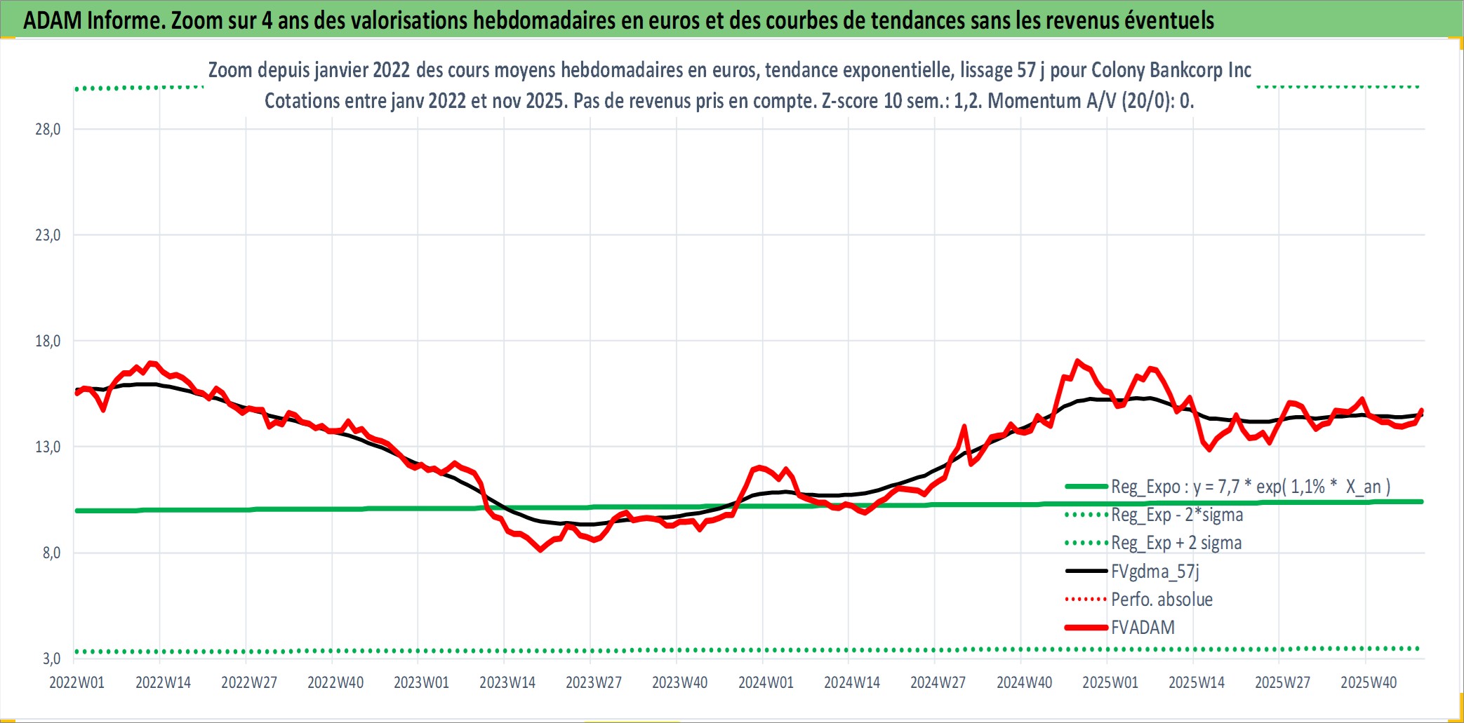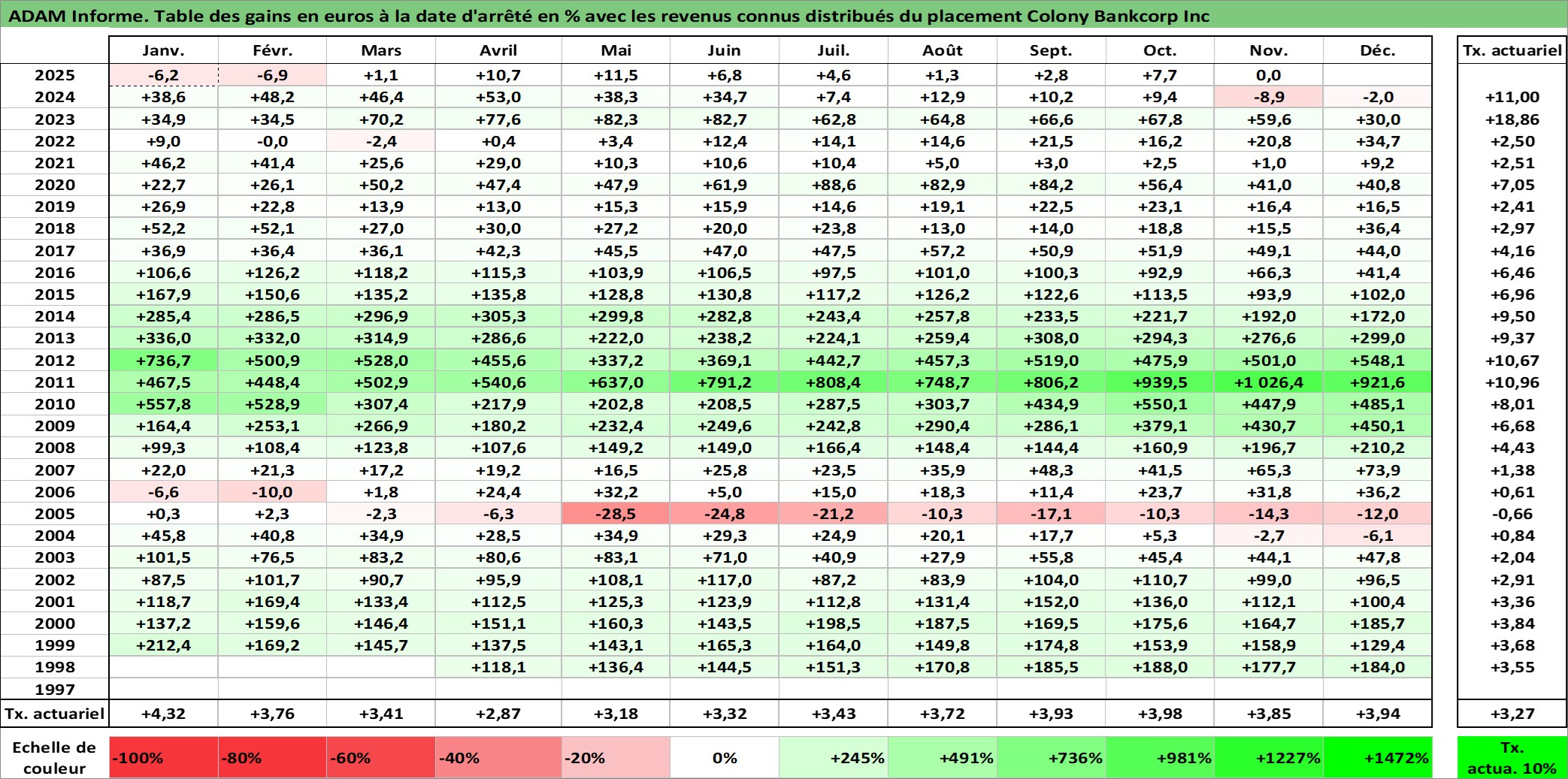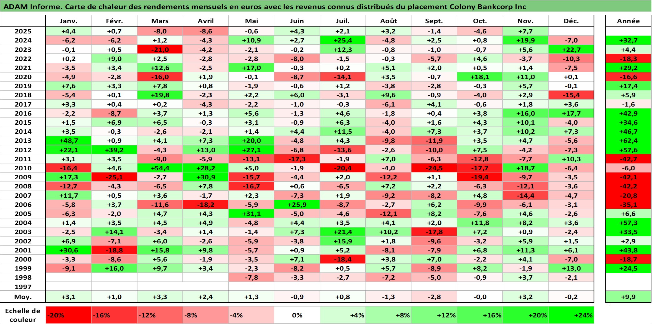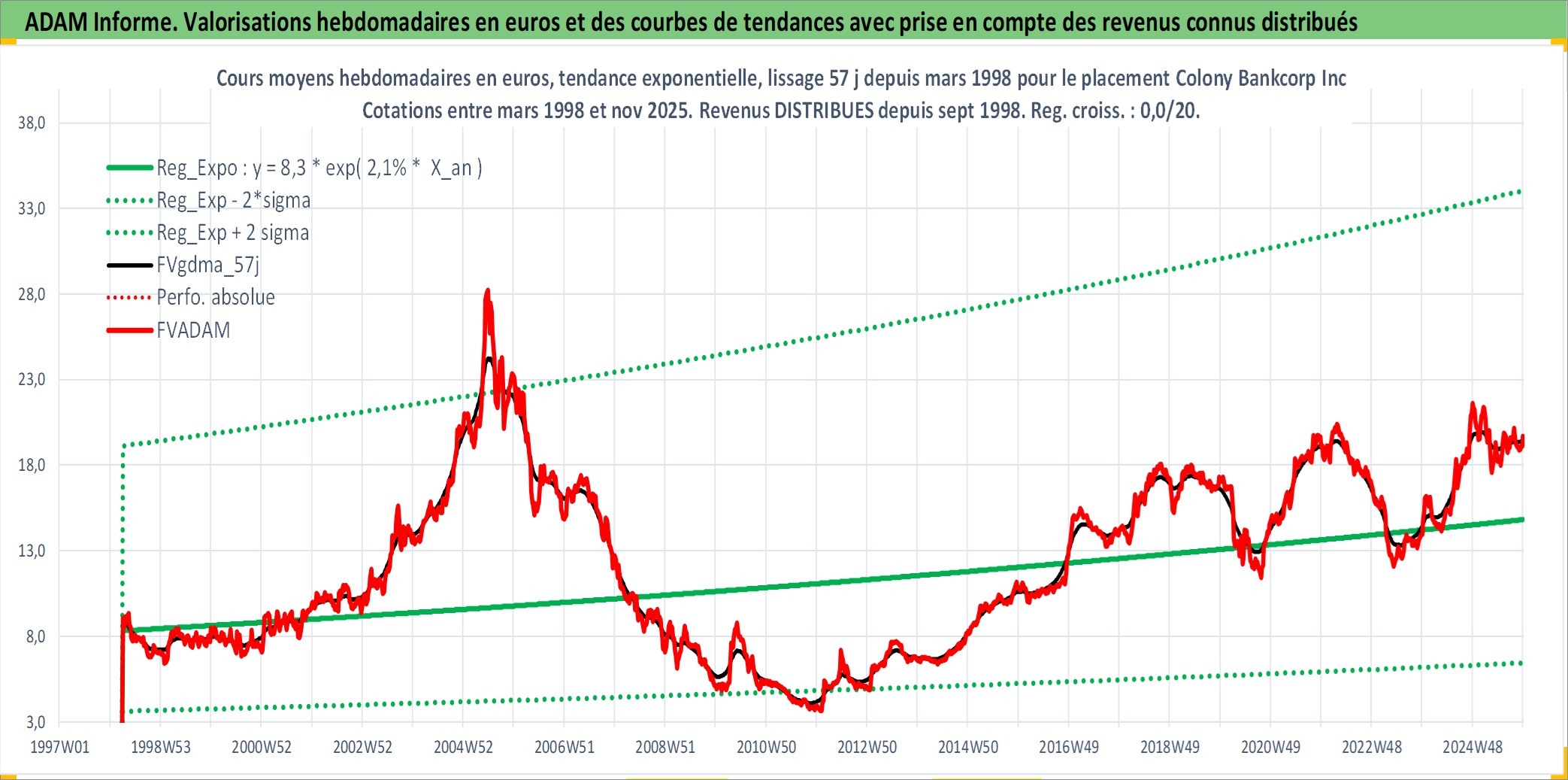 Site dédié aux investisseursPage dédiée sur site financeAnalyse des valorisations hebdomadaires de l'action Colony Bankcorp Inc. Cet actif est cote en USD. Les valorisations sont en contrevaleur EURO et couvrent les semaines 1998W14 a 2025W48. Les revenus de cet actif financier sont pris en compte depuis la semaine 1998W40. La note ESG de cet actif n'est pas connue.