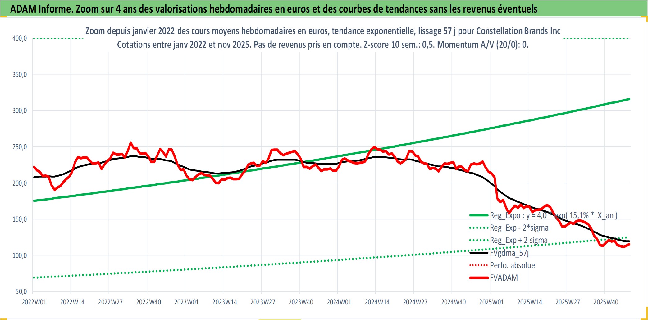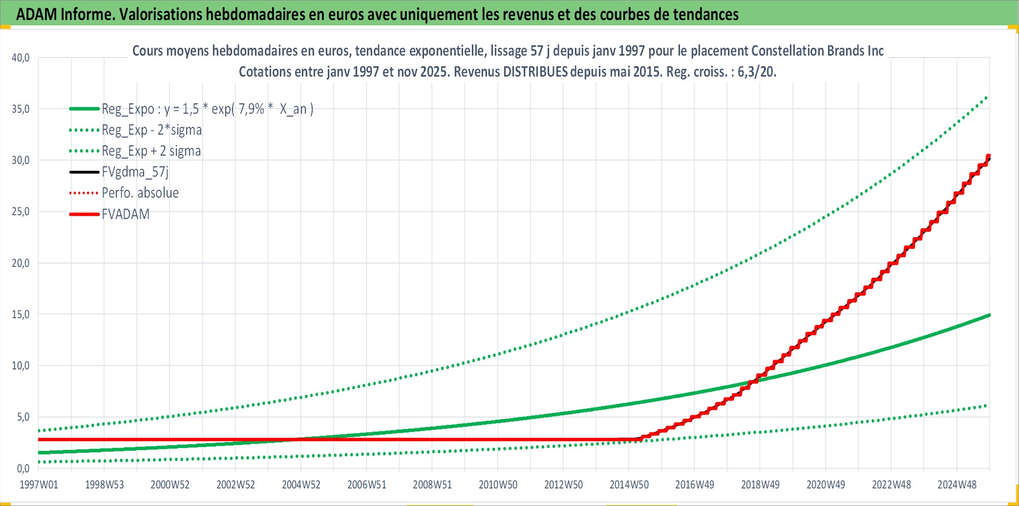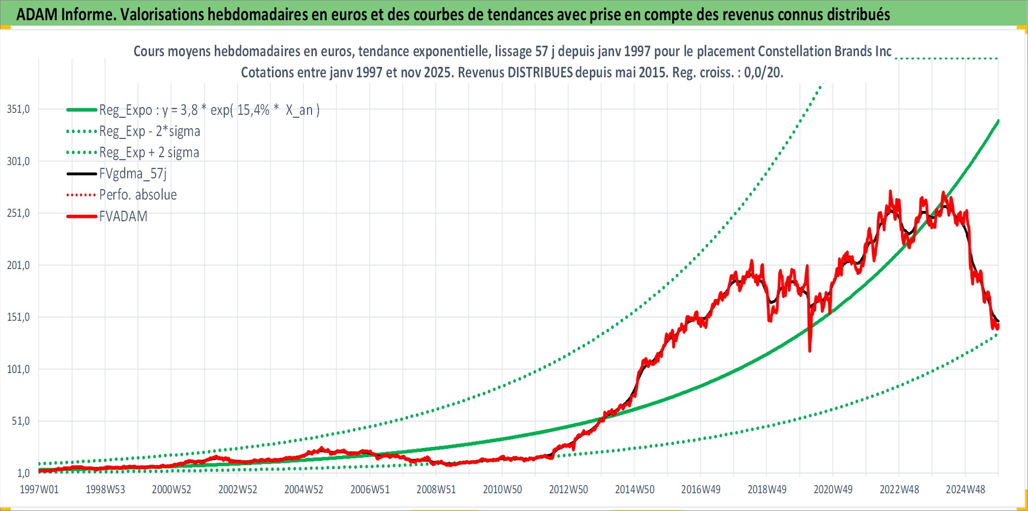 Site dédié aux investisseursPage dédiée sur site financeAnalyse des valorisations hebdomadaires de l'action Constellation Brands Inc. Cet actif est cote en USD. Les valorisations sont en contrevaleur EURO et couvrent les semaines 1997W01 a 2025W48. Les revenus de cet actif financier sont pris en compte depuis la semaine 2015W19. La note globale ESG de cet actif est estimee a 7.0 (apres rebasage entre 0 et 20).