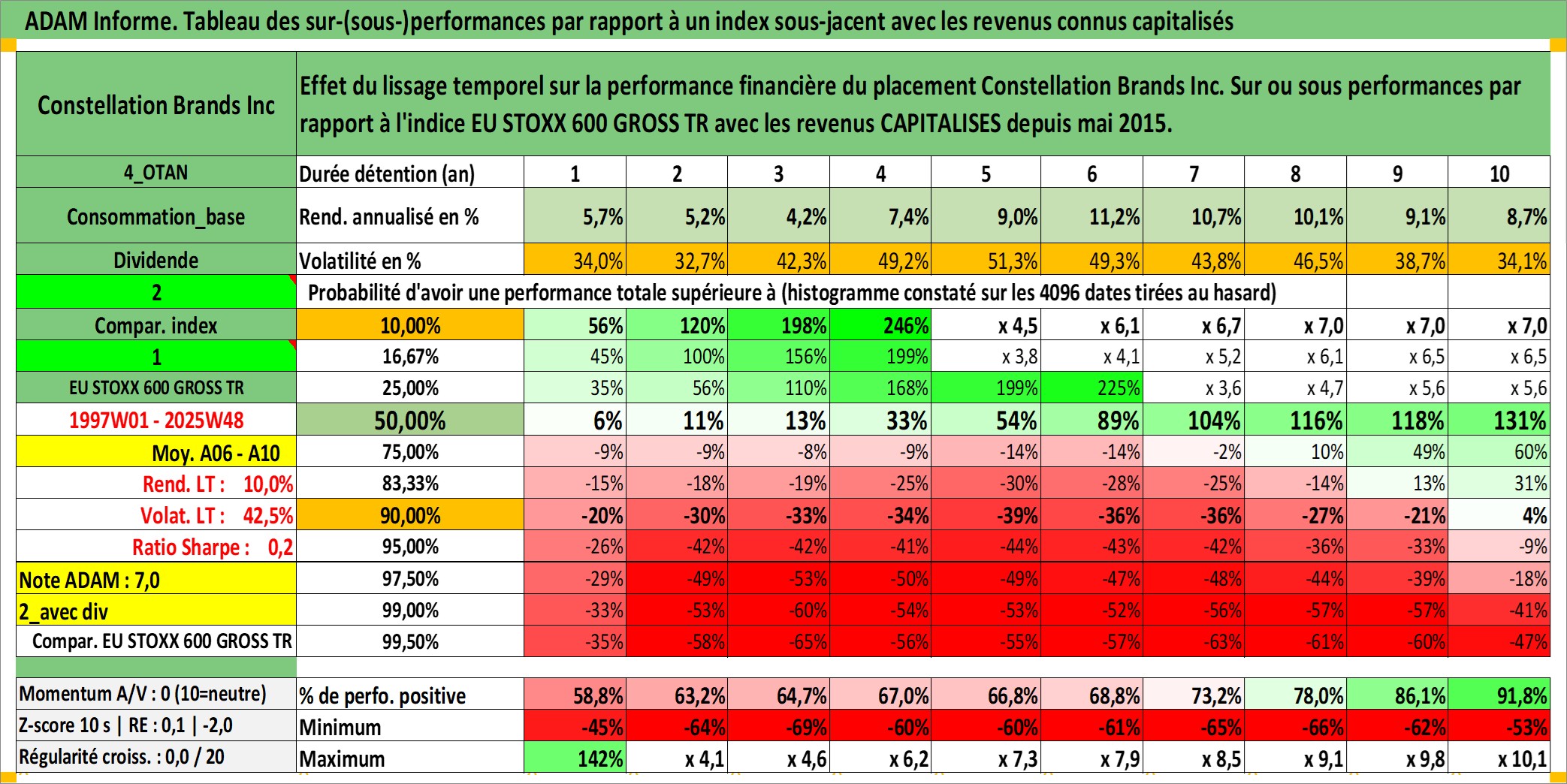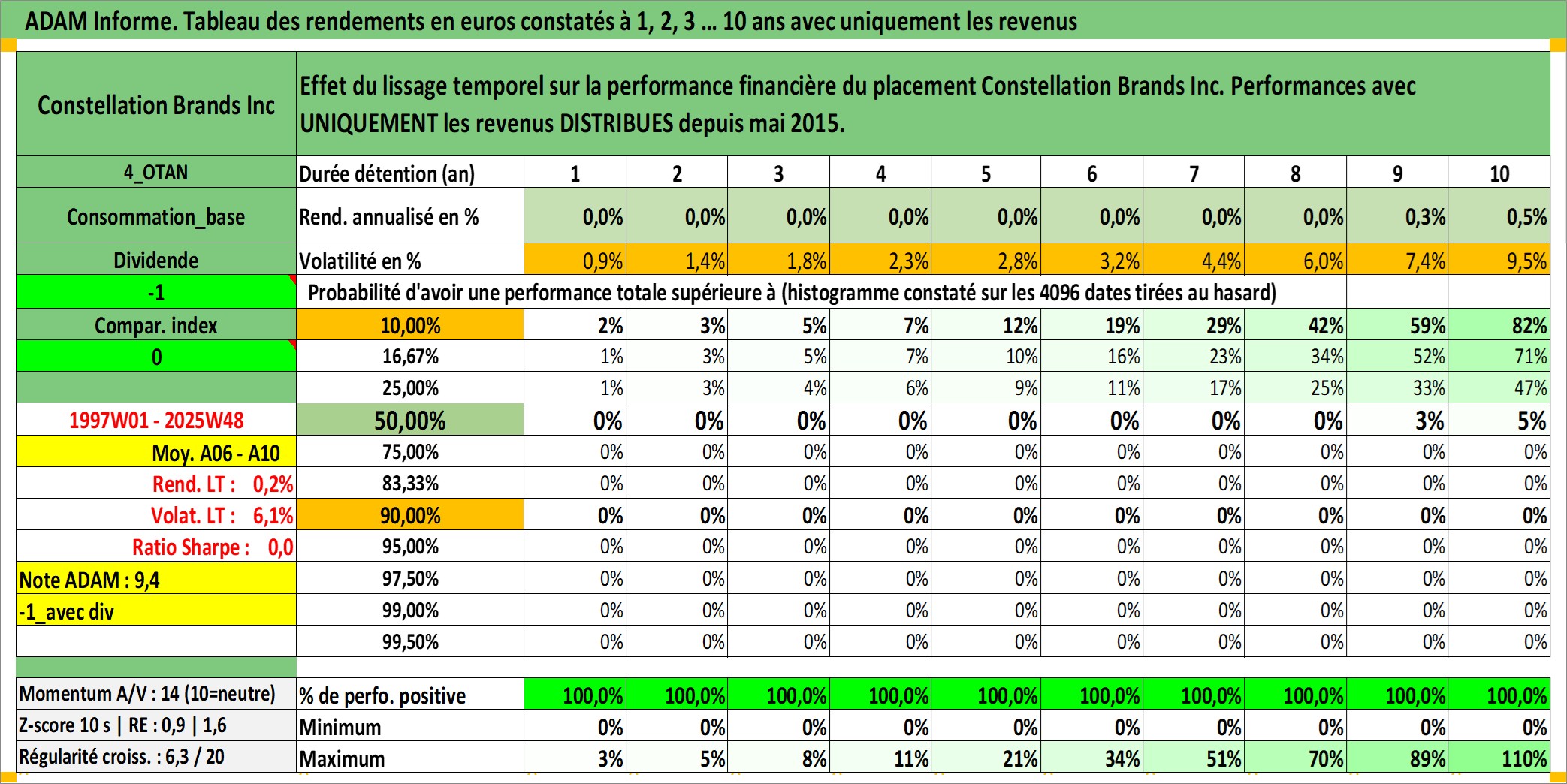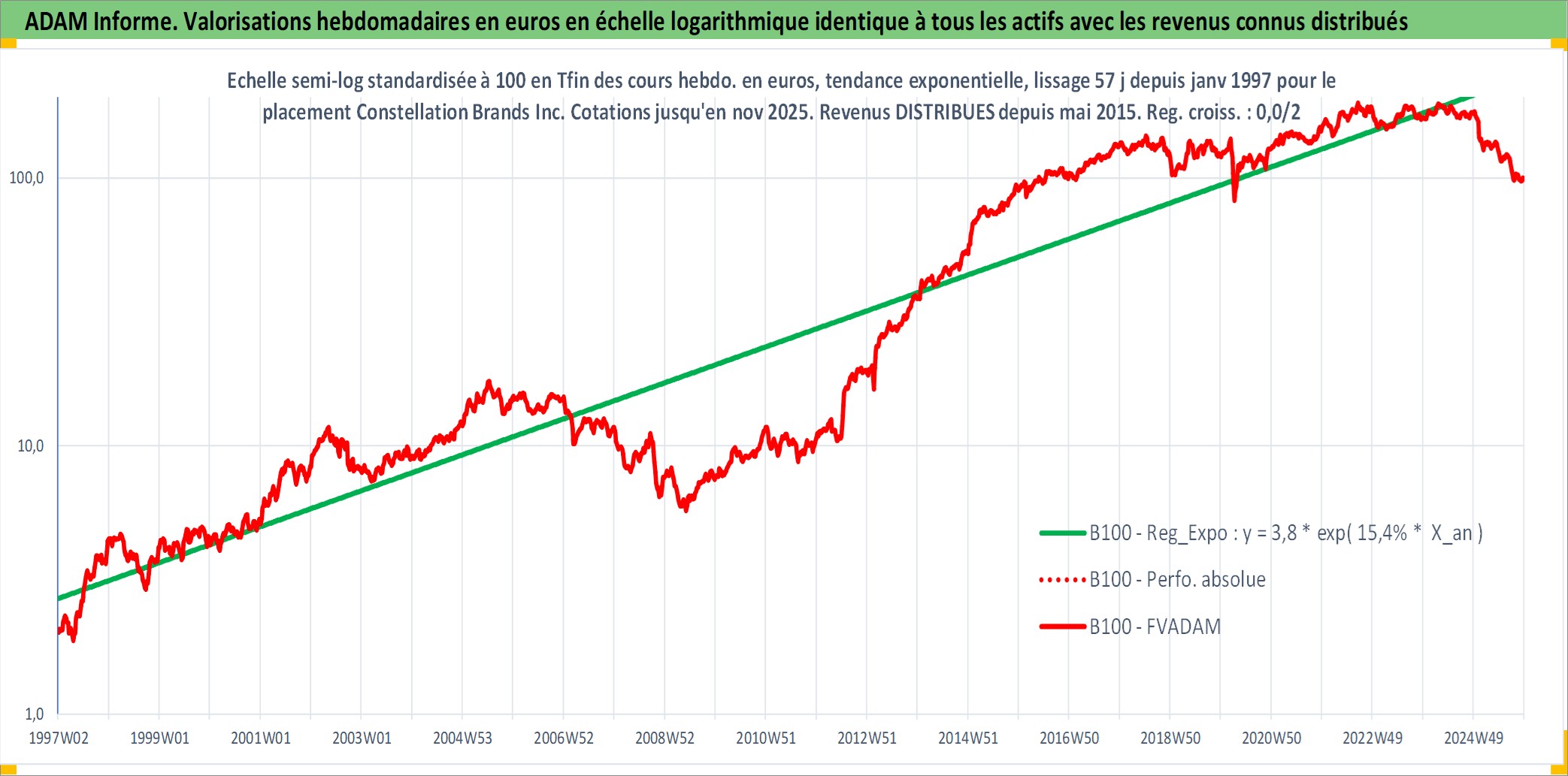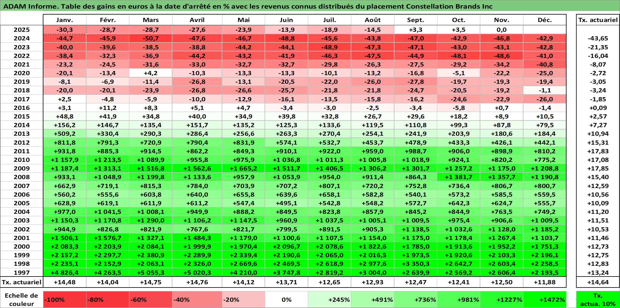 Site dédié aux investisseursPage dédiée sur site financeAnalyse des valorisations hebdomadaires de l'action Constellation Brands Inc. Cet actif est cote en USD. Les valorisations sont en contrevaleur EURO et couvrent les semaines 1997W01 a 2025W48. Les revenus de cet actif financier sont pris en compte depuis la semaine 2015W19. La note globale ESG de cet actif est estimee a 7.0 (apres rebasage entre 0 et 20).
