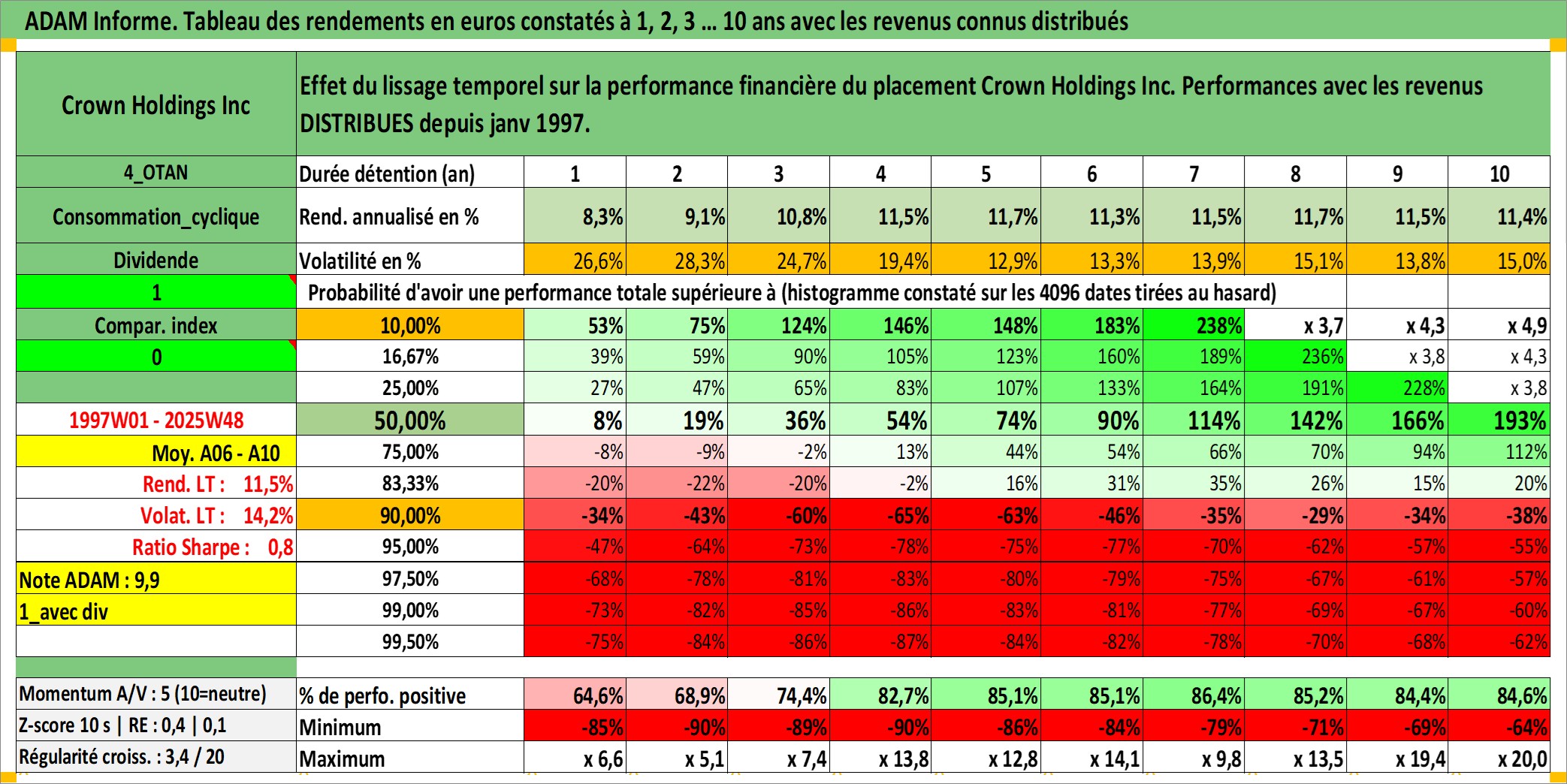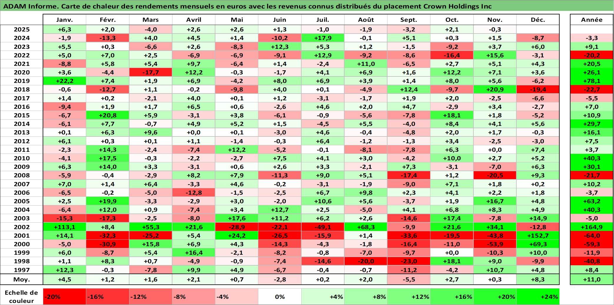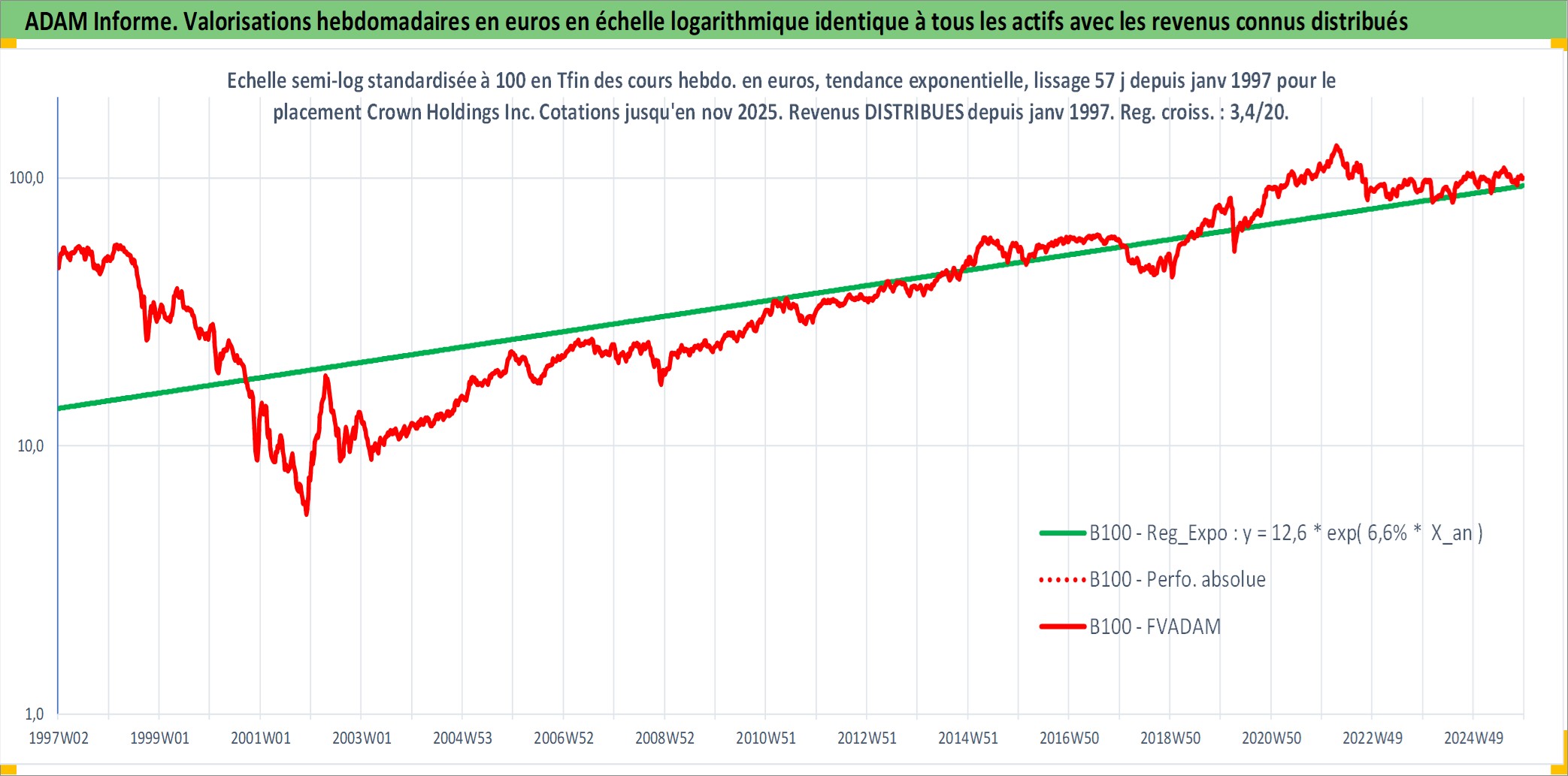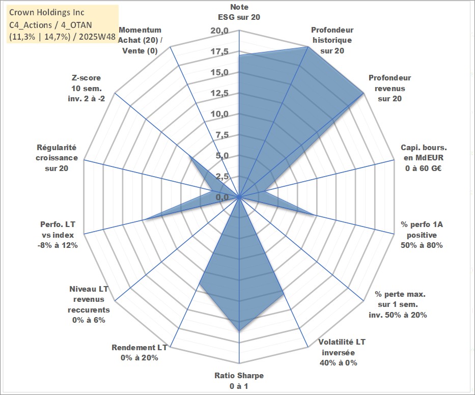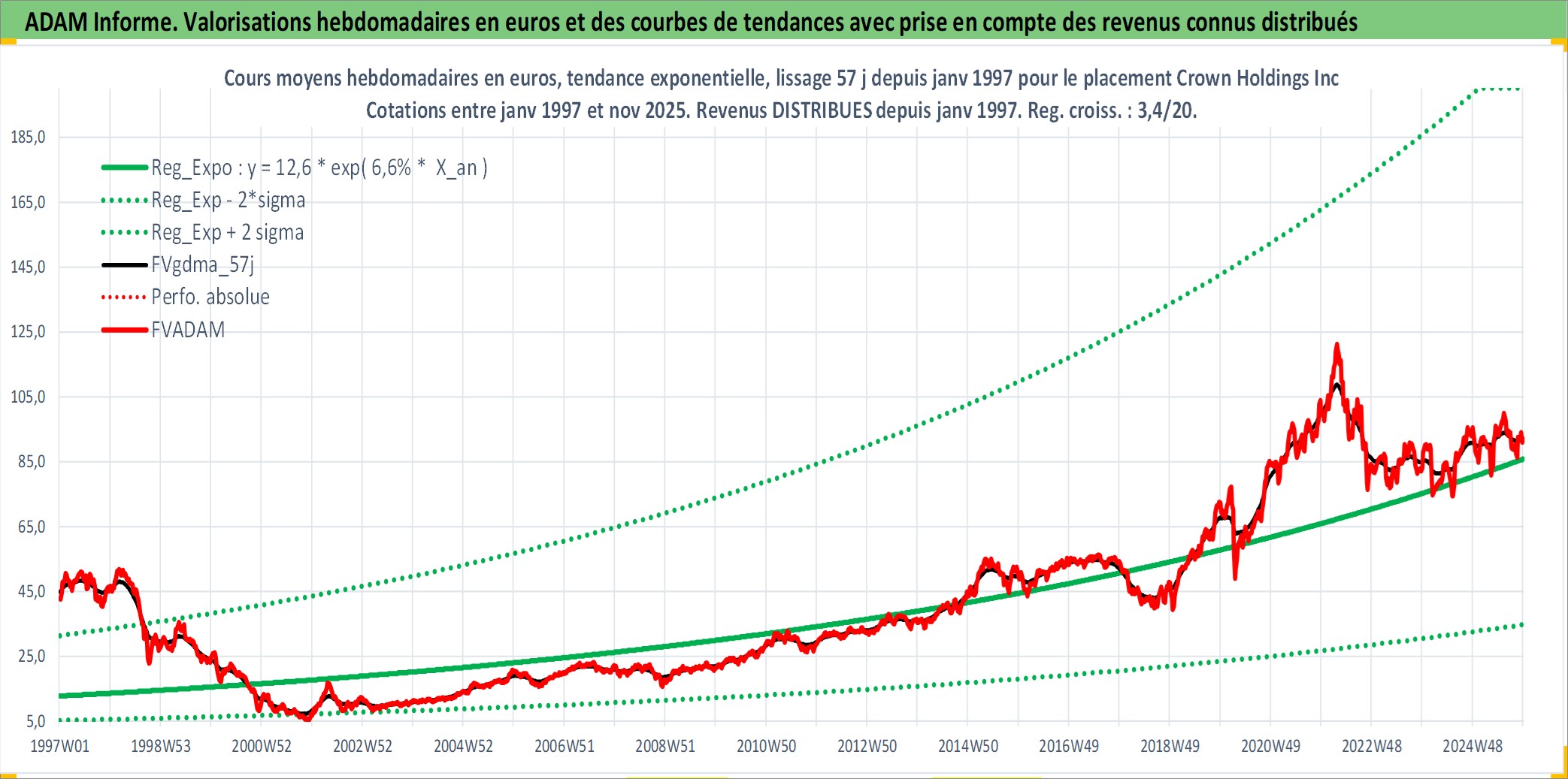 Site dédié aux investisseursPage dédiée sur site financeAnalyse des valorisations hebdomadaires de l'action Crown Holdings Inc. Cet actif est cote en USD. Les valorisations sont en contrevaleur EURO et couvrent les semaines 1997W01 a 2025W48. Les revenus de cet actif financier sont pris en compte depuis la semaine 1997W05. La note globale ESG de cet actif est estimee a 17.0 (apres rebasage entre 0 et 20).