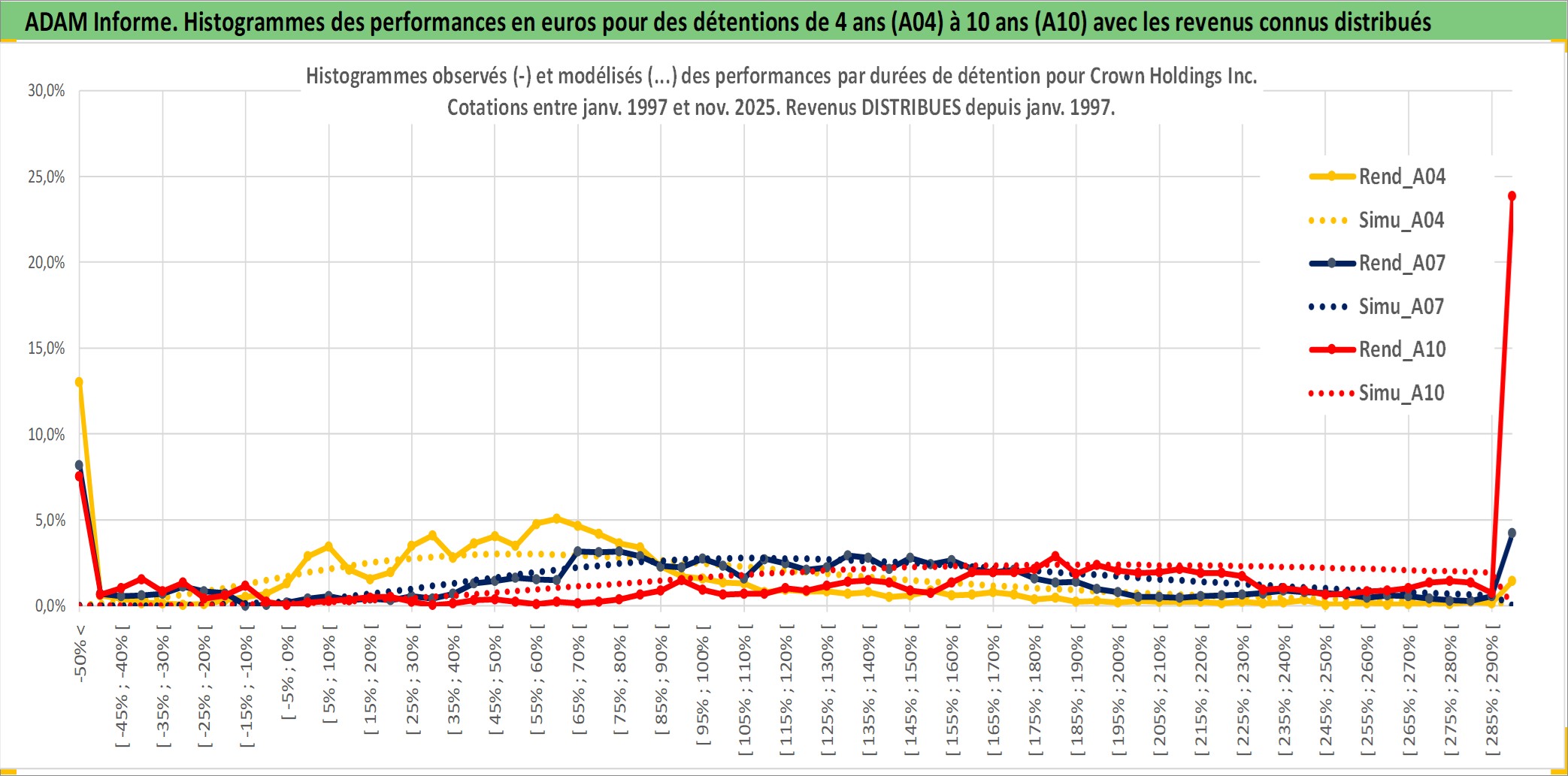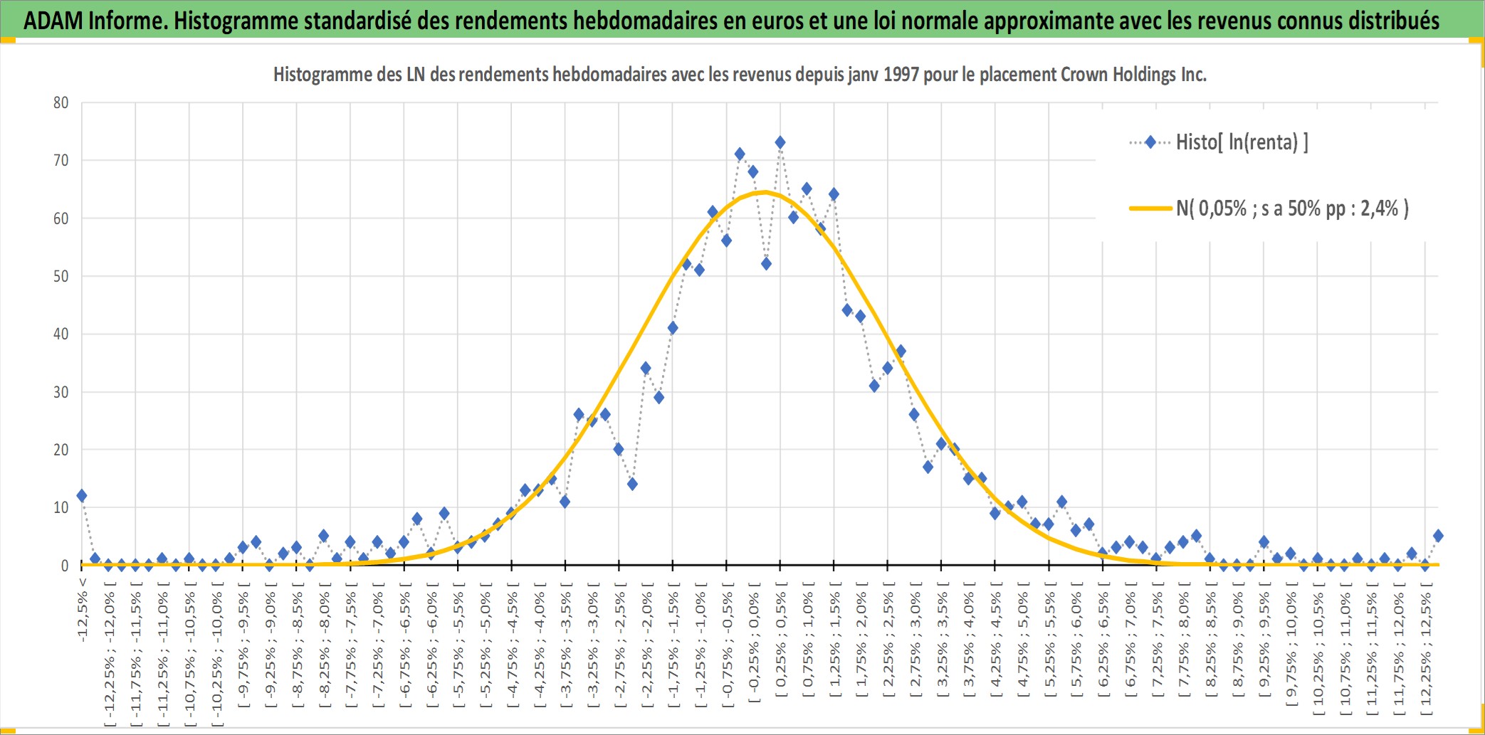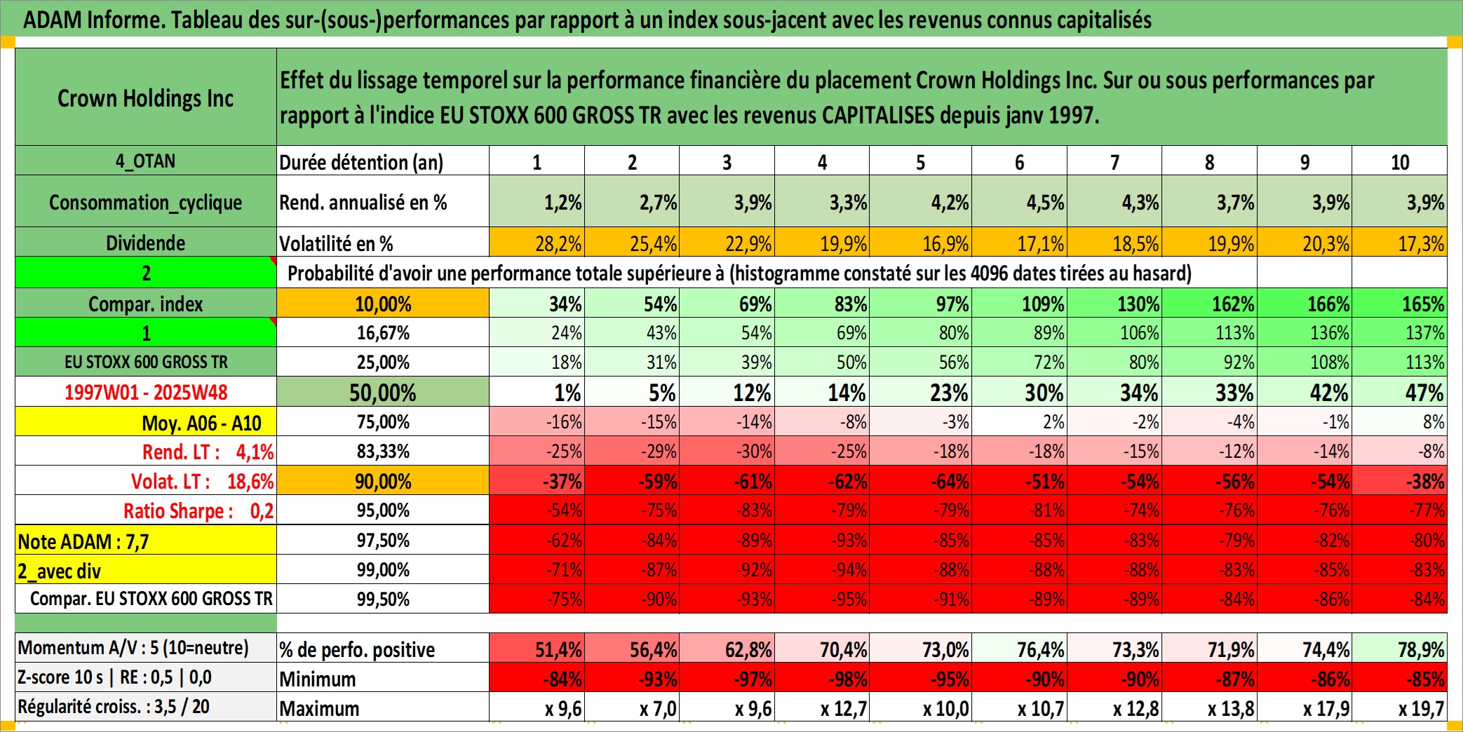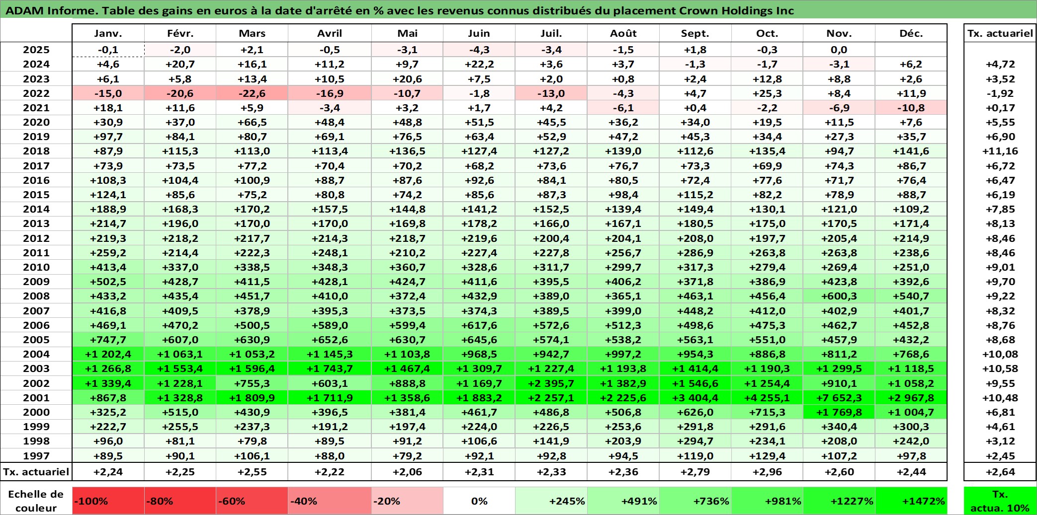 Site dédié aux investisseursPage dédiée sur site financeAnalyse des valorisations hebdomadaires de l'action Crown Holdings Inc. Cet actif est cote en USD. Les valorisations sont en contrevaleur EURO et couvrent les semaines 1997W01 a 2025W48. Les revenus de cet actif financier sont pris en compte depuis la semaine 1997W05. La note globale ESG de cet actif est estimee a 17.0 (apres rebasage entre 0 et 20).