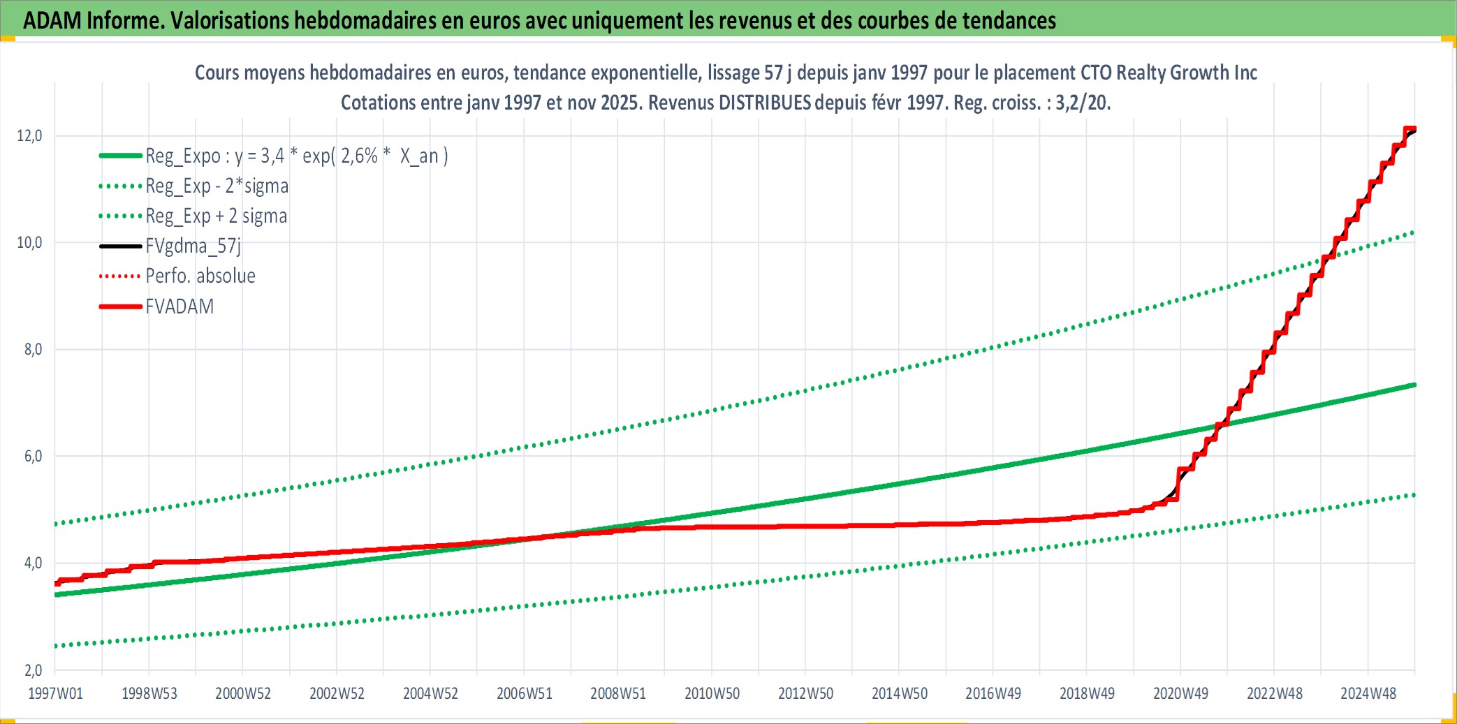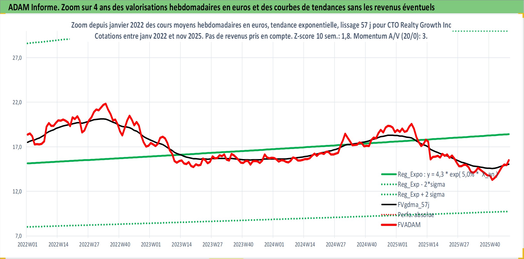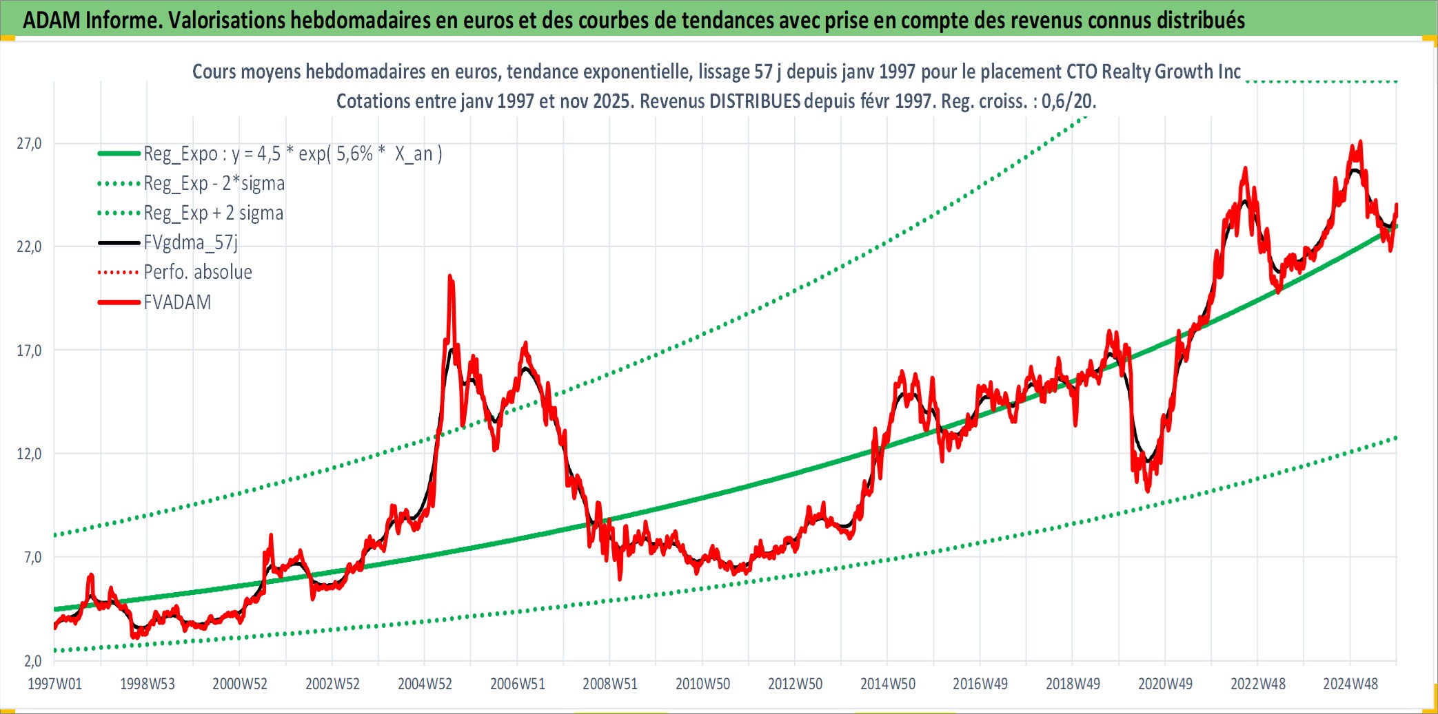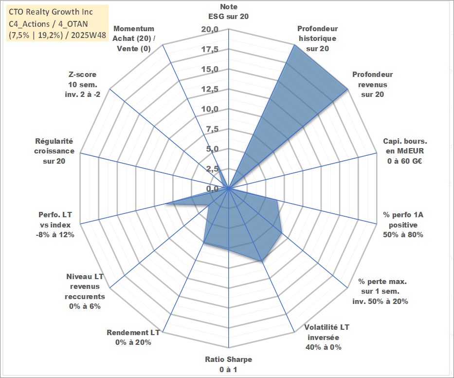 Site dédié aux investisseursPage dédiée sur site financeAnalyse des valorisations hebdomadaires de l'action CTO Realty Growth Inc. Cet actif est cote en USD. Les valorisations sont en contrevaleur EURO et couvrent les semaines 1997W01 a 2025W48. Les revenus de cet actif financier sont pris en compte depuis la semaine 1997W06. La note ESG de cet actif n'est pas connue.