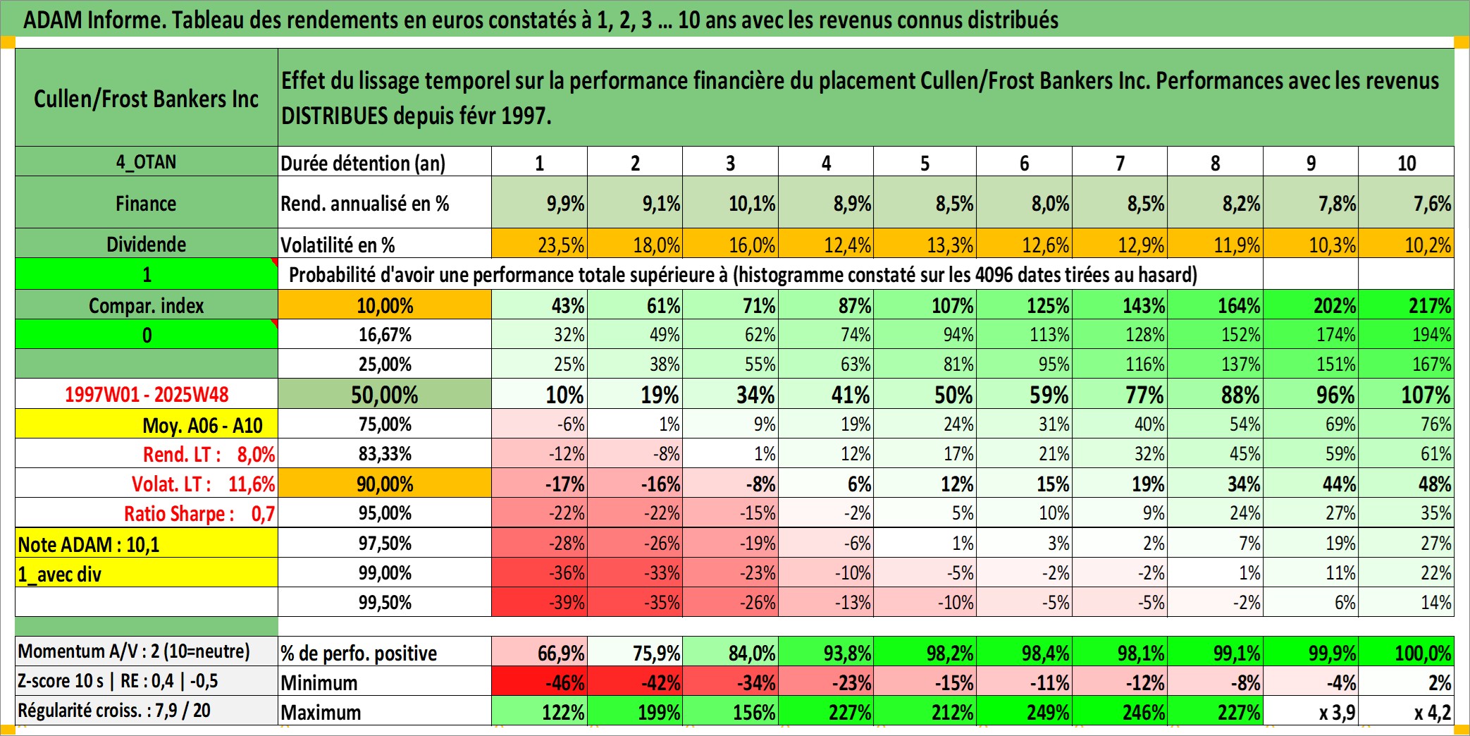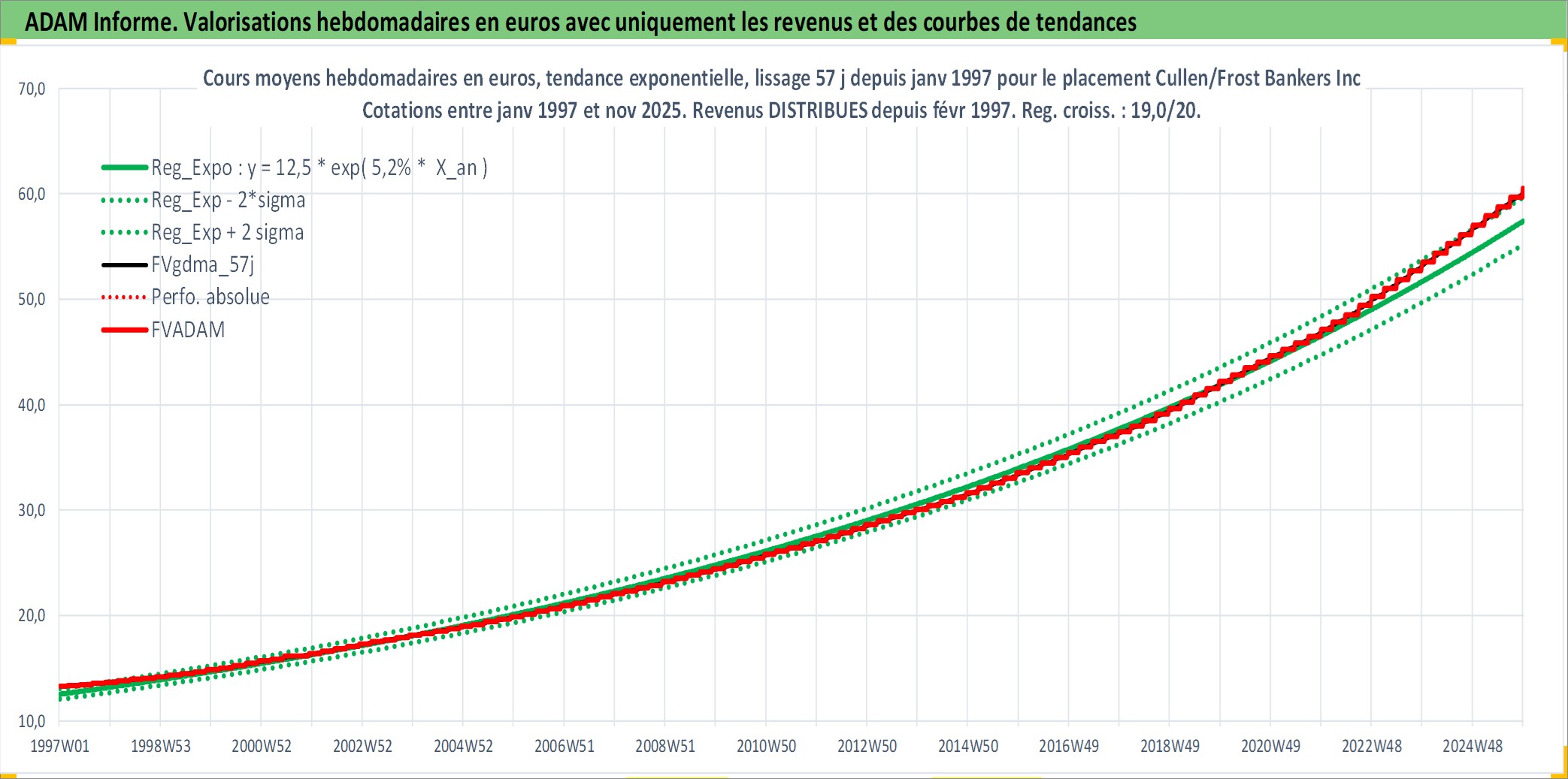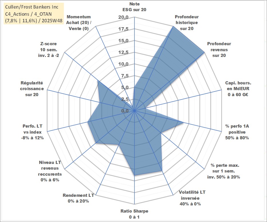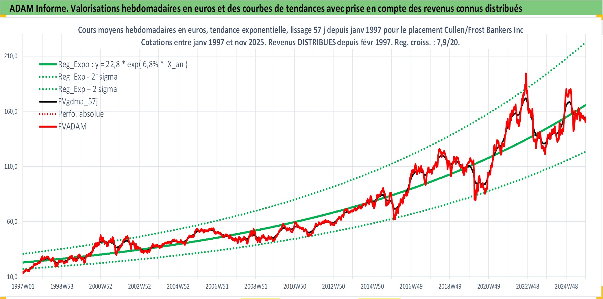 Site dédié aux investisseursPage dédiée sur site financeAnalyse des valorisations hebdomadaires de l'action Cullen/Frost Bankers Inc. Cet actif est cote en USD. Les valorisations sont en contrevaleur EURO et couvrent les semaines 1997W01 a 2025W48. Les revenus de cet actif financier sont pris en compte depuis la semaine 1997W09. La note globale ESG de cet actif est estimee a 5.0 (apres rebasage entre 0 et 20).