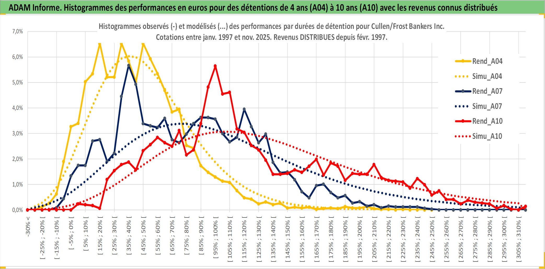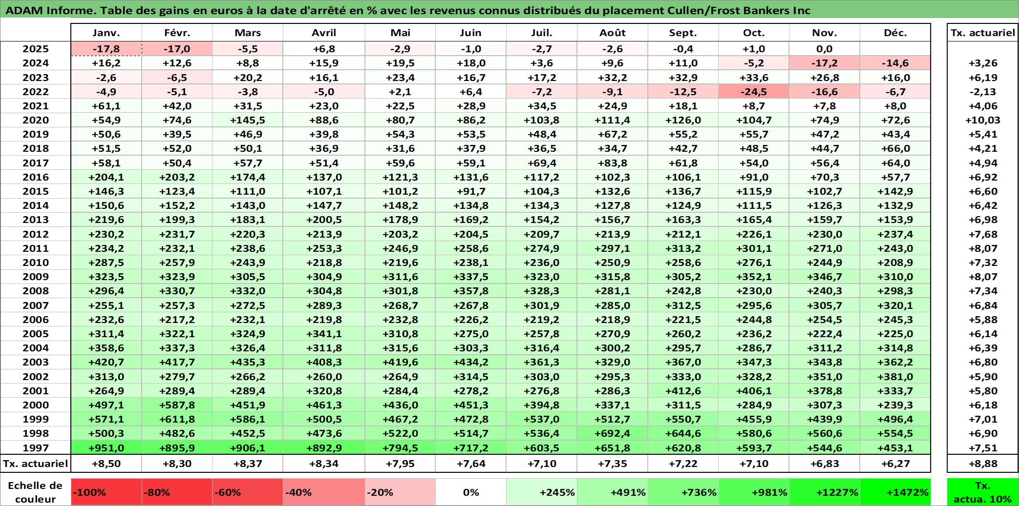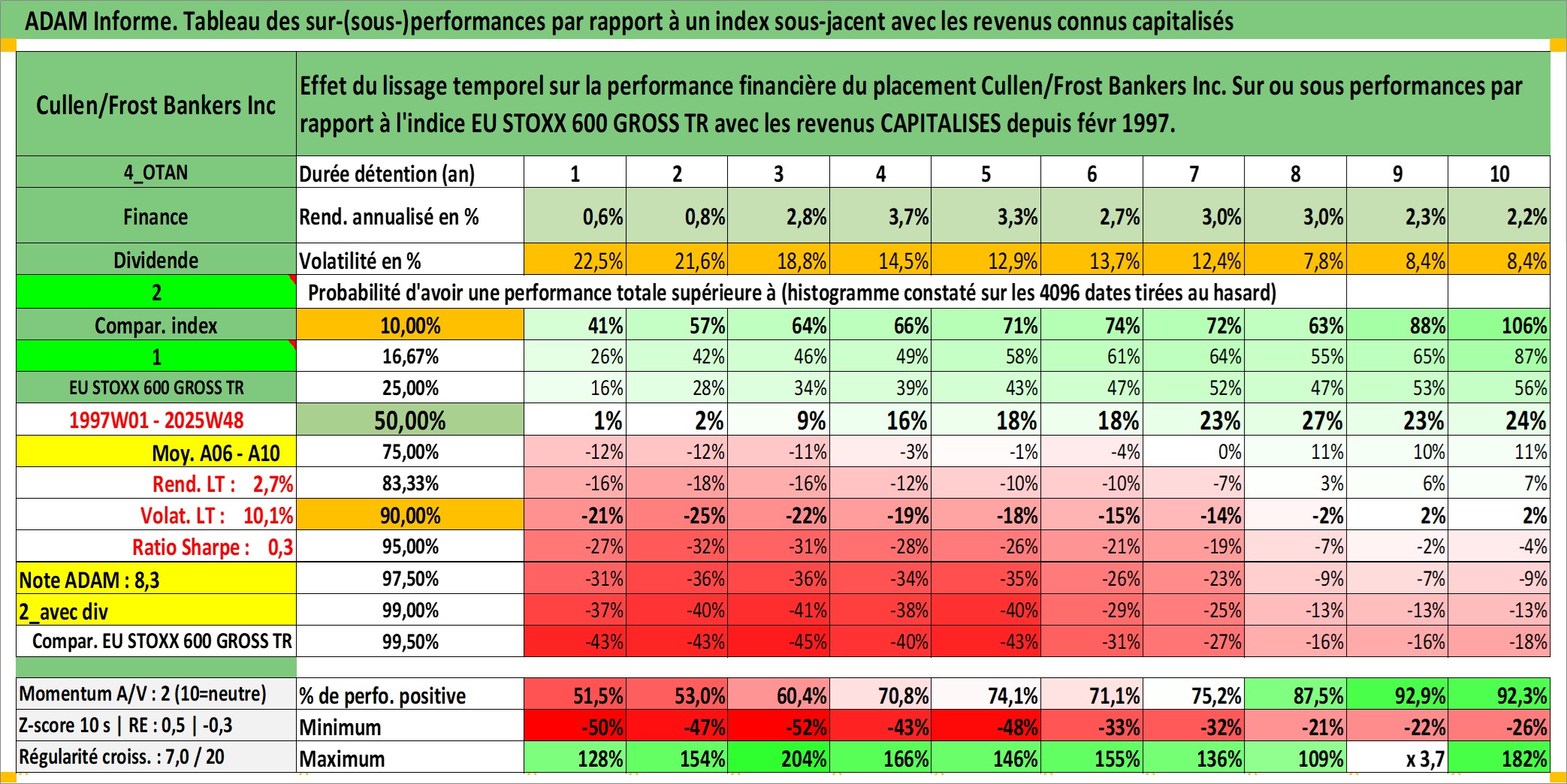 Site dédié aux investisseursPage dédiée sur site financeAnalyse des valorisations hebdomadaires de l'action Cullen/Frost Bankers Inc. Cet actif est cote en USD. Les valorisations sont en contrevaleur EURO et couvrent les semaines 1997W01 a 2025W48. Les revenus de cet actif financier sont pris en compte depuis la semaine 1997W09. La note globale ESG de cet actif est estimee a 5.0 (apres rebasage entre 0 et 20).