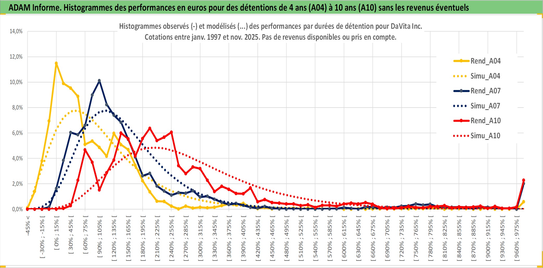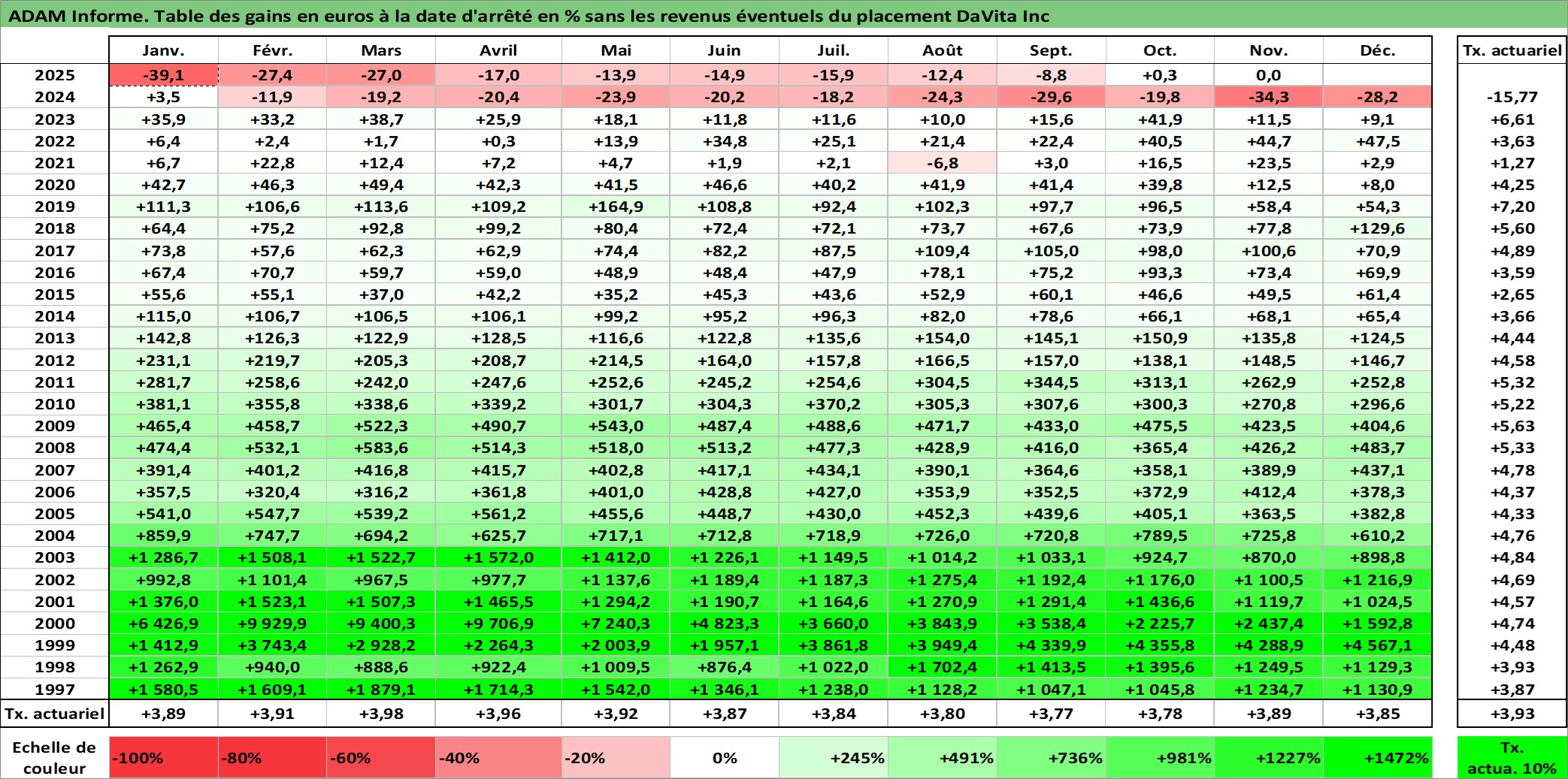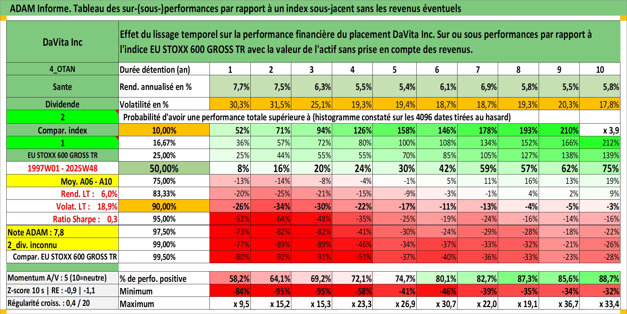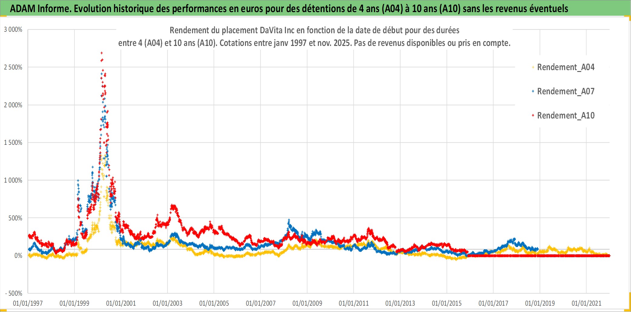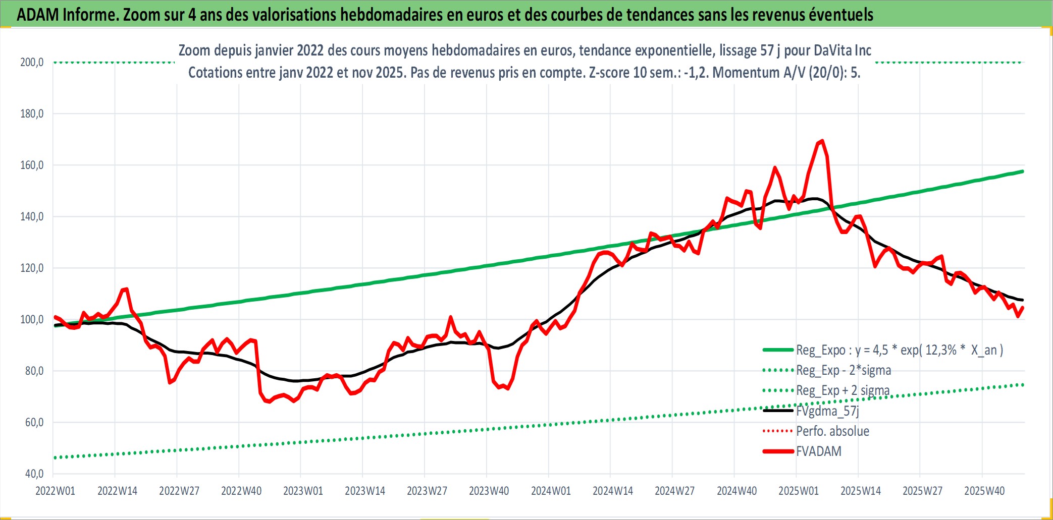 Site dédié aux investisseursPage dédiée sur site financeAnalyse des valorisations hebdomadaires de l'action DaVita Inc. Cet actif est cote en USD. Les valorisations sont en contrevaleur EURO et couvrent les semaines 1997W01 a 2025W48. Les revenus de cet actif financier ne sont pas connus car non existants ou non disponibles sur le site Yahoo Finance. La note globale ESG de cet actif est estimee a 9.0 (apres rebasage entre 0 et 20).