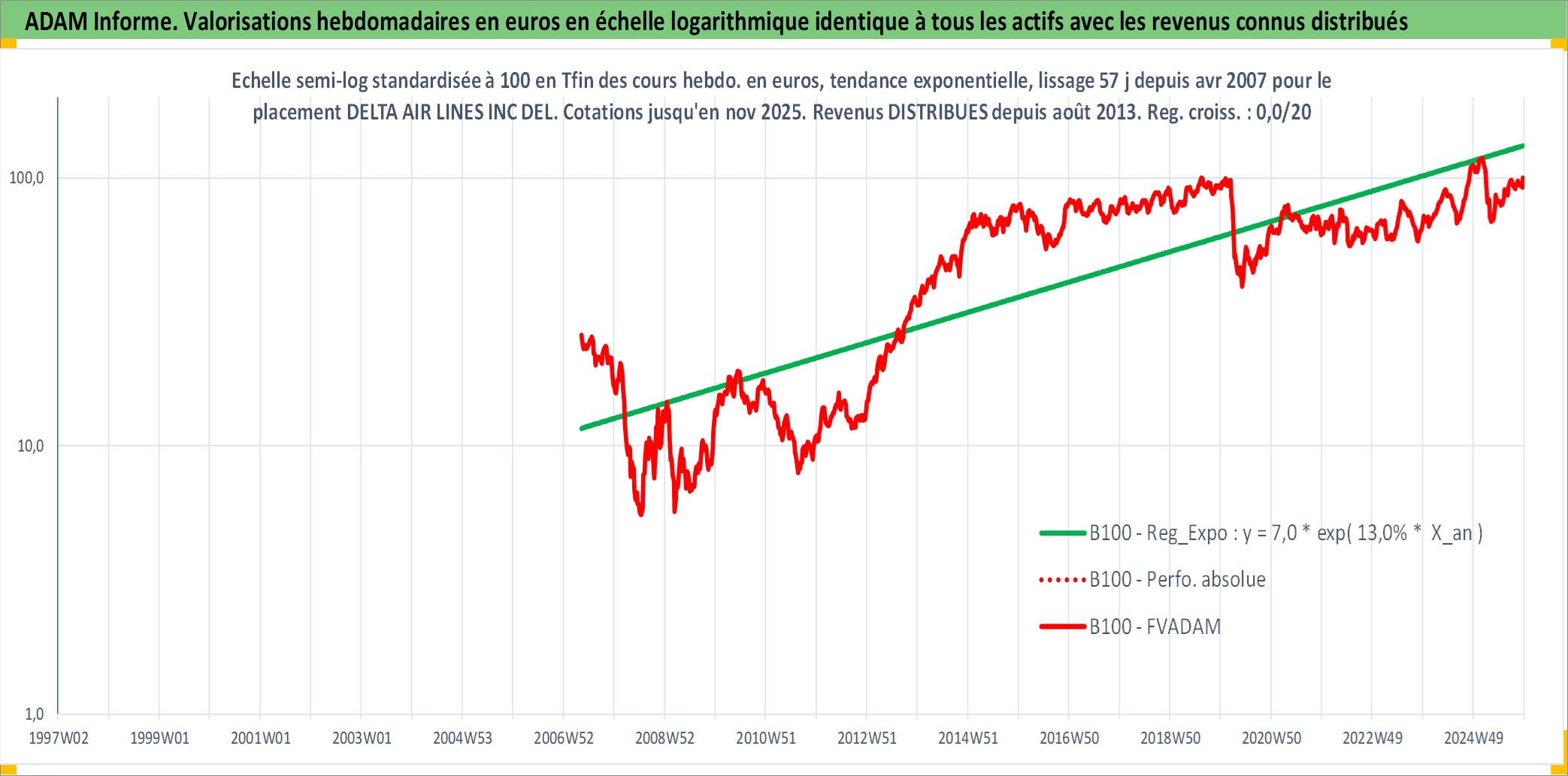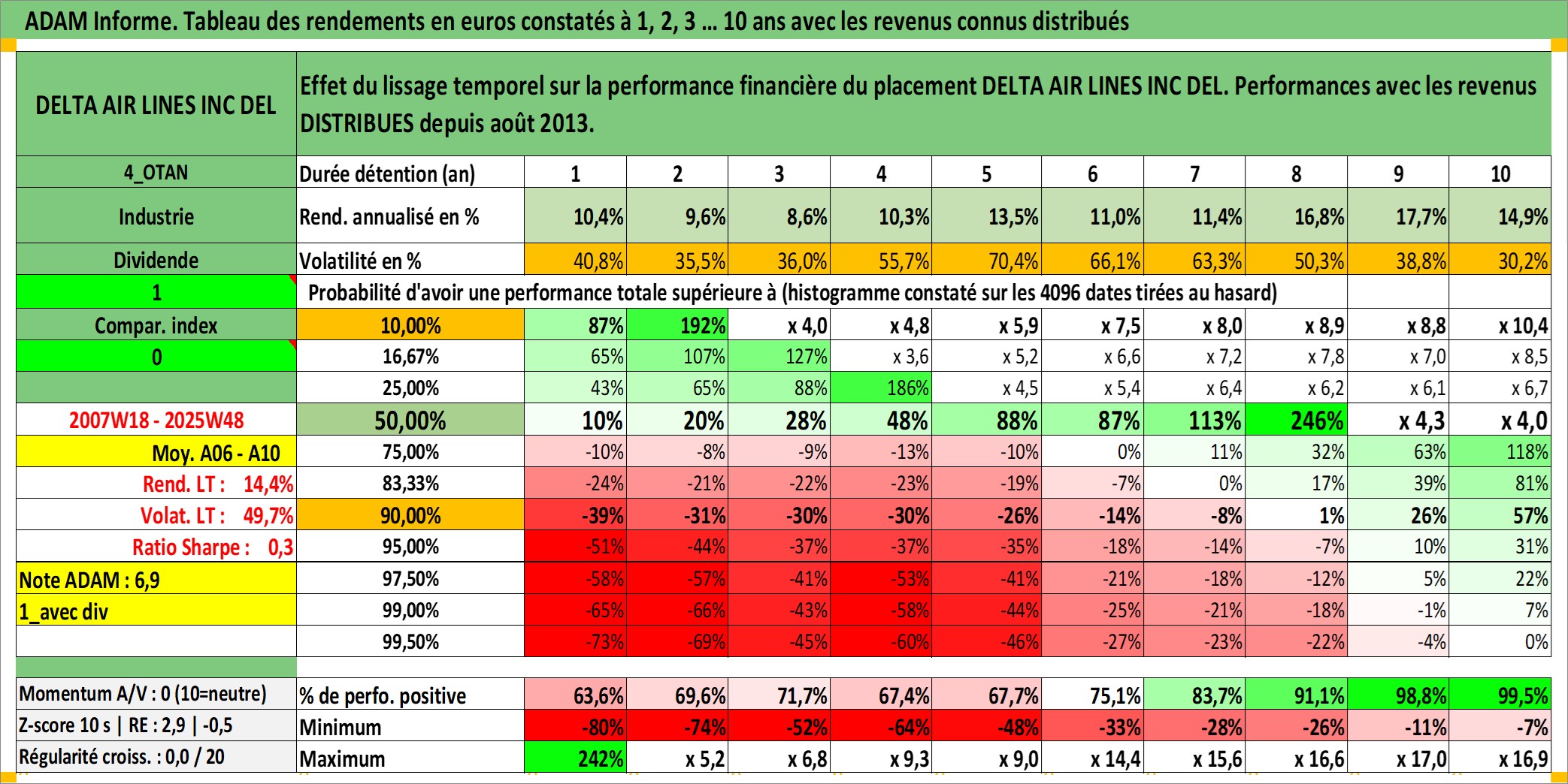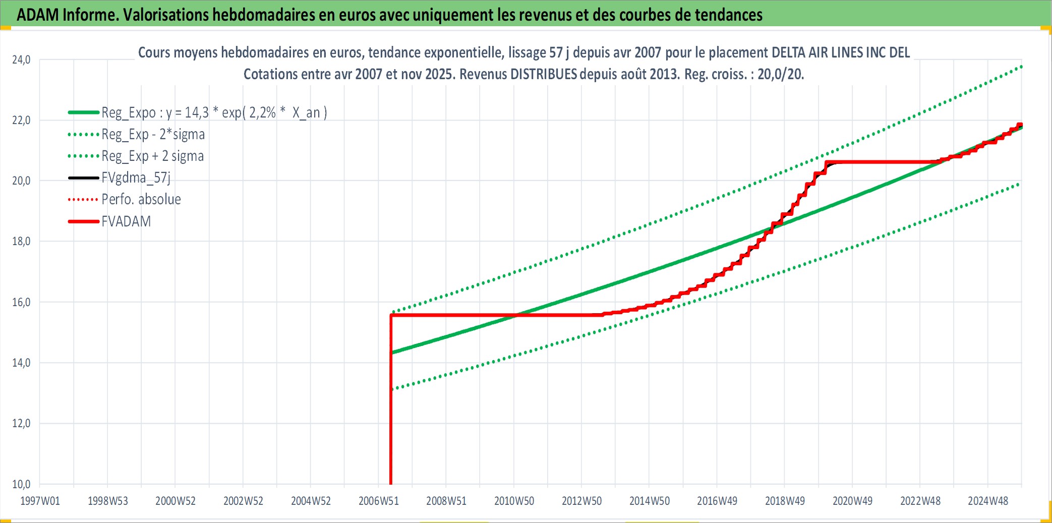 Site dédié aux investisseursPage dédiée sur site financeAnalyse des valorisations hebdomadaires de l'action DELTA AIR LINES INC DEL. Cet actif est cote en USD. Les valorisations sont en contrevaleur EURO et couvrent les semaines 2007W18 a 2025W48. Les revenus de cet actif financier sont pris en compte depuis la semaine 2013W32. La note globale ESG de cet actif est estimee a 7.0 (apres rebasage entre 0 et 20).