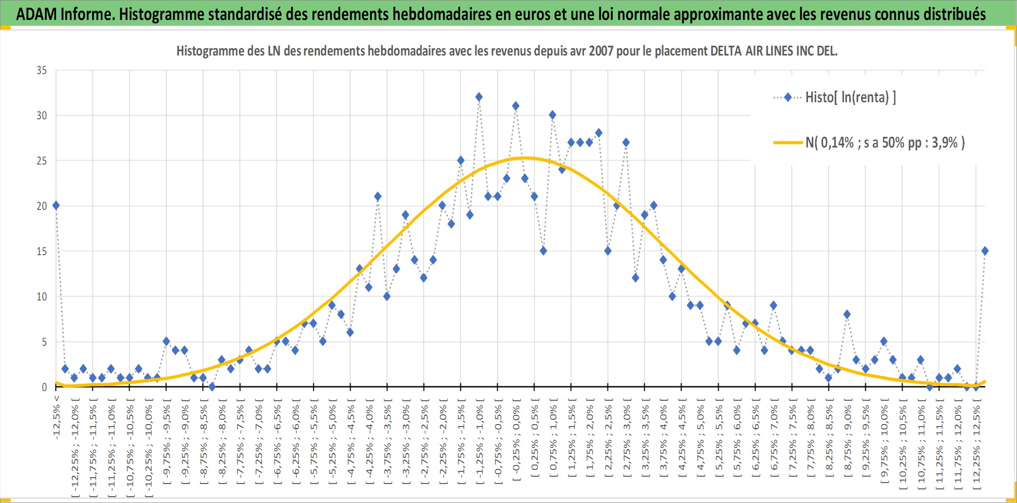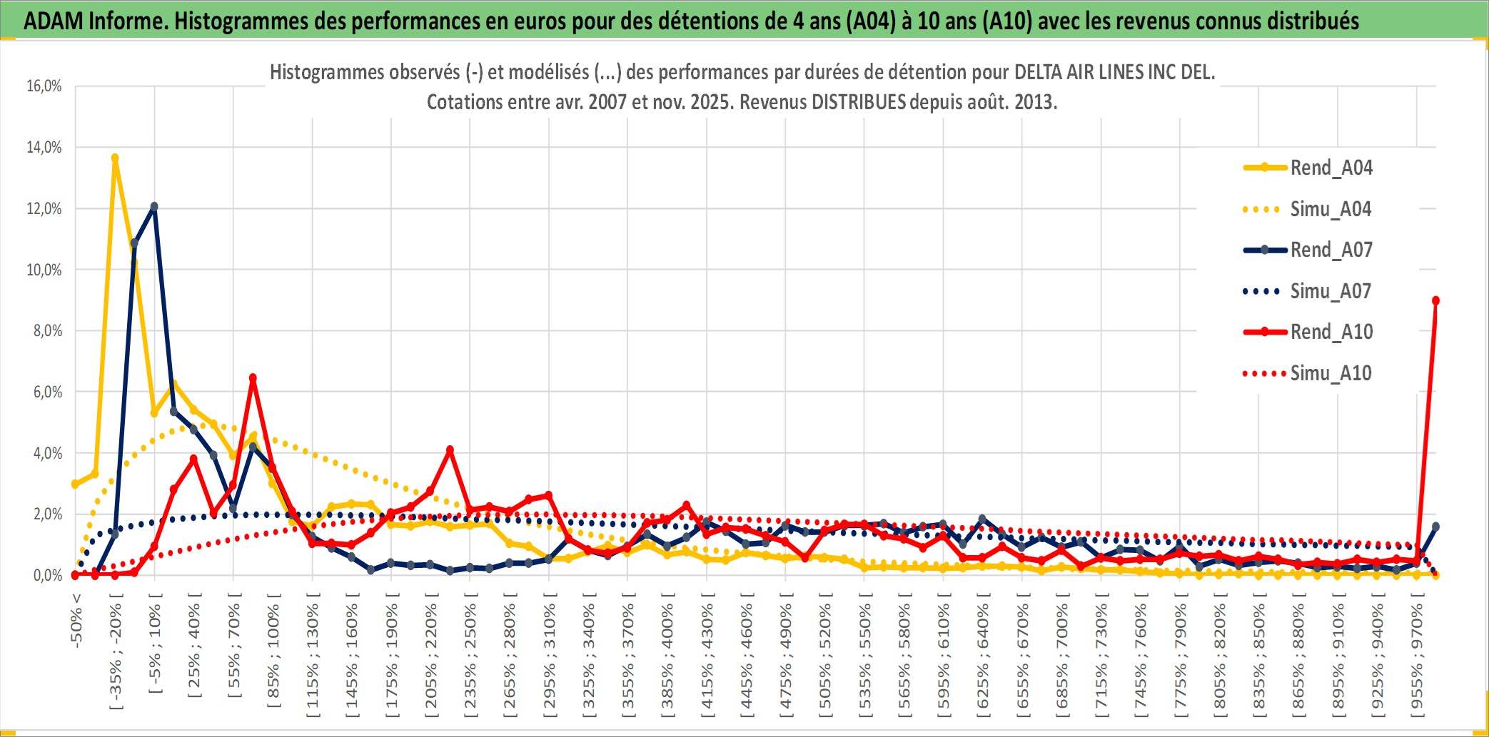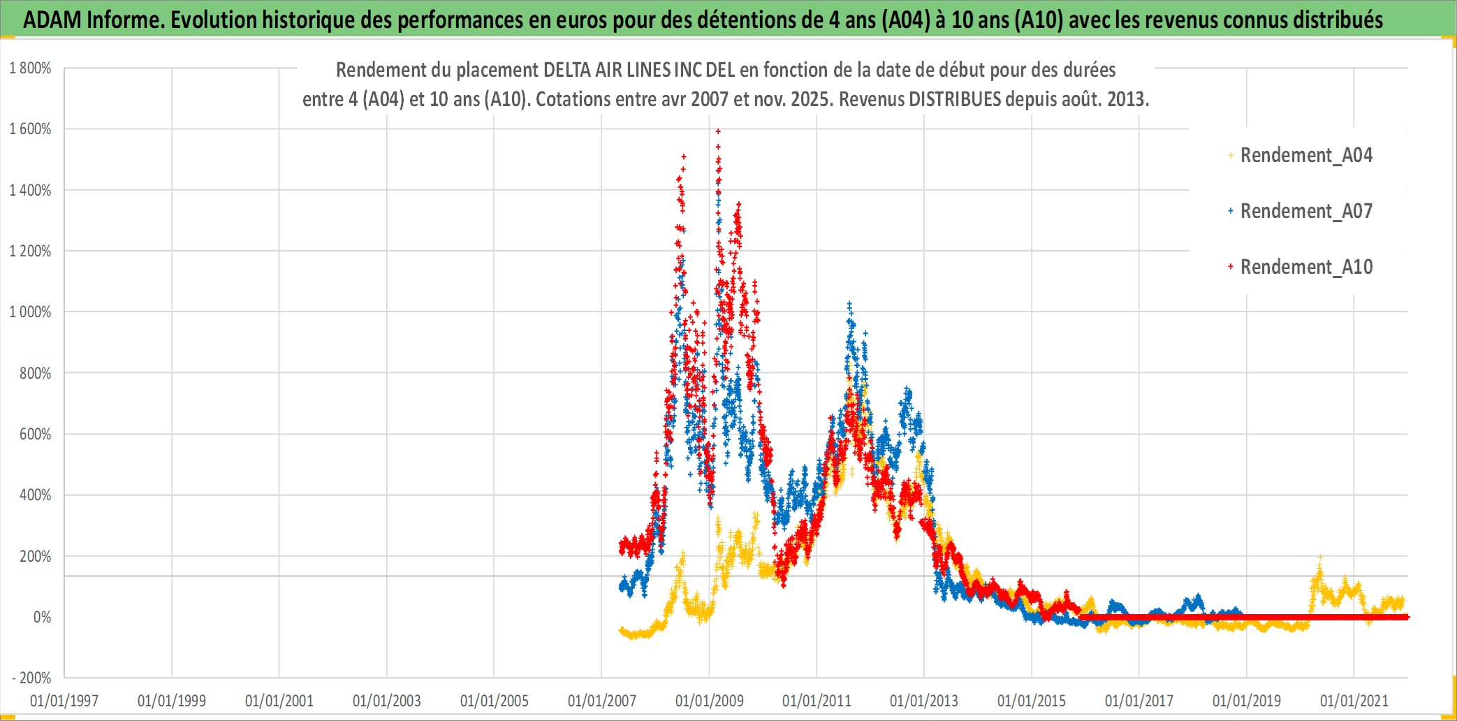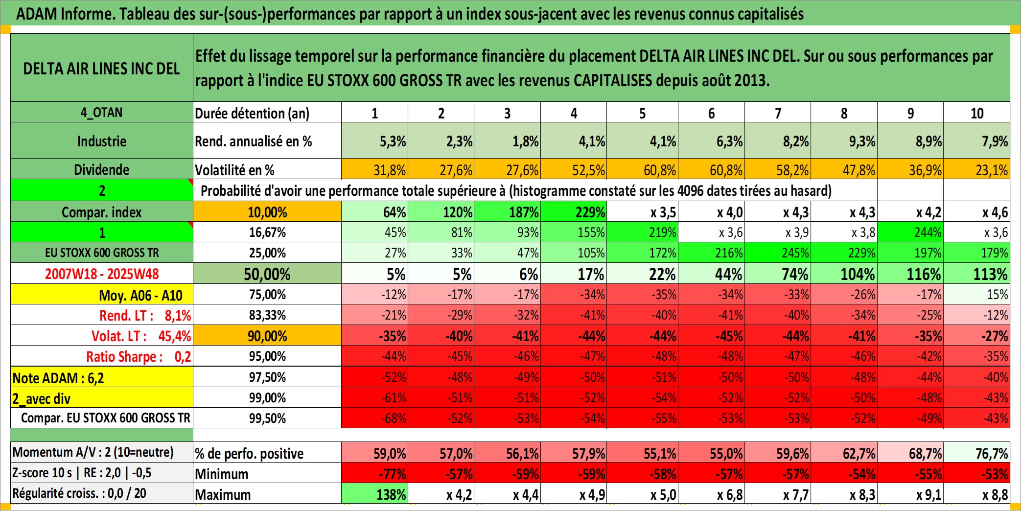Site dédié aux investisseursPage dédiée sur site financeAnalyse des valorisations hebdomadaires de l'action DELTA AIR LINES INC DEL. Cet actif est cote en USD. Les valorisations sont en contrevaleur EURO et couvrent les semaines 2007W18 a 2025W48. Les revenus de cet actif financier sont pris en compte depuis la semaine 2013W32. La note globale ESG de cet actif est estimee a 7.0 (apres rebasage entre 0 et 20).