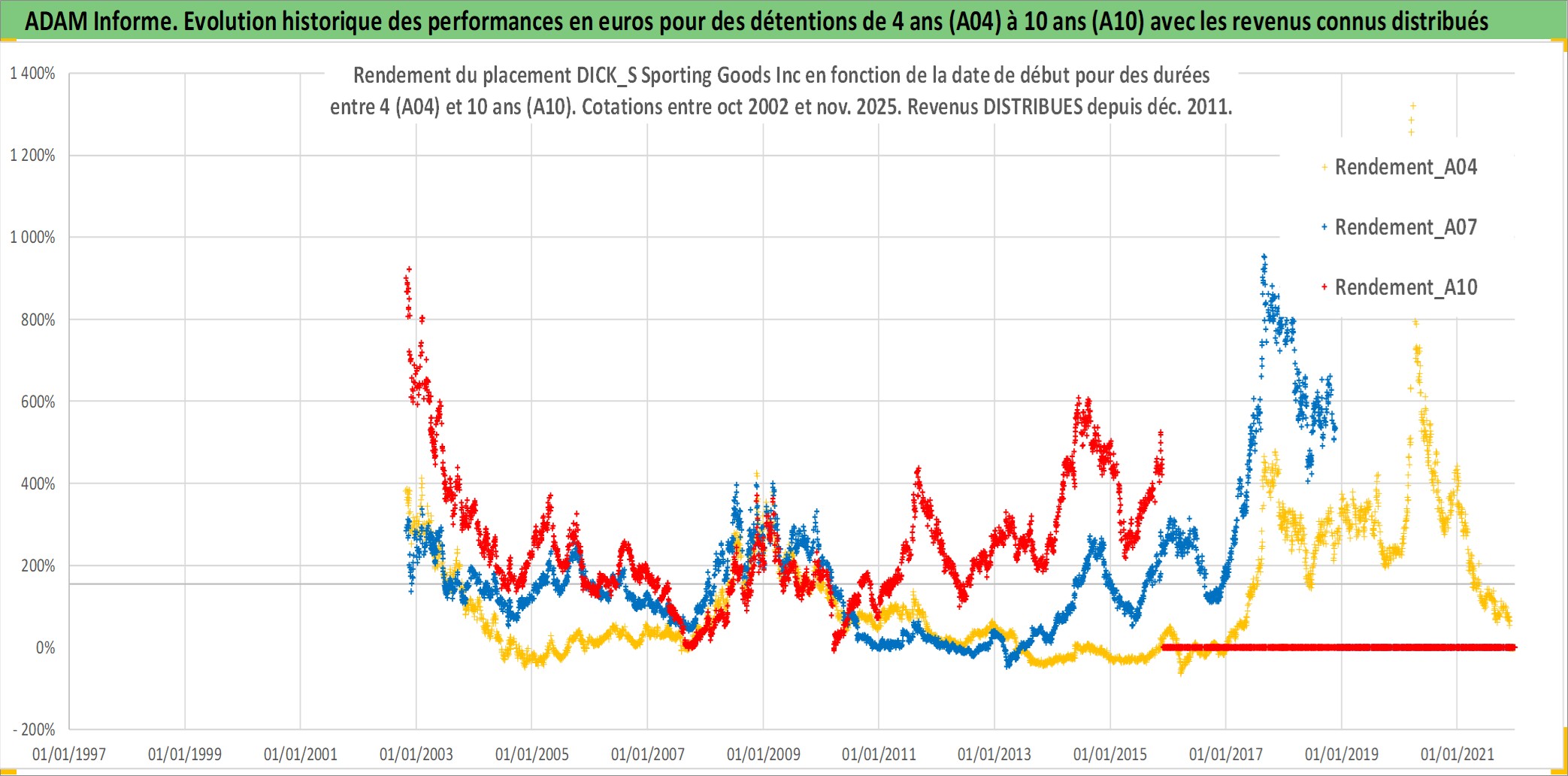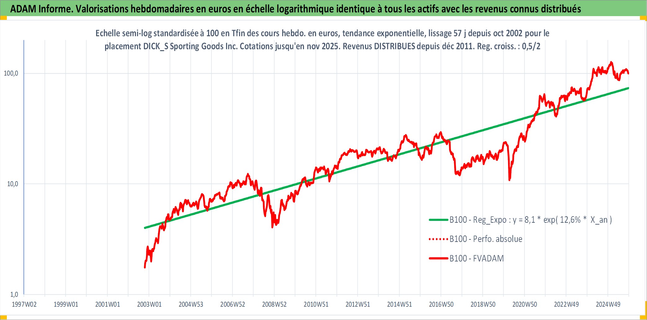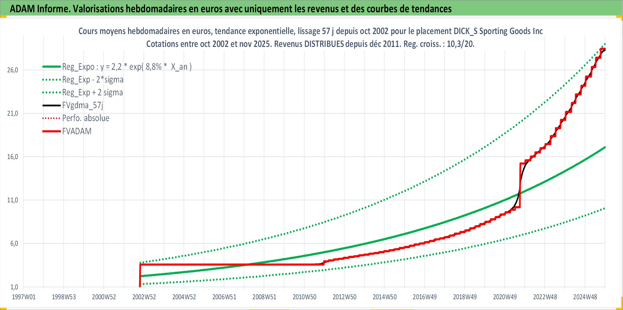 Site dédié aux investisseursPage dédiée sur site financeAnalyse des valorisations hebdomadaires de l'action DICK_S Sporting Goods Inc. Cet actif est cote en USD. Les valorisations sont en contrevaleur EURO et couvrent les semaines 2002W42 a 2025W48. Les revenus de cet actif financier sont pris en compte depuis la semaine 2011W49. La note globale ESG de cet actif est estimee a 13.0 (apres rebasage entre 0 et 20).