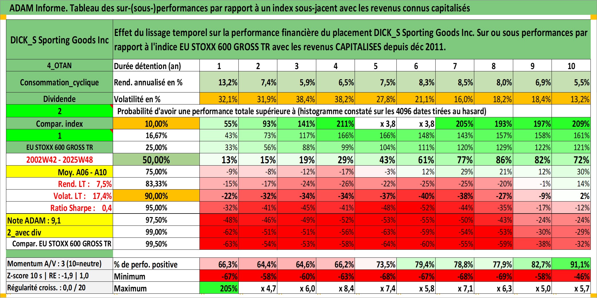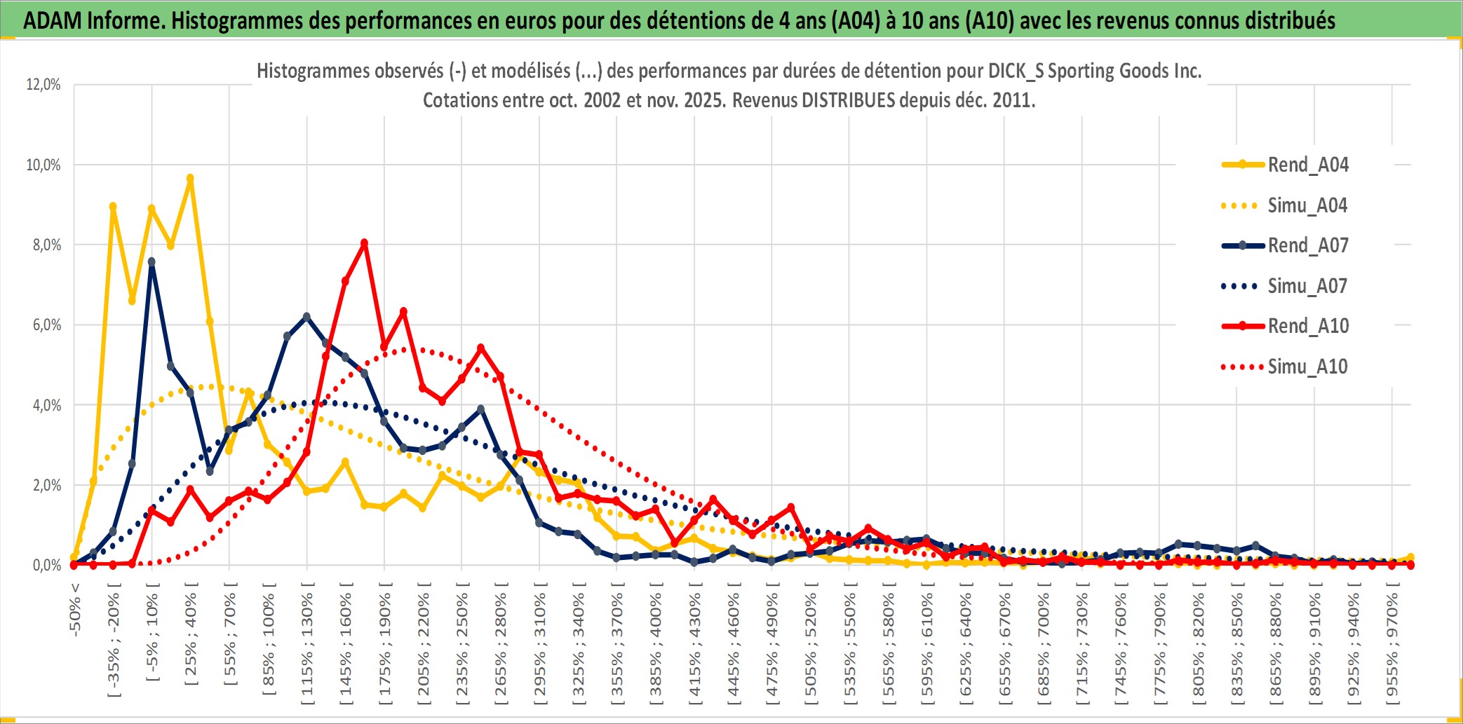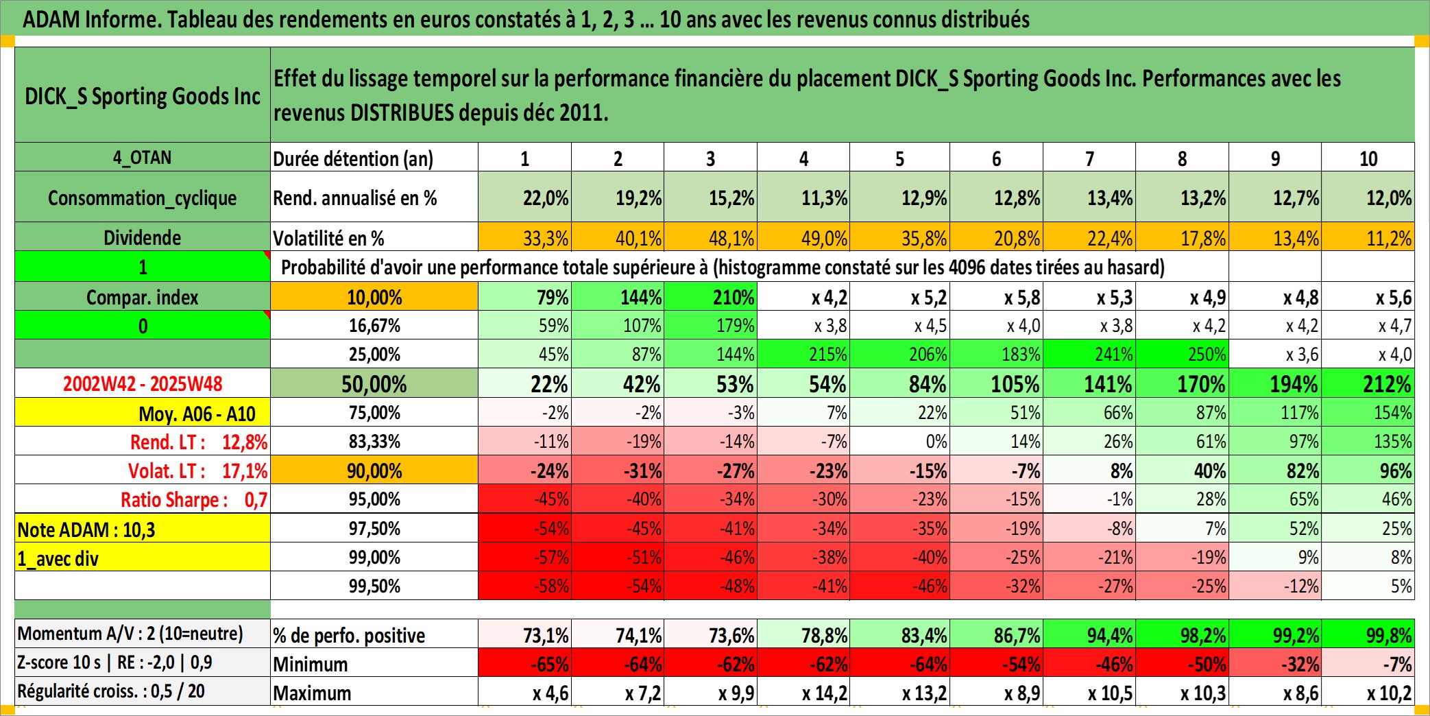 Site dédié aux investisseursPage dédiée sur site financeAnalyse des valorisations hebdomadaires de l'action DICK_S Sporting Goods Inc. Cet actif est cote en USD. Les valorisations sont en contrevaleur EURO et couvrent les semaines 2002W42 a 2025W48. Les revenus de cet actif financier sont pris en compte depuis la semaine 2011W49. La note globale ESG de cet actif est estimee a 13.0 (apres rebasage entre 0 et 20).