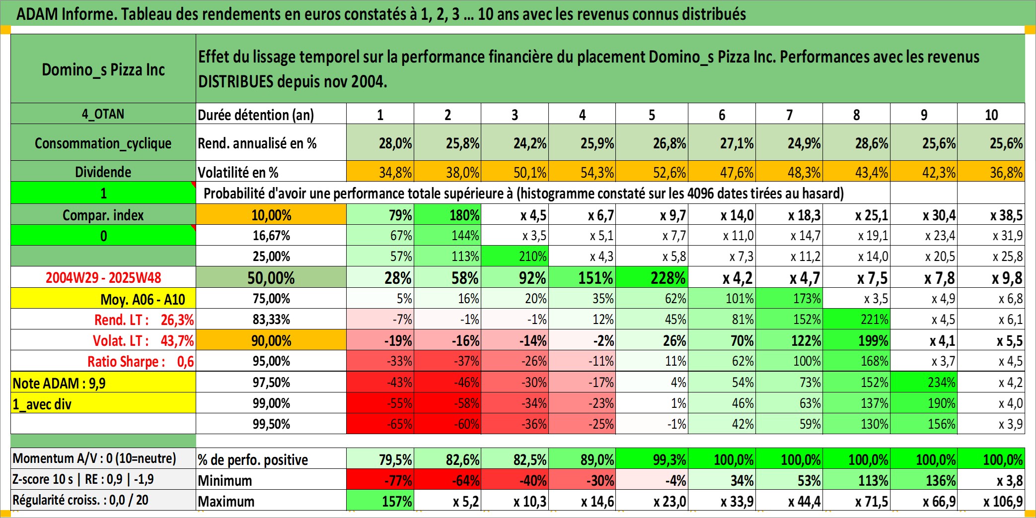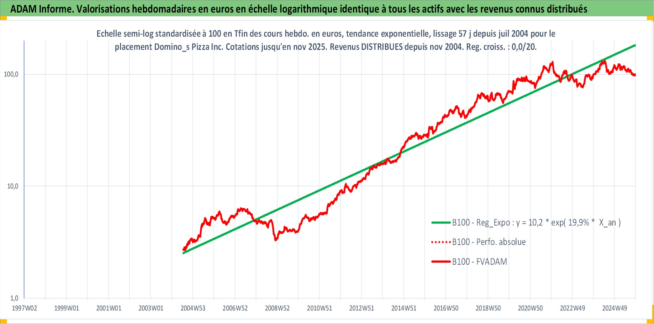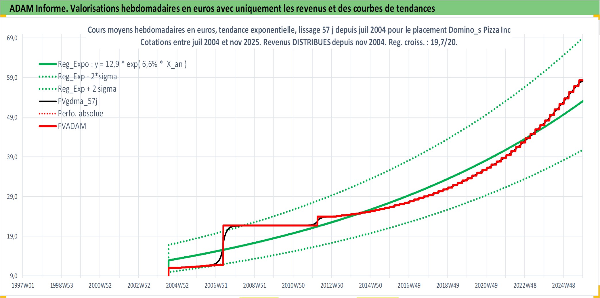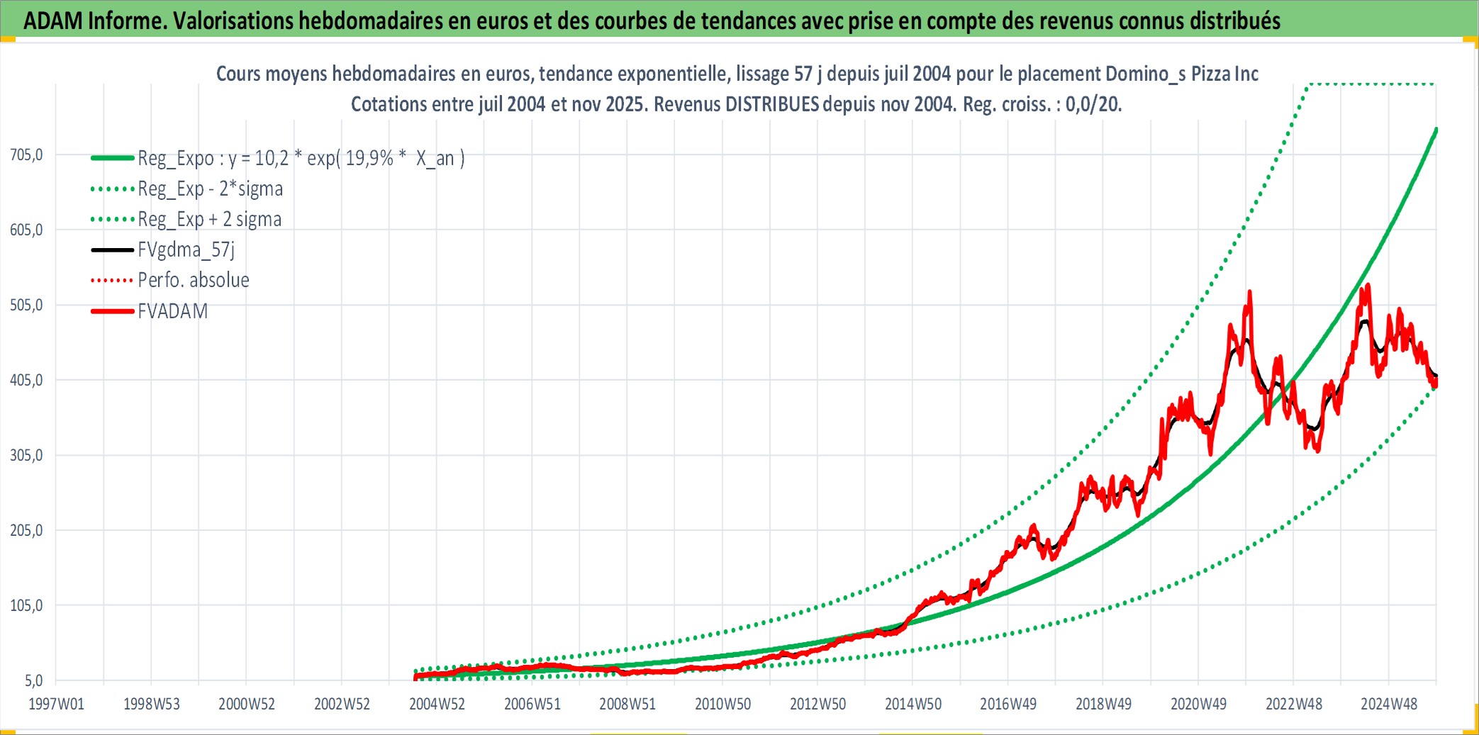 Site dédié aux investisseursPage dédiée sur site financeAnalyse des valorisations hebdomadaires de l'action Domino_s Pizza Inc. Cet actif est cote en USD. Les valorisations sont en contrevaleur EURO et couvrent les semaines 2004W29 a 2025W48. Les revenus de cet actif financier sont pris en compte depuis la semaine 2004W49. La note globale ESG de cet actif est estimee a 5.0 (apres rebasage entre 0 et 20).