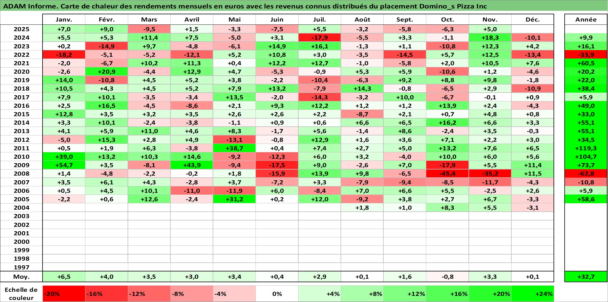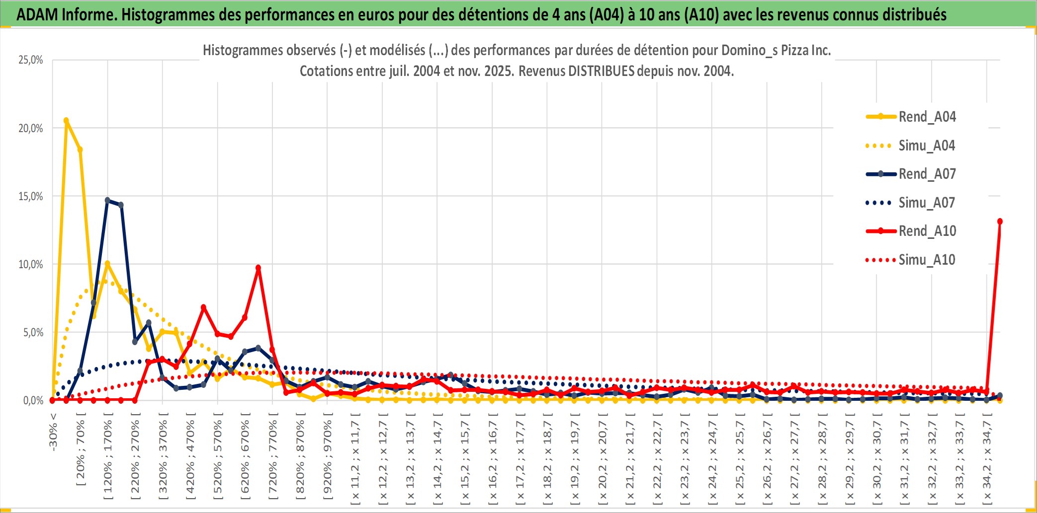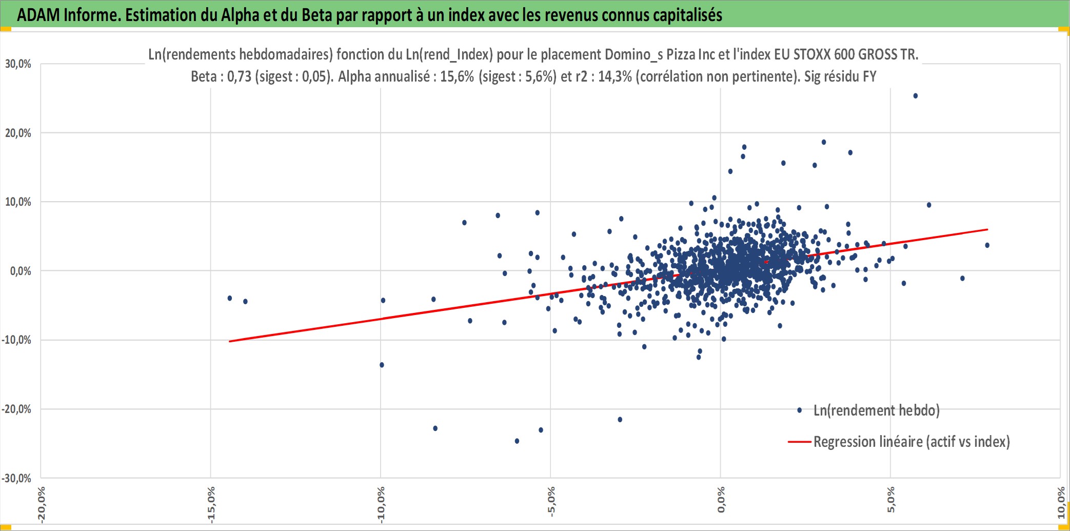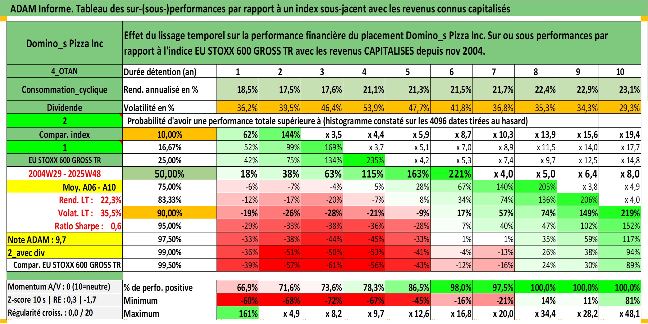 Site dédié aux investisseursPage dédiée sur site financeAnalyse des valorisations hebdomadaires de l'action Domino_s Pizza Inc. Cet actif est cote en USD. Les valorisations sont en contrevaleur EURO et couvrent les semaines 2004W29 a 2025W48. Les revenus de cet actif financier sont pris en compte depuis la semaine 2004W49. La note globale ESG de cet actif est estimee a 5.0 (apres rebasage entre 0 et 20).
