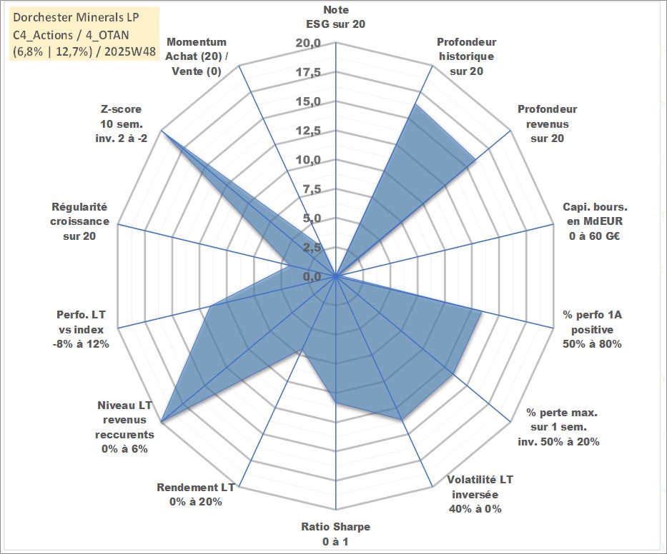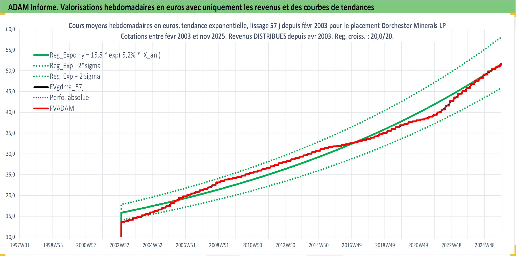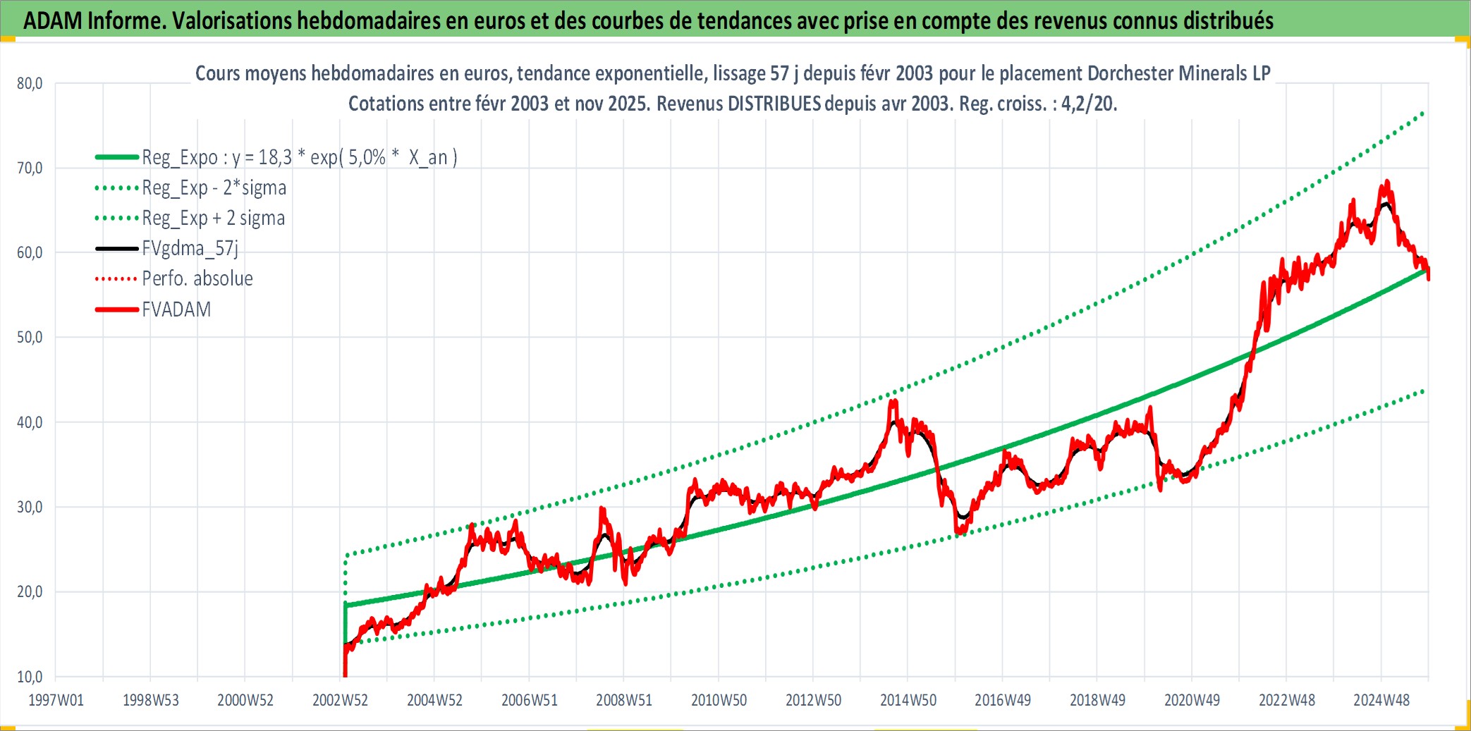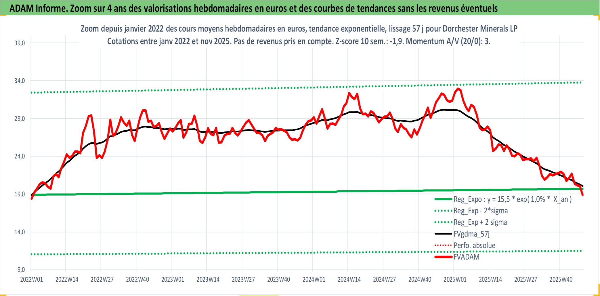 Site dédié aux investisseursPage dédiée sur site financeAnalyse des valorisations hebdomadaires de l'action Dorchester Minerals LP. Cet actif est cote en USD. Les valorisations sont en contrevaleur EURO et couvrent les semaines 2003W06 a 2025W48. Les revenus de cet actif financier sont pris en compte depuis la semaine 2003W17. La note ESG de cet actif n'est pas connue.