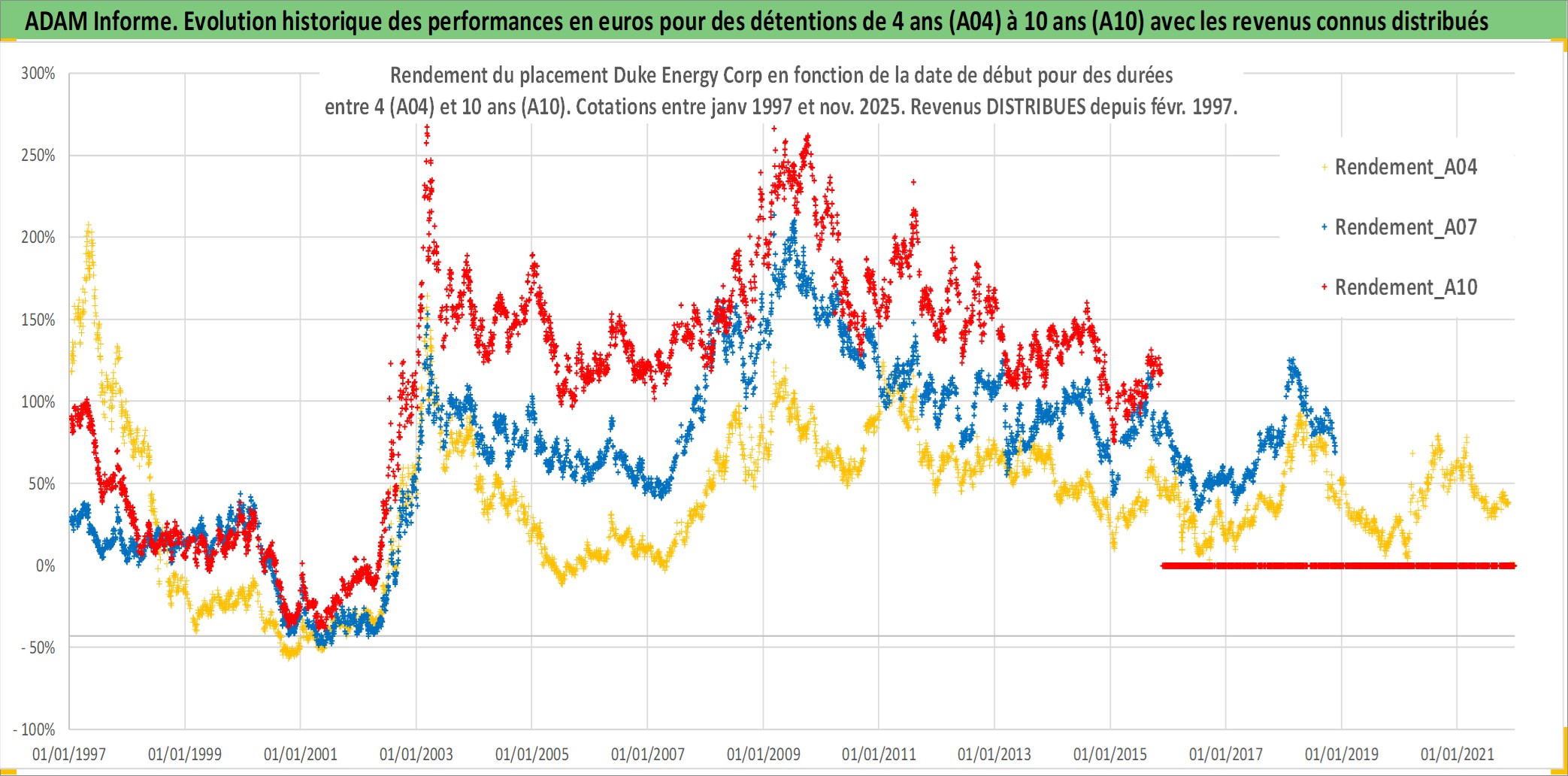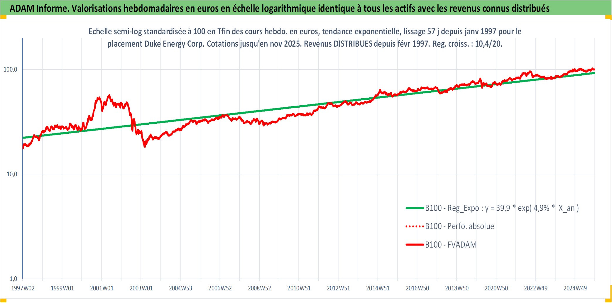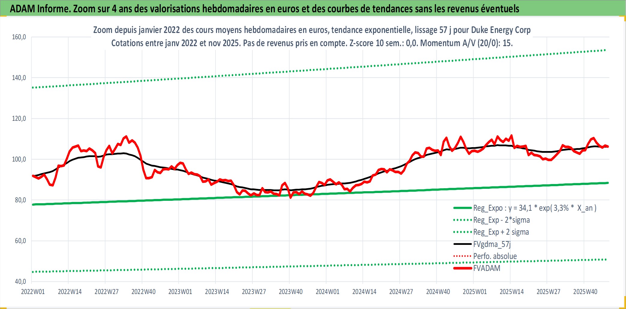 Site dédié aux investisseursPage dédiée sur site financeAnalyse des valorisations hebdomadaires de l'action Duke Energy Corp. Cet actif est cote en USD. Les valorisations sont en contrevaleur EURO et couvrent les semaines 1997W01 a 2025W48. Les revenus de cet actif financier sont pris en compte depuis la semaine 1997W07. La note globale ESG de cet actif est estimee a 6.0 (apres rebasage entre 0 et 20).