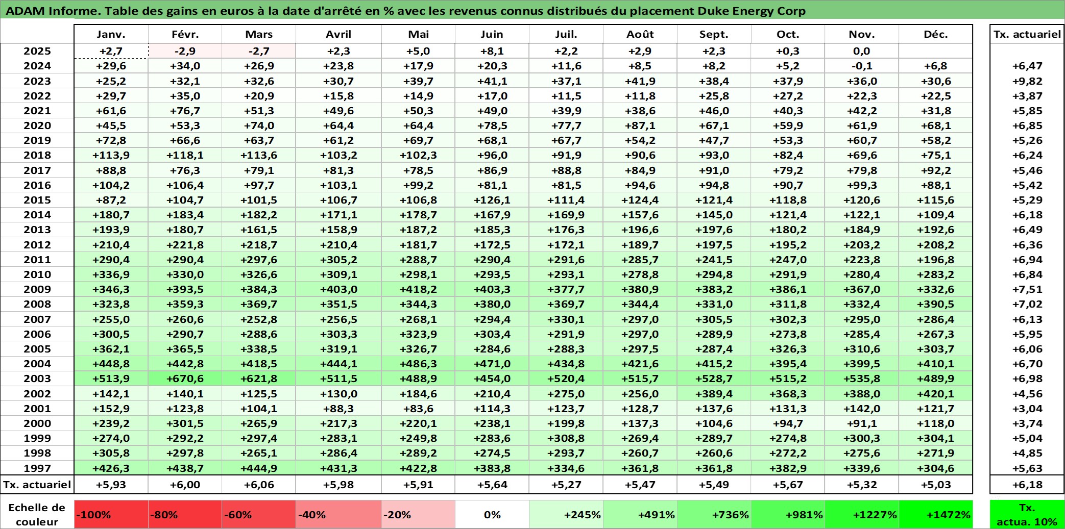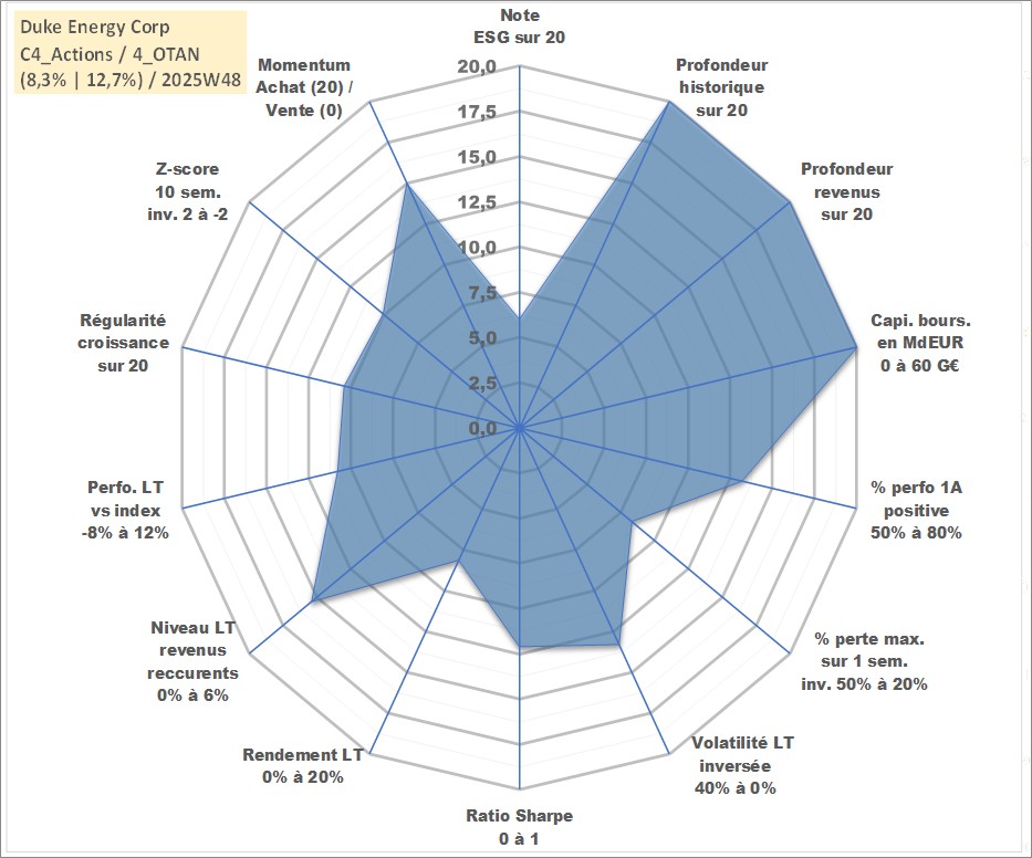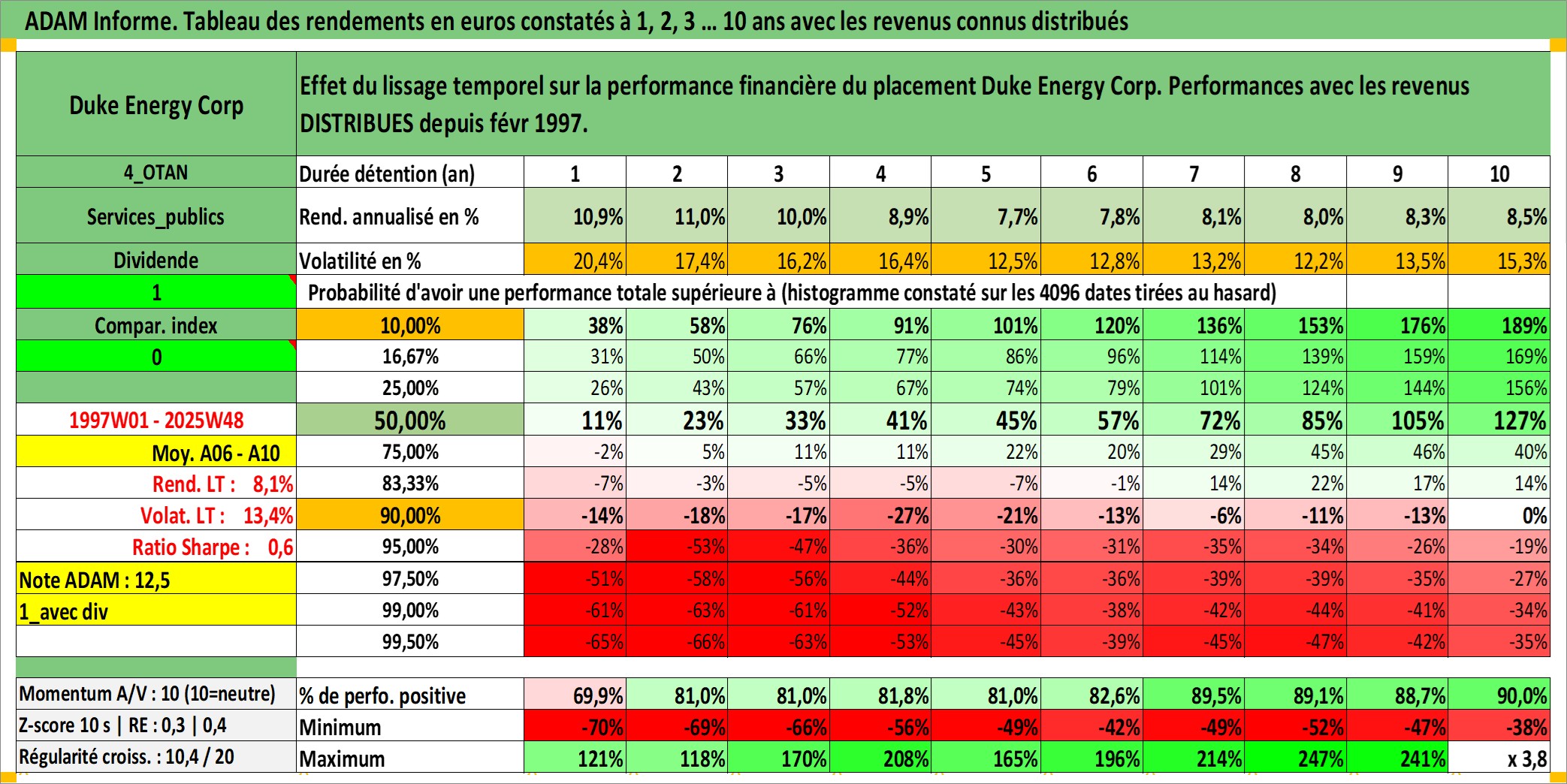 Site dédié aux investisseursPage dédiée sur site financeAnalyse des valorisations hebdomadaires de l'action Duke Energy Corp. Cet actif est cote en USD. Les valorisations sont en contrevaleur EURO et couvrent les semaines 1997W01 a 2025W48. Les revenus de cet actif financier sont pris en compte depuis la semaine 1997W07. La note globale ESG de cet actif est estimee a 6.0 (apres rebasage entre 0 et 20).