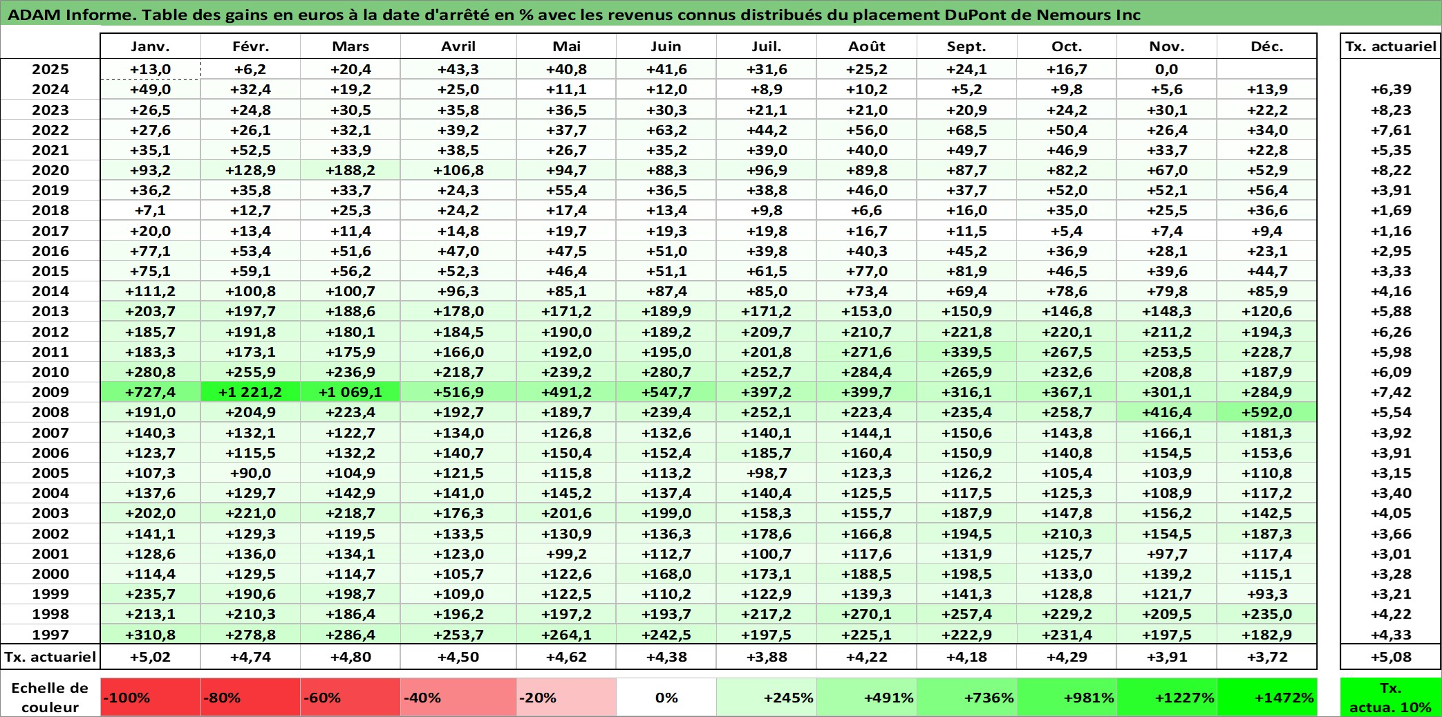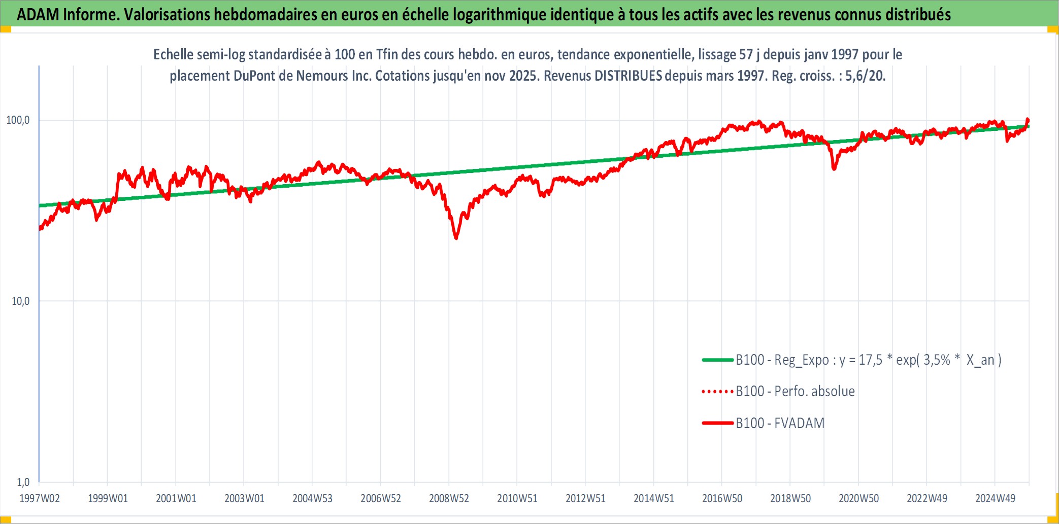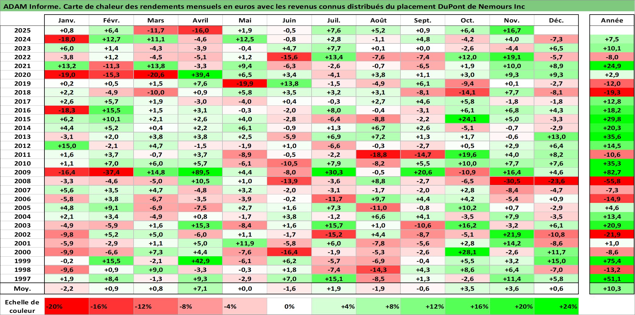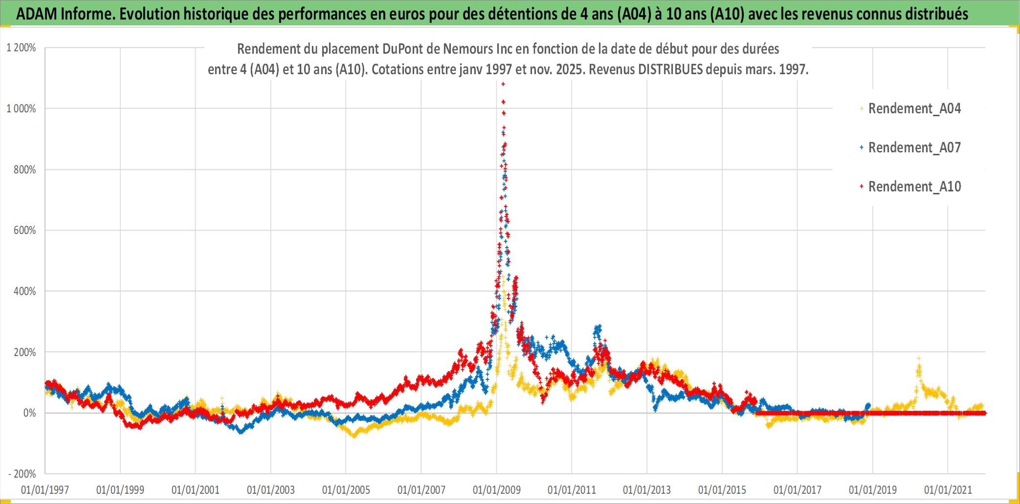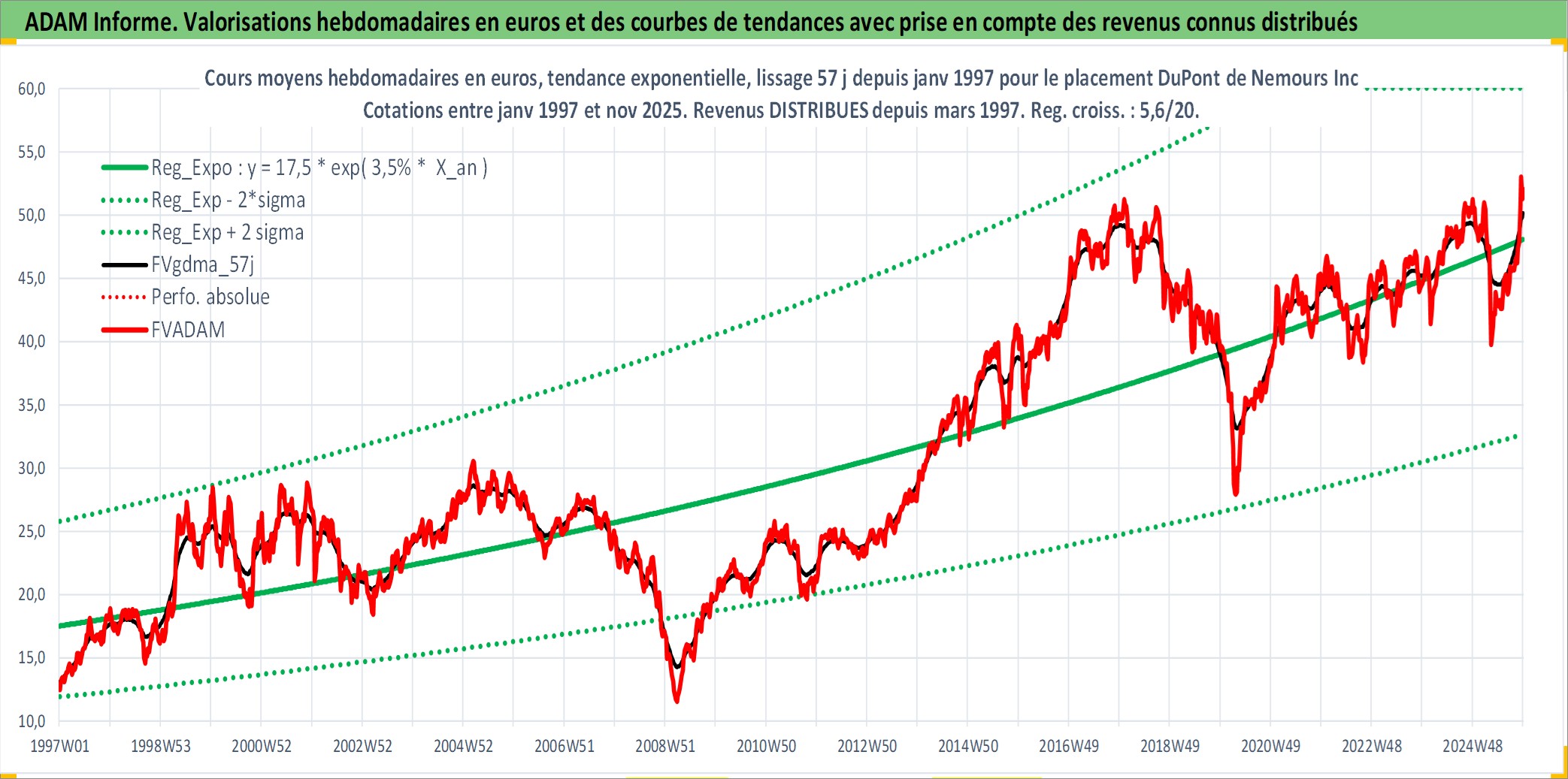 Site dédié aux investisseursPage dédiée sur site financeAnalyse des valorisations hebdomadaires de l'action DuPont de Nemours Inc. Cet actif est cote en USD. Les valorisations sont en contrevaleur EURO et couvrent les semaines 1997W01 a 2025W48. Les revenus de cet actif financier sont pris en compte depuis la semaine 1997W13. La note globale ESG de cet actif est estimee a 6.0 (apres rebasage entre 0 et 20).
