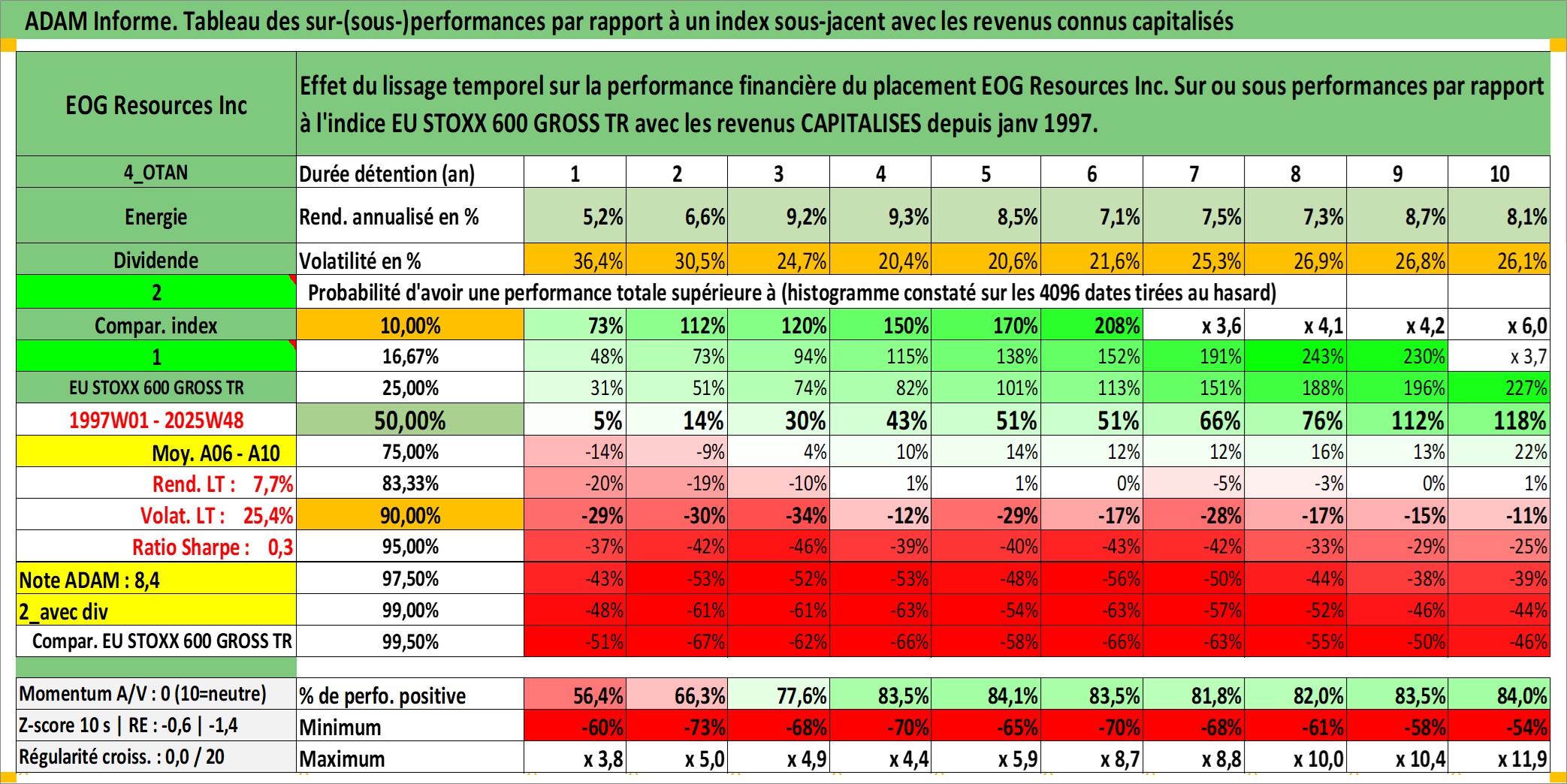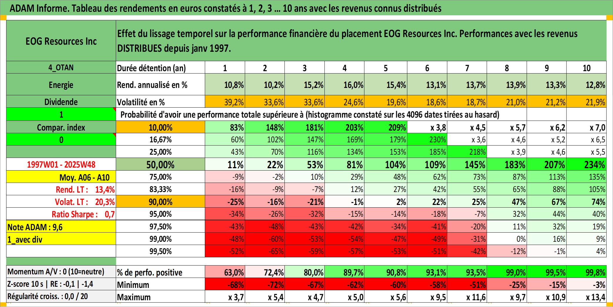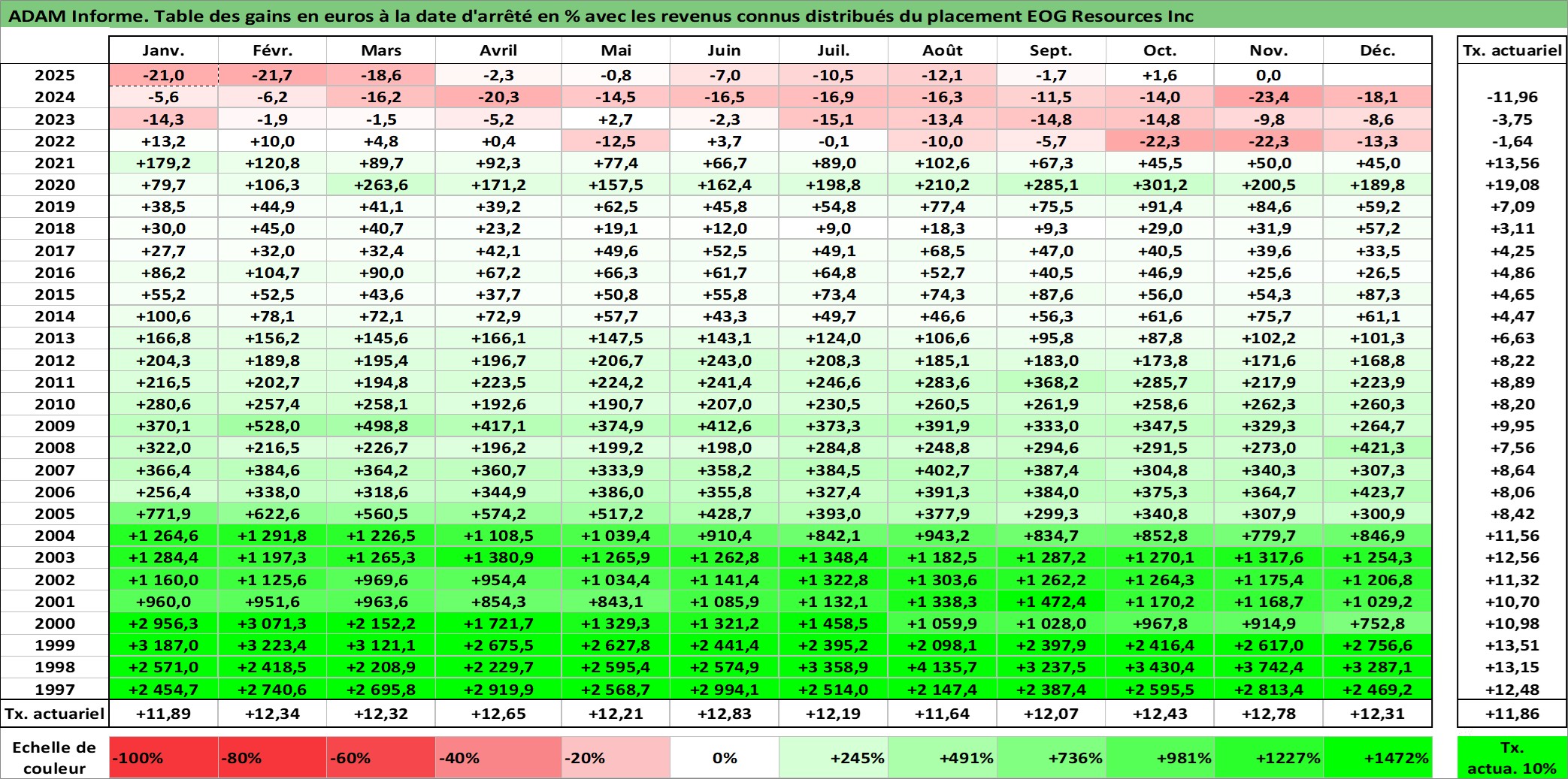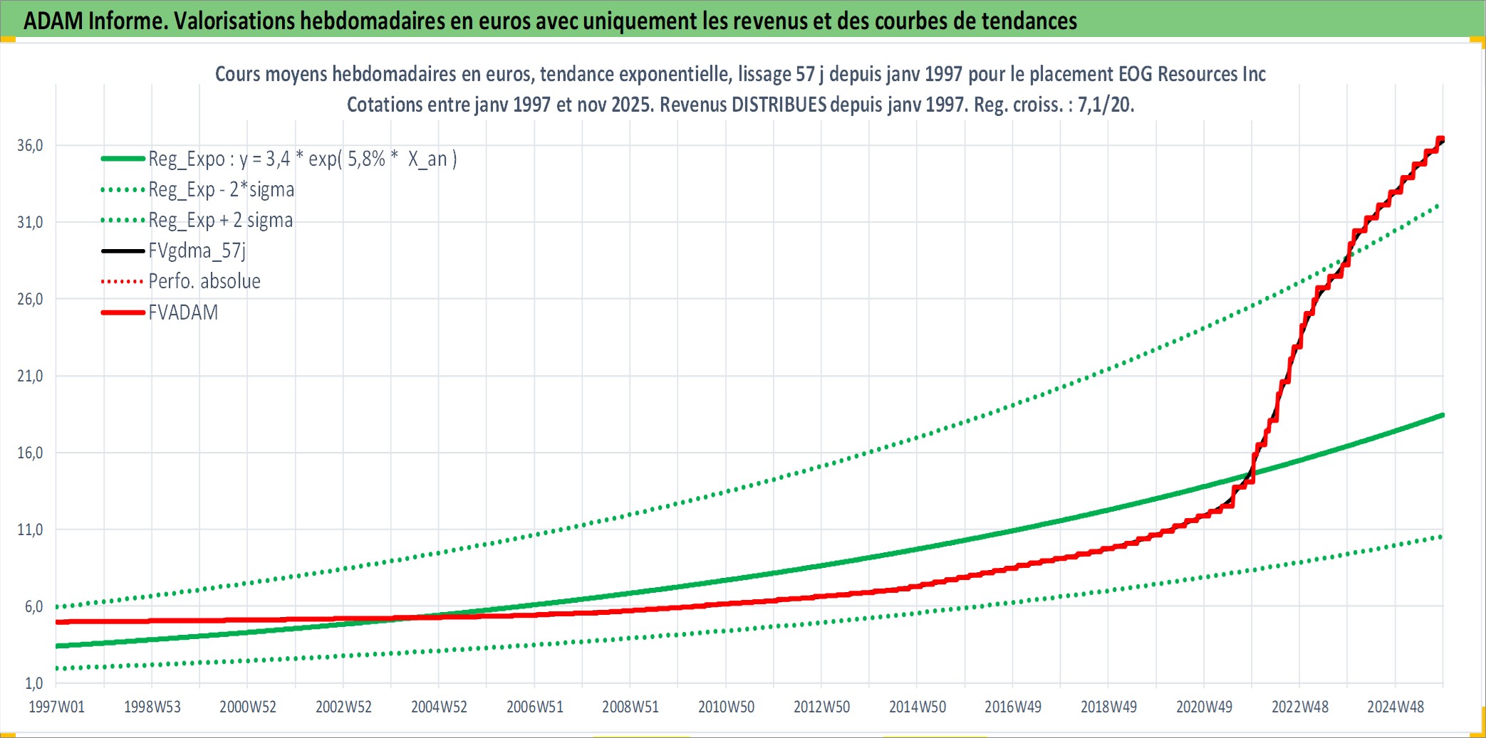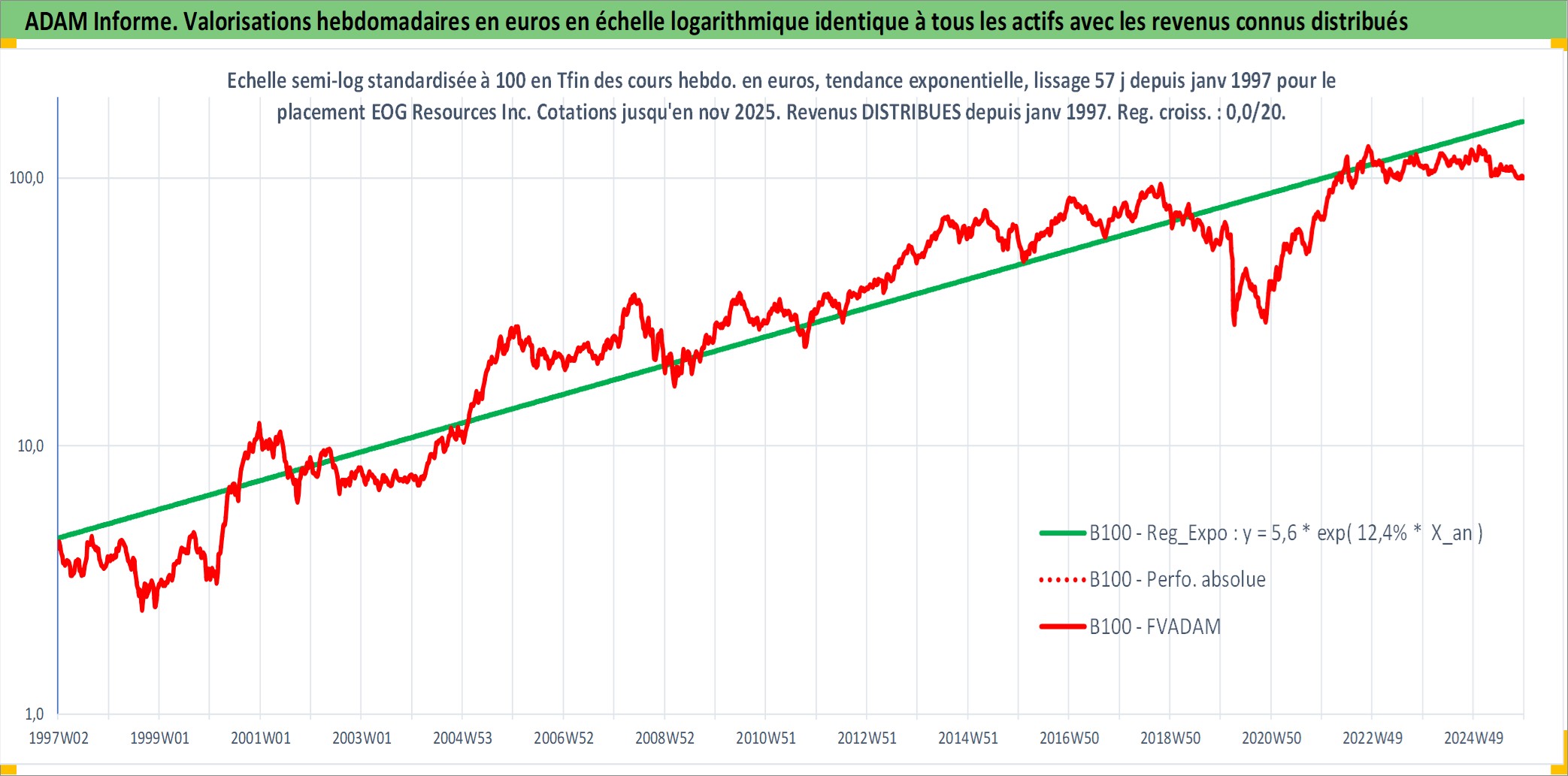 Site dédié aux investisseursPage dédiée sur site financeAnalyse des valorisations hebdomadaires de l'action EOG Resources Inc. Cet actif est cote en USD. Les valorisations sont en contrevaleur EURO et couvrent les semaines 1997W01 a 2025W48. Les revenus de cet actif financier sont pris en compte depuis la semaine 1997W03. La note globale ESG de cet actif est estimee a 3.0 (apres rebasage entre 0 et 20).