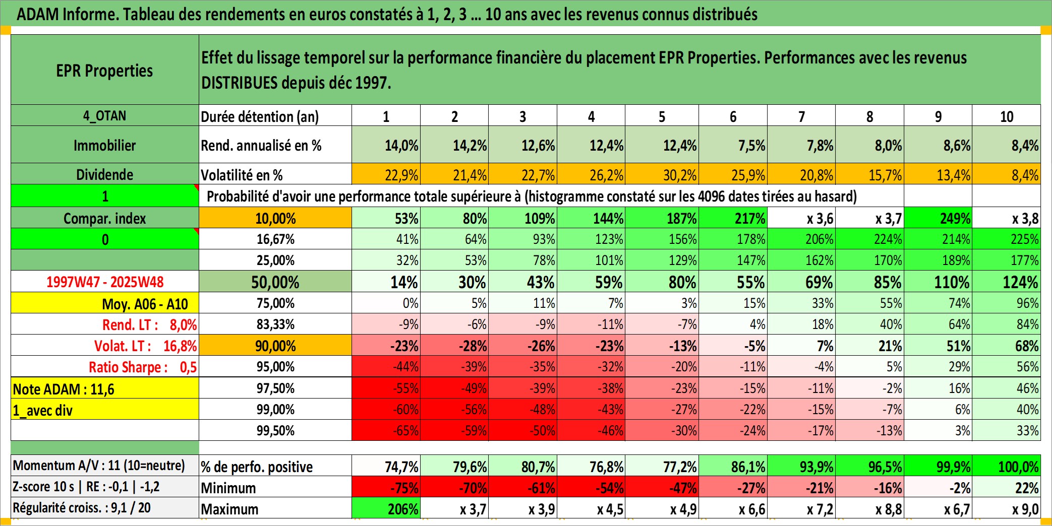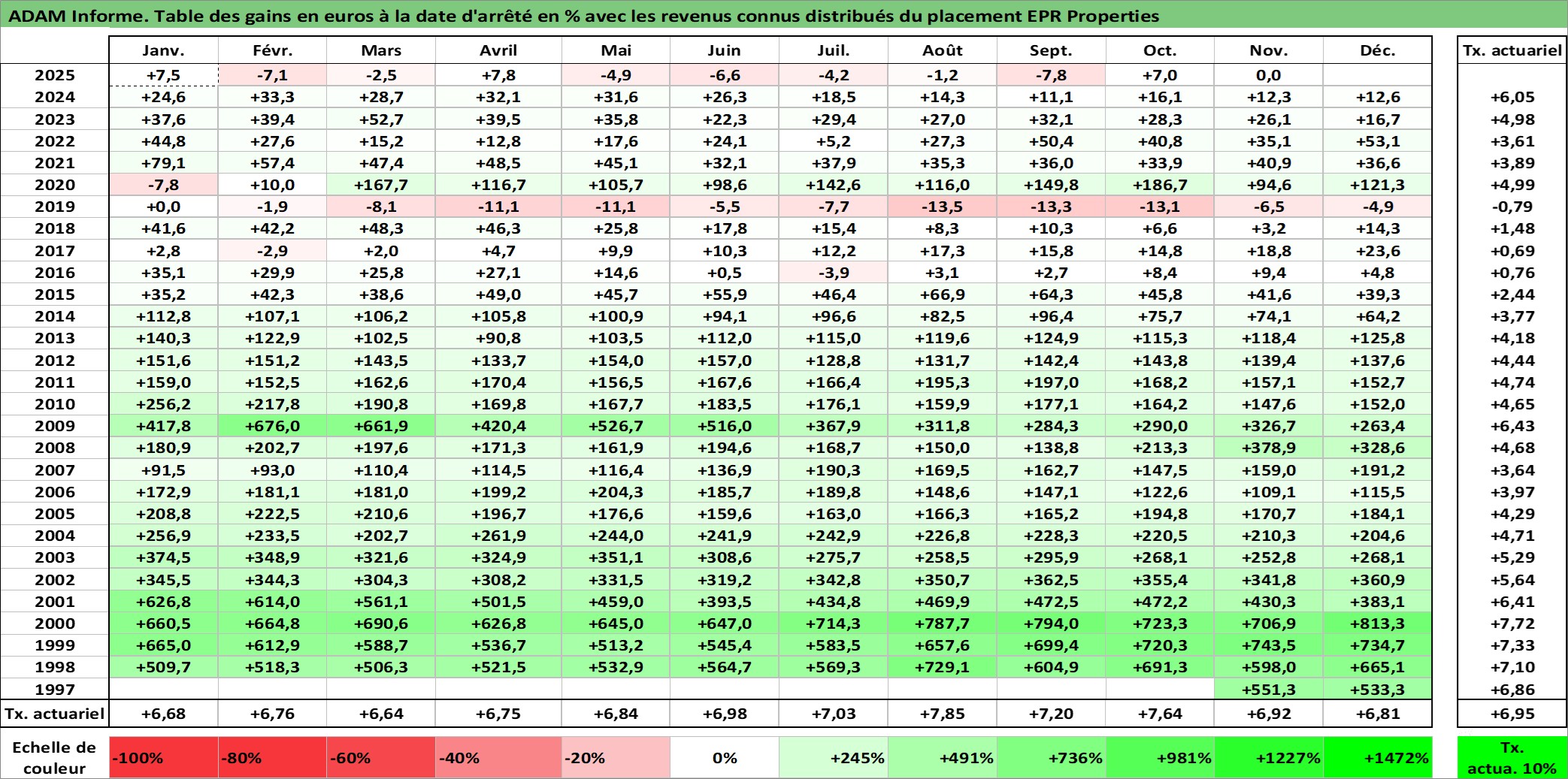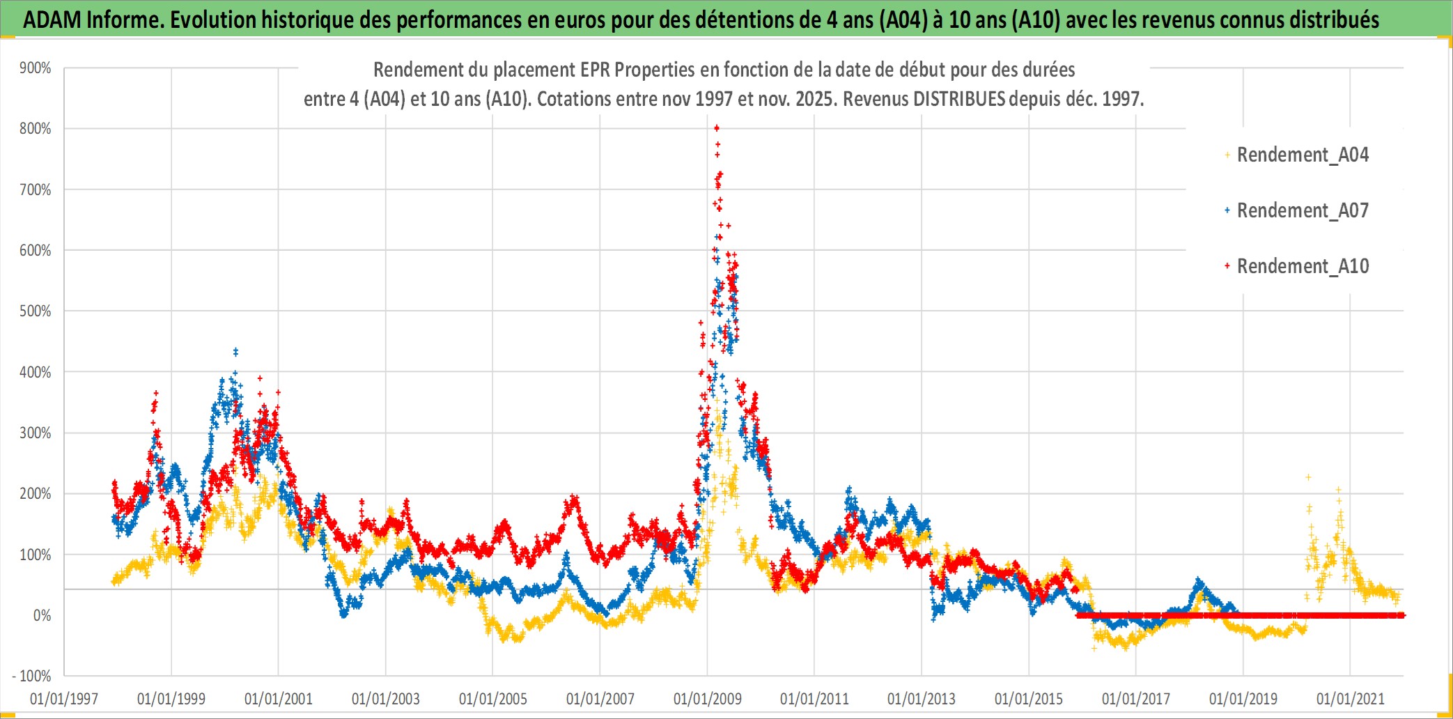 Site dédié aux investisseursPage dédiée sur site financeAnalyse des valorisations hebdomadaires de l'action EPR Properties. Cet actif est cote en USD. Les valorisations sont en contrevaleur EURO et couvrent les semaines 1997W47 a 2025W48. Les revenus de cet actif financier sont pris en compte depuis la semaine 1997W52. La note ESG de cet actif n'est pas connue.