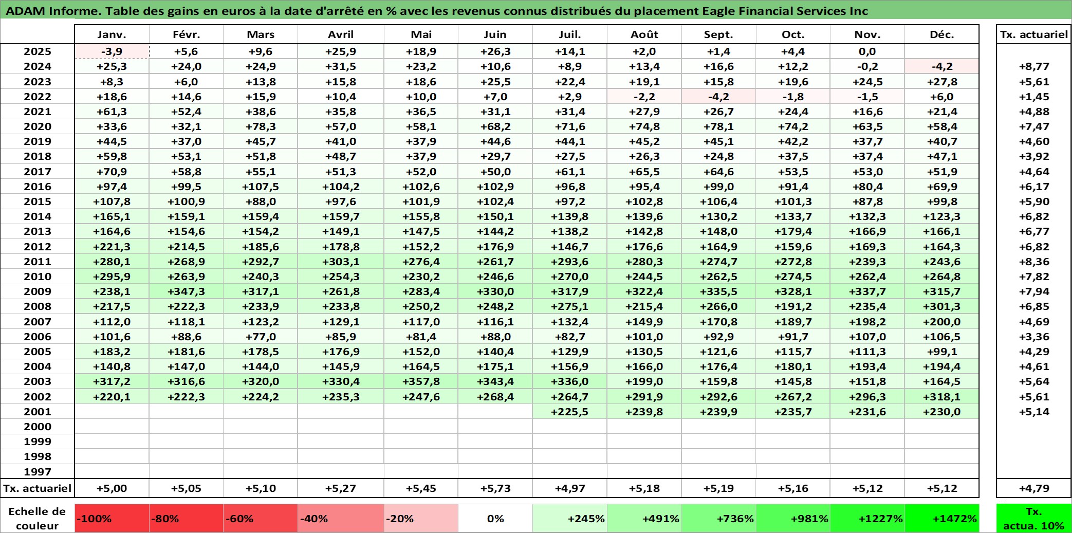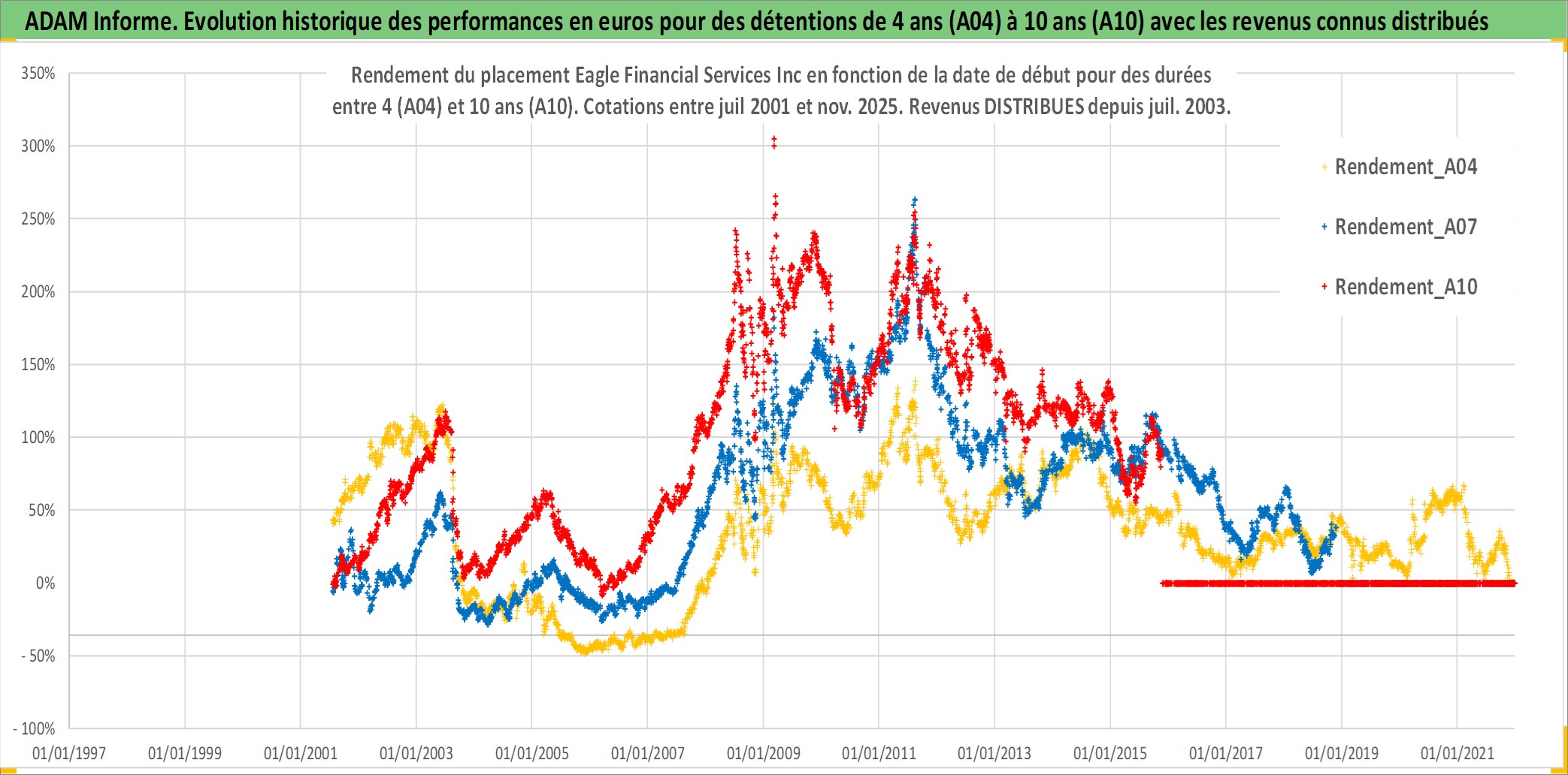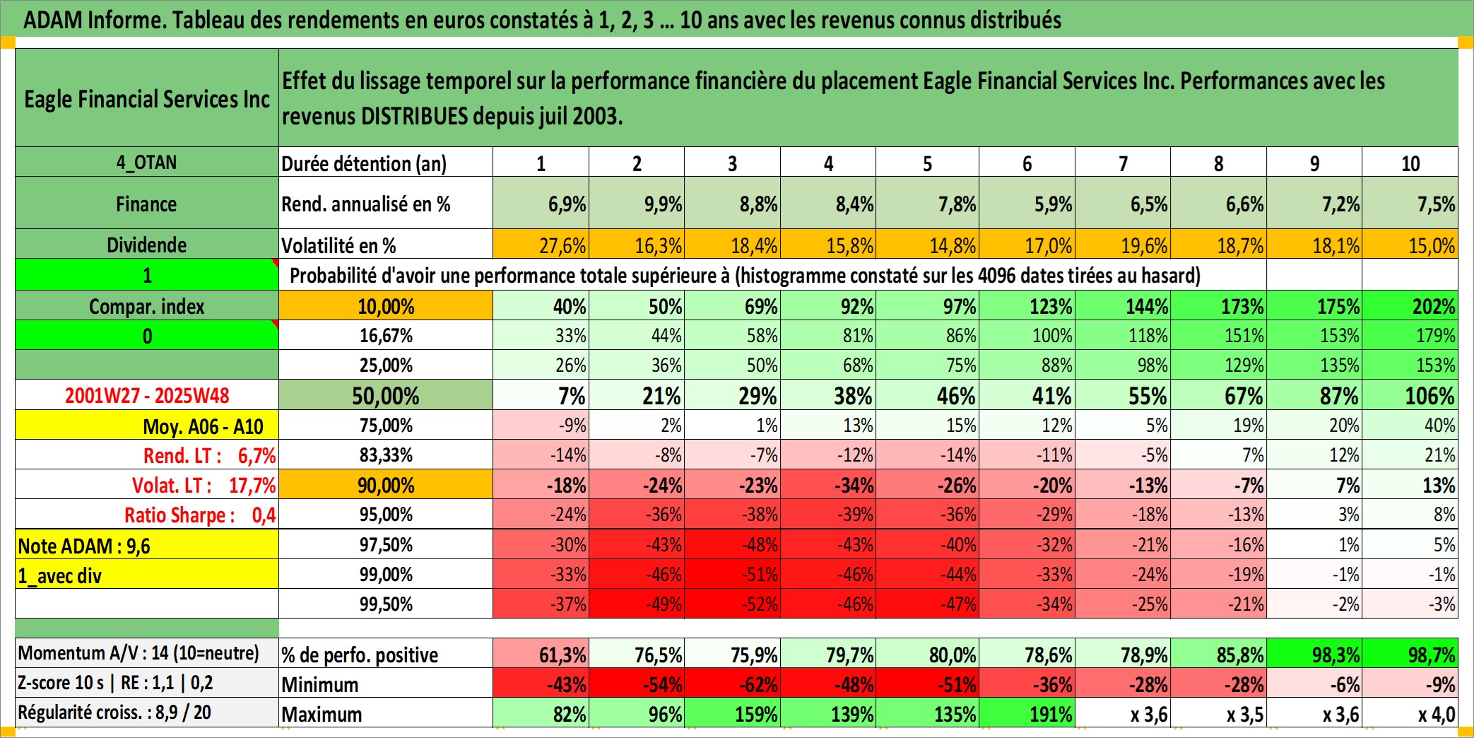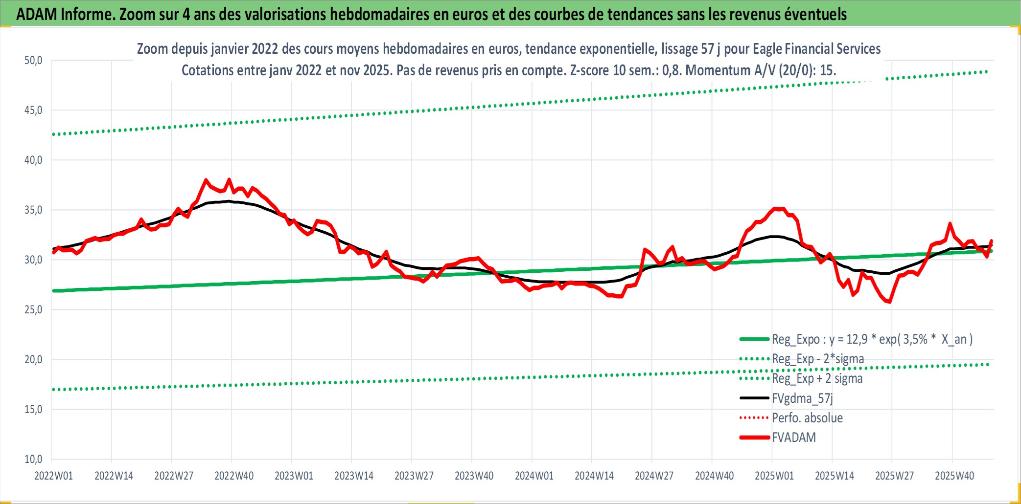 Site dédié aux investisseursPage dédiée sur site financeAnalyse des valorisations hebdomadaires de l'action Eagle Financial Services Inc. Cet actif est cote en USD. Les valorisations sont en contrevaleur EURO et couvrent les semaines 2001W27 a 2025W48. Les revenus de cet actif financier sont pris en compte depuis la semaine 2003W31. La note ESG de cet actif n'est pas connue.