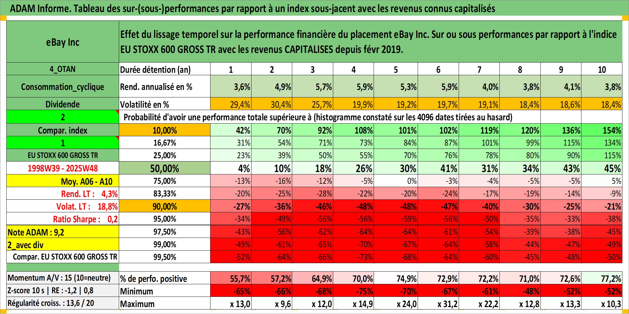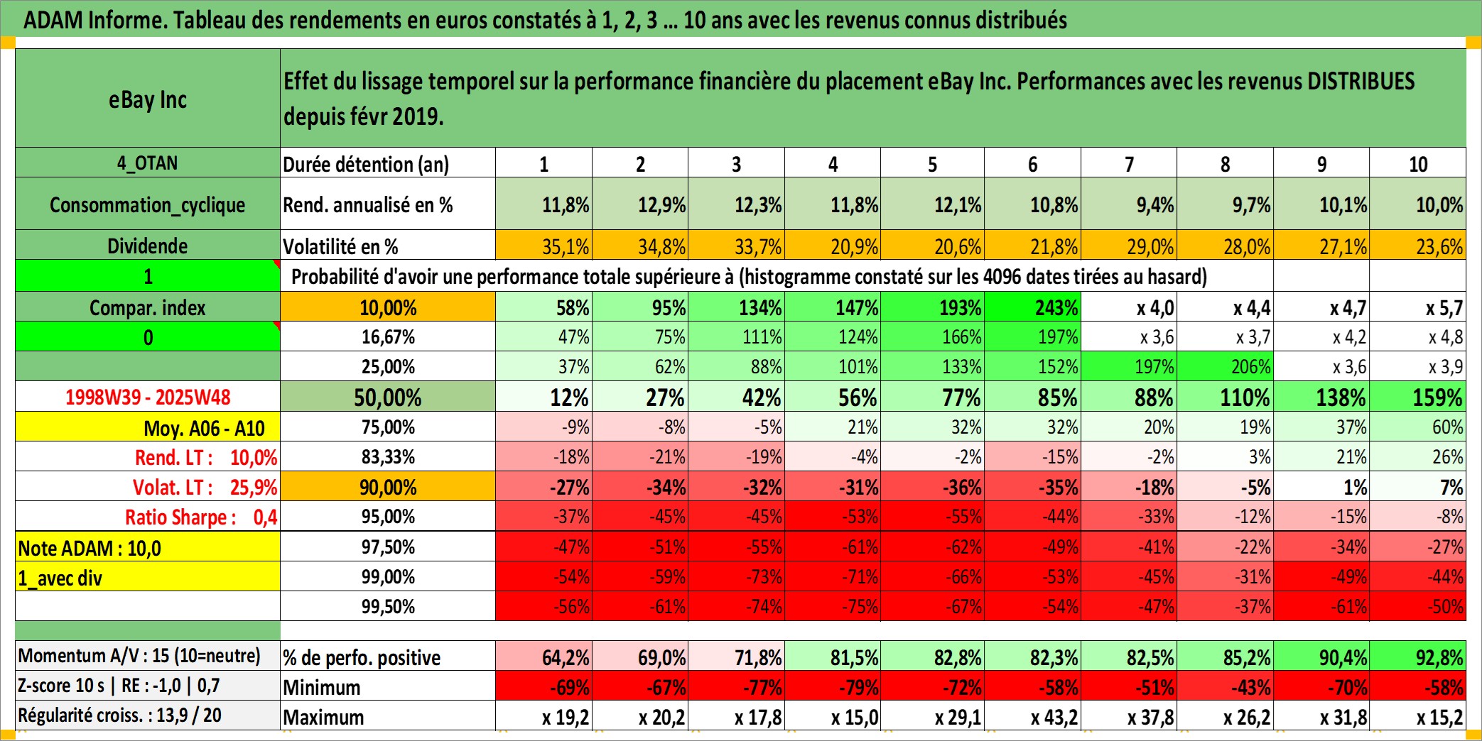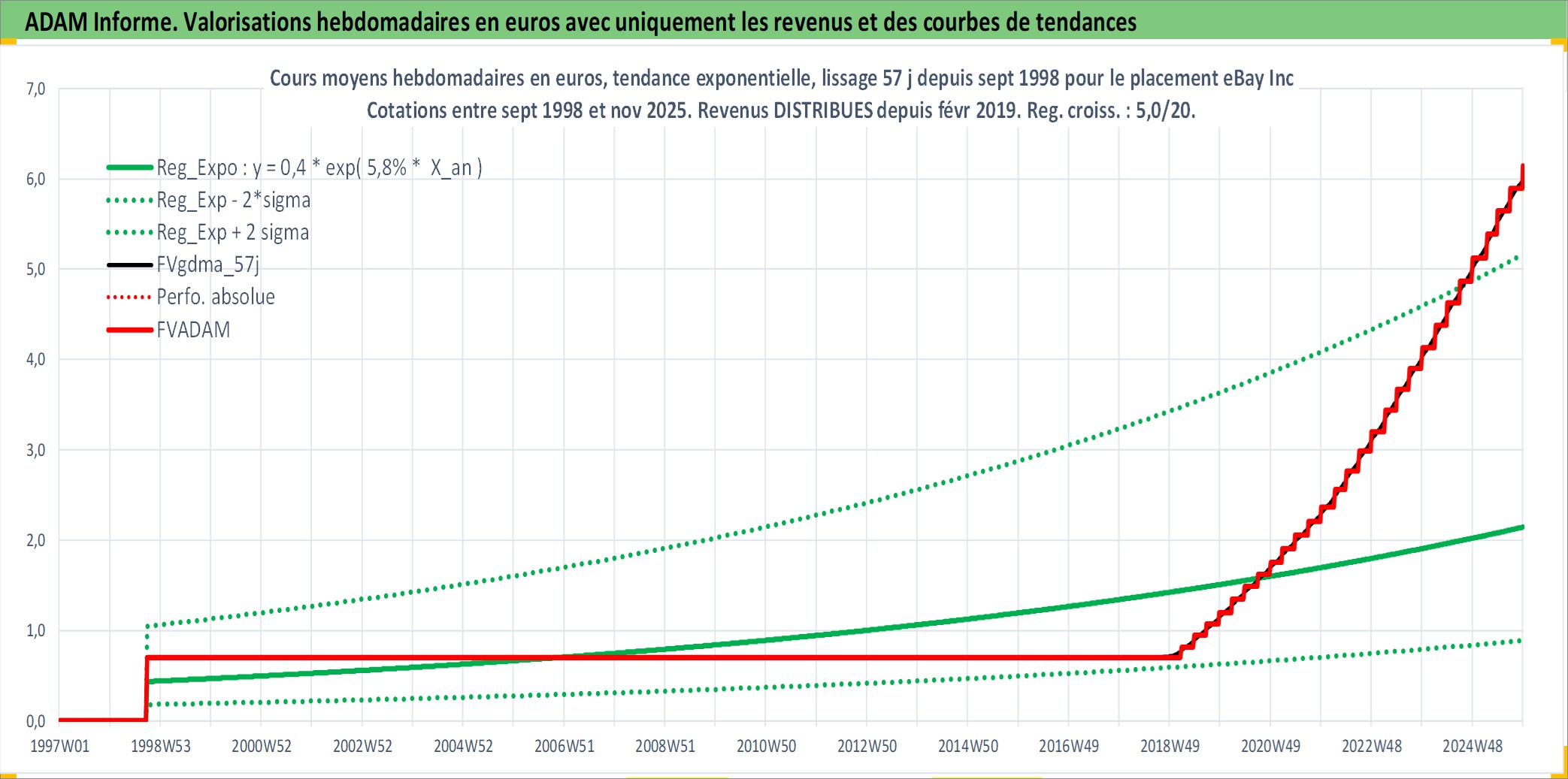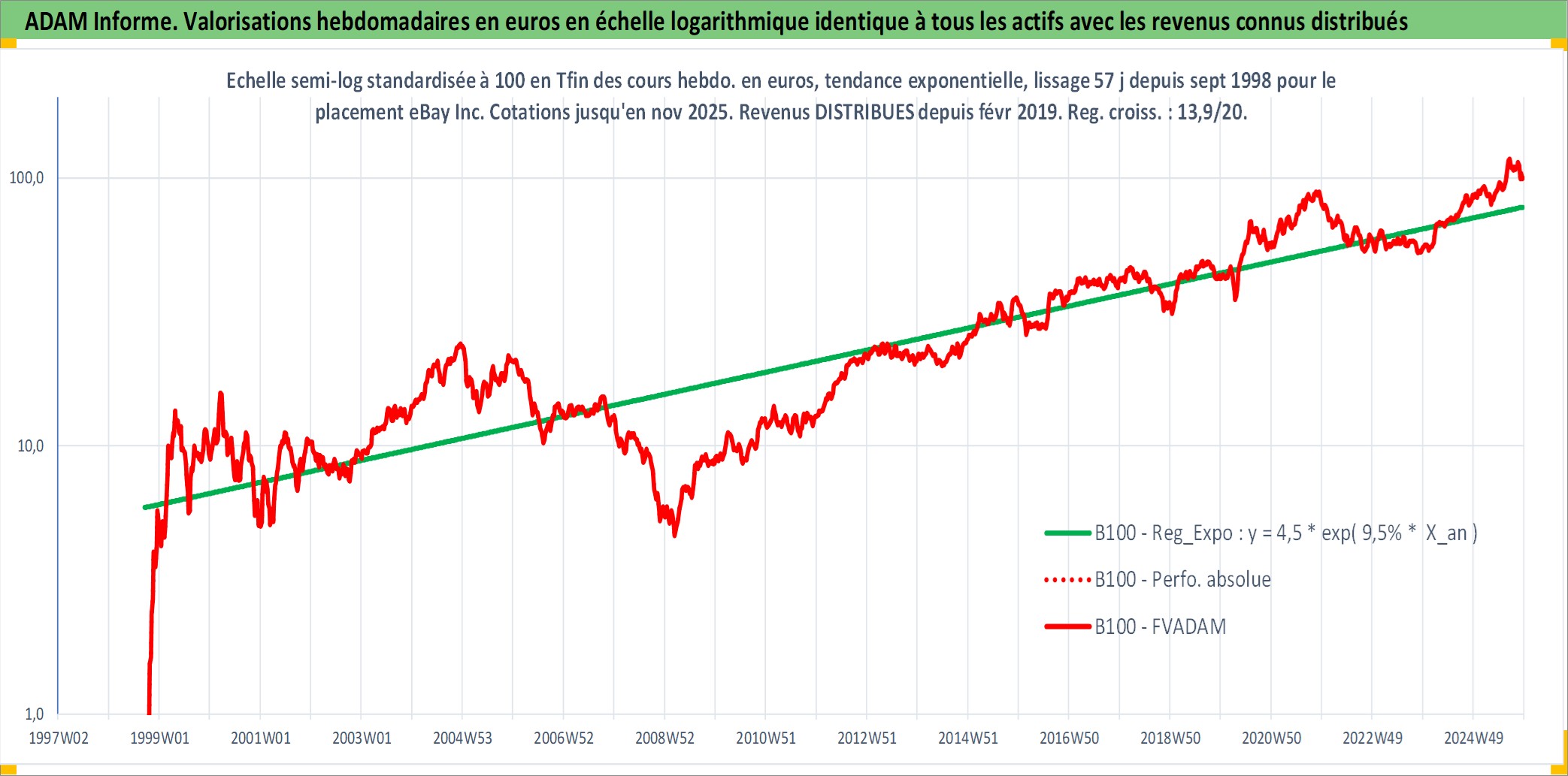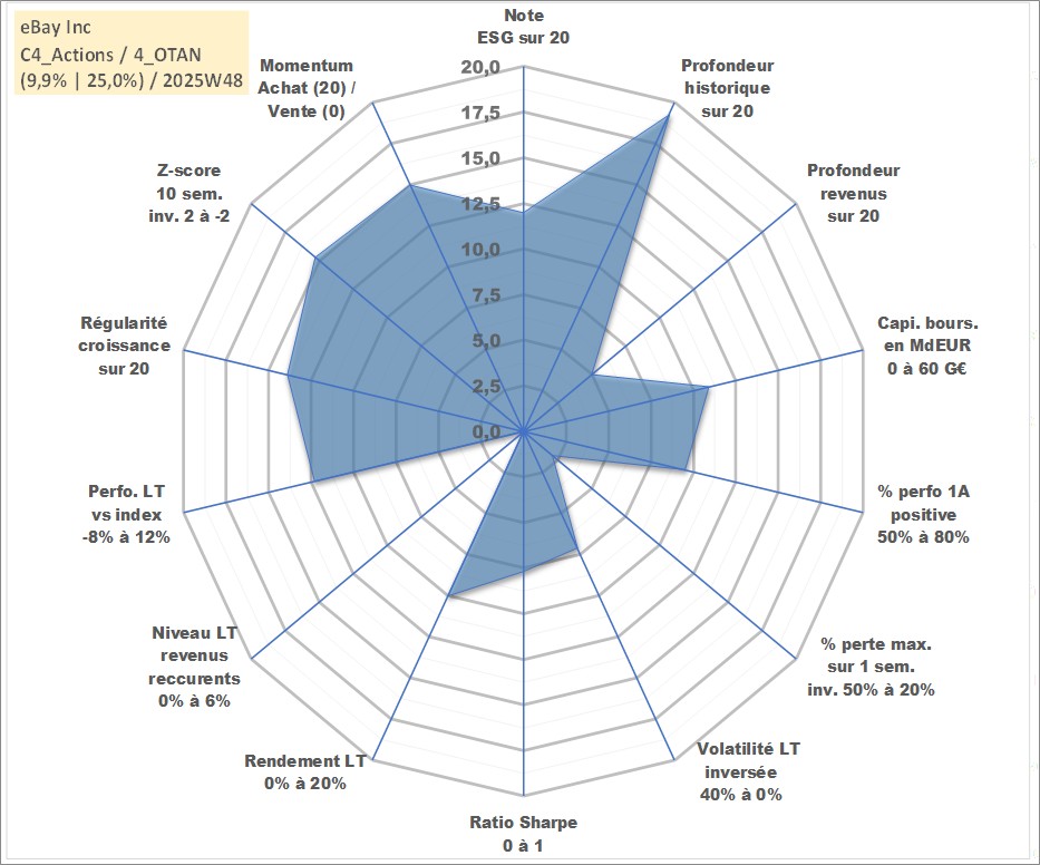 Site dédié aux investisseursPage dédiée sur site financeAnalyse des valorisations hebdomadaires de l'action eBay Inc. Cet actif est cote en USD. Les valorisations sont en contrevaleur EURO et couvrent les semaines 1998W39 a 2025W48. Les revenus de cet actif financier sont pris en compte depuis la semaine 2019W09. La note globale ESG de cet actif est estimee a 12.0 (apres rebasage entre 0 et 20).