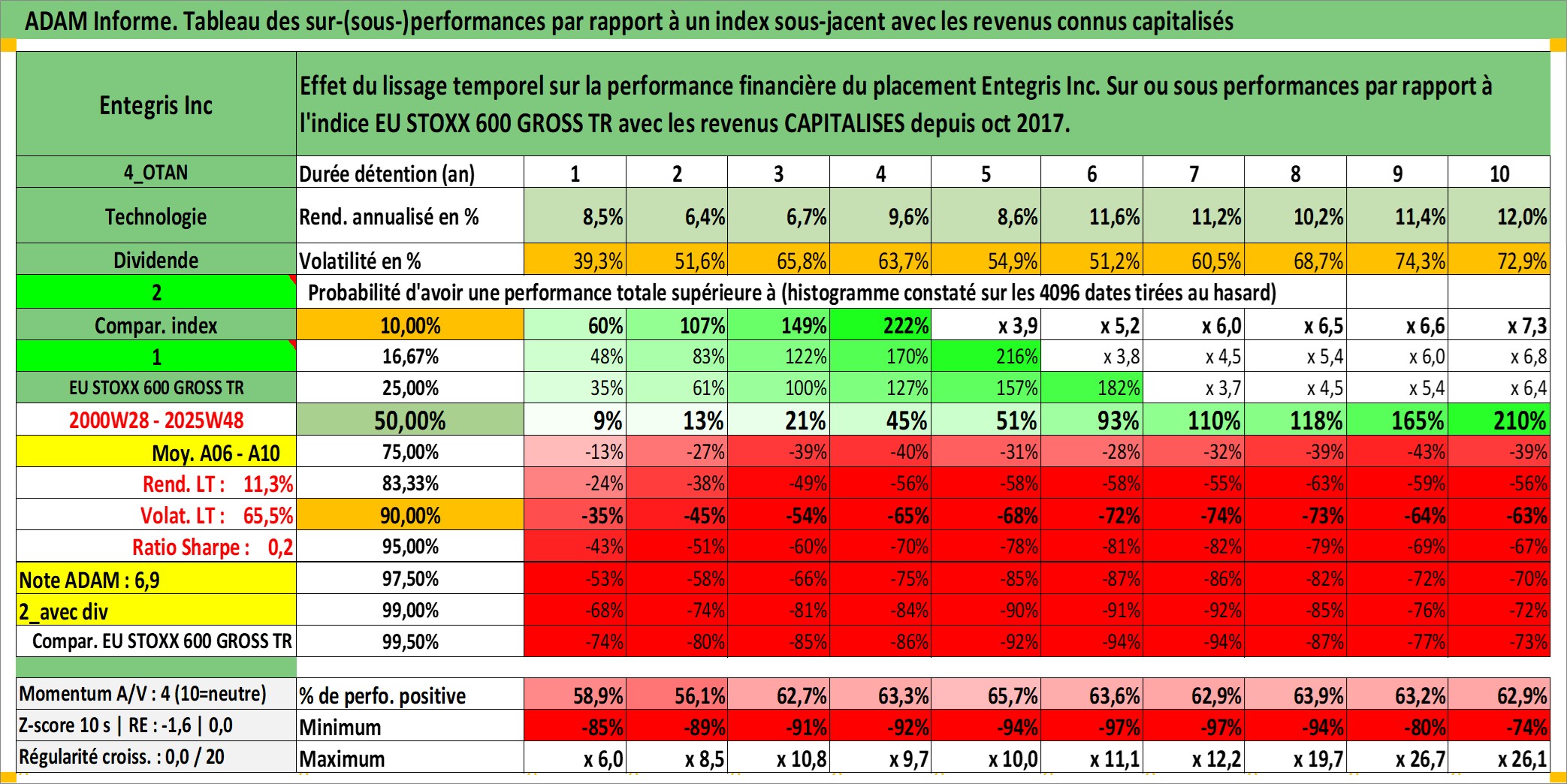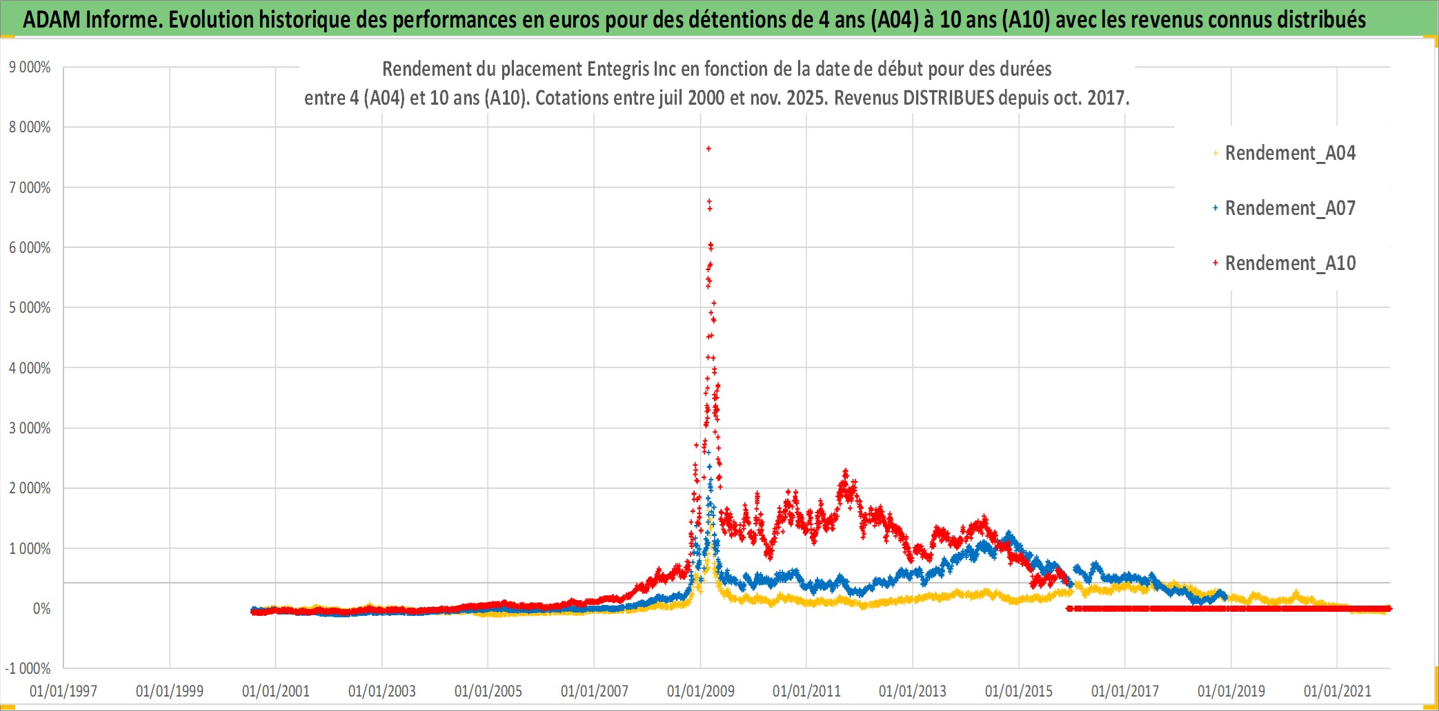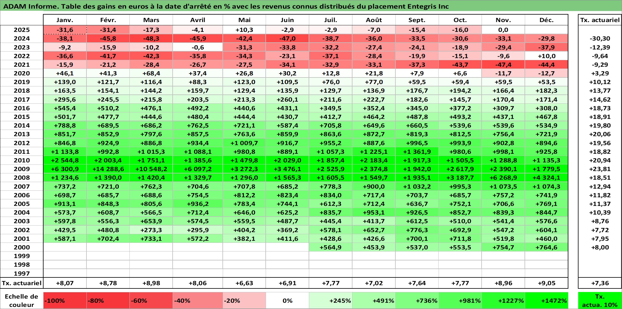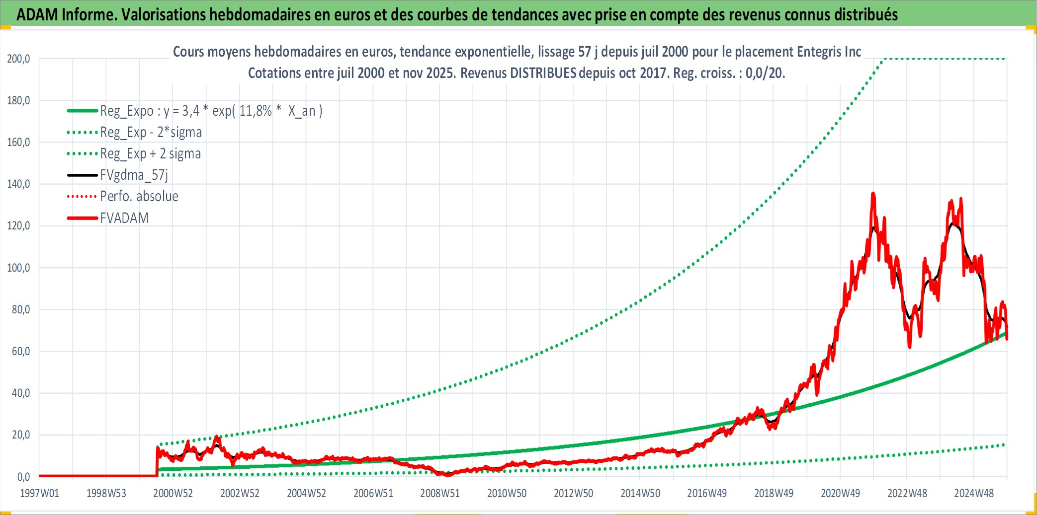 Site dédié aux investisseursPage dédiée sur site financeAnalyse des valorisations hebdomadaires de l'action Entegris Inc. Cet actif est cote en USD. Les valorisations sont en contrevaleur EURO et couvrent les semaines 2000W28 a 2025W48. Les revenus de cet actif financier sont pris en compte depuis la semaine 2017W44. La note ESG de cet actif n'est pas connue.
