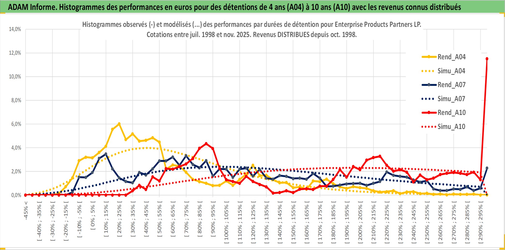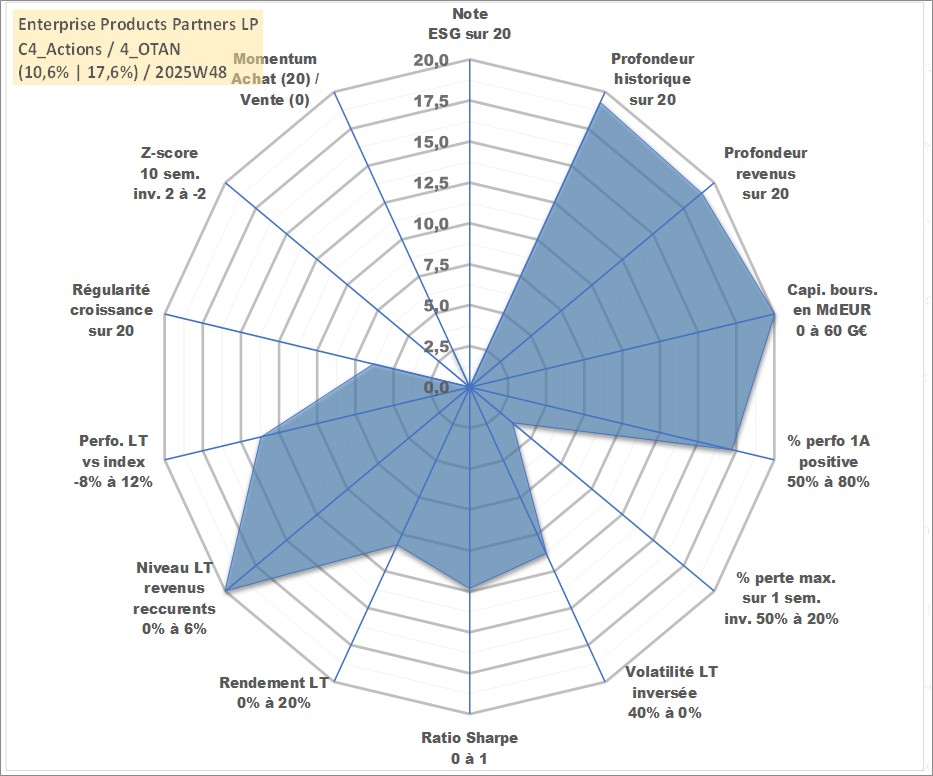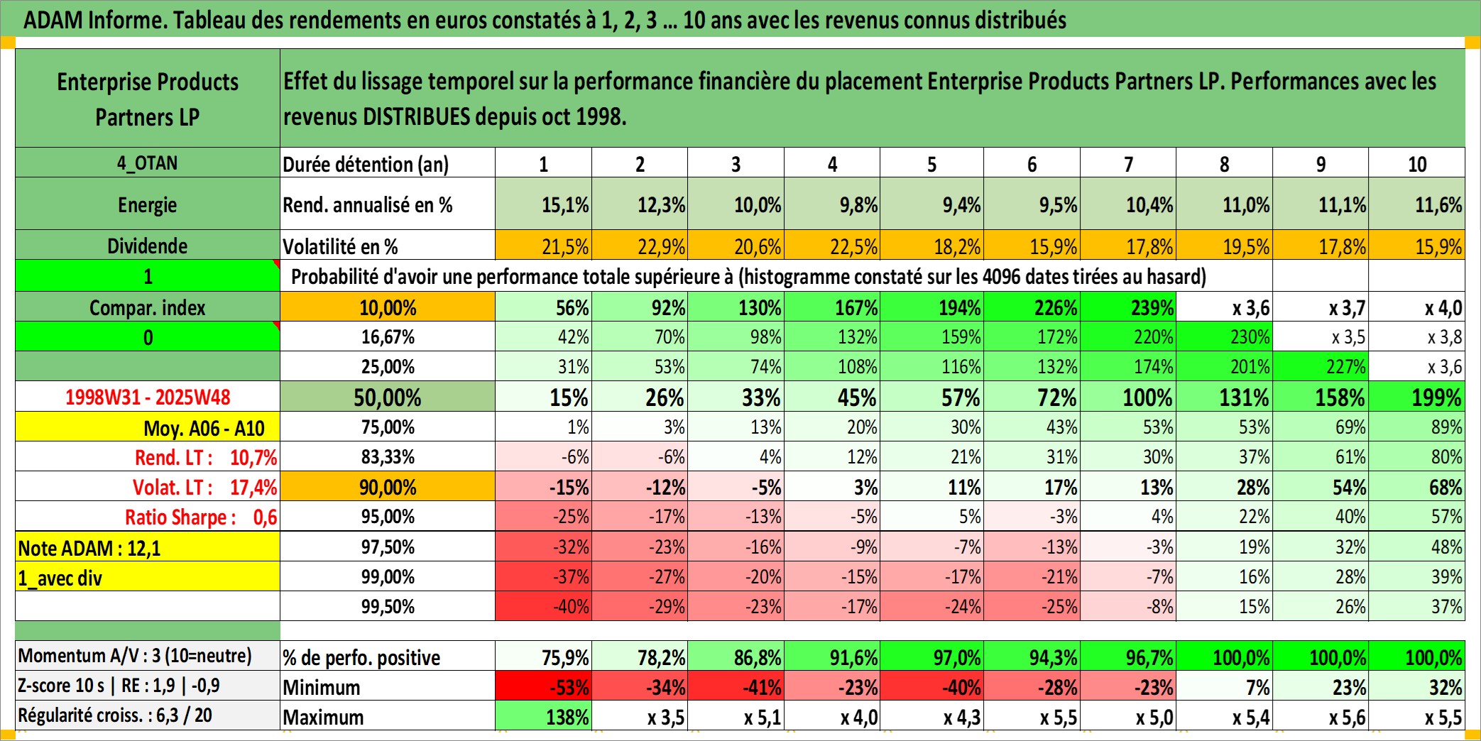 Site dédié aux investisseursPage dédiée sur site financeAnalyse des valorisations hebdomadaires de l'action Enterprise Products Partners LP. Cet actif est cote en USD. Les valorisations sont en contrevaleur EURO et couvrent les semaines 1998W31 a 2025W48. Les revenus de cet actif financier sont pris en compte depuis la semaine 1998W44. La note ESG de cet actif n'est pas connue.