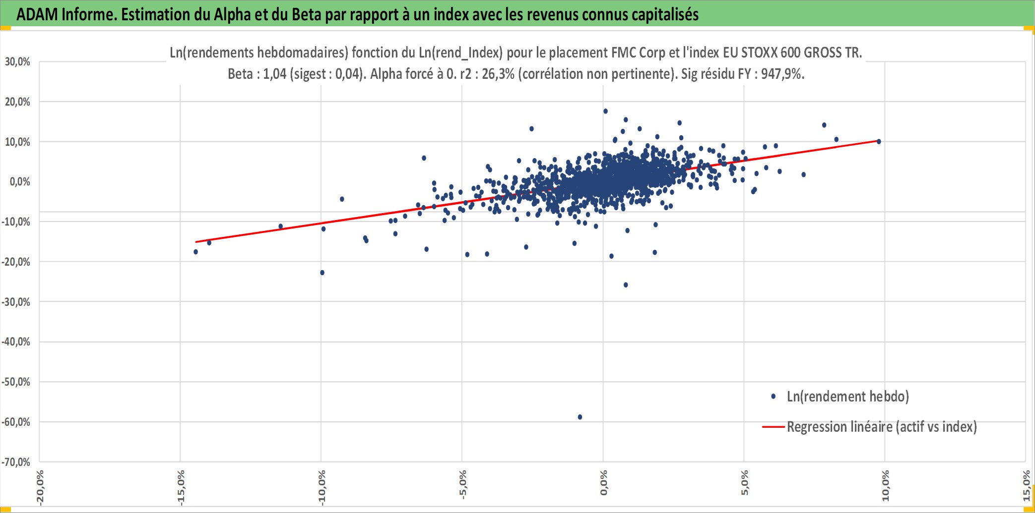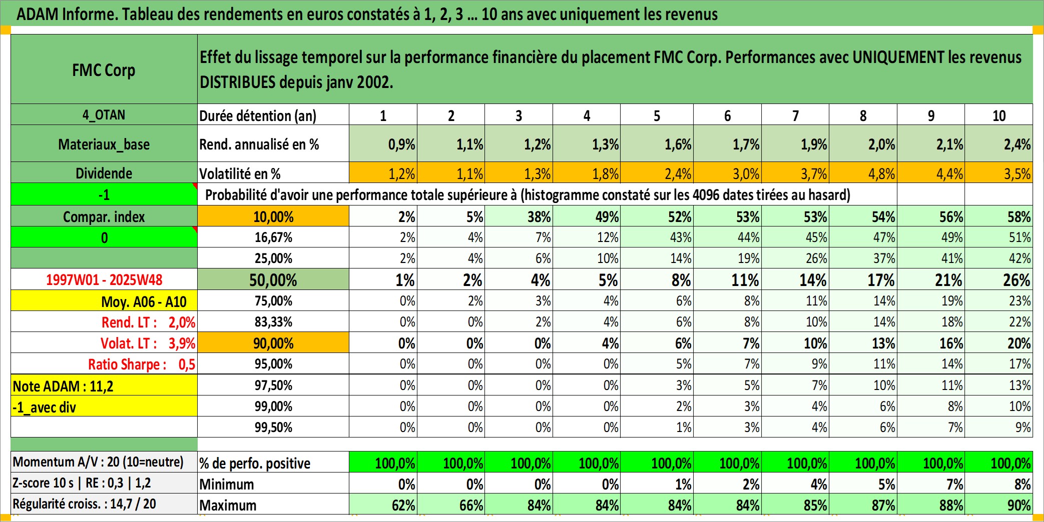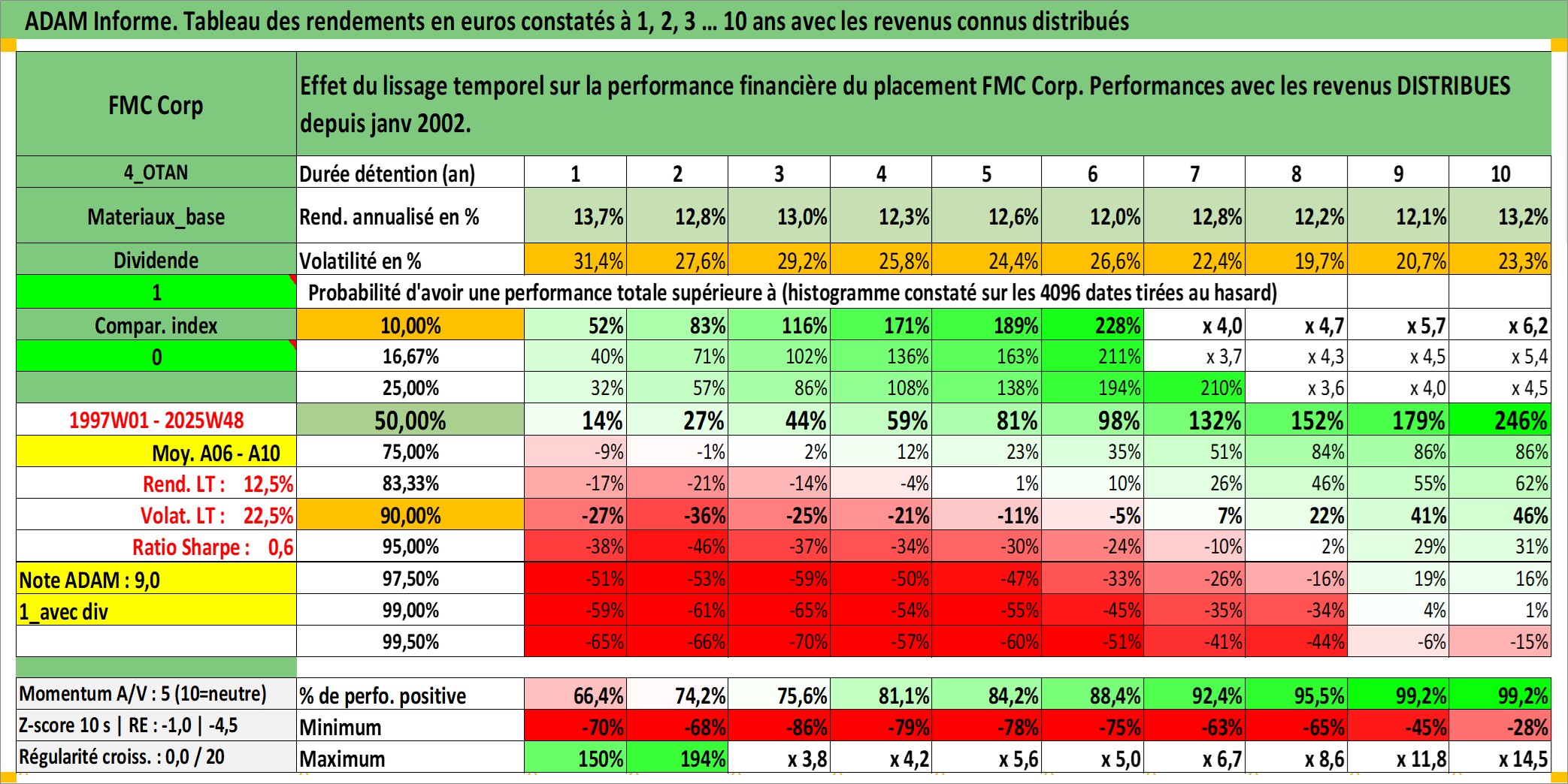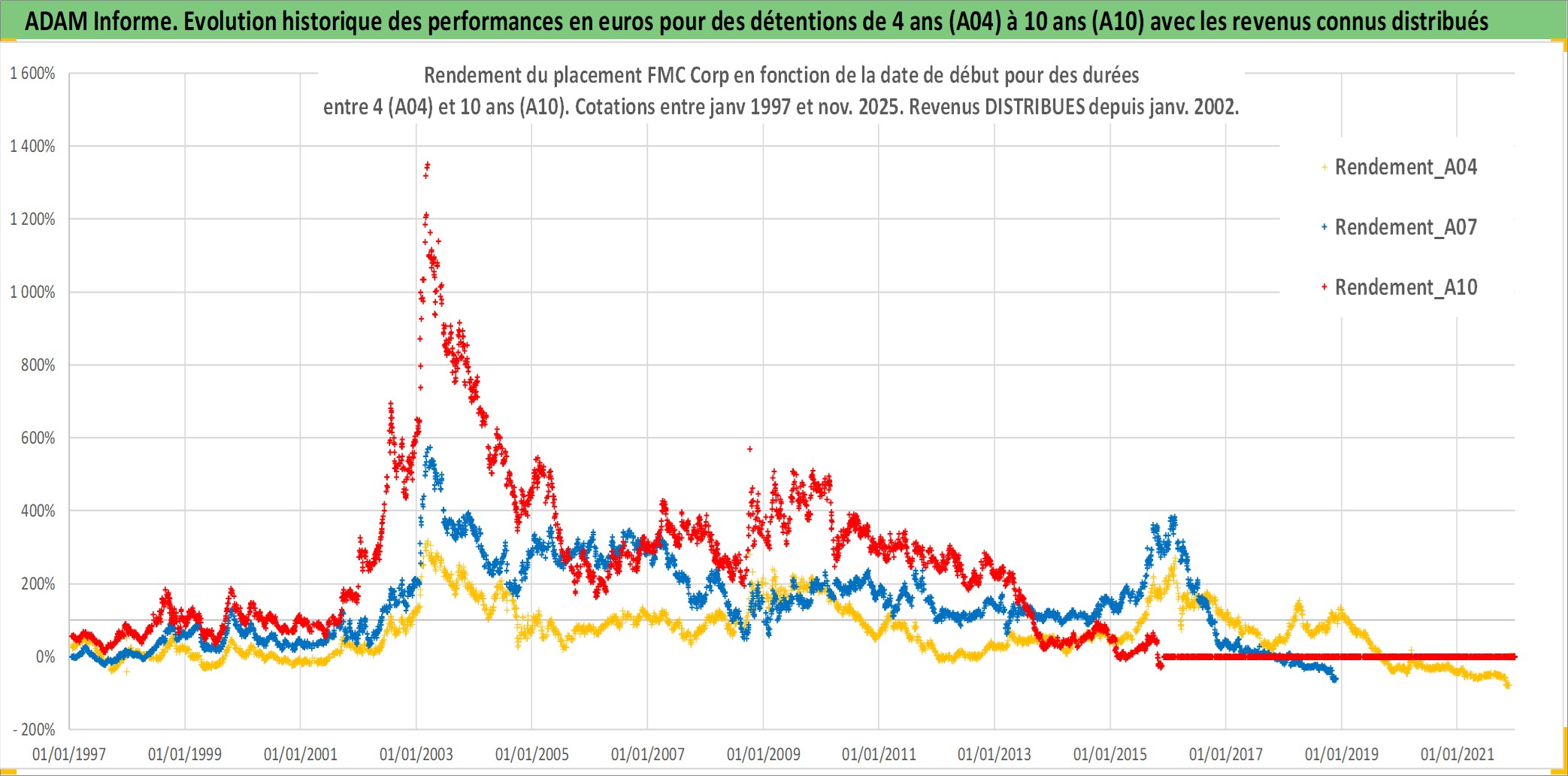 Site dédié aux investisseursPage dédiée sur site financeAnalyse des valorisations hebdomadaires de l'action FMC Corp. Cet actif est cote en USD. Les valorisations sont en contrevaleur EURO et couvrent les semaines 1997W01 a 2025W48. Les revenus de cet actif financier sont pris en compte depuis la semaine 2002W01. La note globale ESG de cet actif est estimee a 4.0 (apres rebasage entre 0 et 20).