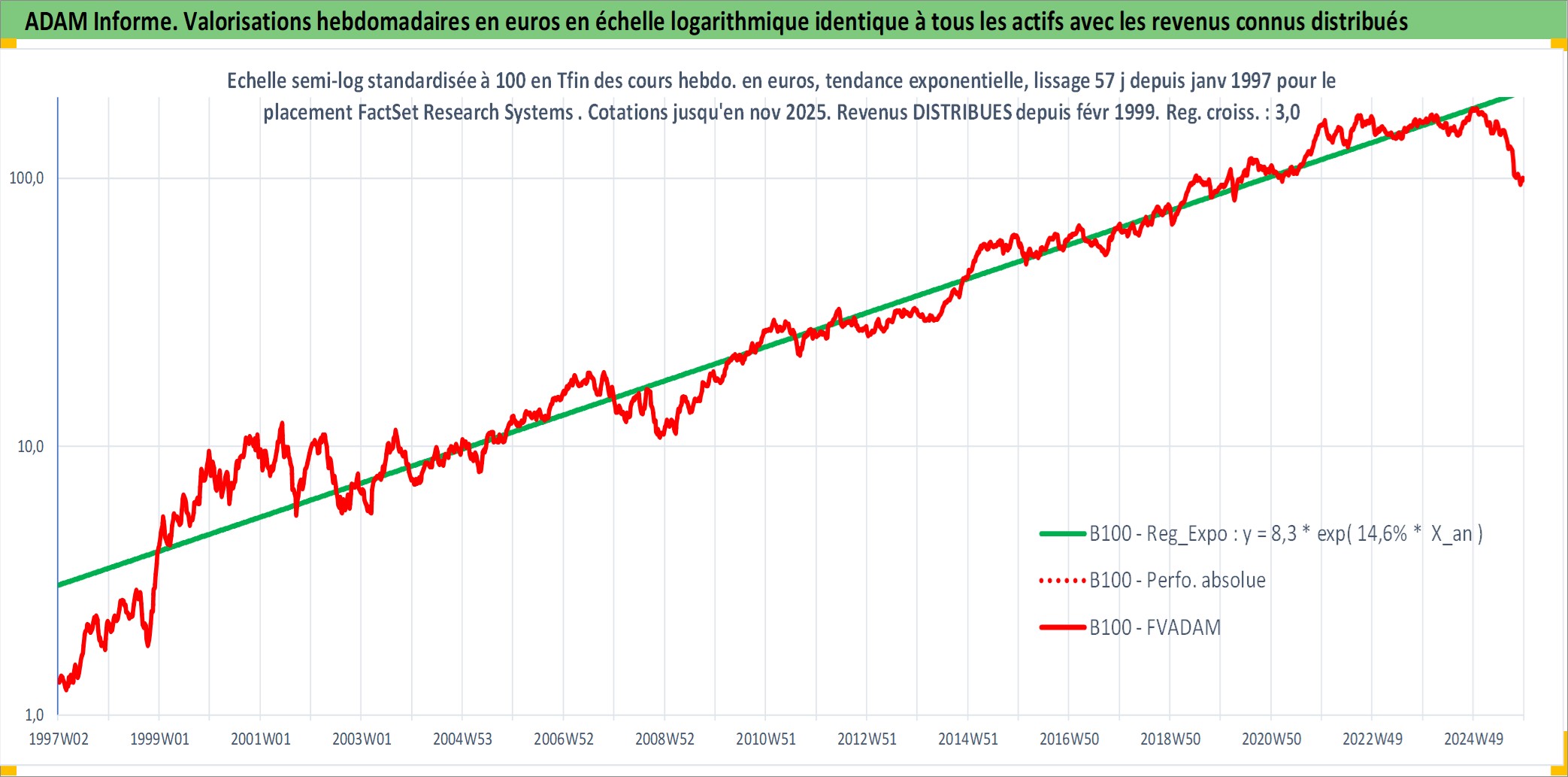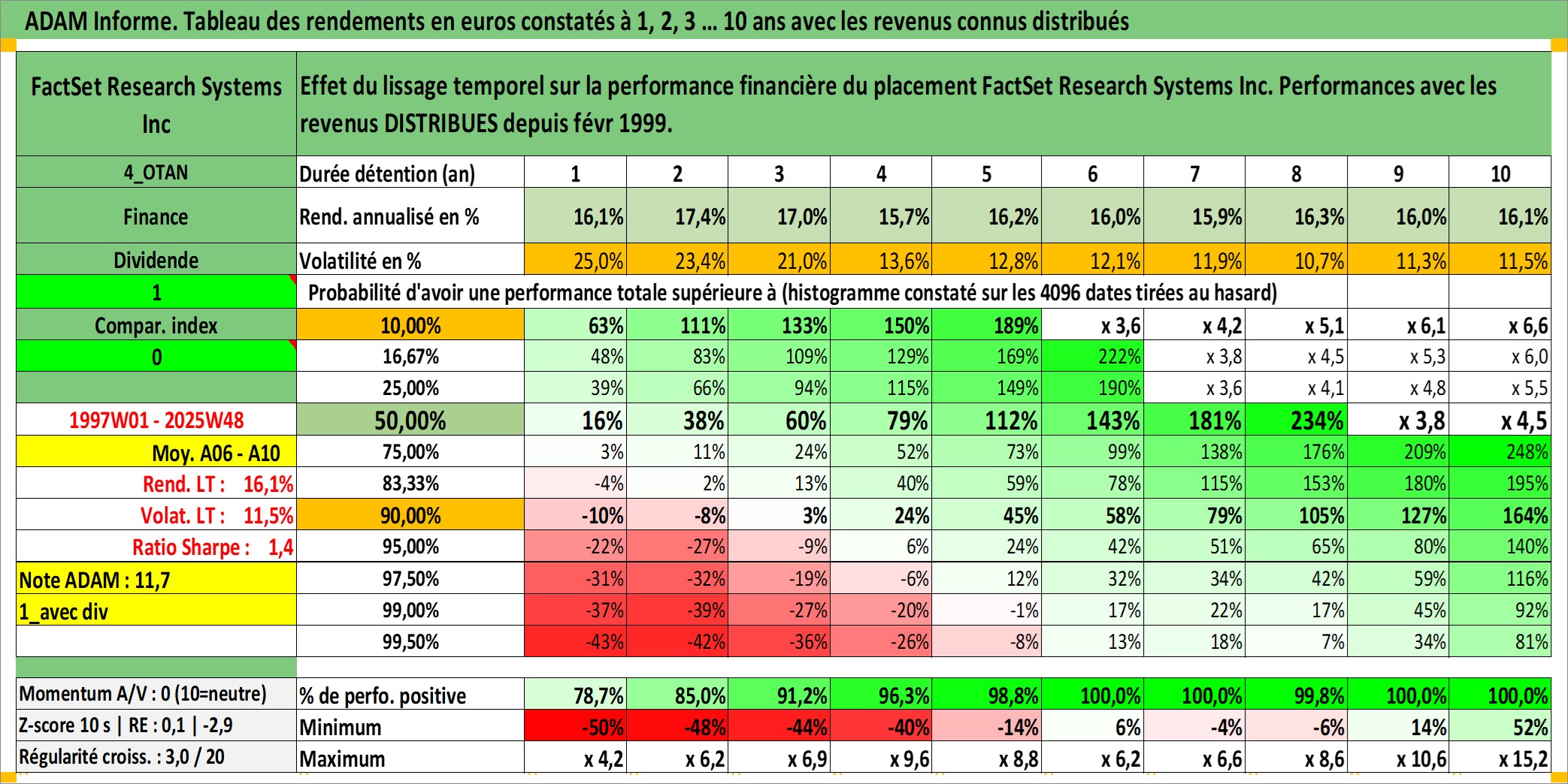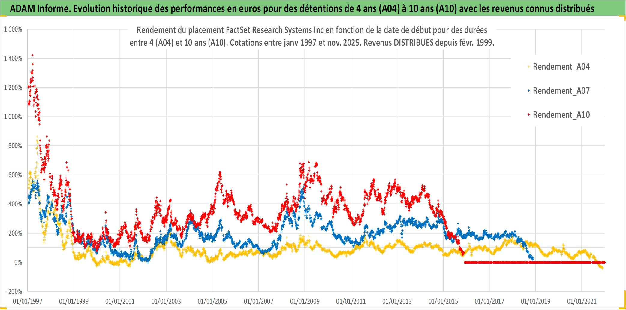Site dédié aux investisseursPage dédiée sur site financeAnalyse des valorisations hebdomadaires de l'action FactSet Research Systems Inc. Cet actif est cote en USD. Les valorisations sont en contrevaleur EURO et couvrent les semaines 1997W01 a 2025W48. Les revenus de cet actif financier sont pris en compte depuis la semaine 1999W08. La note globale ESG de cet actif est estimee a 10.0 (apres rebasage entre 0 et 20).