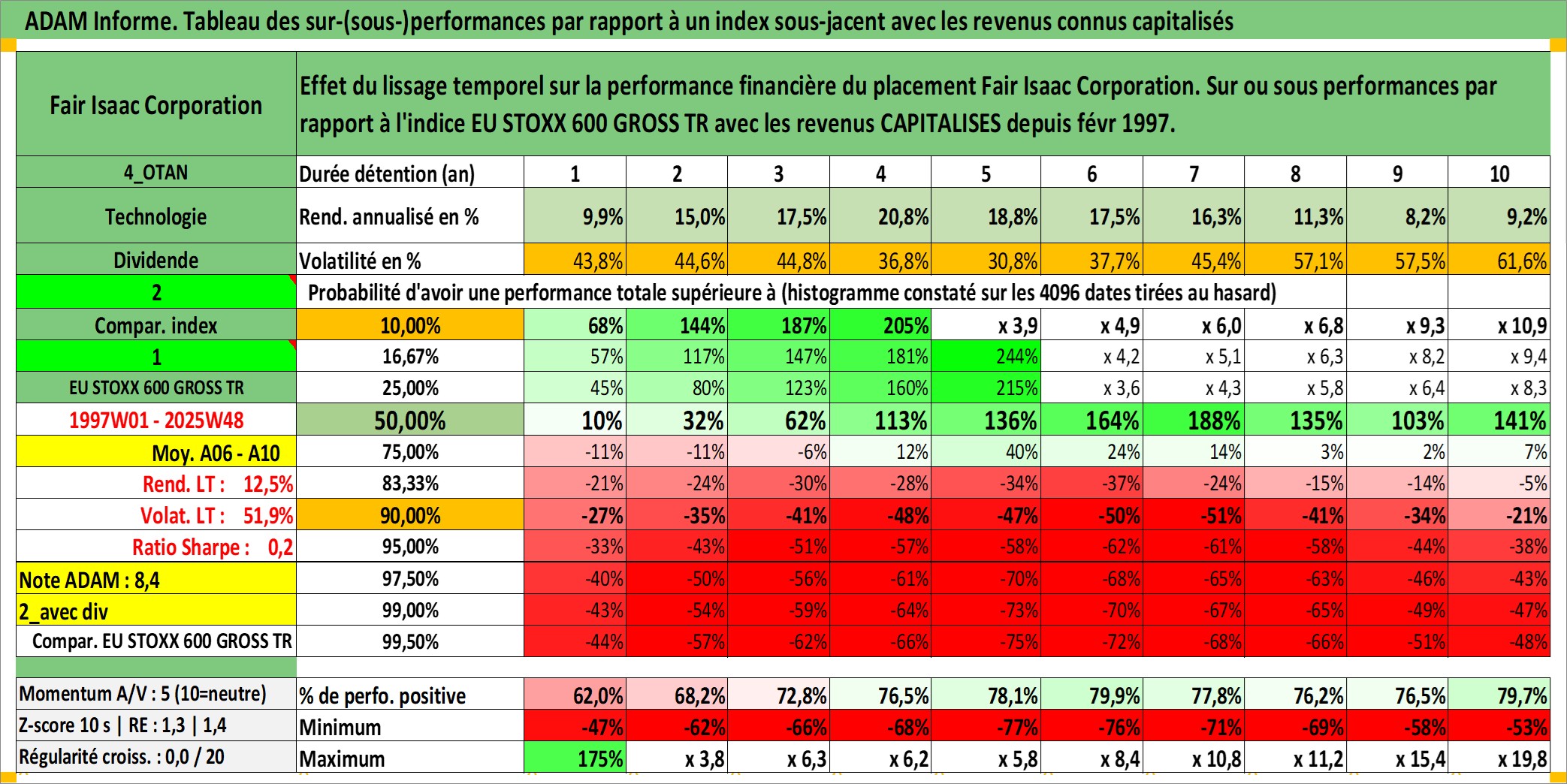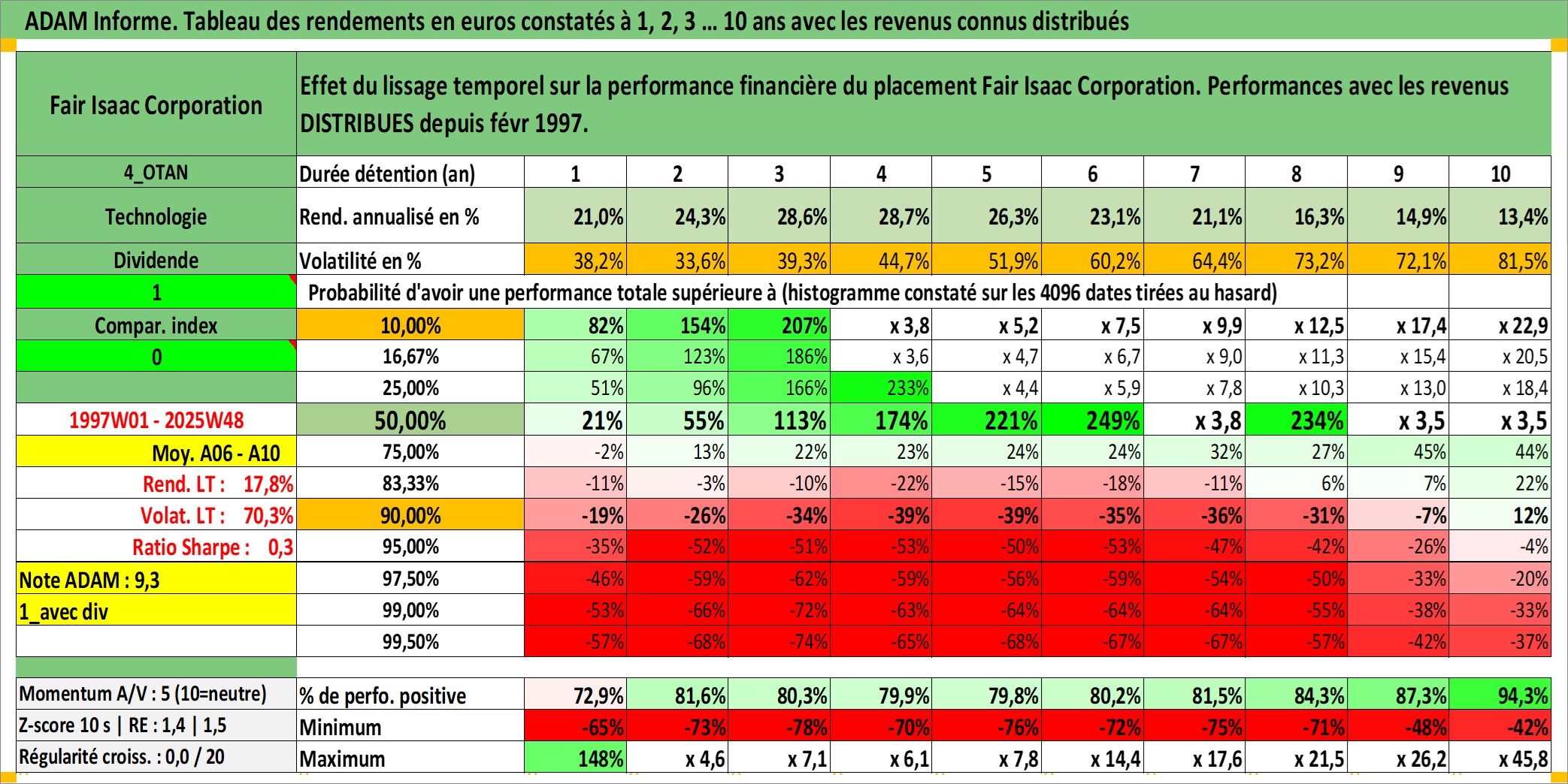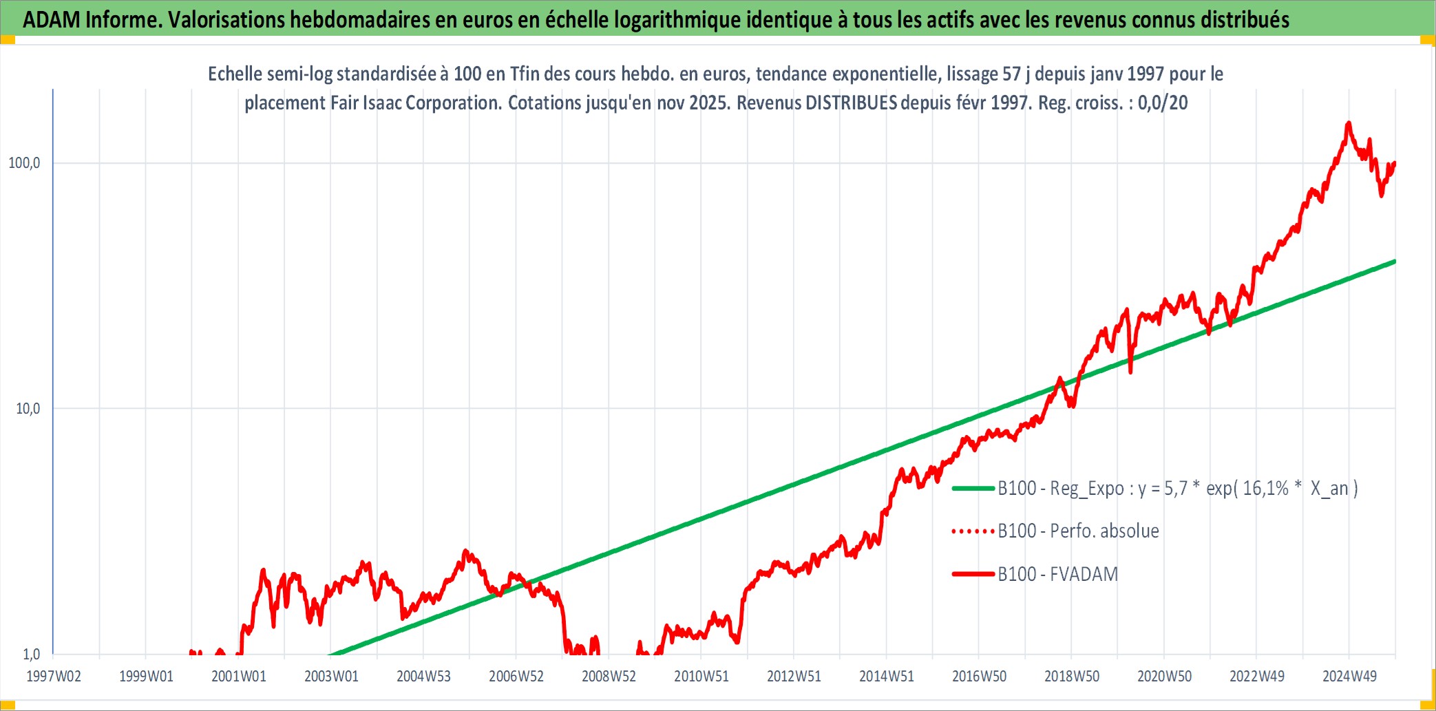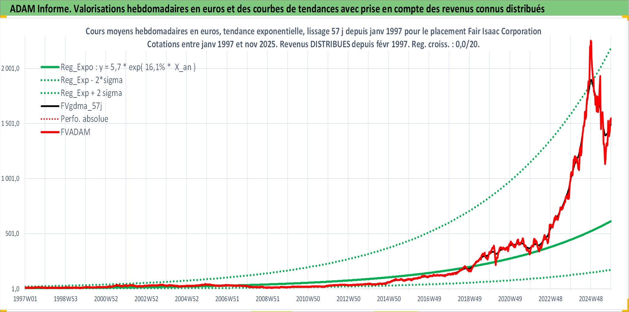 Site dédié aux investisseursPage dédiée sur site financeAnalyse des valorisations hebdomadaires de l'action Fair Isaac Corporation. Cet actif est cote en USD. Les valorisations sont en contrevaleur EURO et couvrent les semaines 1997W01 a 2025W48. Les revenus de cet actif financier sont pris en compte depuis la semaine 1997W08. La note ESG de cet actif n'est pas connue.