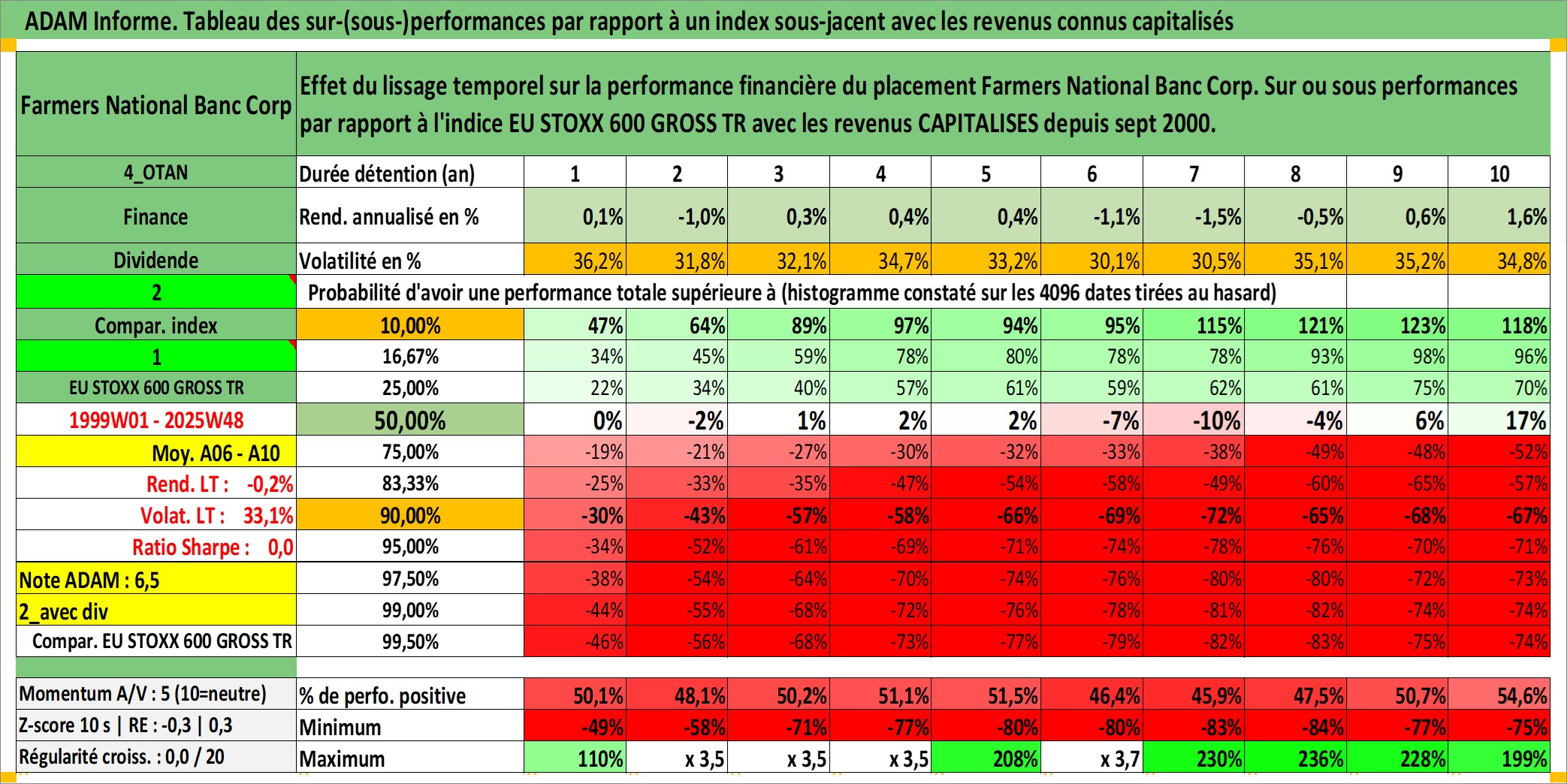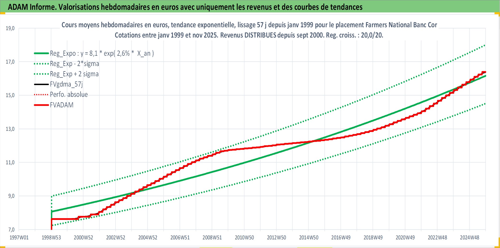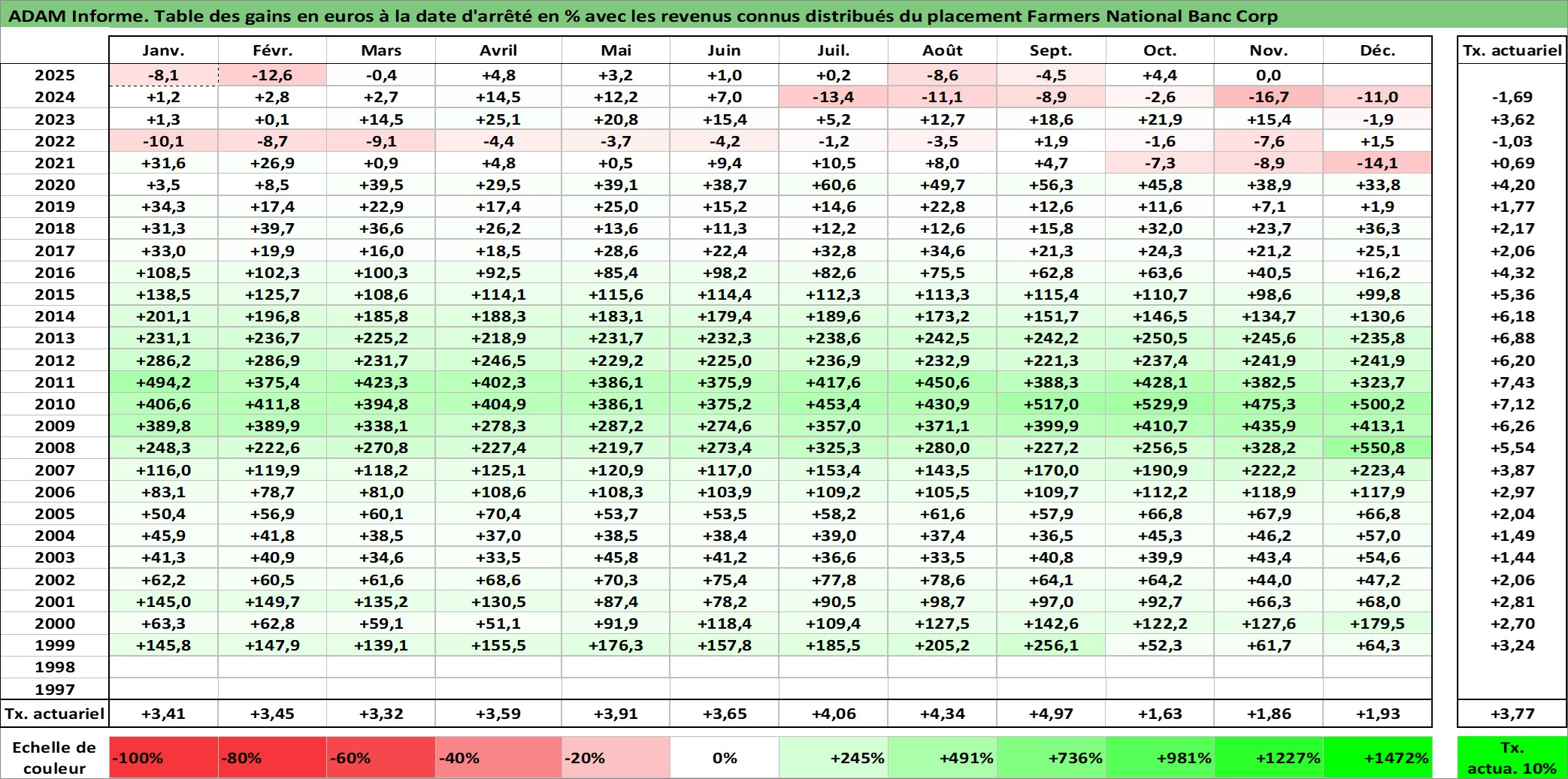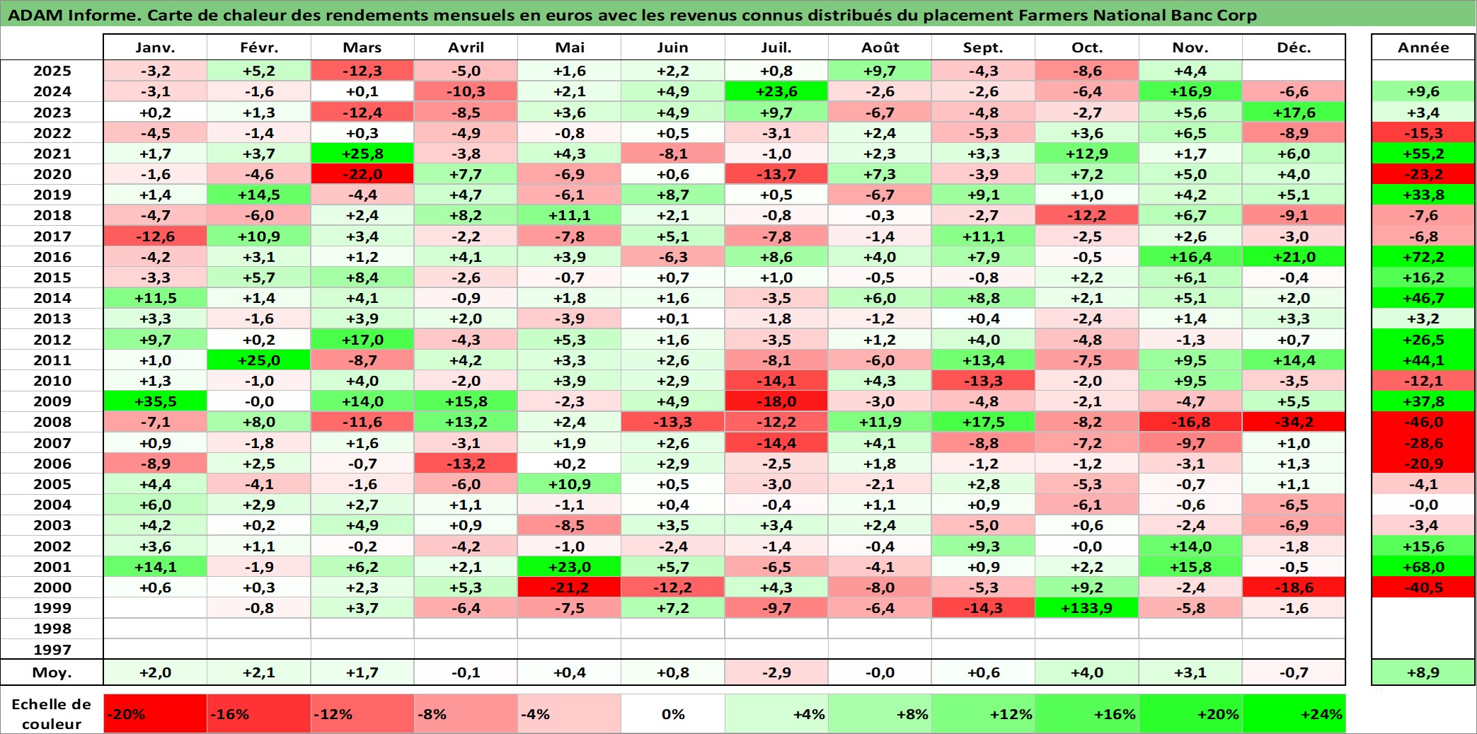 Site dédié aux investisseursPage dédiée sur site financeAnalyse des valorisations hebdomadaires de l'action Farmers National Banc Corp. Cet actif est cote en USD. Les valorisations sont en contrevaleur EURO et couvrent les semaines 1999W01 a 2025W48. Les revenus de cet actif financier sont pris en compte depuis la semaine 2000W36. La note ESG de cet actif n'est pas connue.