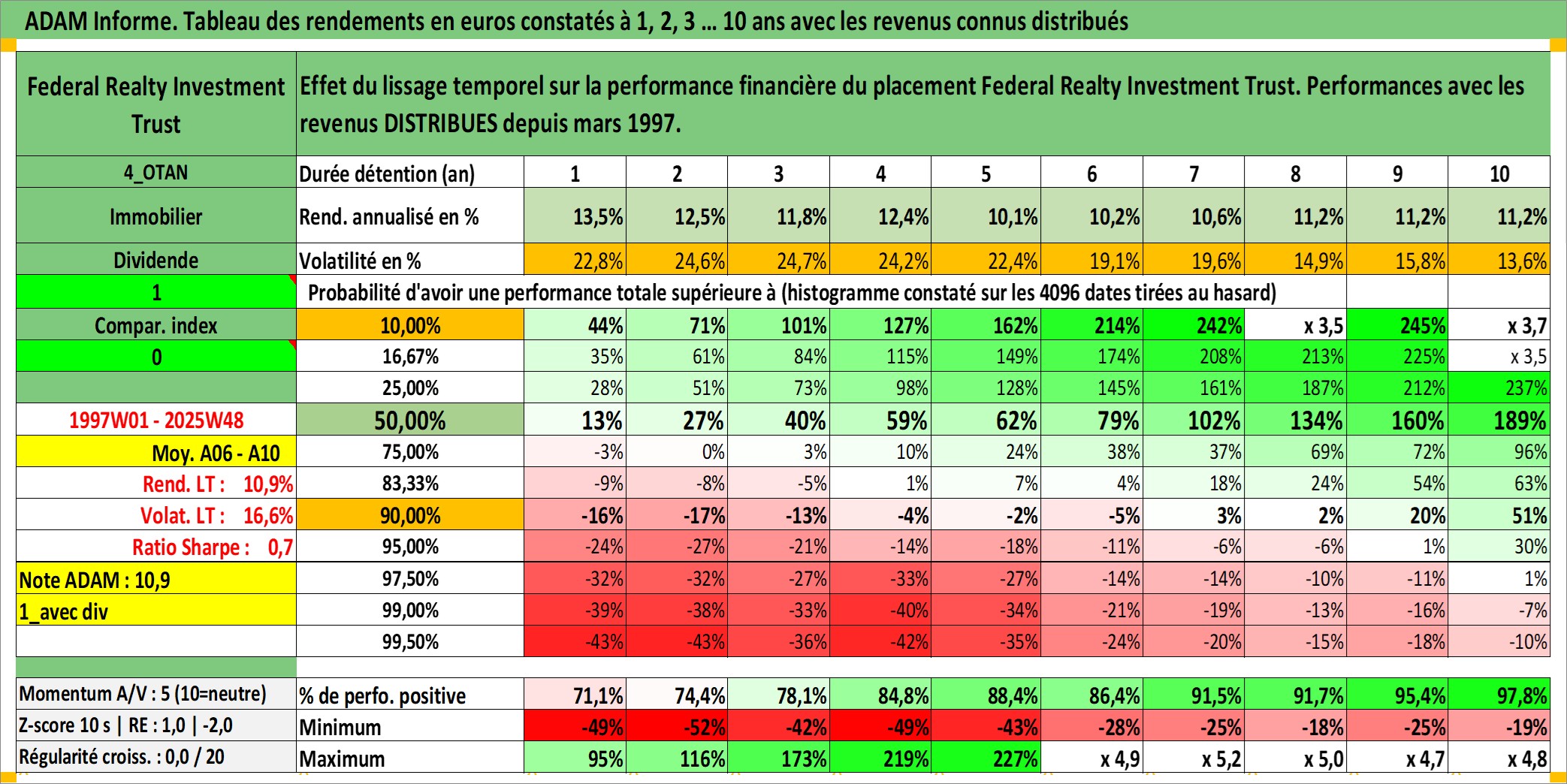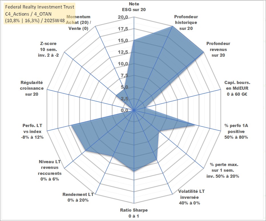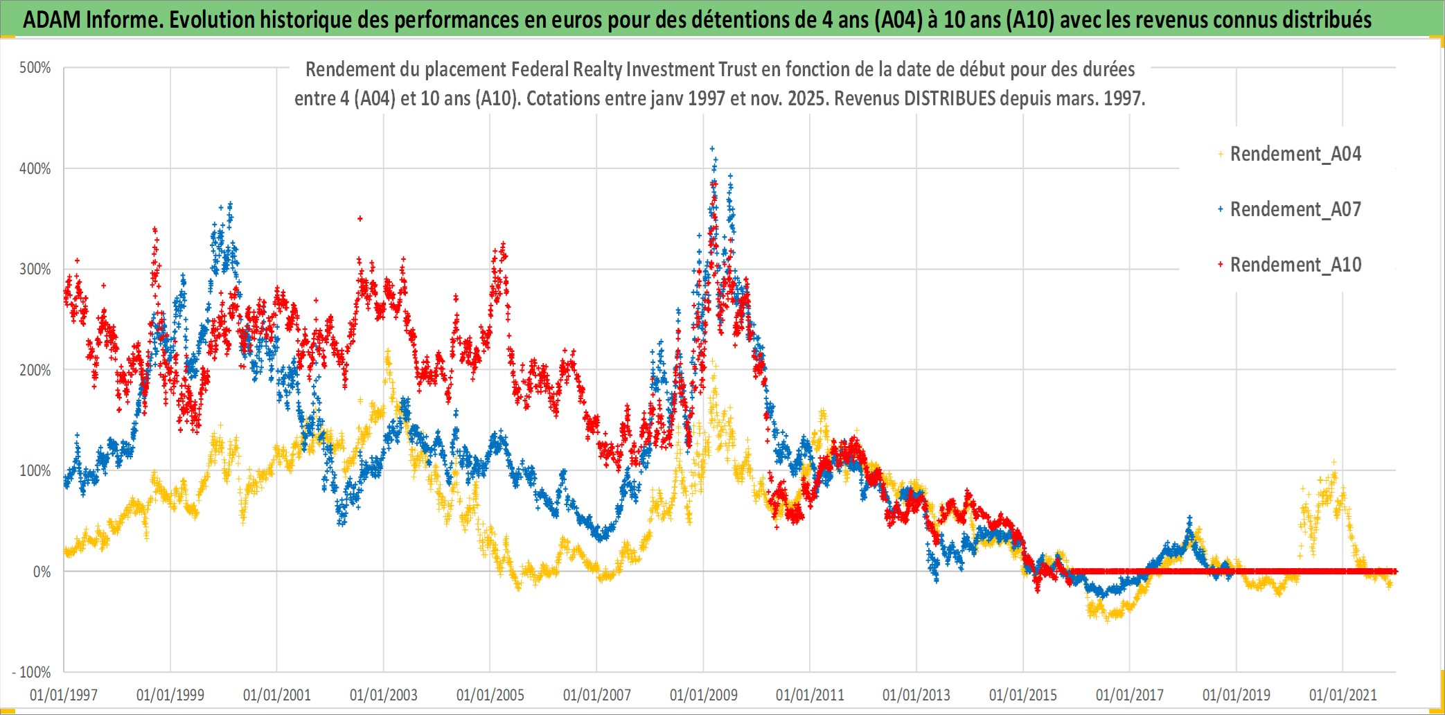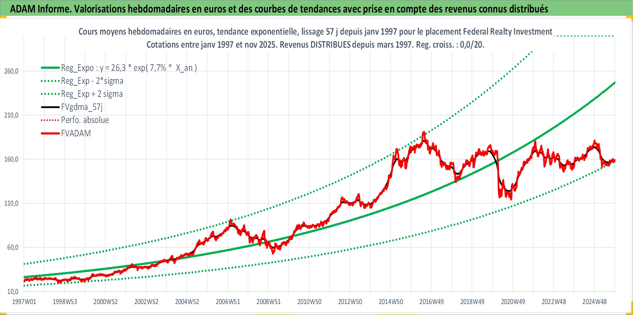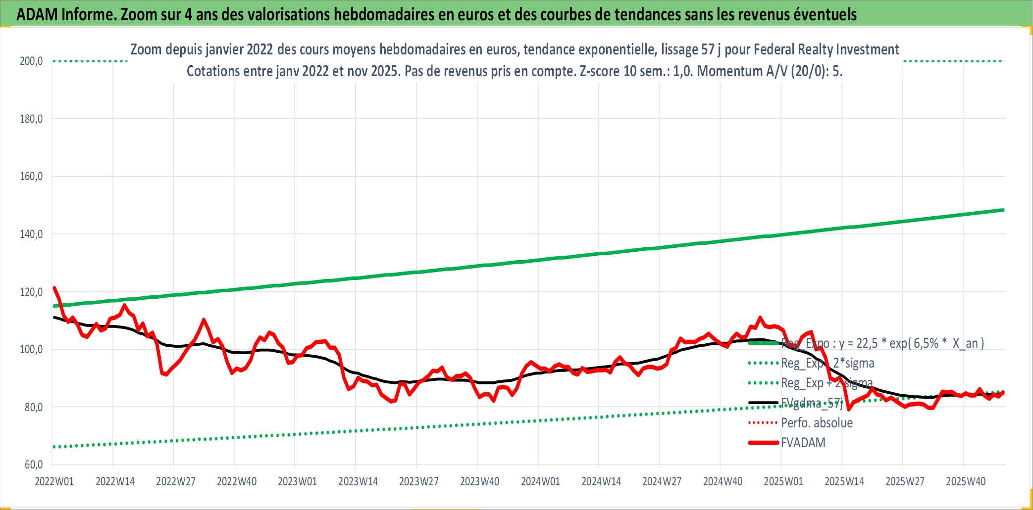 Site dédié aux investisseursPage dédiée sur site financeAnalyse des valorisations hebdomadaires de l'action Federal Realty Investment Trust. Cet actif est cote en USD. Les valorisations sont en contrevaleur EURO et couvrent les semaines 1997W01 a 2025W48. Les revenus de cet actif financier sont pris en compte depuis la semaine 1997W12. La note globale ESG de cet actif est estimee a 15.0 (apres rebasage entre 0 et 20).