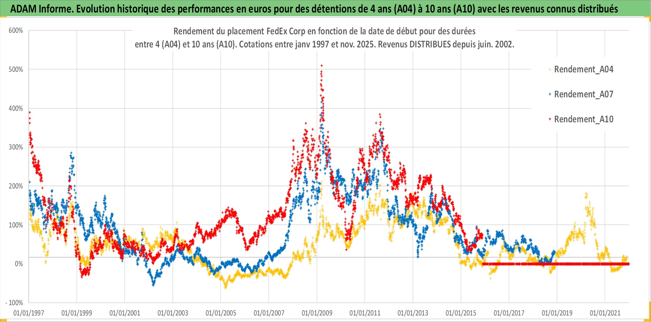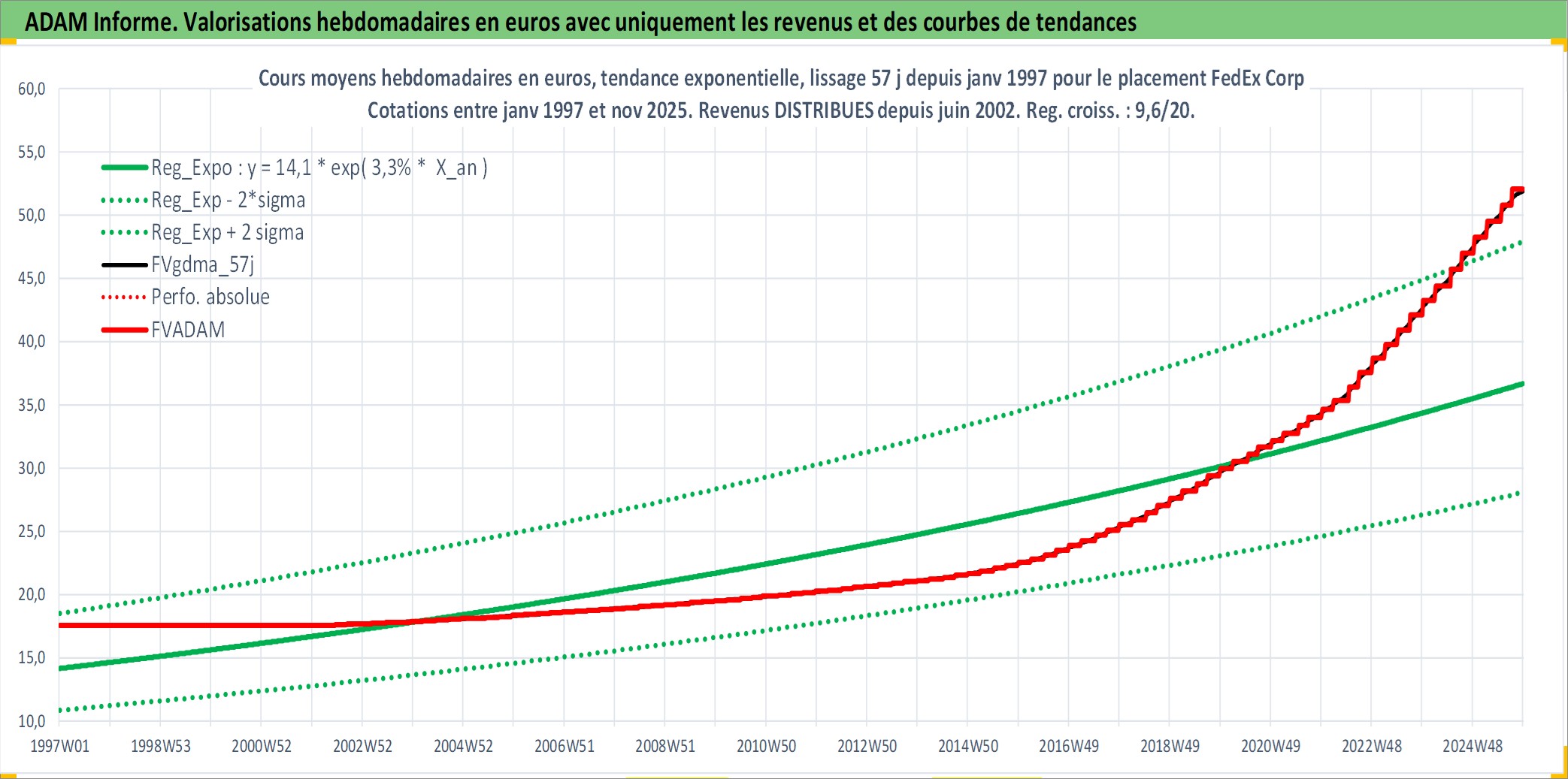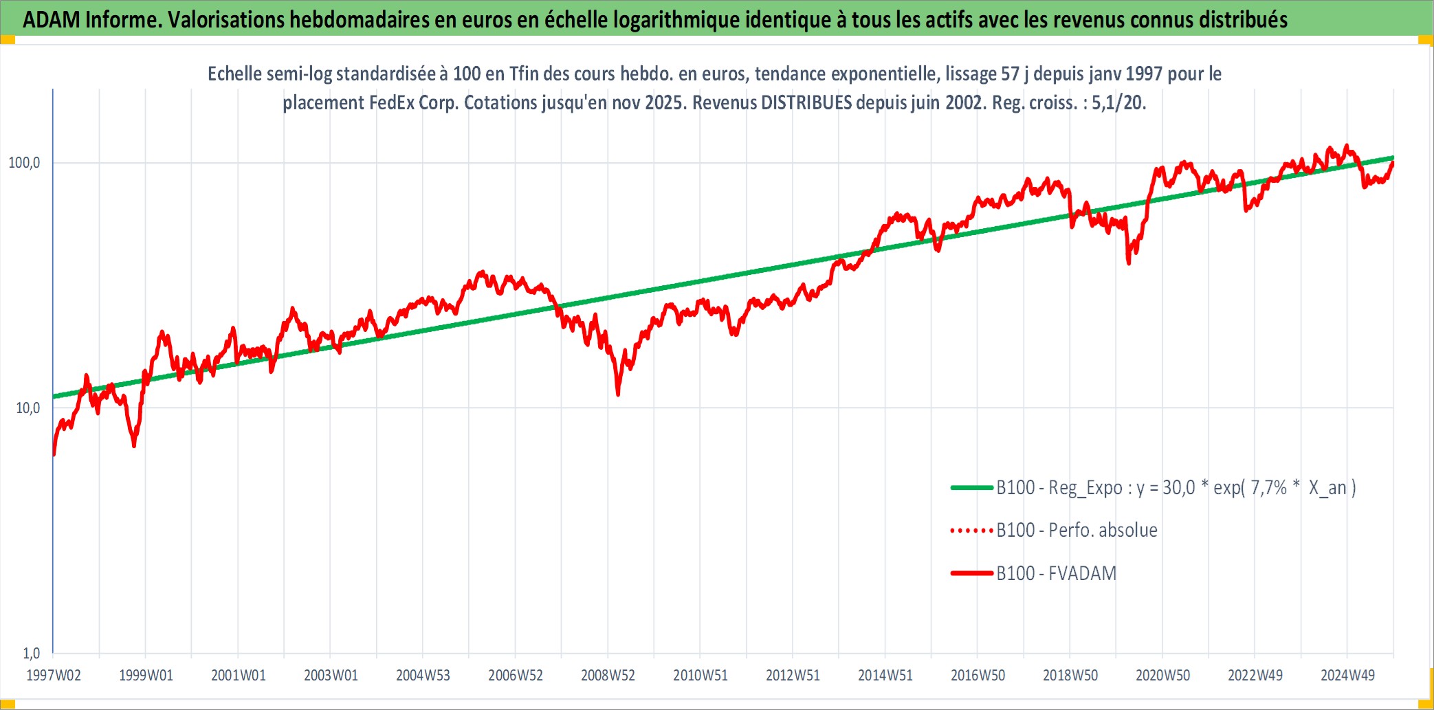 Site dédié aux investisseursPage dédiée sur site financeAnalyse des valorisations hebdomadaires de l'action FedEx Corp. Cet actif est cote en USD. Les valorisations sont en contrevaleur EURO et couvrent les semaines 1997W01 a 2025W48. Les revenus de cet actif financier sont pris en compte depuis la semaine 2002W24. La note globale ESG de cet actif est estimee a 10.0 (apres rebasage entre 0 et 20).