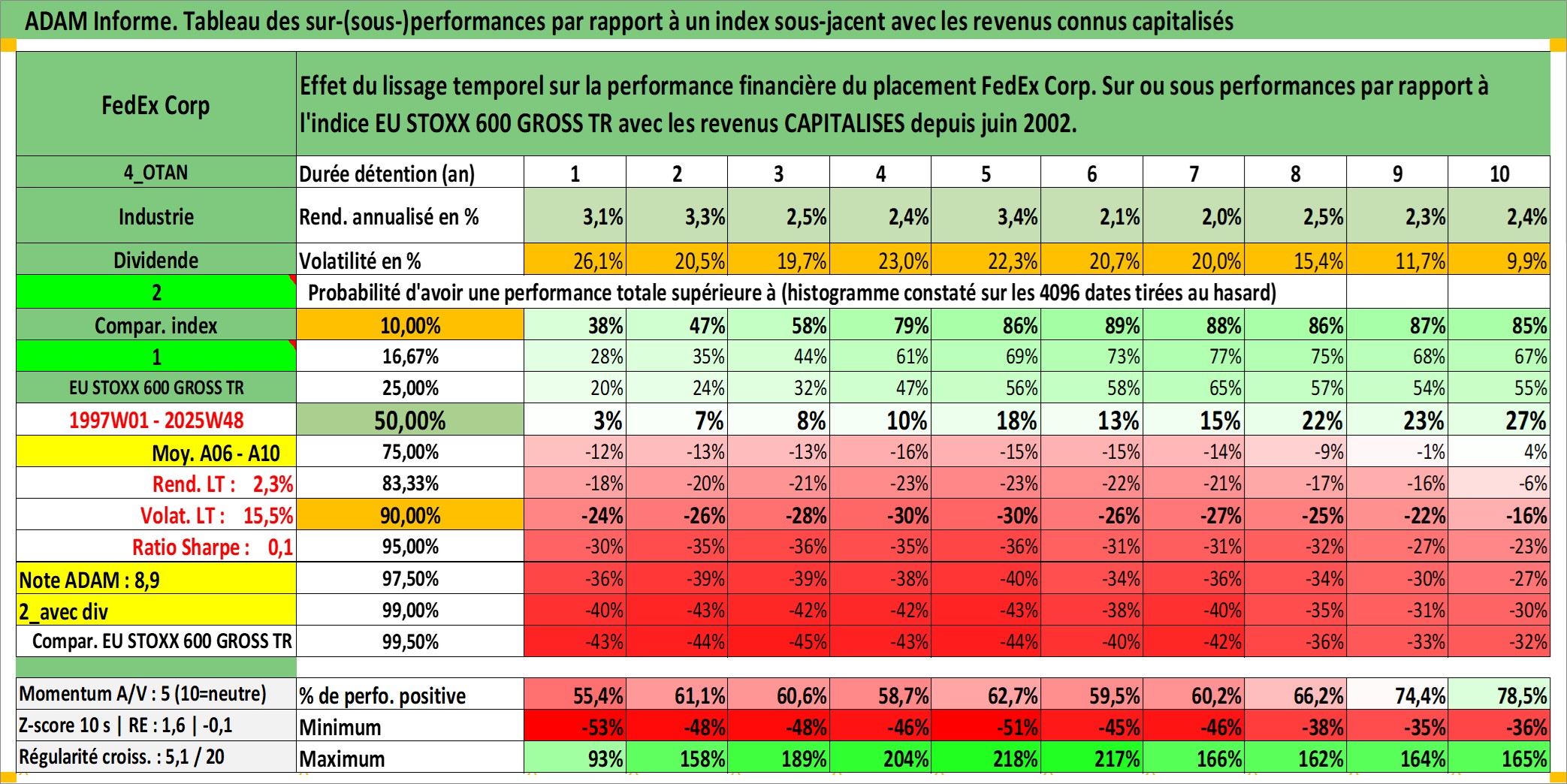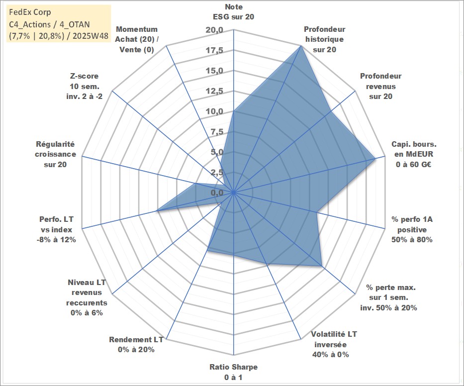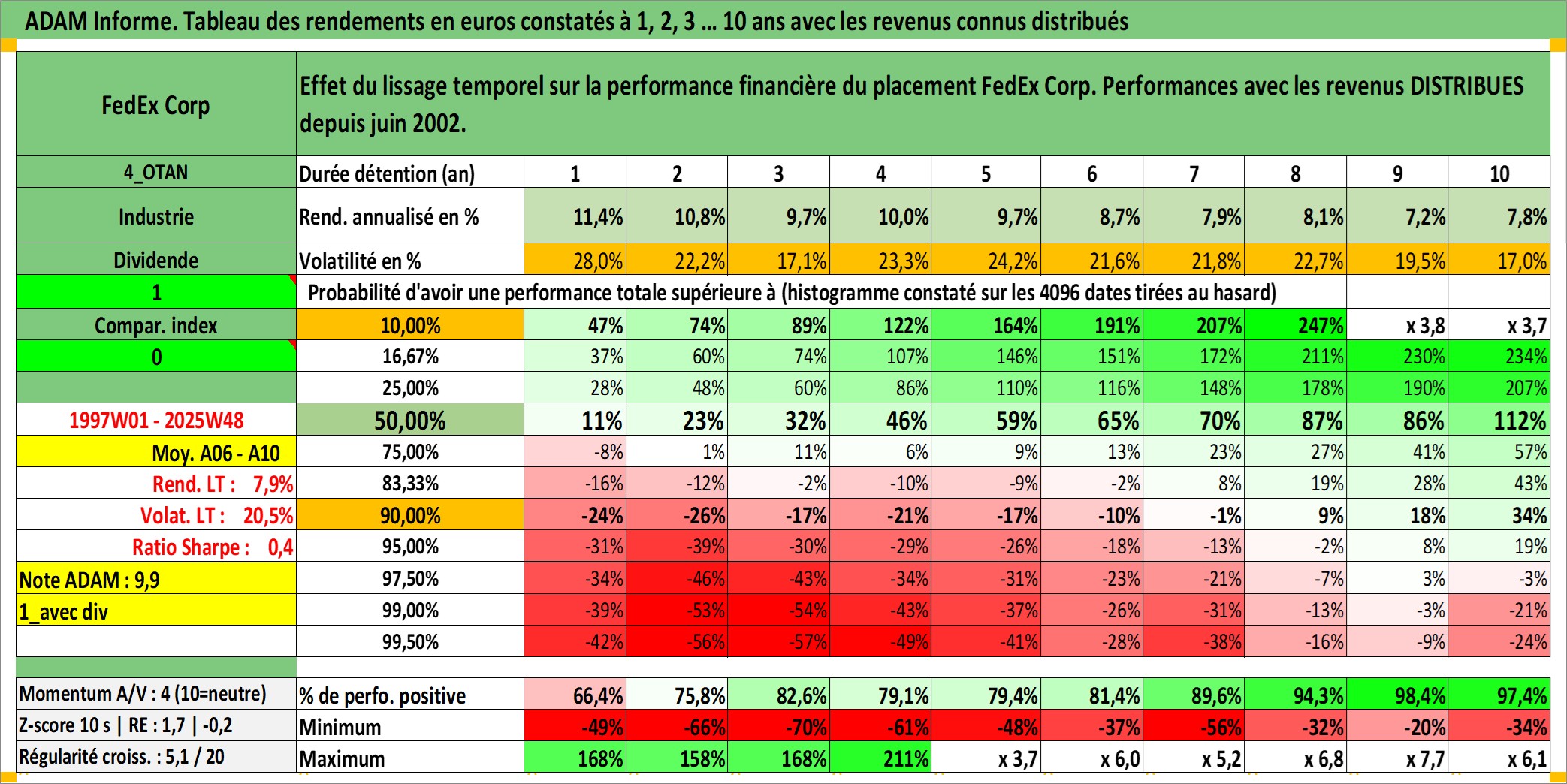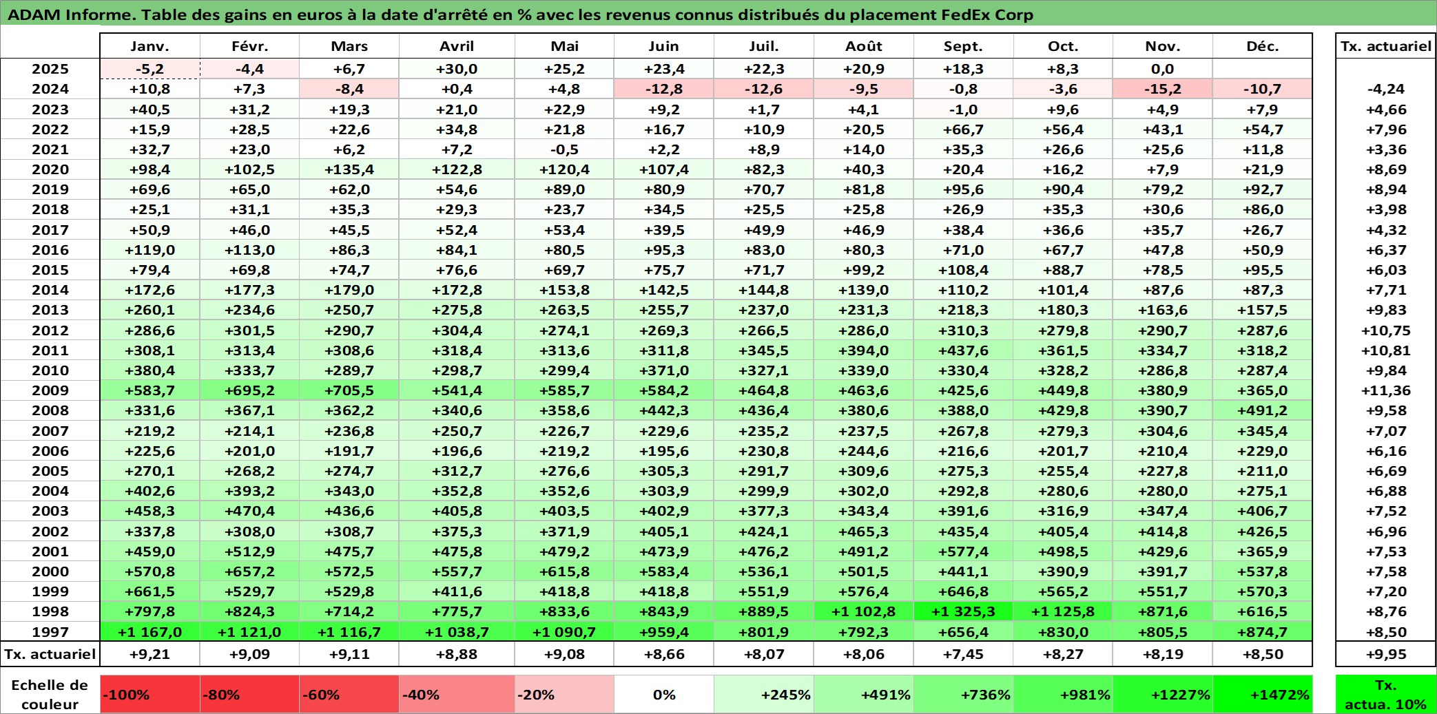 Site dédié aux investisseursPage dédiée sur site financeAnalyse des valorisations hebdomadaires de l'action FedEx Corp. Cet actif est cote en USD. Les valorisations sont en contrevaleur EURO et couvrent les semaines 1997W01 a 2025W48. Les revenus de cet actif financier sont pris en compte depuis la semaine 2002W24. La note globale ESG de cet actif est estimee a 10.0 (apres rebasage entre 0 et 20).