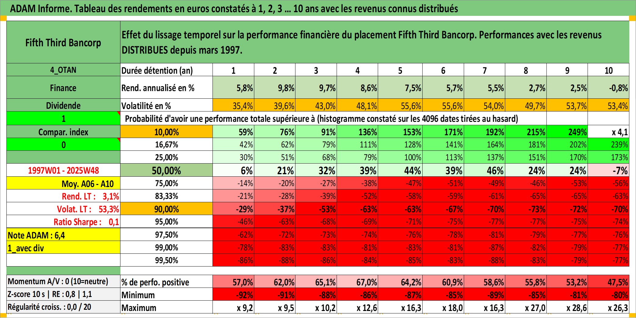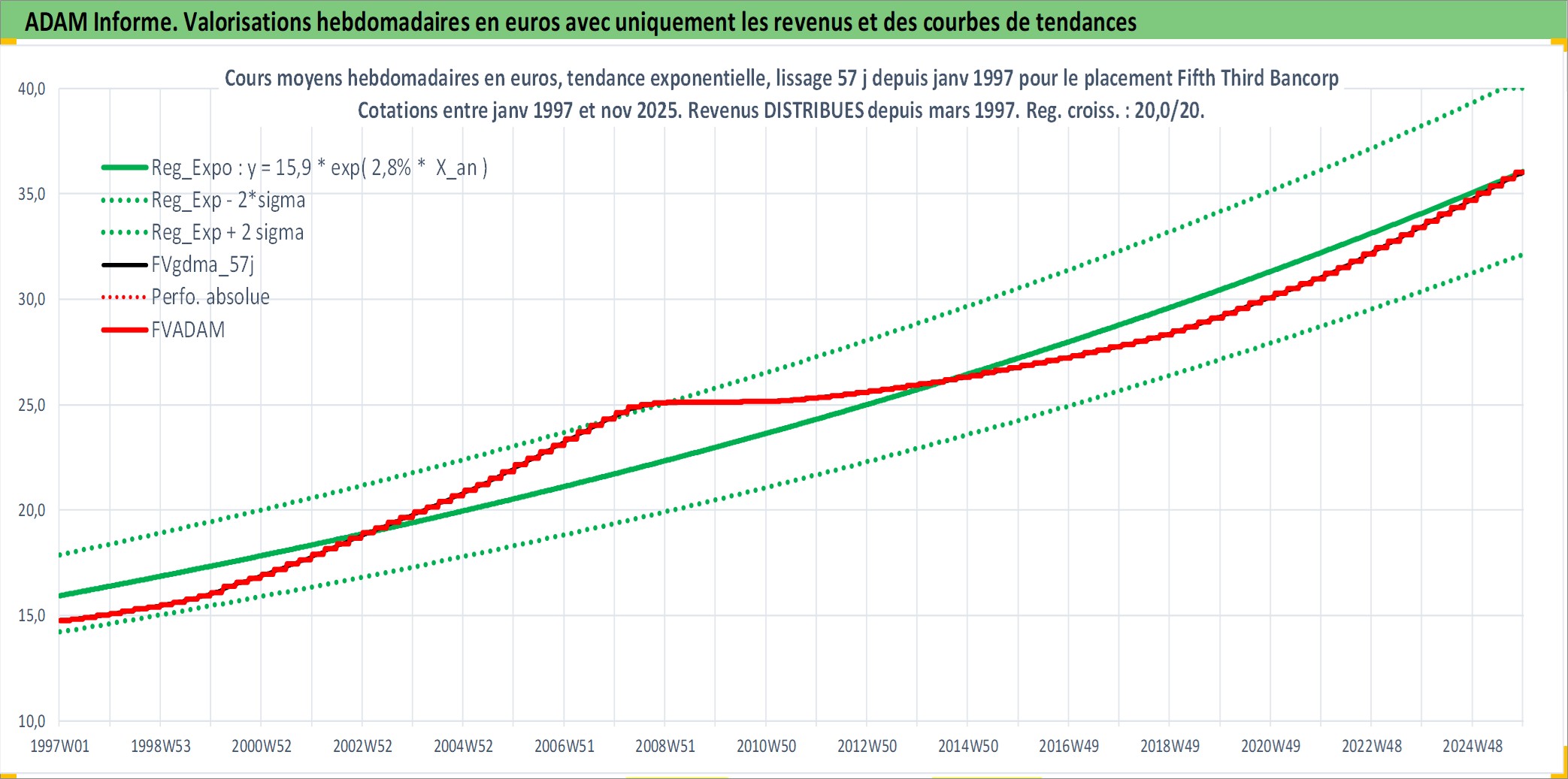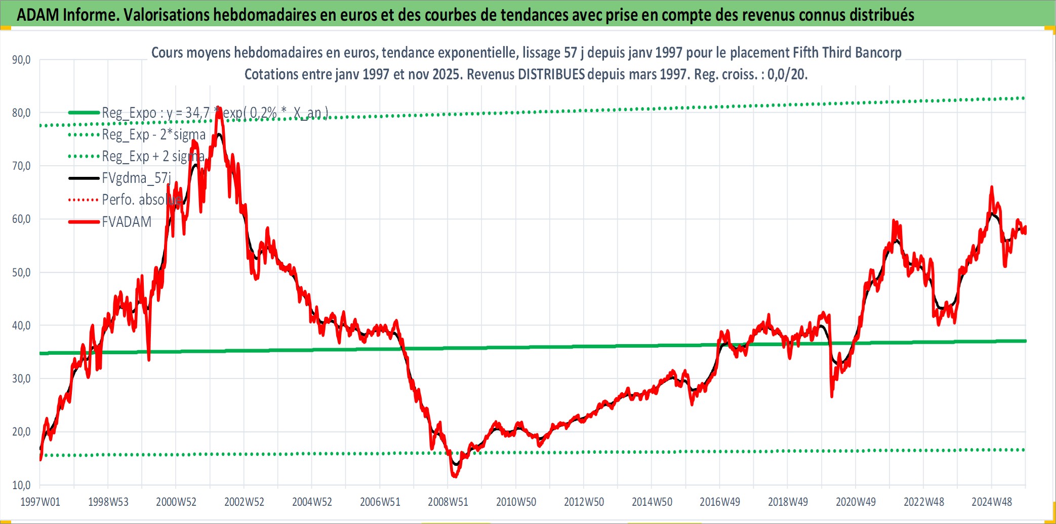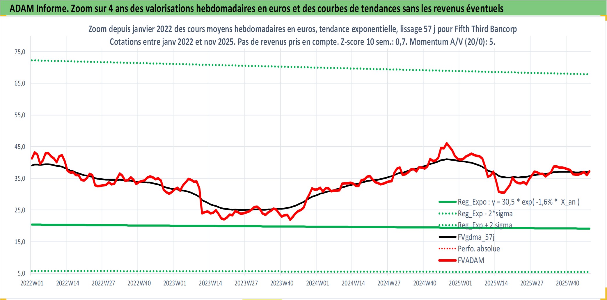 Site dédié aux investisseursPage dédiée sur site financeAnalyse des valorisations hebdomadaires de l'action Fifth Third Bancorp. Cet actif est cote en USD. Les valorisations sont en contrevaleur EURO et couvrent les semaines 1997W01 a 2025W48. Les revenus de cet actif financier sont pris en compte depuis la semaine 1997W13. La note globale ESG de cet actif est estimee a 12.0 (apres rebasage entre 0 et 20).