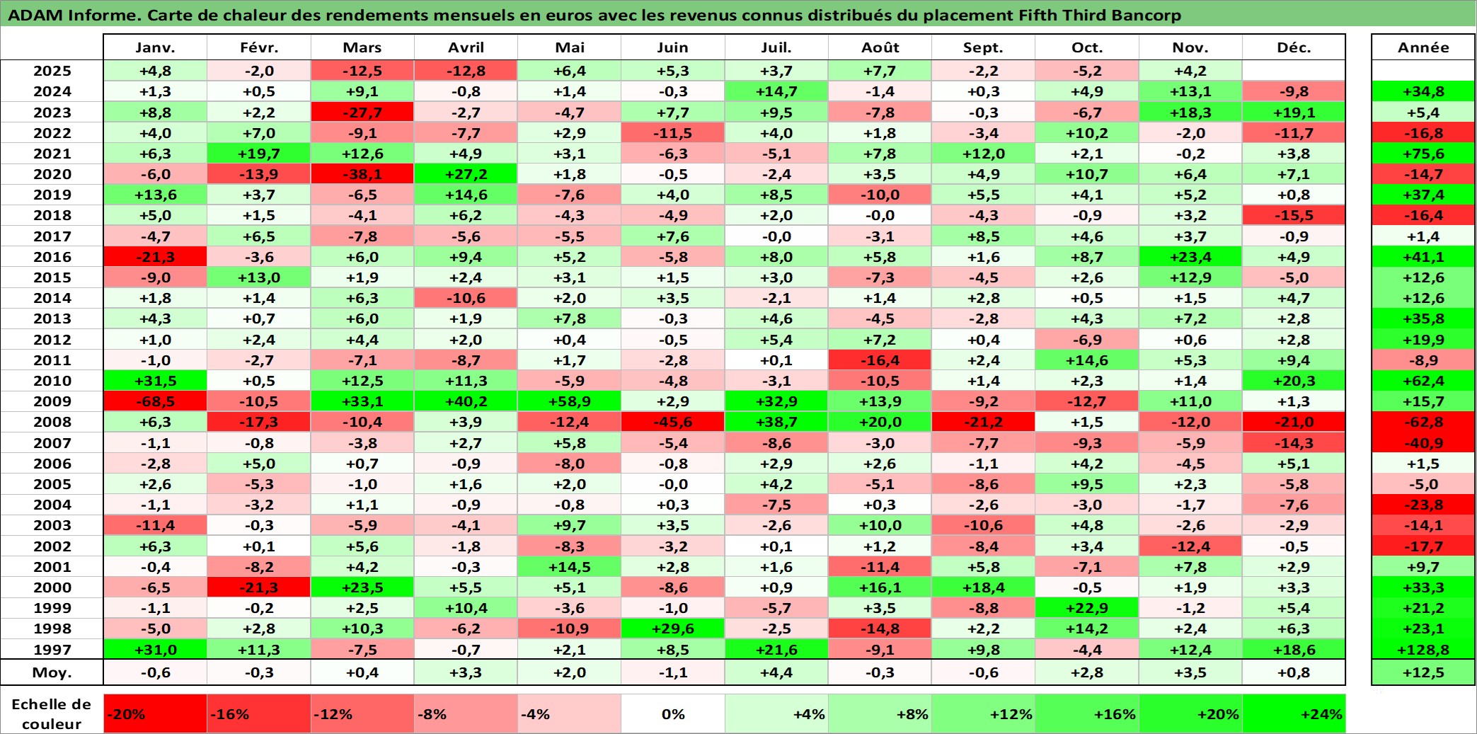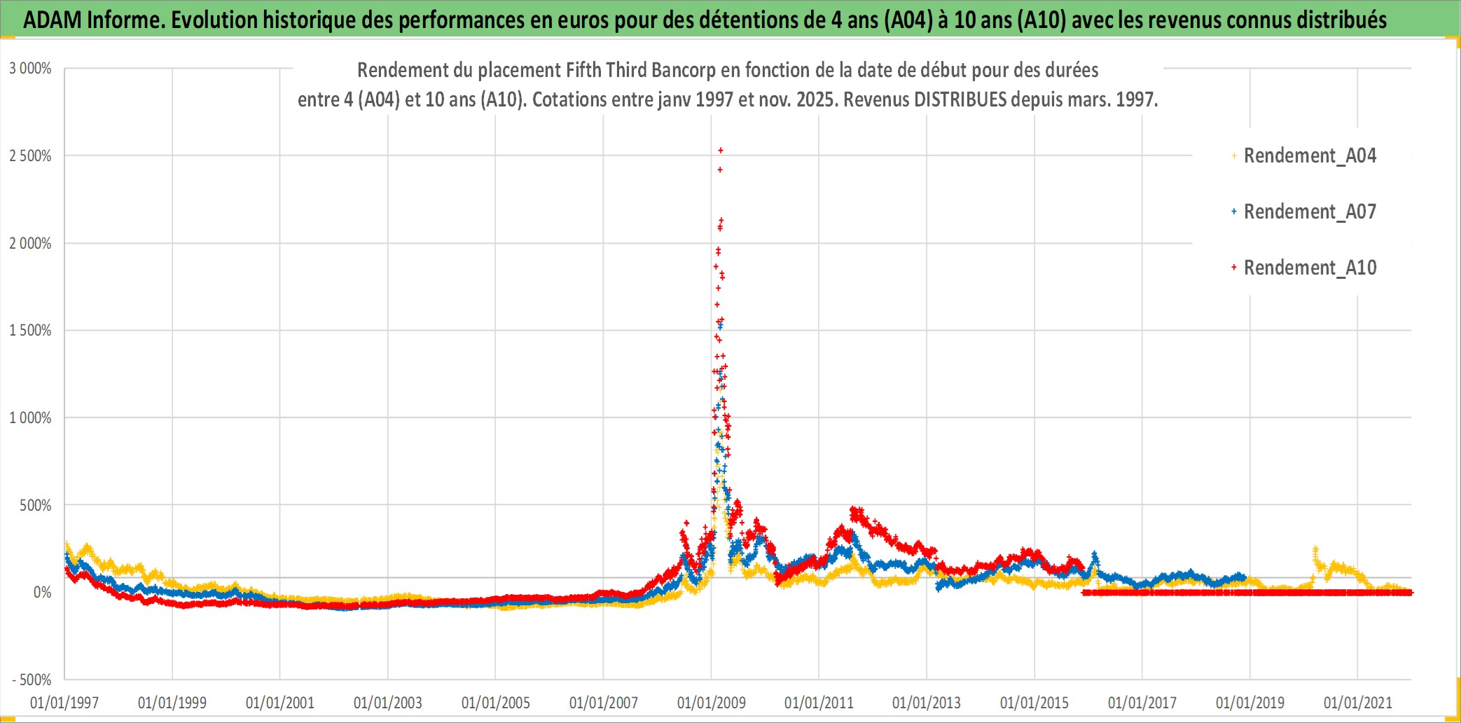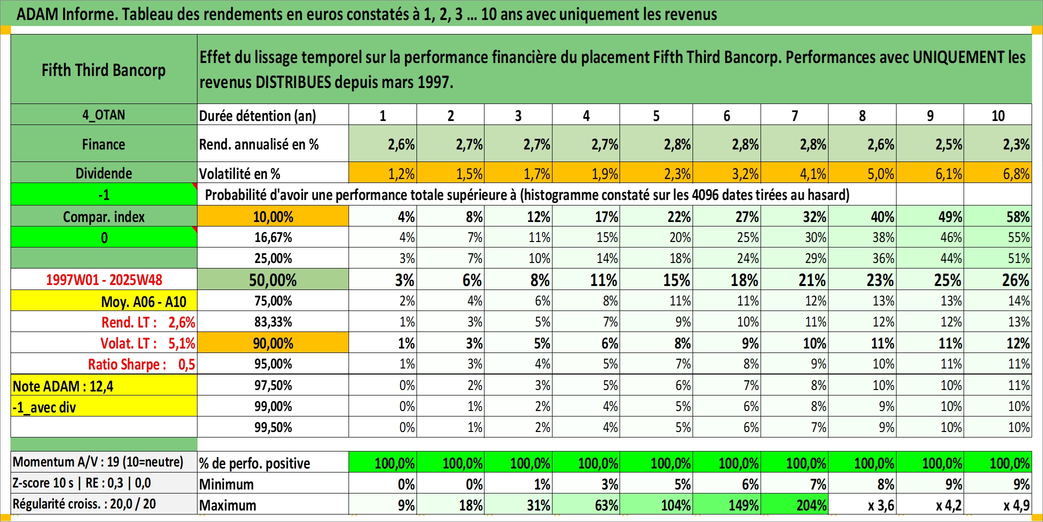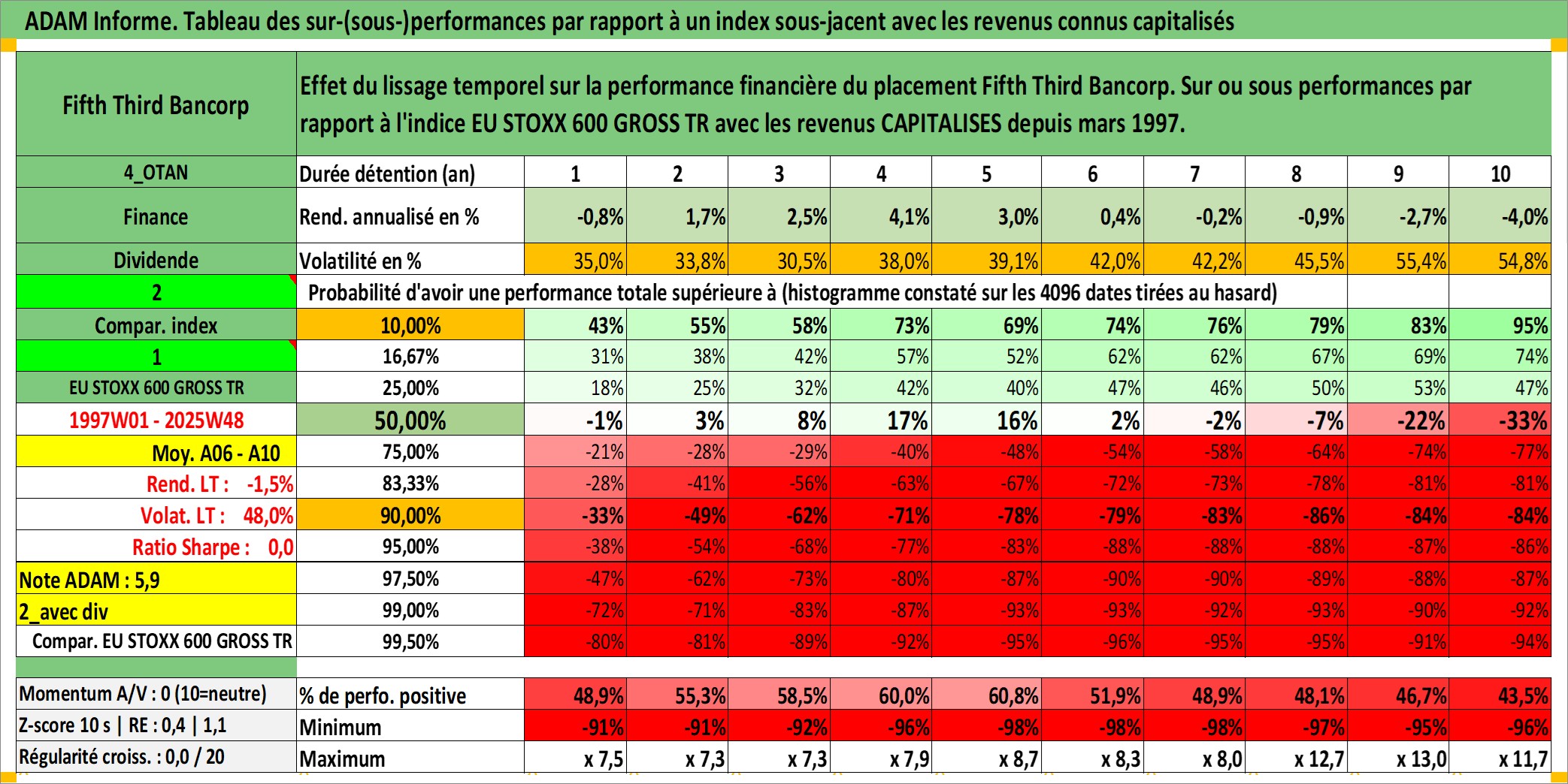 Site dédié aux investisseursPage dédiée sur site financeAnalyse des valorisations hebdomadaires de l'action Fifth Third Bancorp. Cet actif est cote en USD. Les valorisations sont en contrevaleur EURO et couvrent les semaines 1997W01 a 2025W48. Les revenus de cet actif financier sont pris en compte depuis la semaine 1997W13. La note globale ESG de cet actif est estimee a 12.0 (apres rebasage entre 0 et 20).