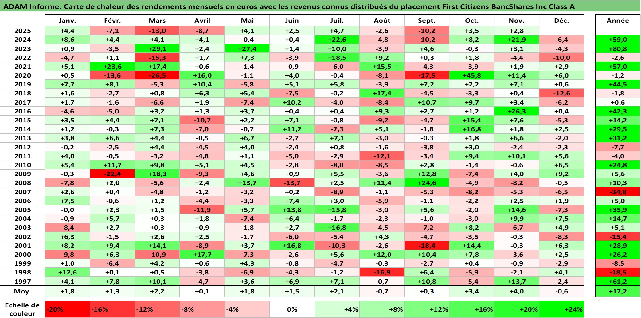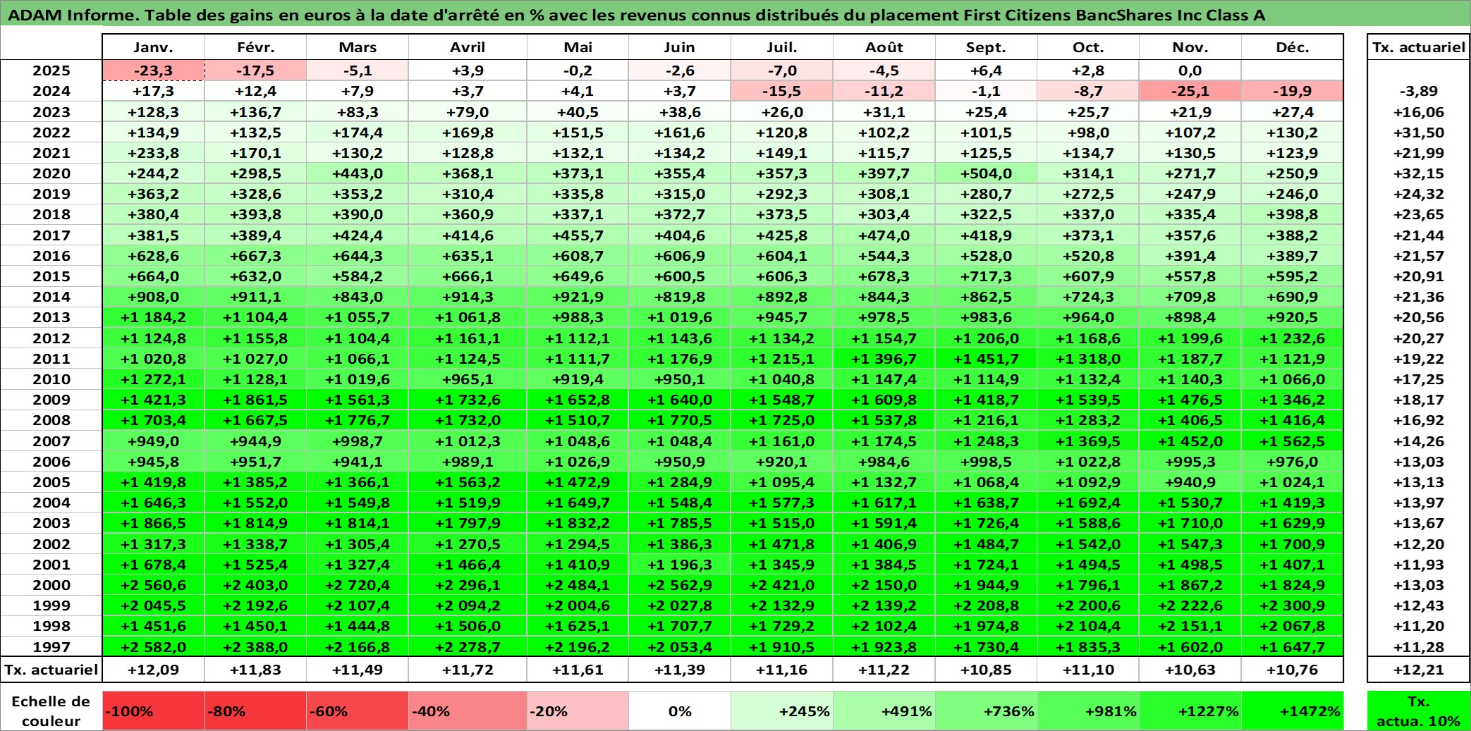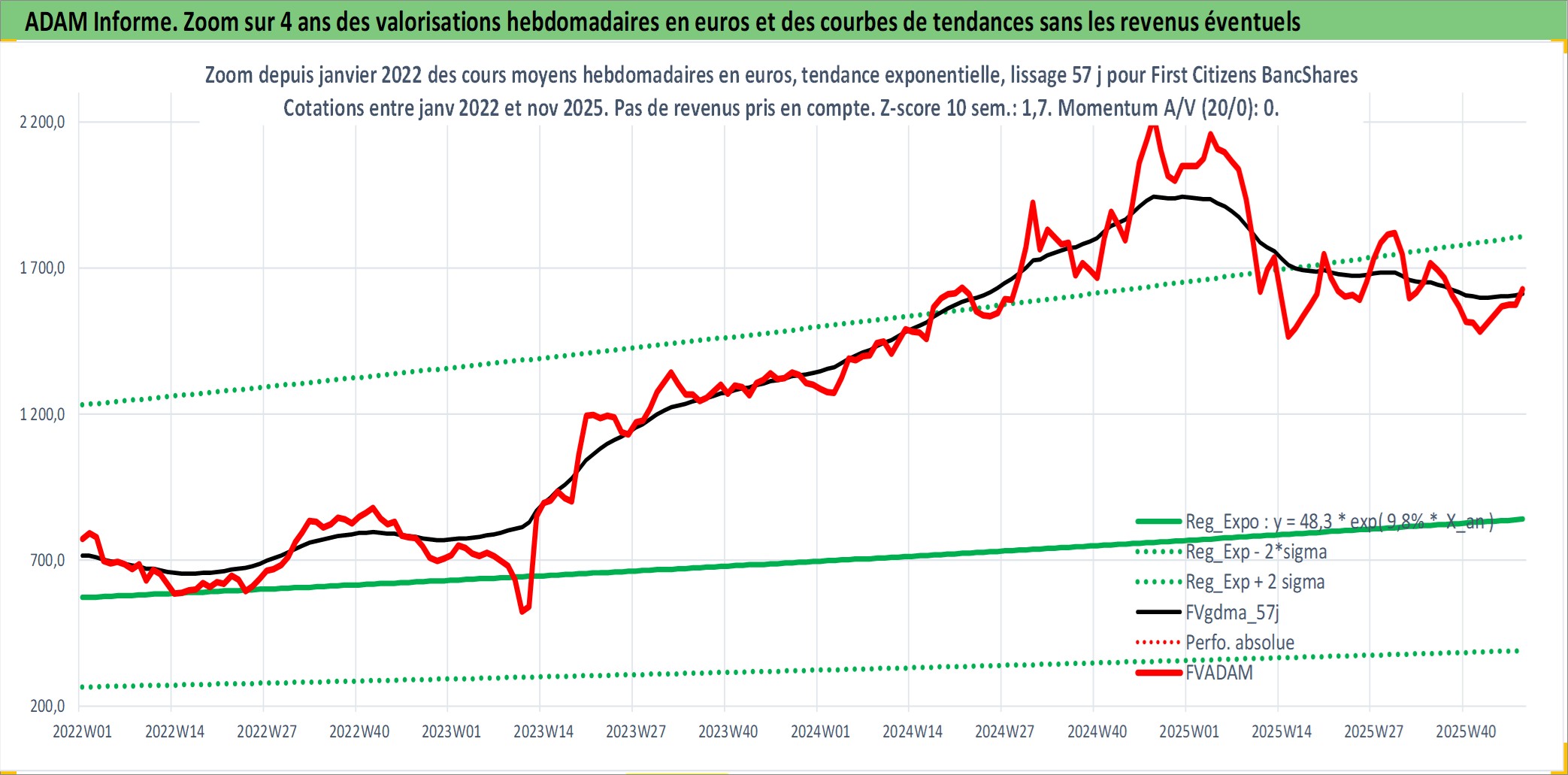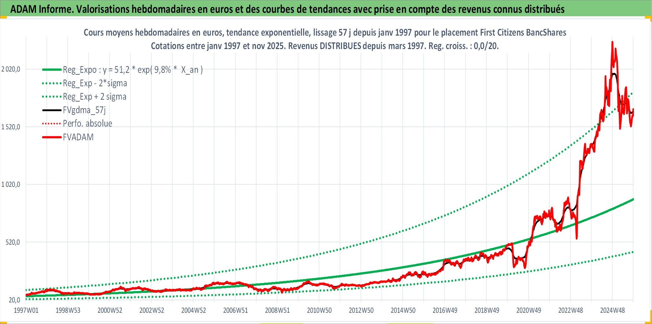 Site dédié aux investisseursPage dédiée sur site financeAnalyse des valorisations hebdomadaires de l'action First Citizens BancShares Inc Class A. Cet actif est cote en USD. Les valorisations sont en contrevaleur EURO et couvrent les semaines 1997W01 a 2025W48. Les revenus de cet actif financier sont pris en compte depuis la semaine 1997W11. La note ESG de cet actif n'est pas connue.