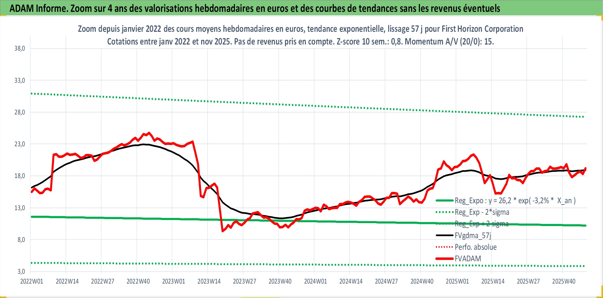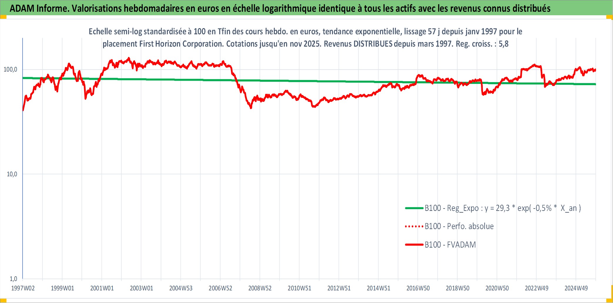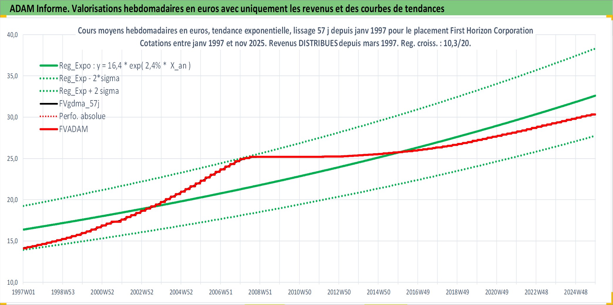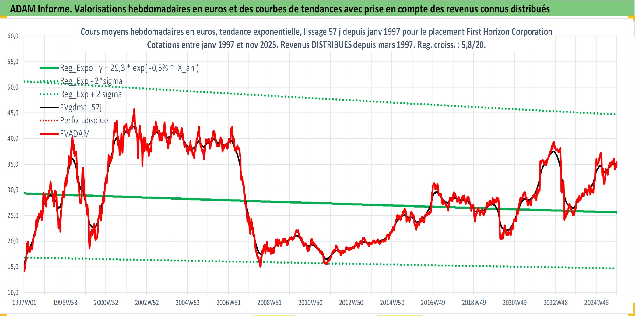 Site dédié aux investisseursPage dédiée sur site financeAnalyse des valorisations hebdomadaires de l'action First Horizon Corporation. Cet actif est cote en USD. Les valorisations sont en contrevaleur EURO et couvrent les semaines 1997W01 a 2025W48. Les revenus de cet actif financier sont pris en compte depuis la semaine 1997W11. La note ESG de cet actif n'est pas connue.