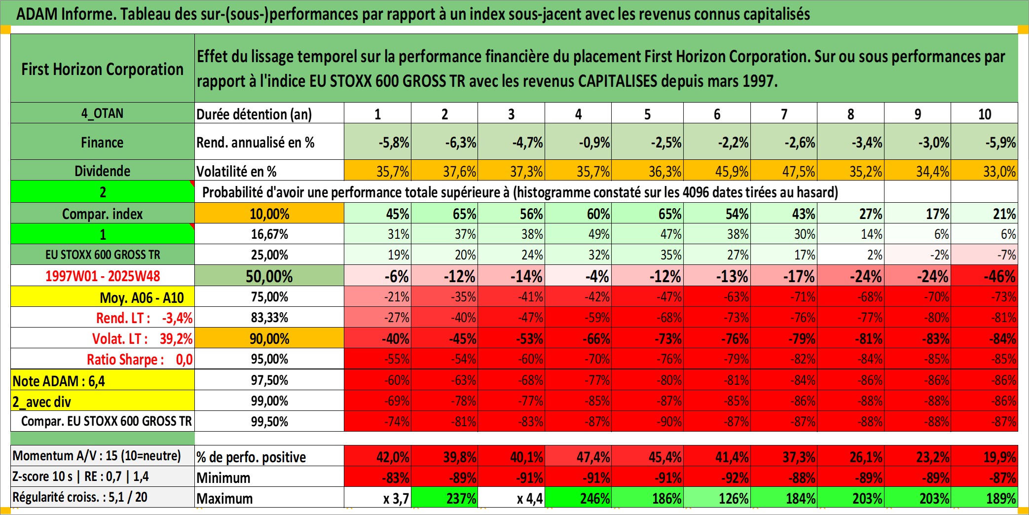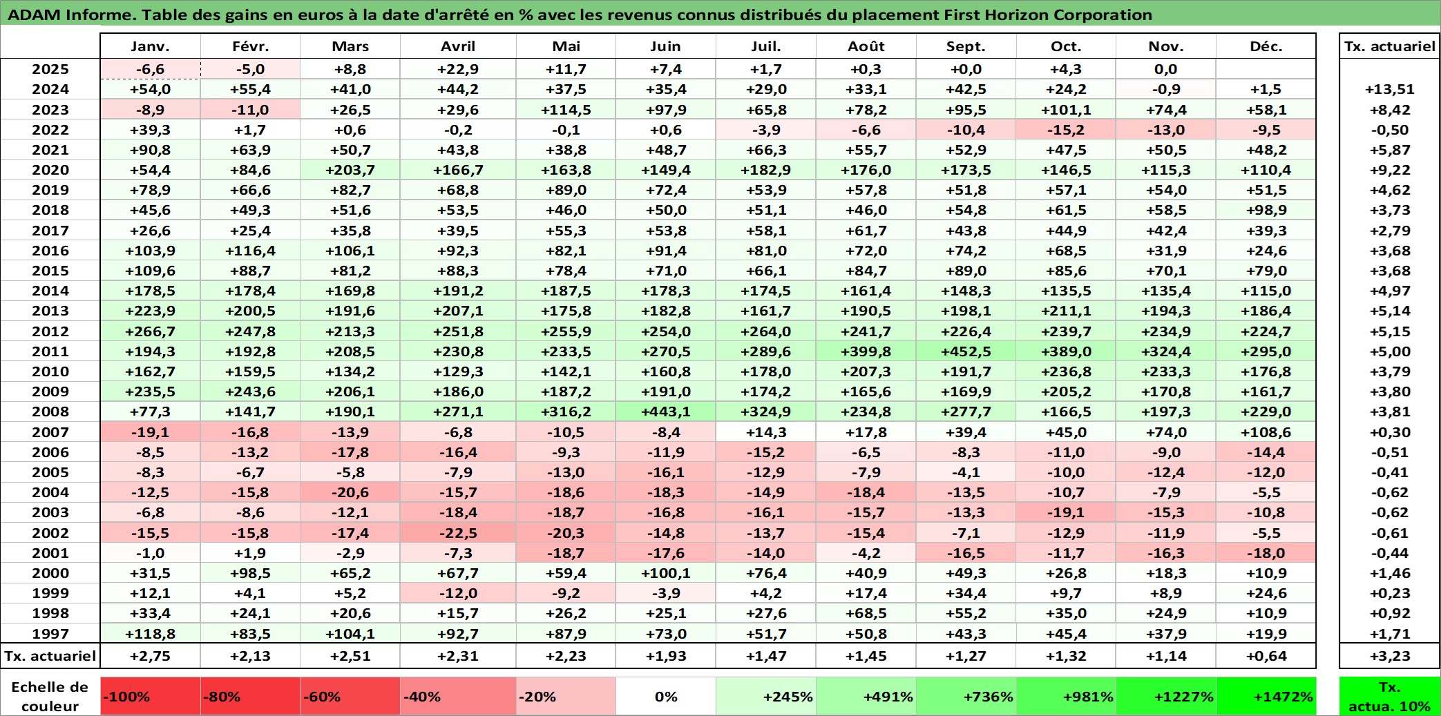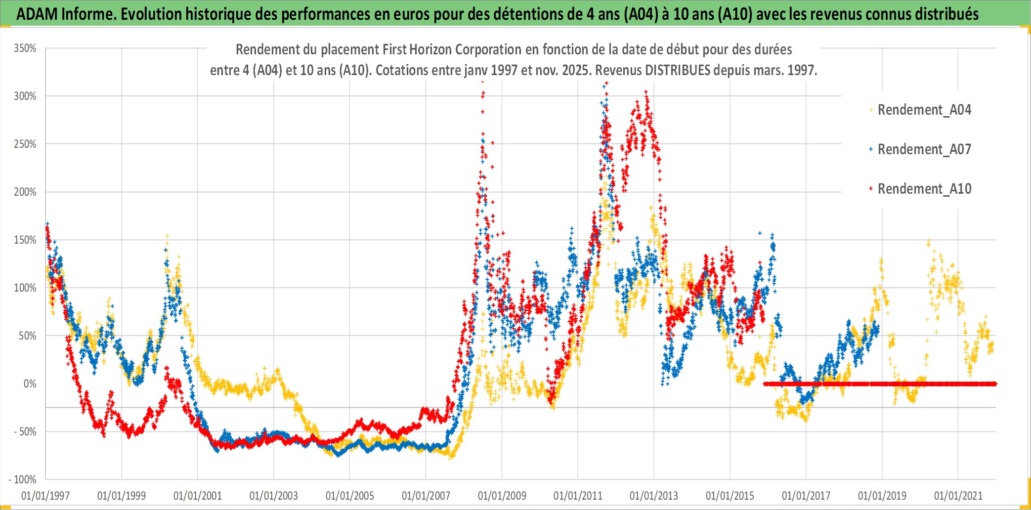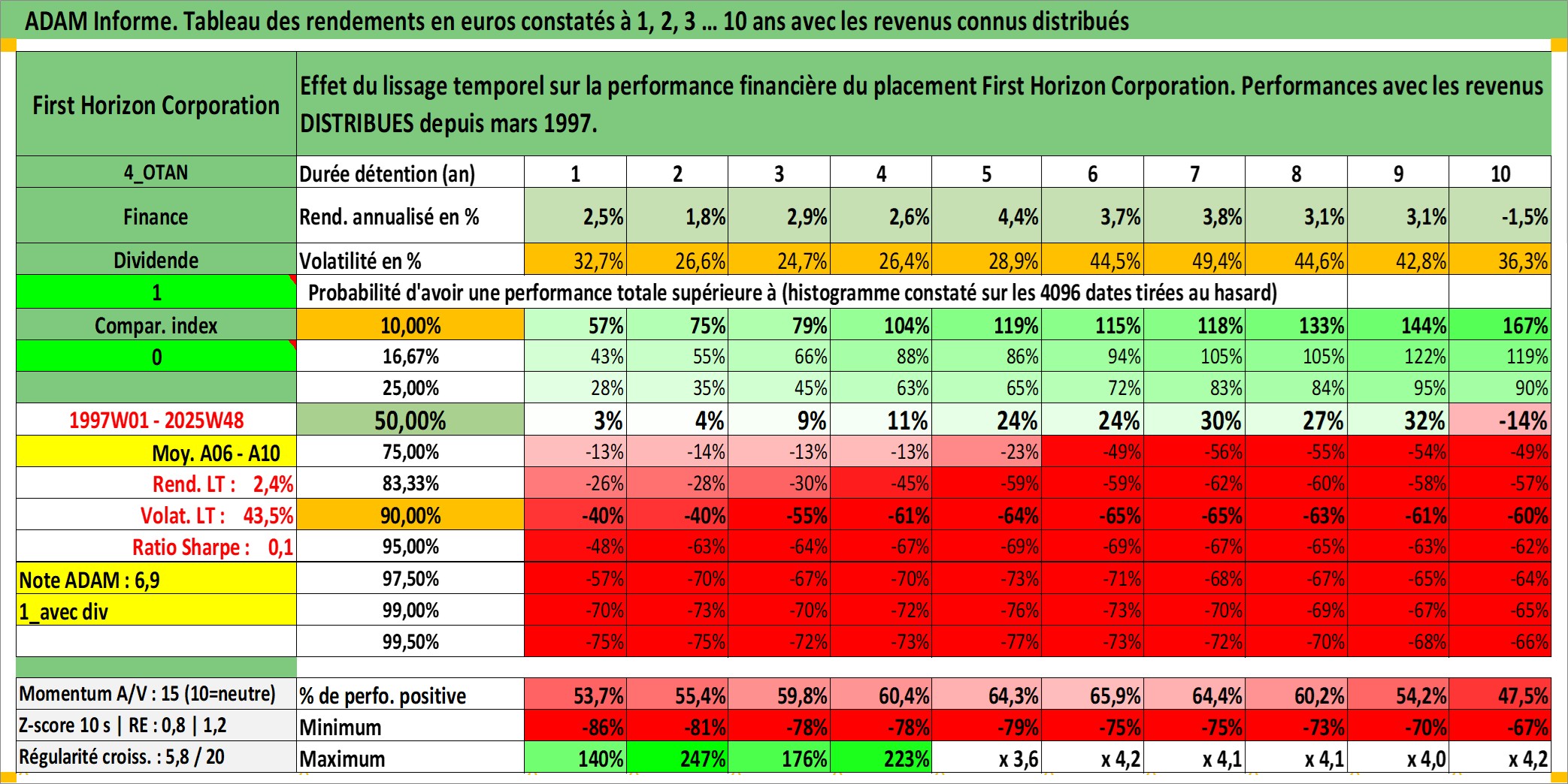 Site dédié aux investisseursPage dédiée sur site financeAnalyse des valorisations hebdomadaires de l'action First Horizon Corporation. Cet actif est cote en USD. Les valorisations sont en contrevaleur EURO et couvrent les semaines 1997W01 a 2025W48. Les revenus de cet actif financier sont pris en compte depuis la semaine 1997W11. La note ESG de cet actif n'est pas connue.
