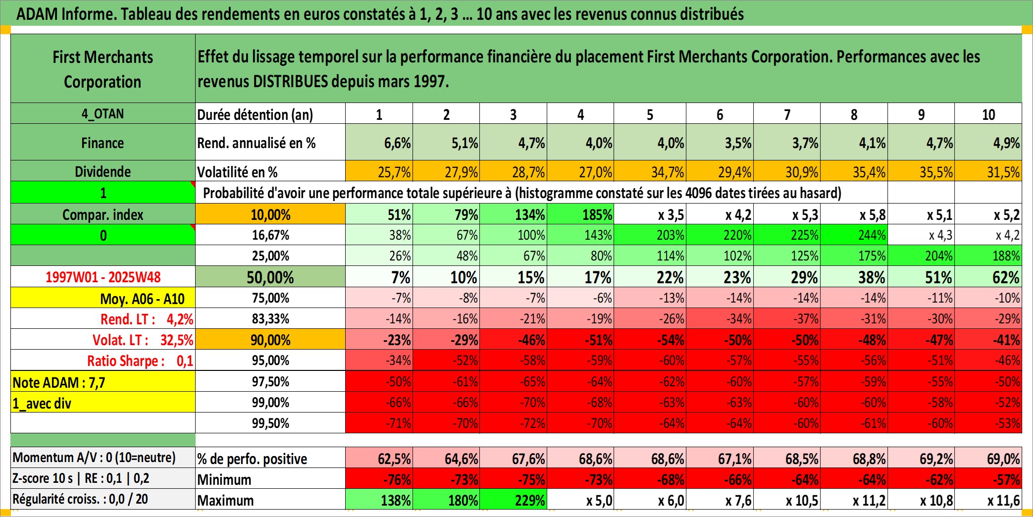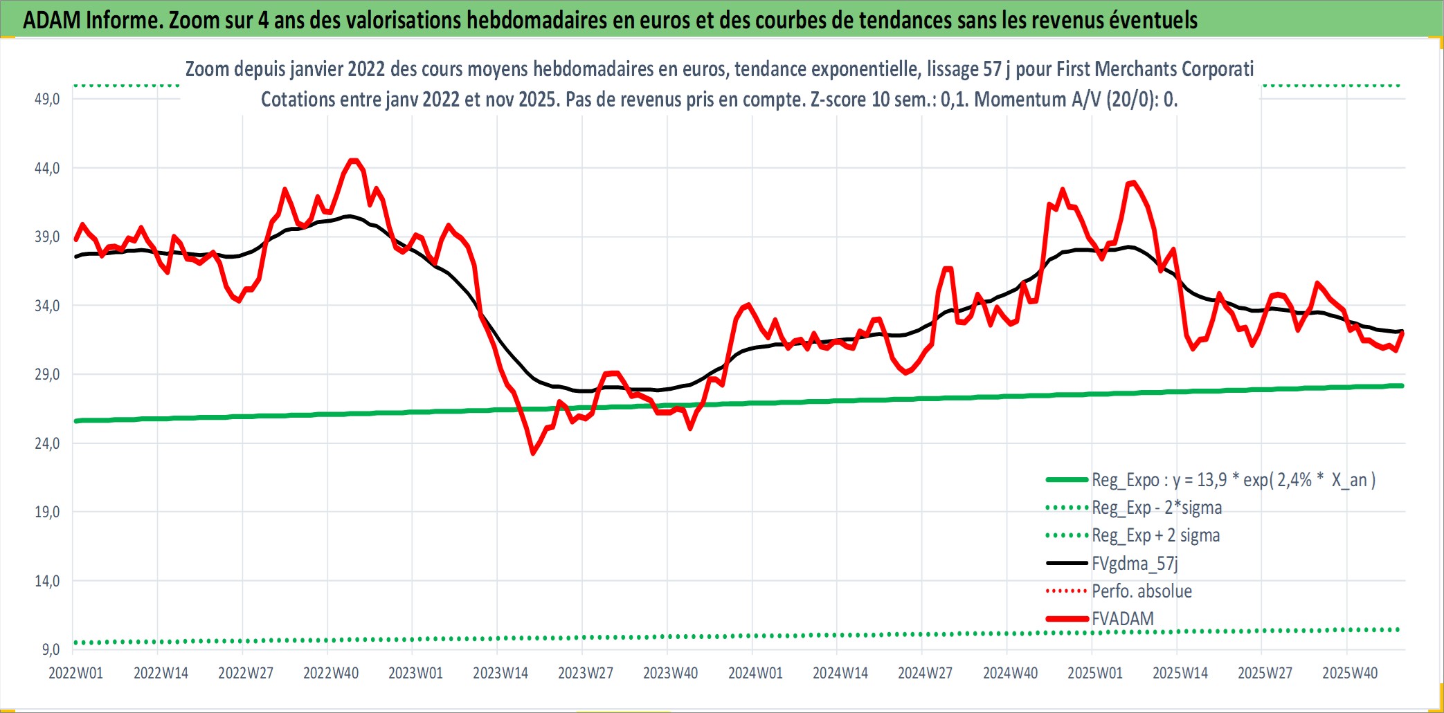 Site dédié aux investisseursPage dédiée sur site financeAnalyse des valorisations hebdomadaires de l'action First Merchants Corporation. Cet actif est cote en USD. Les valorisations sont en contrevaleur EURO et couvrent les semaines 1997W01 a 2025W48. Les revenus de cet actif financier sont pris en compte depuis la semaine 1997W10. La note ESG de cet actif n'est pas connue.