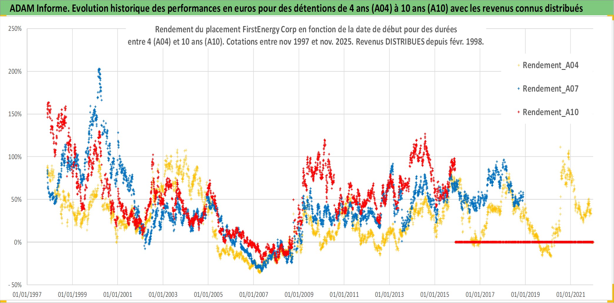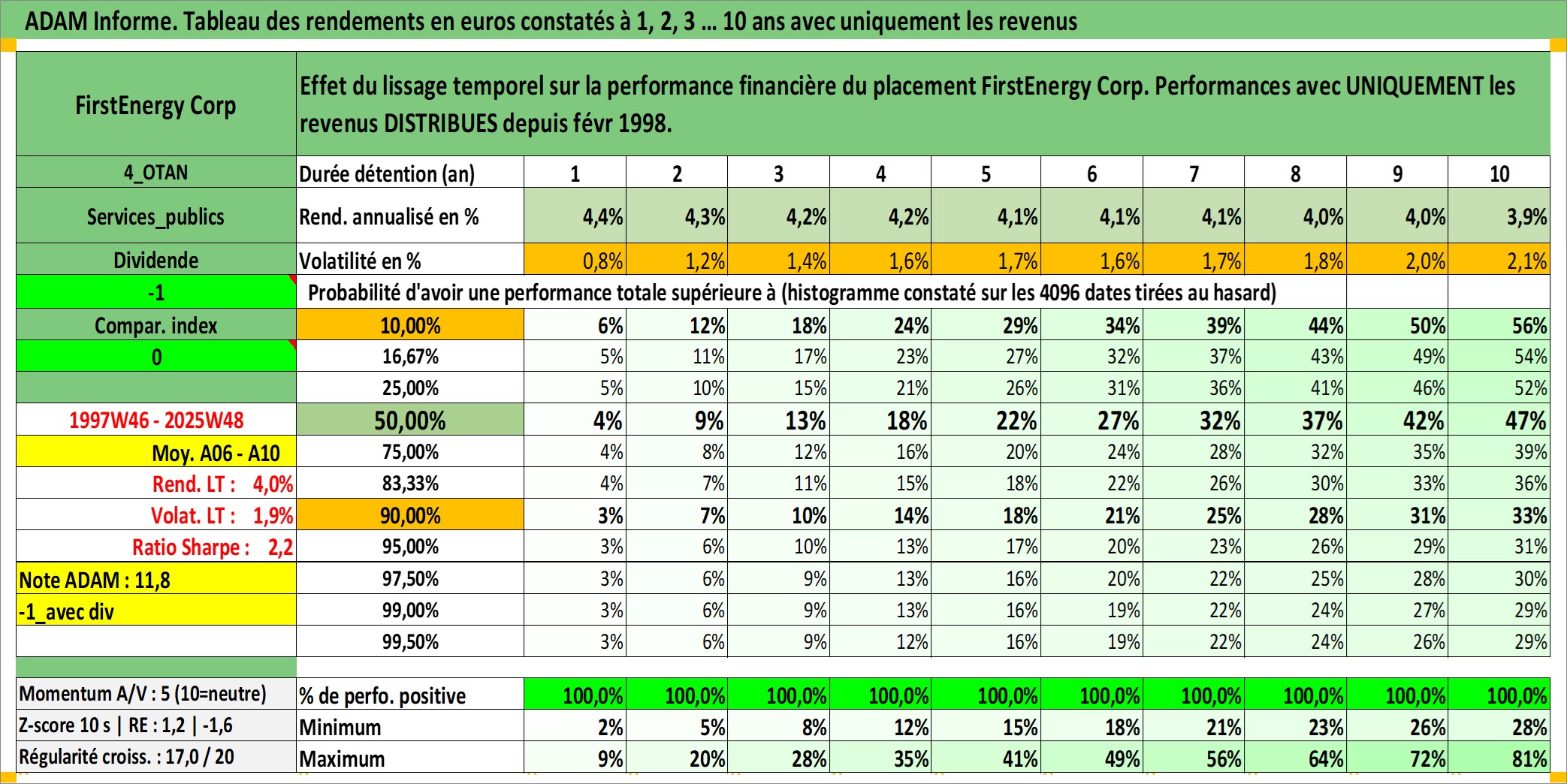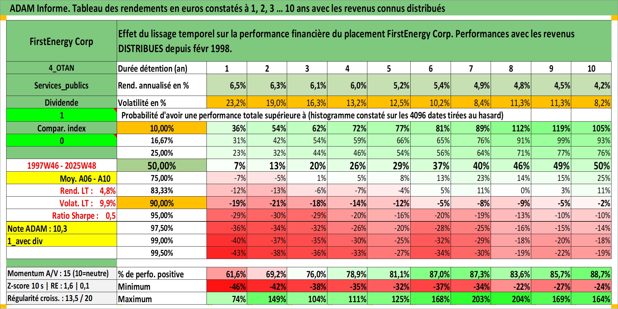 Site dédié aux investisseursPage dédiée sur site financeAnalyse des valorisations hebdomadaires de l'action FirstEnergy Corp. Cet actif est cote en USD. Les valorisations sont en contrevaleur EURO et couvrent les semaines 1997W46 a 2025W48. Les revenus de cet actif financier sont pris en compte depuis la semaine 1998W06. La note globale ESG de cet actif est estimee a 5.0 (apres rebasage entre 0 et 20).
