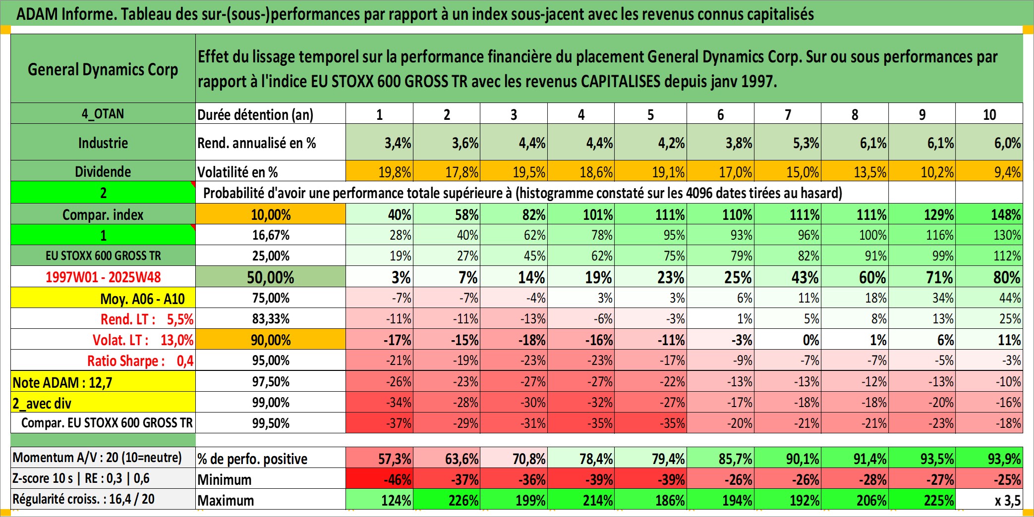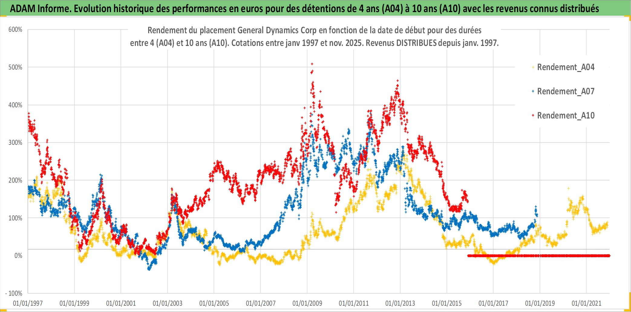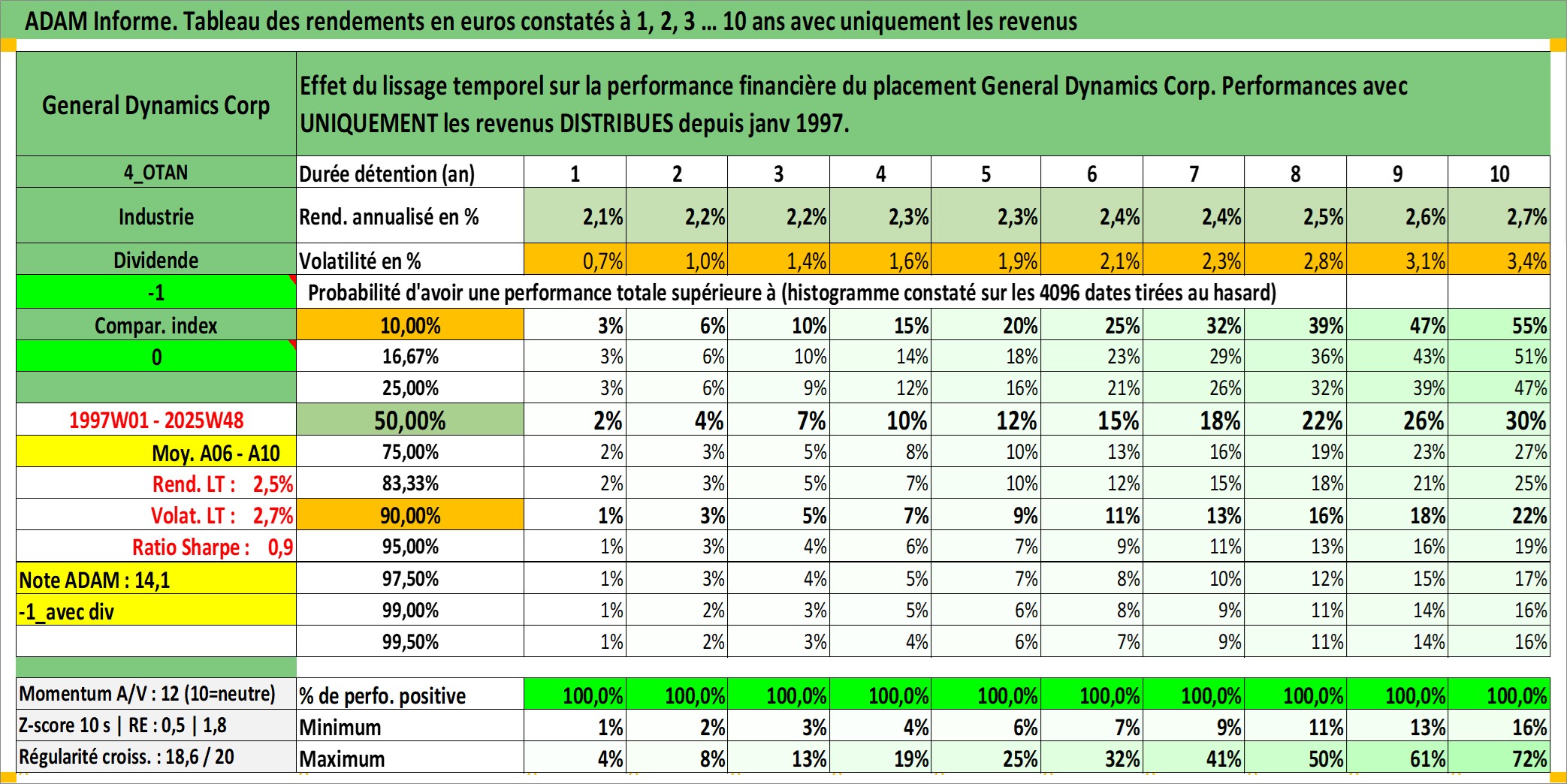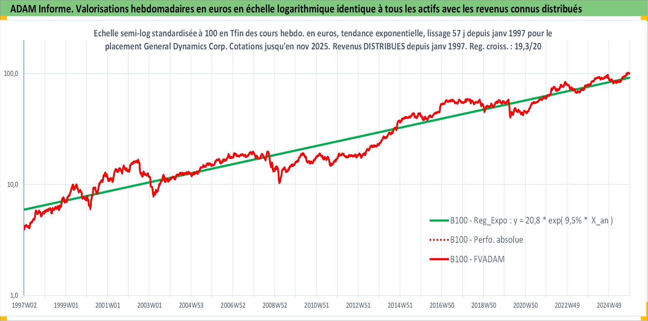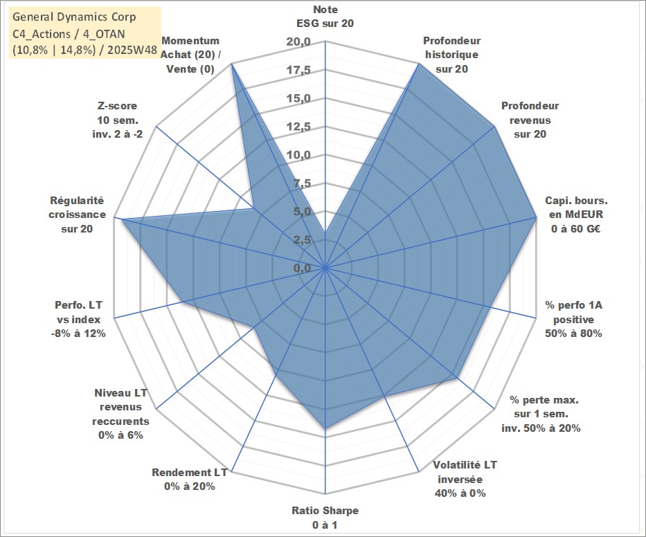 Site dédié aux investisseursPage dédiée sur site financeAnalyse des valorisations hebdomadaires de l'action General Dynamics Corp. Cet actif est cote en USD. Les valorisations sont en contrevaleur EURO et couvrent les semaines 1997W01 a 2025W48. Les revenus de cet actif financier sont pris en compte depuis la semaine 1997W04. La note globale ESG de cet actif est estimee a 3.0 (apres rebasage entre 0 et 20).