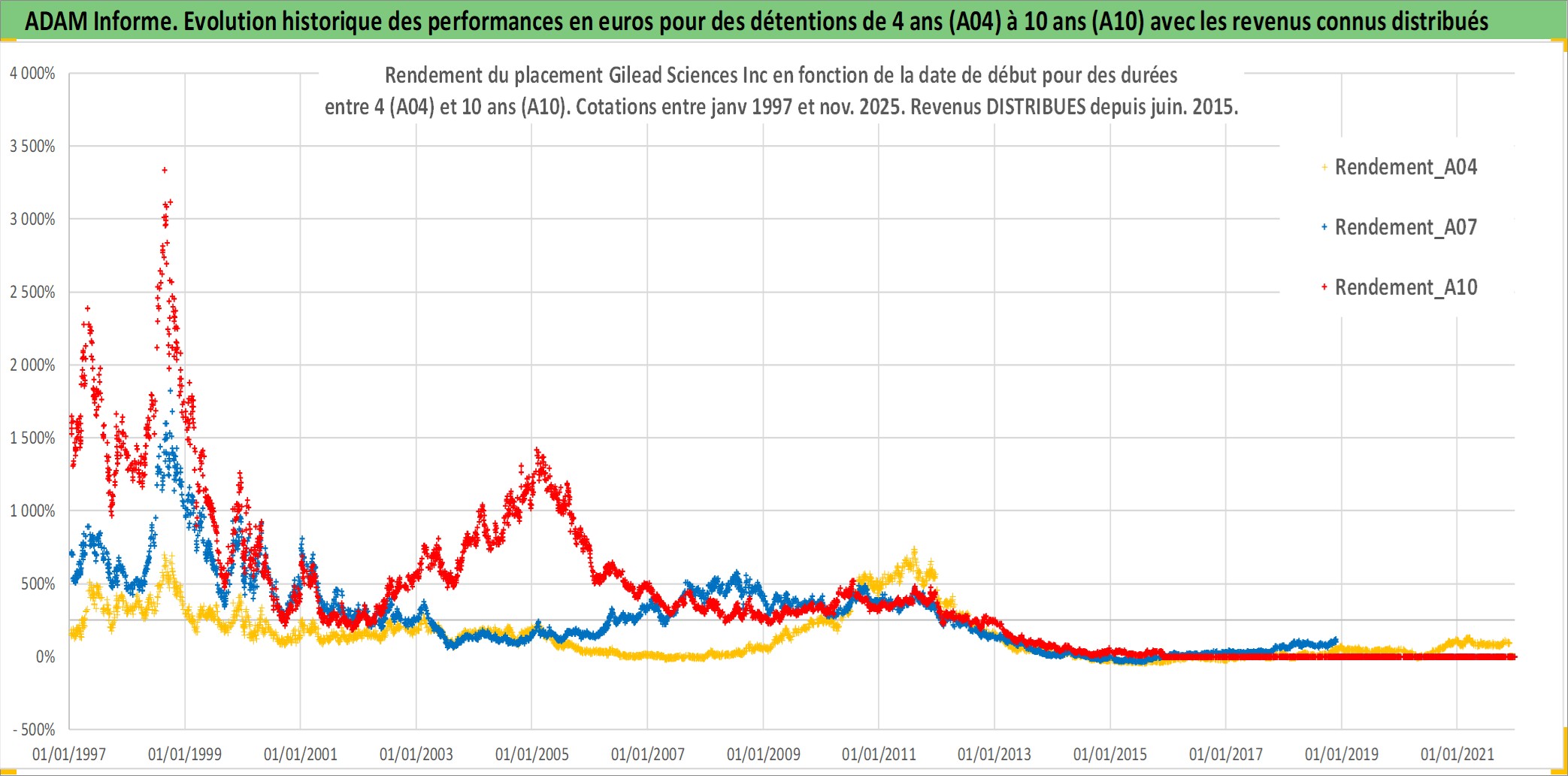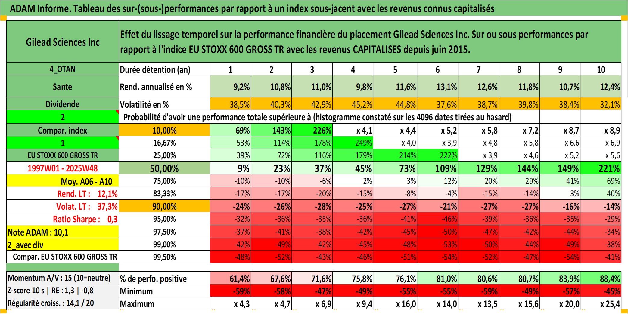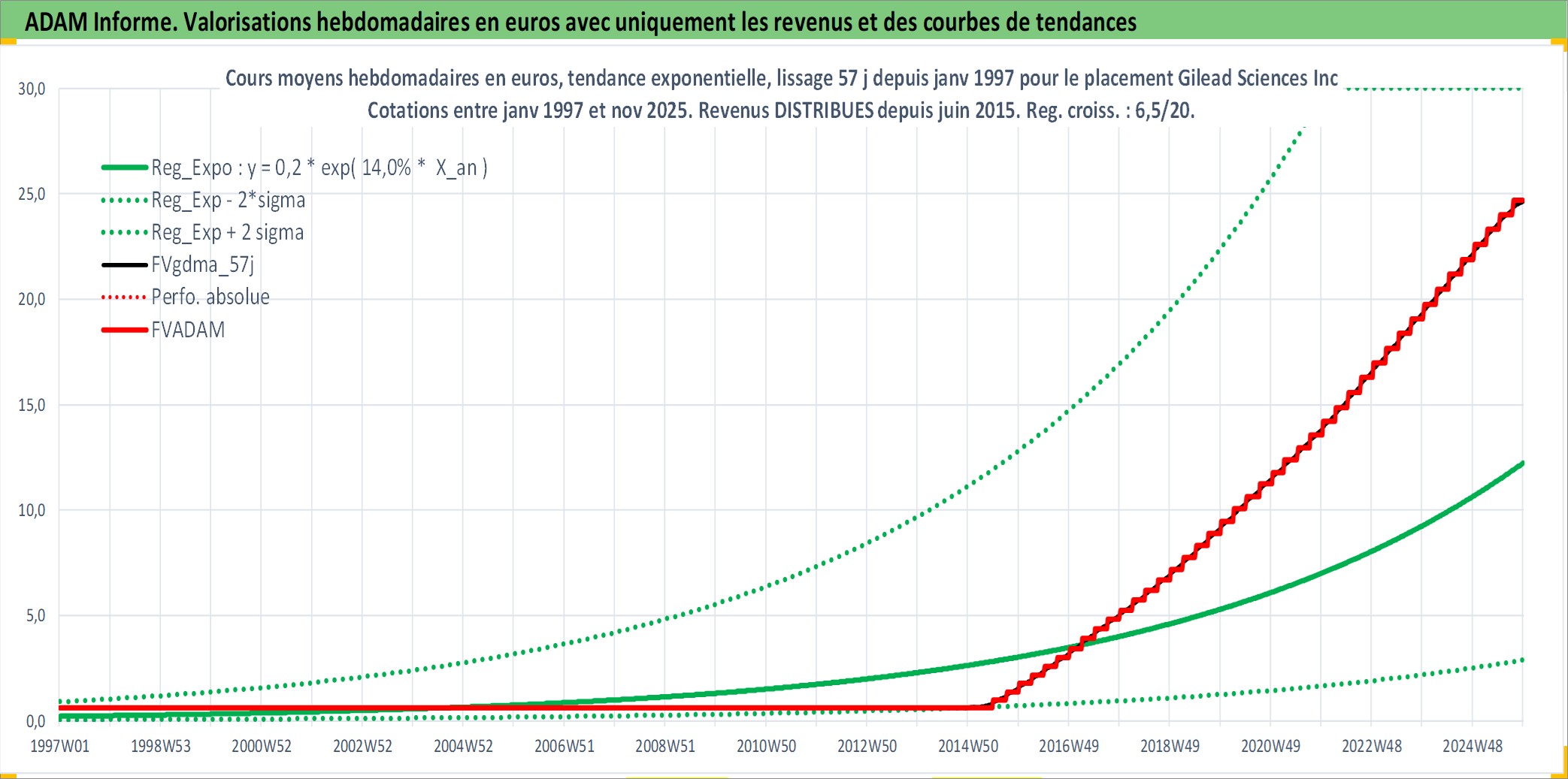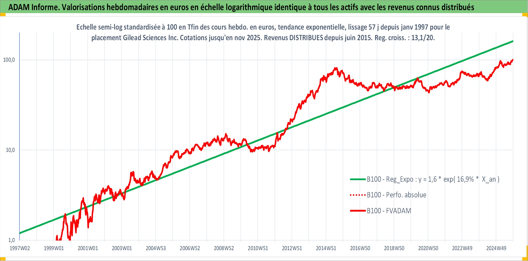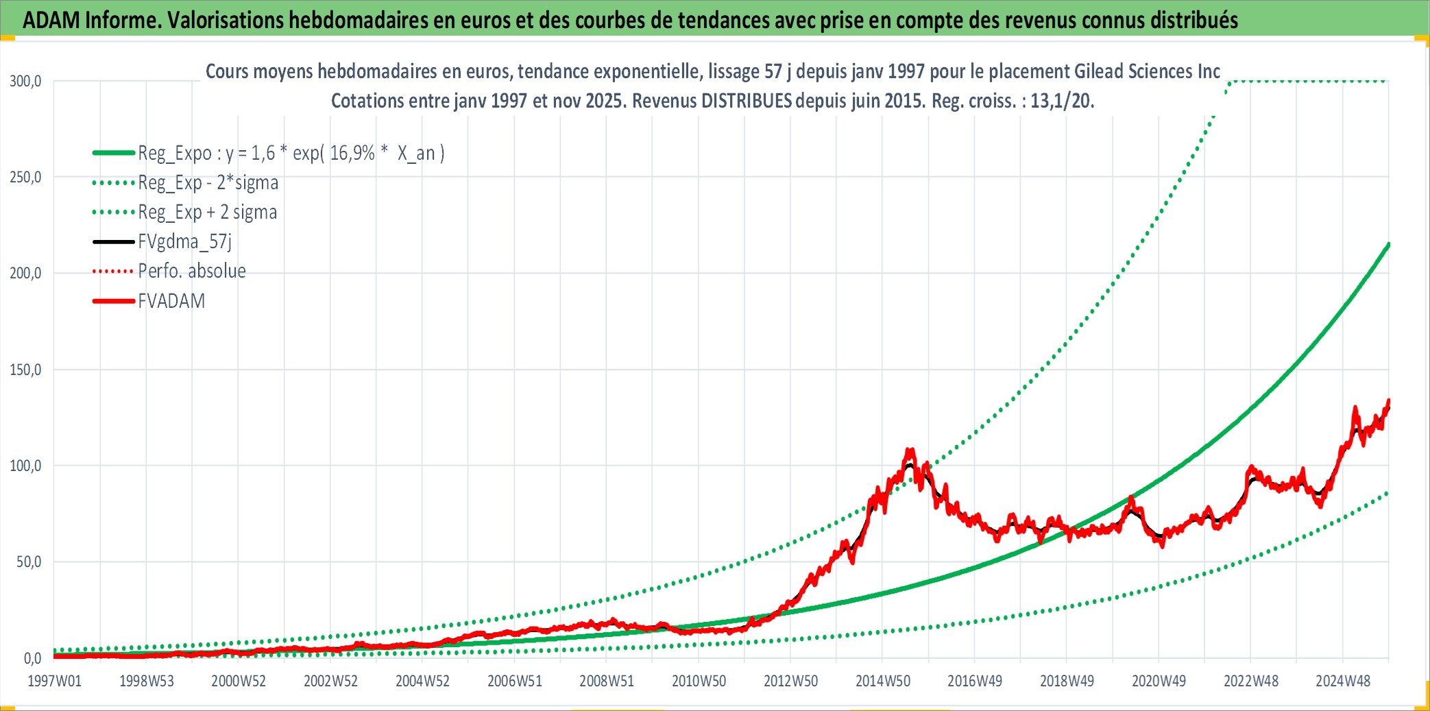 Site dédié aux investisseursPage dédiée sur site financeAnalyse des valorisations hebdomadaires de l'action Gilead Sciences Inc. Cet actif est cote en USD. Les valorisations sont en contrevaleur EURO et couvrent les semaines 1997W01 a 2025W48. Les revenus de cet actif financier sont pris en compte depuis la semaine 2015W24. La note globale ESG de cet actif est estimee a 9.0 (apres rebasage entre 0 et 20).