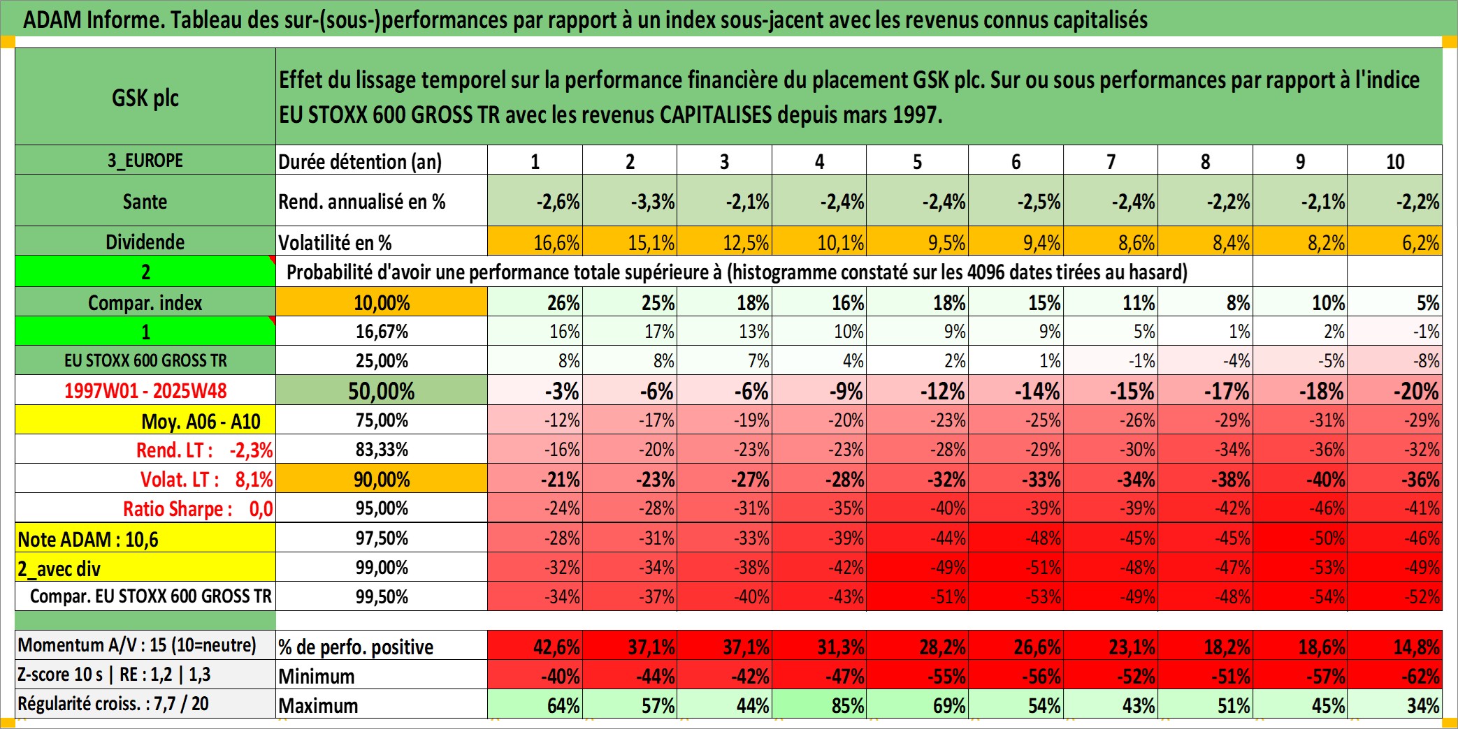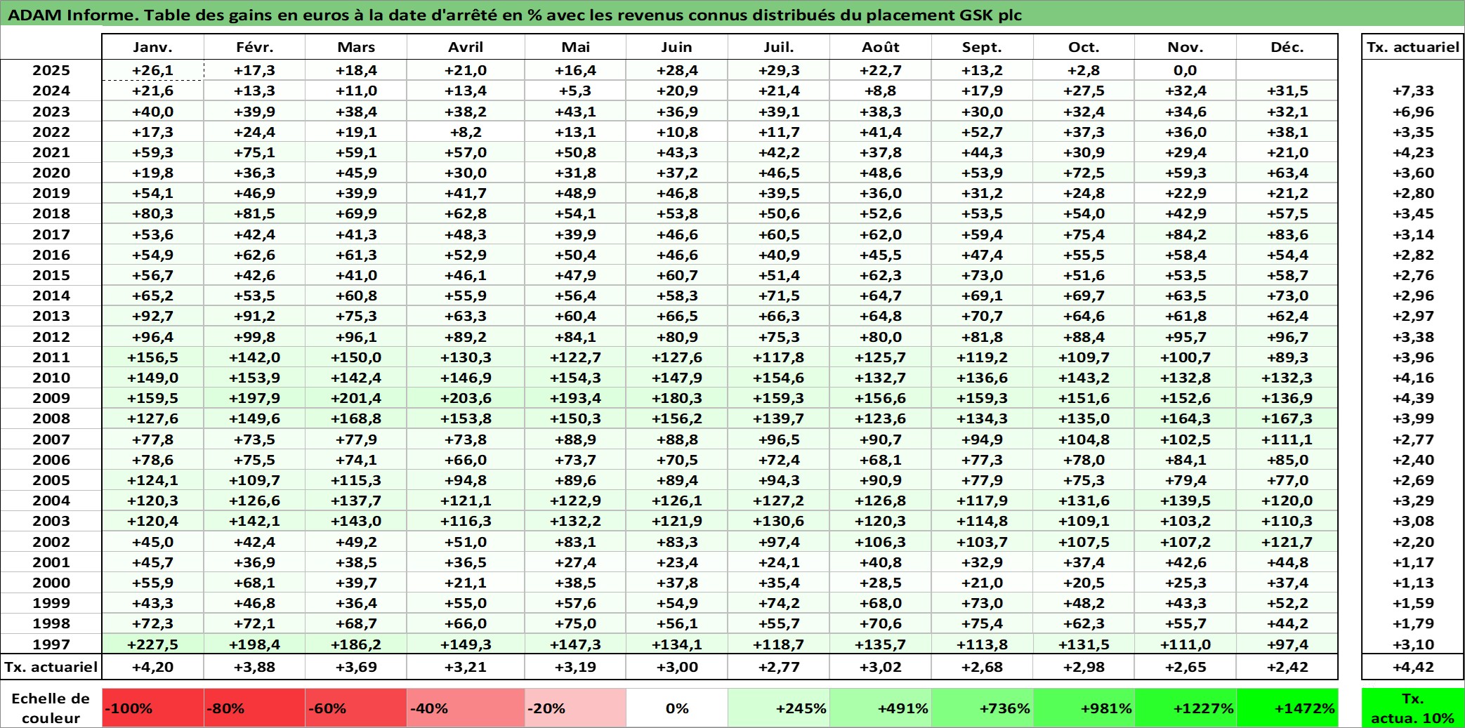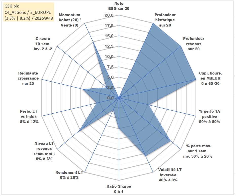 Site dédié aux investisseursPage dédiée sur site financeAnalyse des valorisations hebdomadaires de l'action GSK plc. Cet actif est cote en USD. Les valorisations sont en contrevaleur EURO et couvrent les semaines 1997W01 a 2025W48. Les revenus de cet actif financier sont pris en compte depuis la semaine 1997W12. La note ESG de cet actif n'est pas connue.