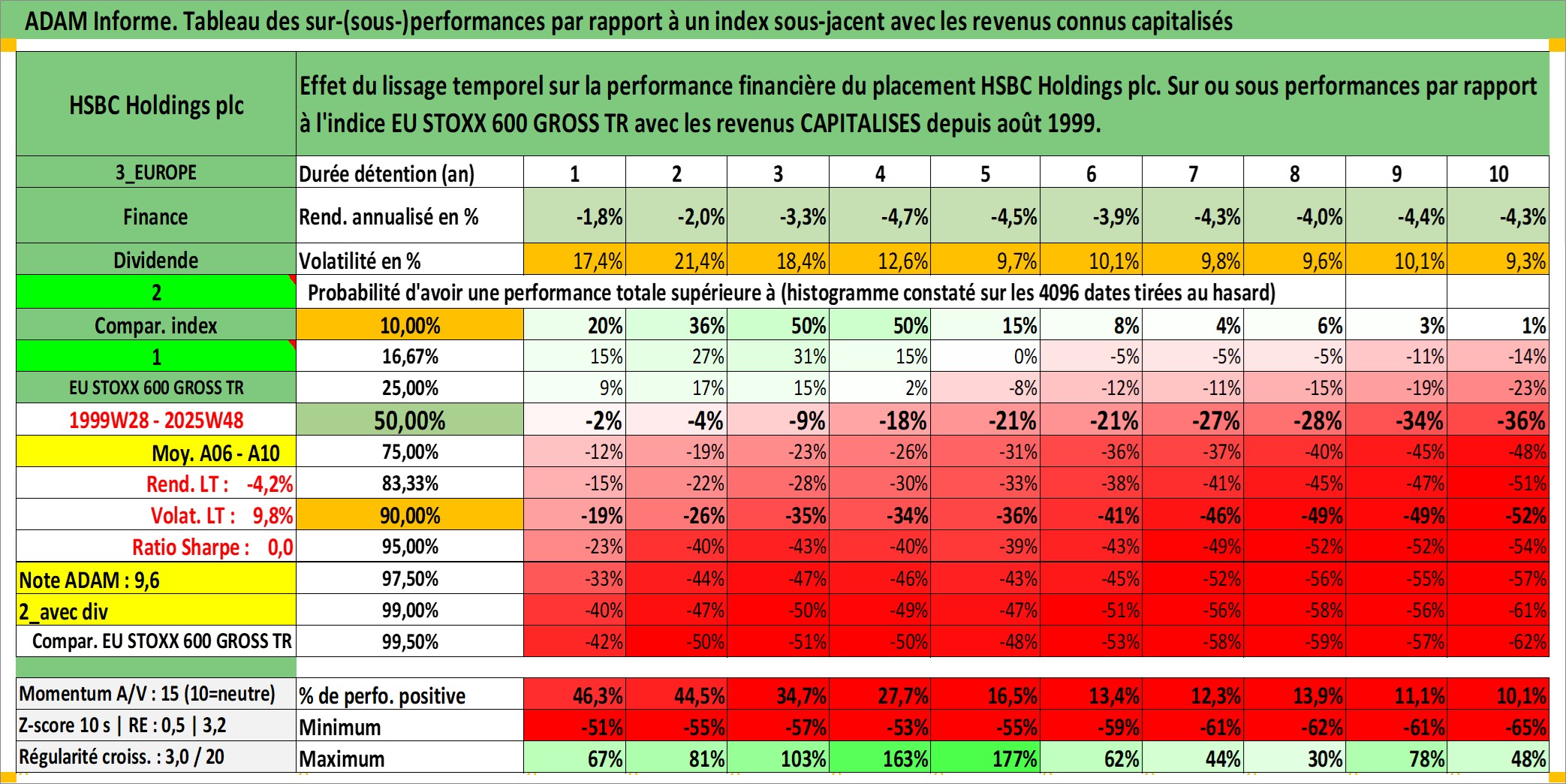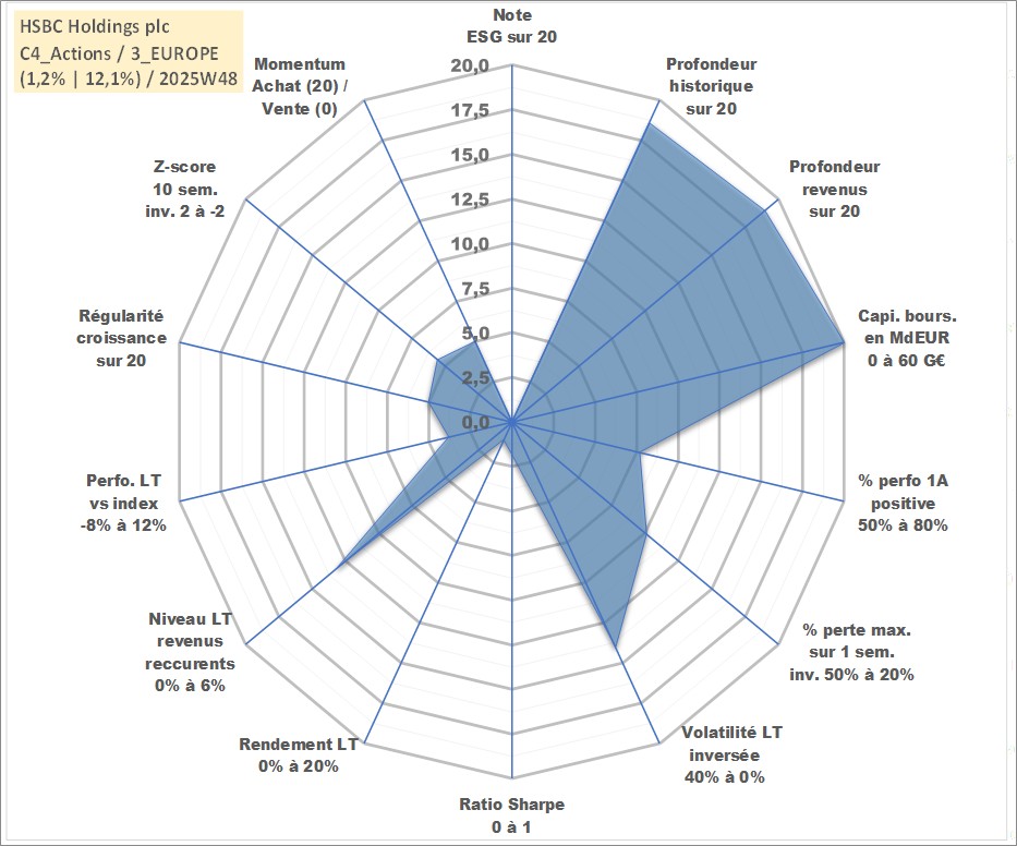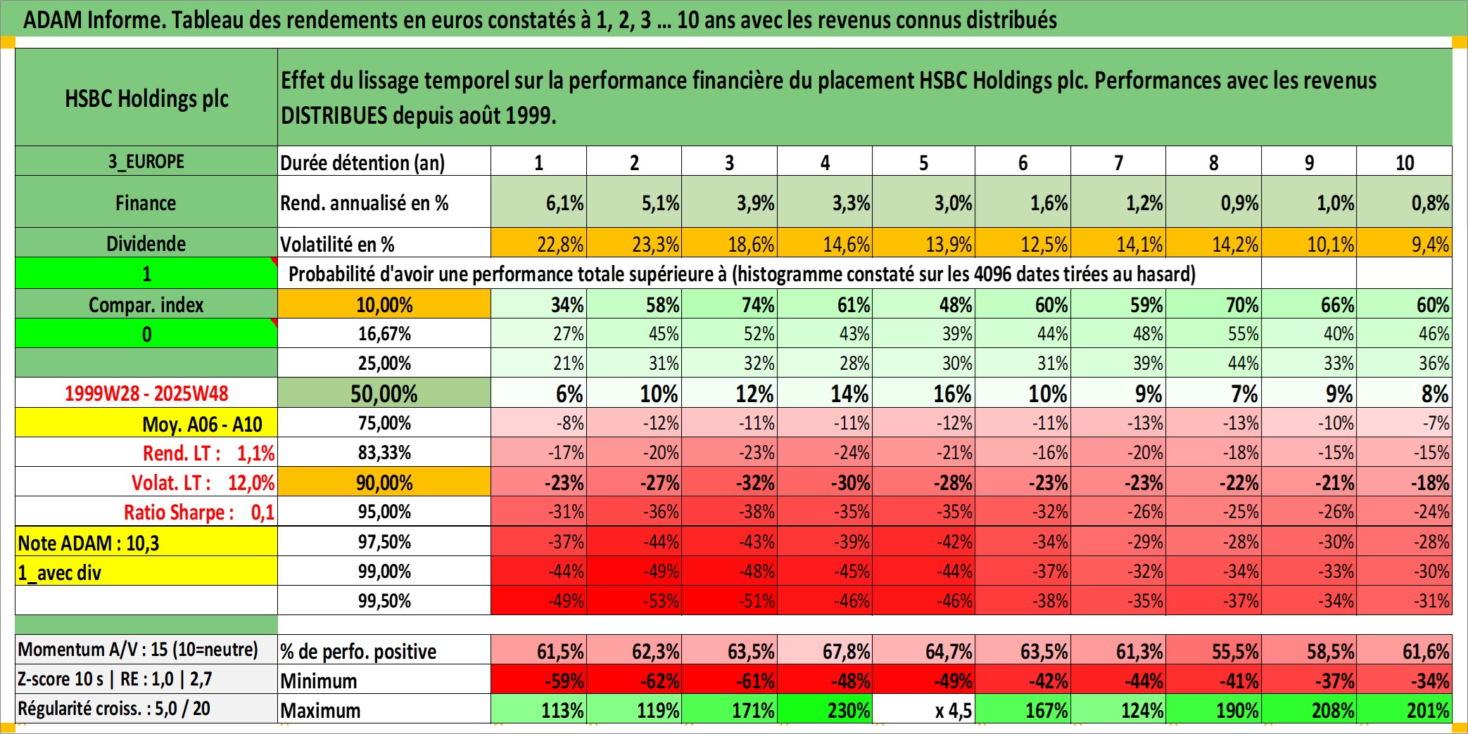 Site dédié aux investisseursPage dédiée sur site financeAnalyse des valorisations hebdomadaires de l'action HSBC Holdings plc. Cet actif est cote en USD. Les valorisations sont en contrevaleur EURO et couvrent les semaines 1999W28 a 2025W48. Les revenus de cet actif financier sont pris en compte depuis la semaine 1999W33. La note ESG de cet actif n'est pas connue.