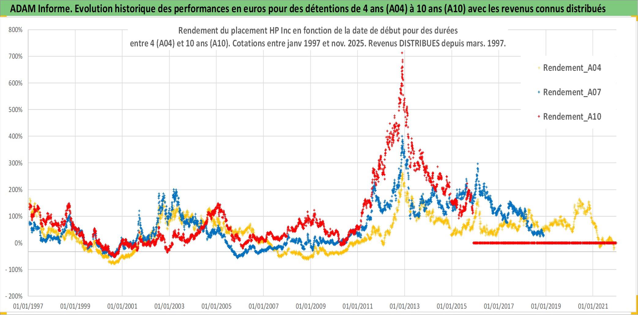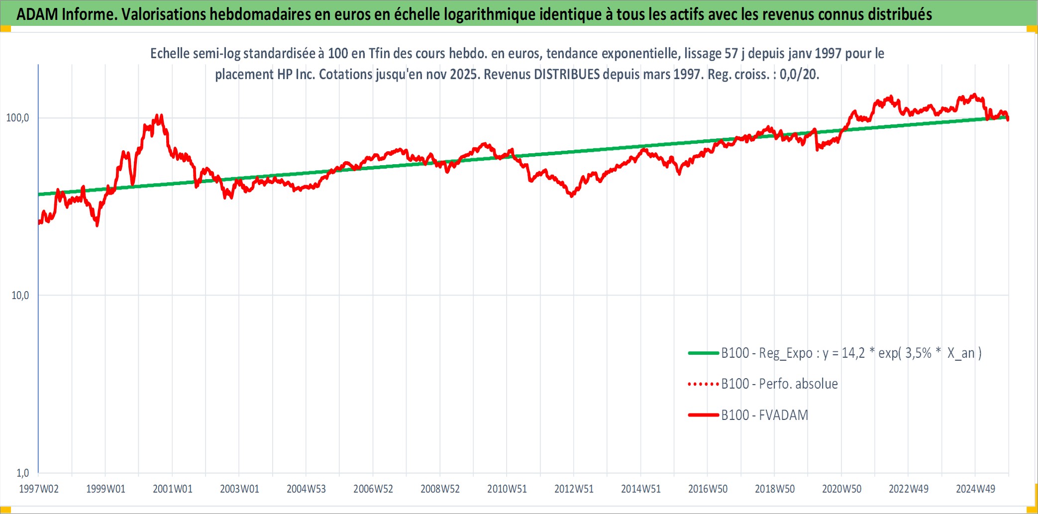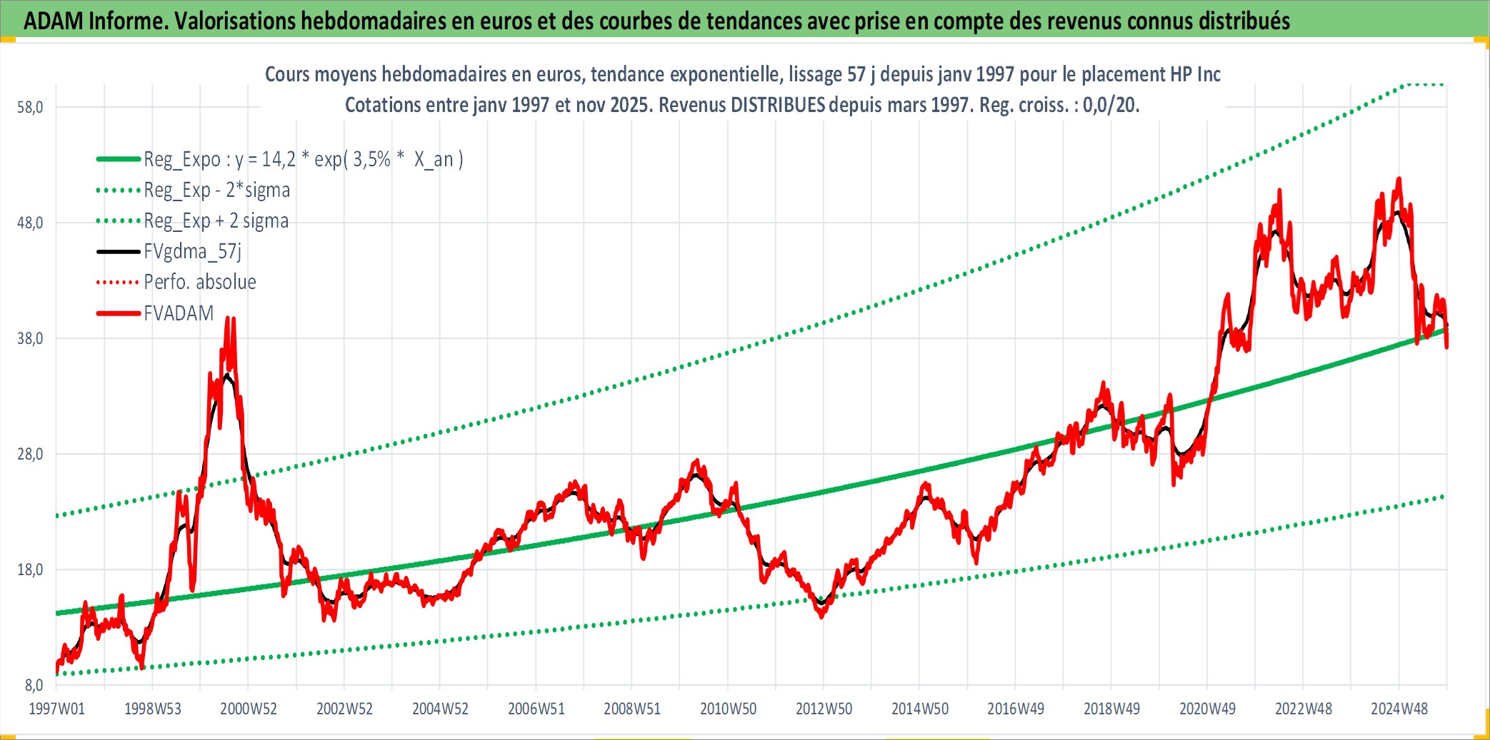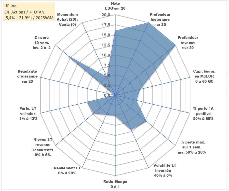 Site dédié aux investisseursPage dédiée sur site financeAnalyse des valorisations hebdomadaires de l'action HP Inc. Cet actif est cote en USD. Les valorisations sont en contrevaleur EURO et couvrent les semaines 1997W01 a 2025W48. Les revenus de cet actif financier sont pris en compte depuis la semaine 1997W13. La note globale ESG de cet actif est estimee a 16.0 (apres rebasage entre 0 et 20).