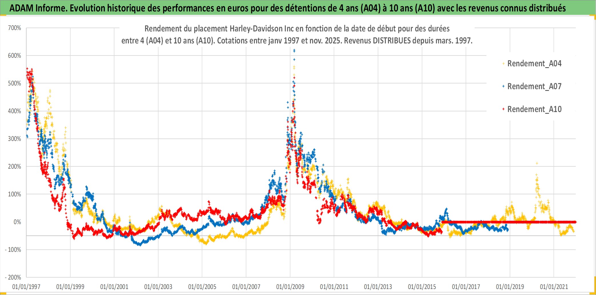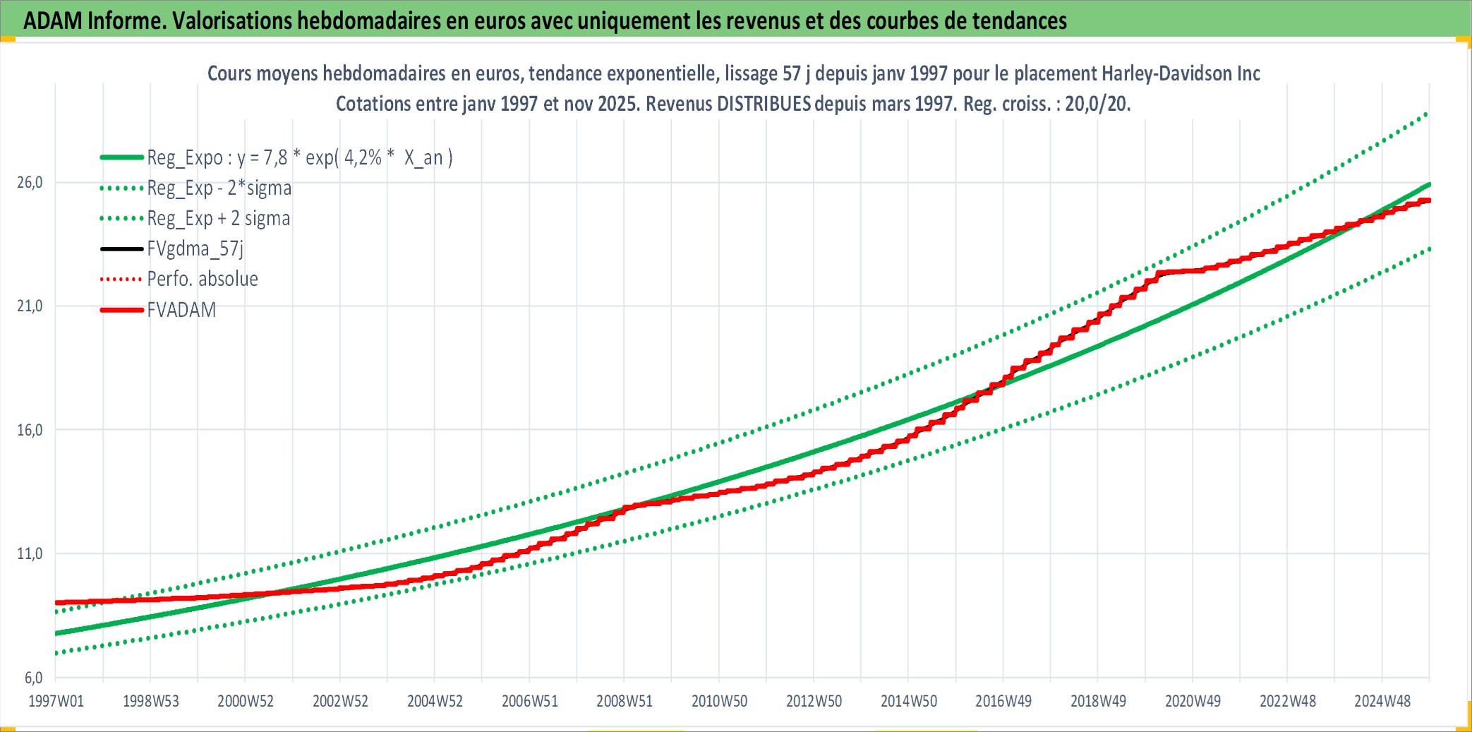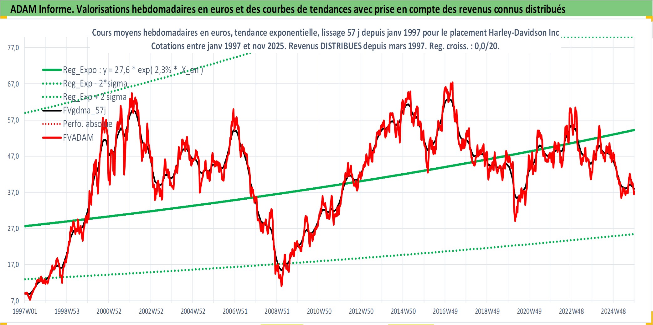 Site dédié aux investisseursPage dédiée sur site financeAnalyse des valorisations hebdomadaires de l'action Harley-Davidson Inc. Cet actif est cote en USD. Les valorisations sont en contrevaleur EURO et couvrent les semaines 1997W01 a 2025W48. Les revenus de cet actif financier sont pris en compte depuis la semaine 1997W11. La note globale ESG de cet actif est estimee a 13.0 (apres rebasage entre 0 et 20).